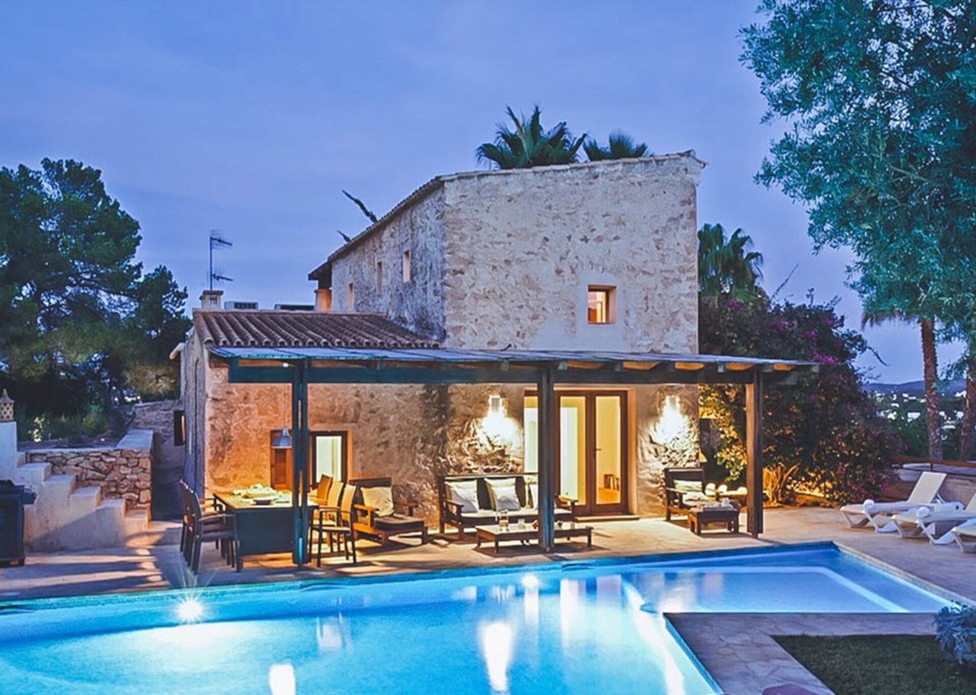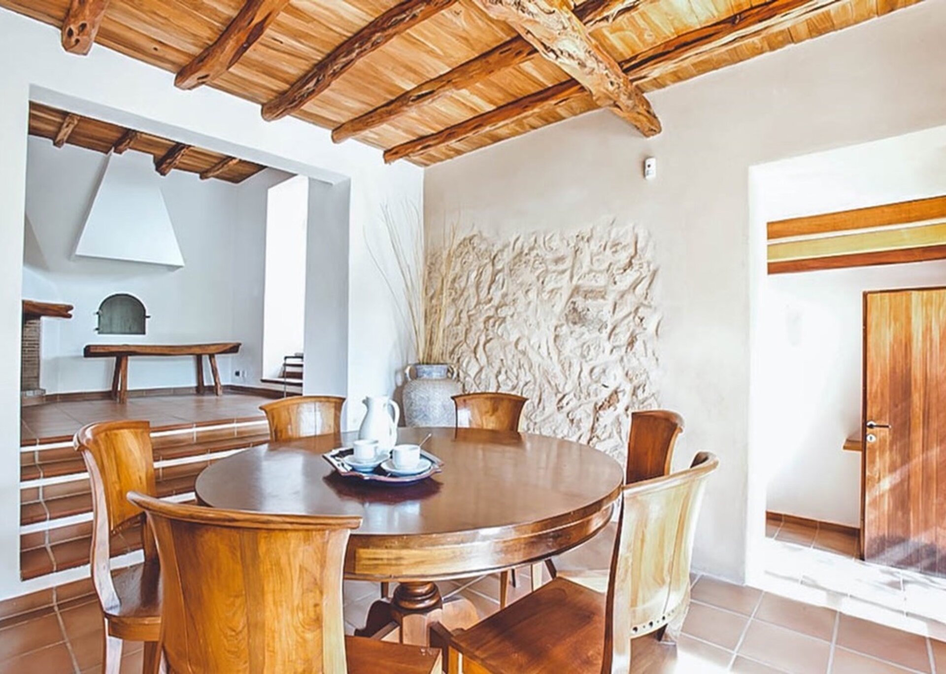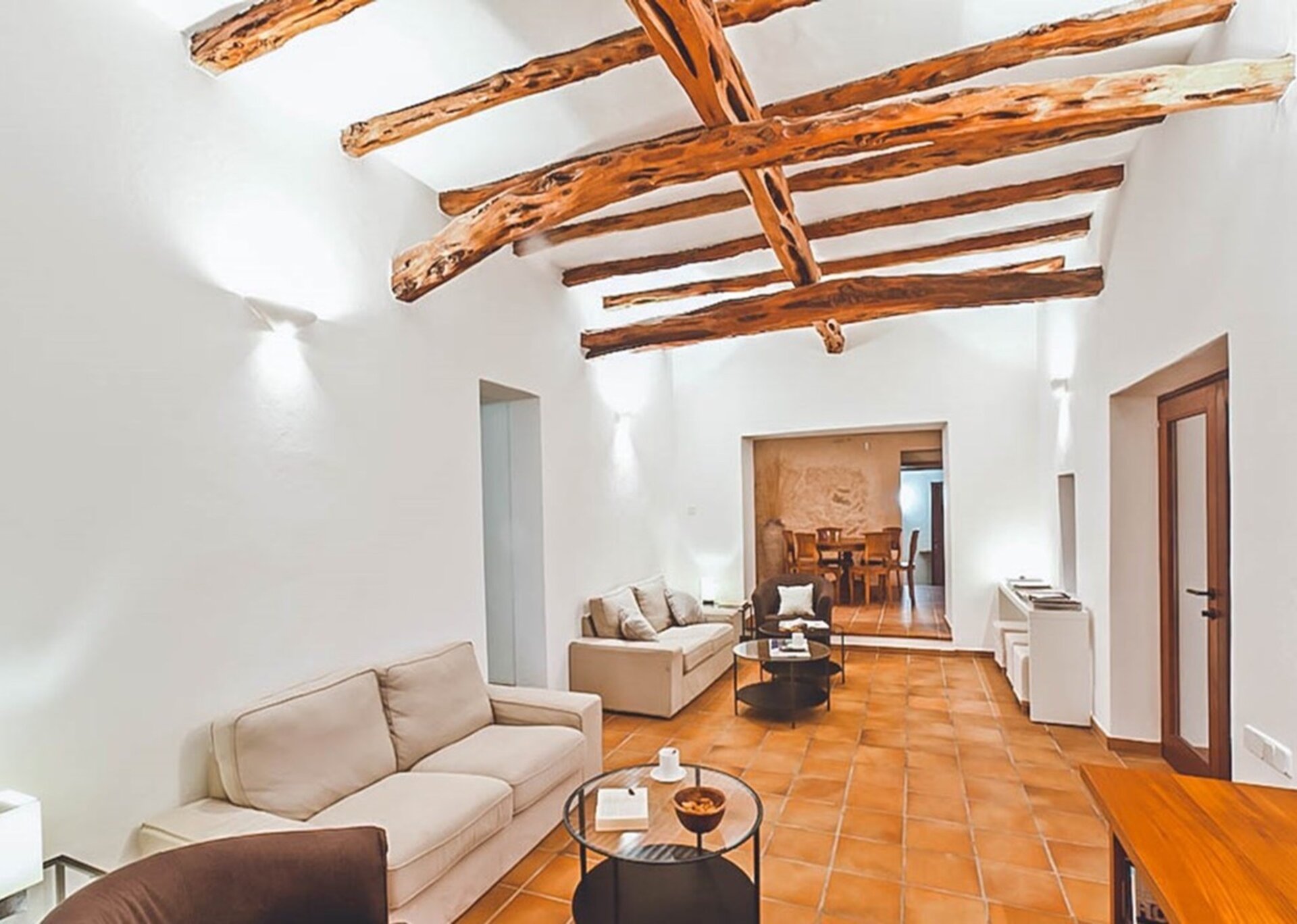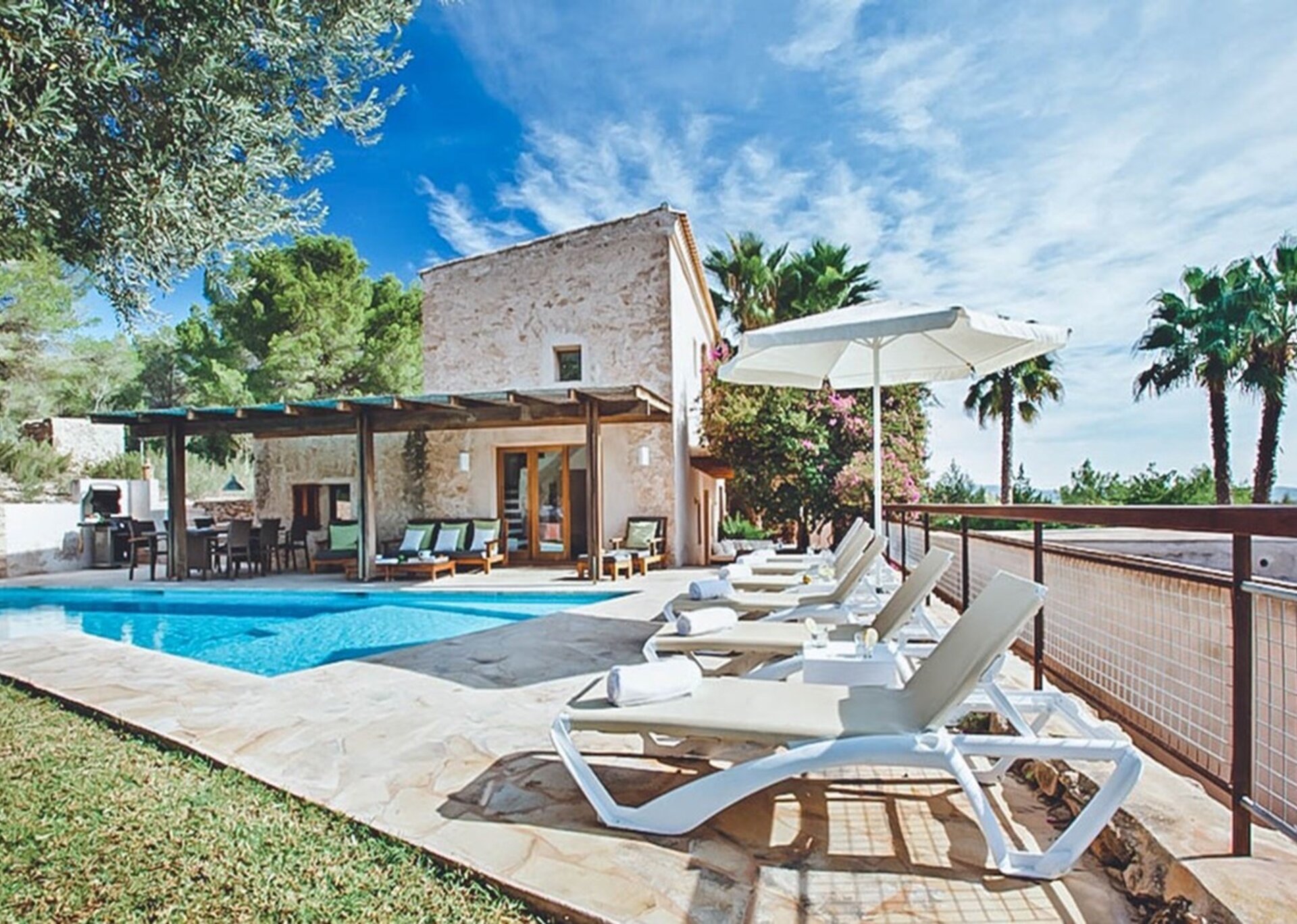 Delight in the comfort of the private L-shaped pool, surrounded by inviting terraces and luxurious wooden decking. An expansive terrace shaded by a traditional wooden-beamed roof beckons al-fresco dining, while picturesque gardens invite you to relax in exterior seating areas. A charming wooden pergola offers a second outside dining space. And let's not forget the mesmerizing spectacle of the world-famous Ibizan sunset painting the sky each night, making this truly desirable holiday home even more magical.