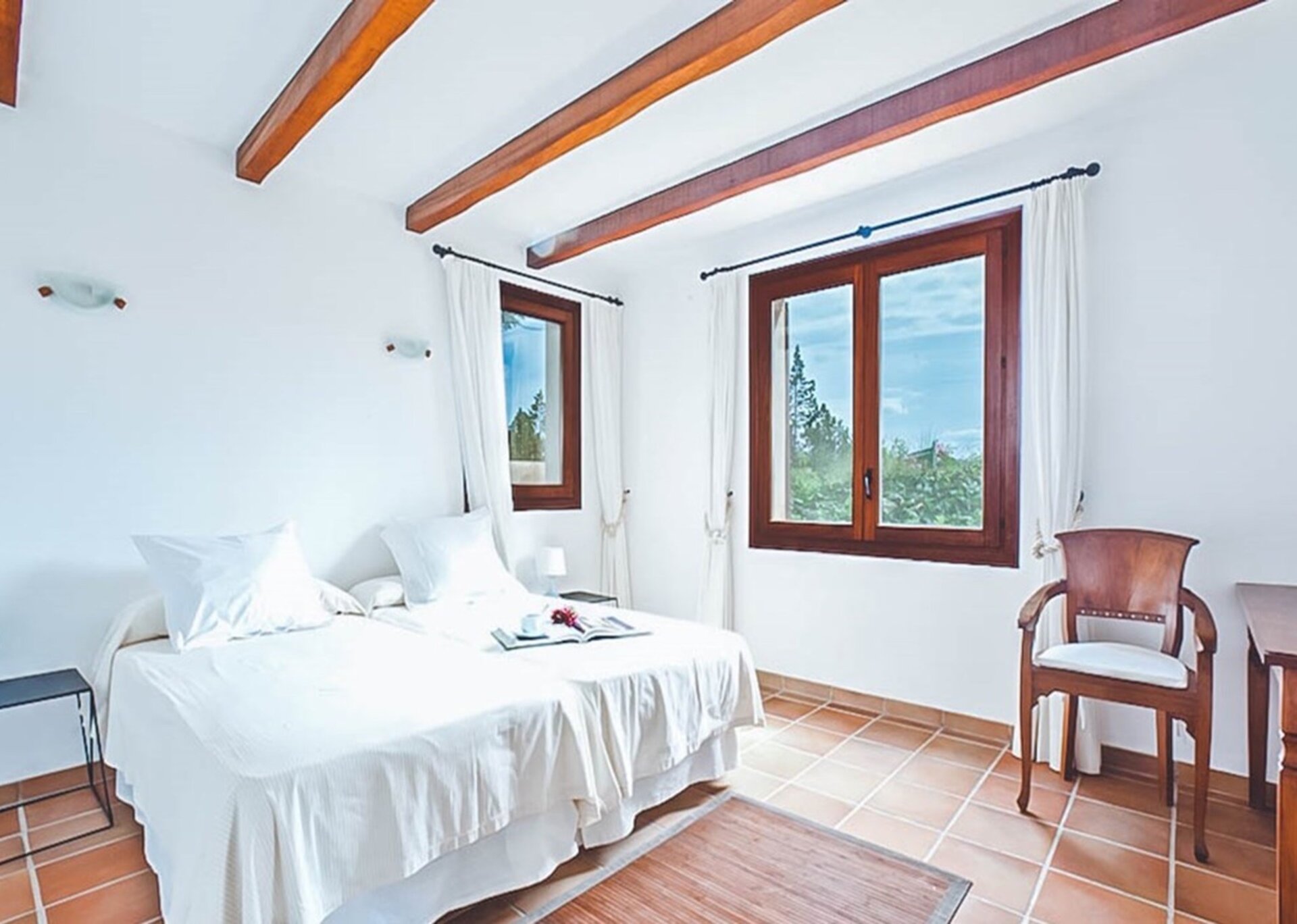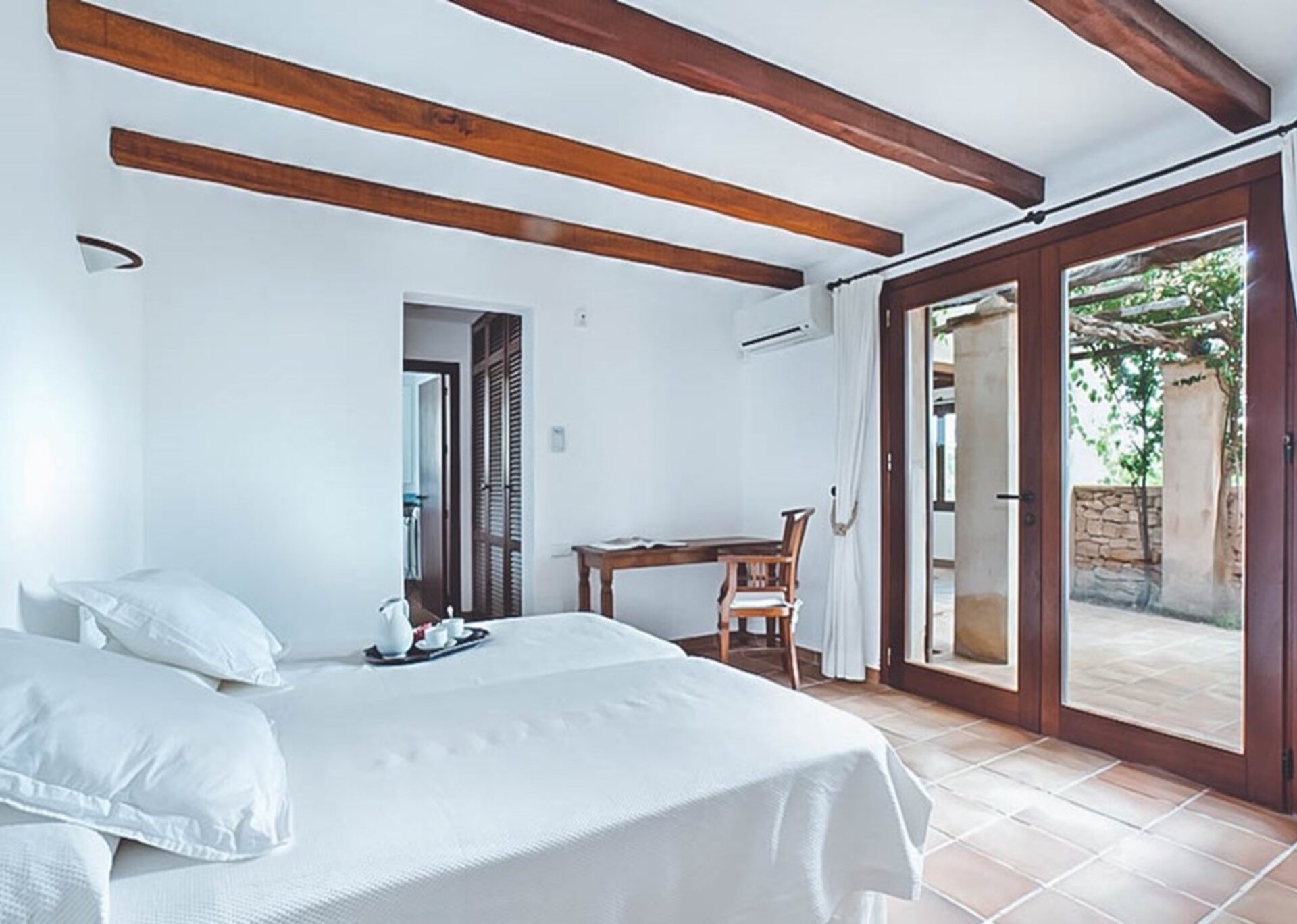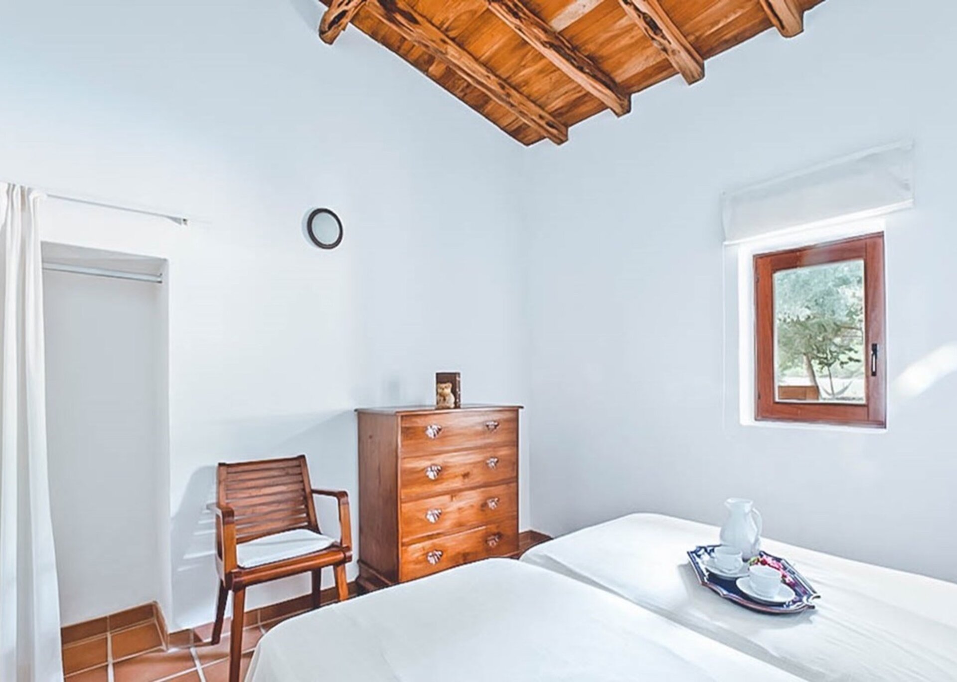 Inside Questa, you'll find timeless charm with terracotta tiled floors, pristine white walls, and traditional wood-beamed ceilings. A delightful medley of modern minimalism and luxurious furnishings adds a touch of opulence. The sociable kitchen boasts a sunny breakfast table, seamlessly flowing into one of the inviting interior dining spaces. The spacious lounge provides a warm welcome and direct access to the exterior pool terrace. Three beautifully appointed bedrooms grace the main house, while three additional well-equipped guest accommodations reside in separate casitas on the grounds. Each casita offers twin beds, an en-suite bathroom, and terrace access.