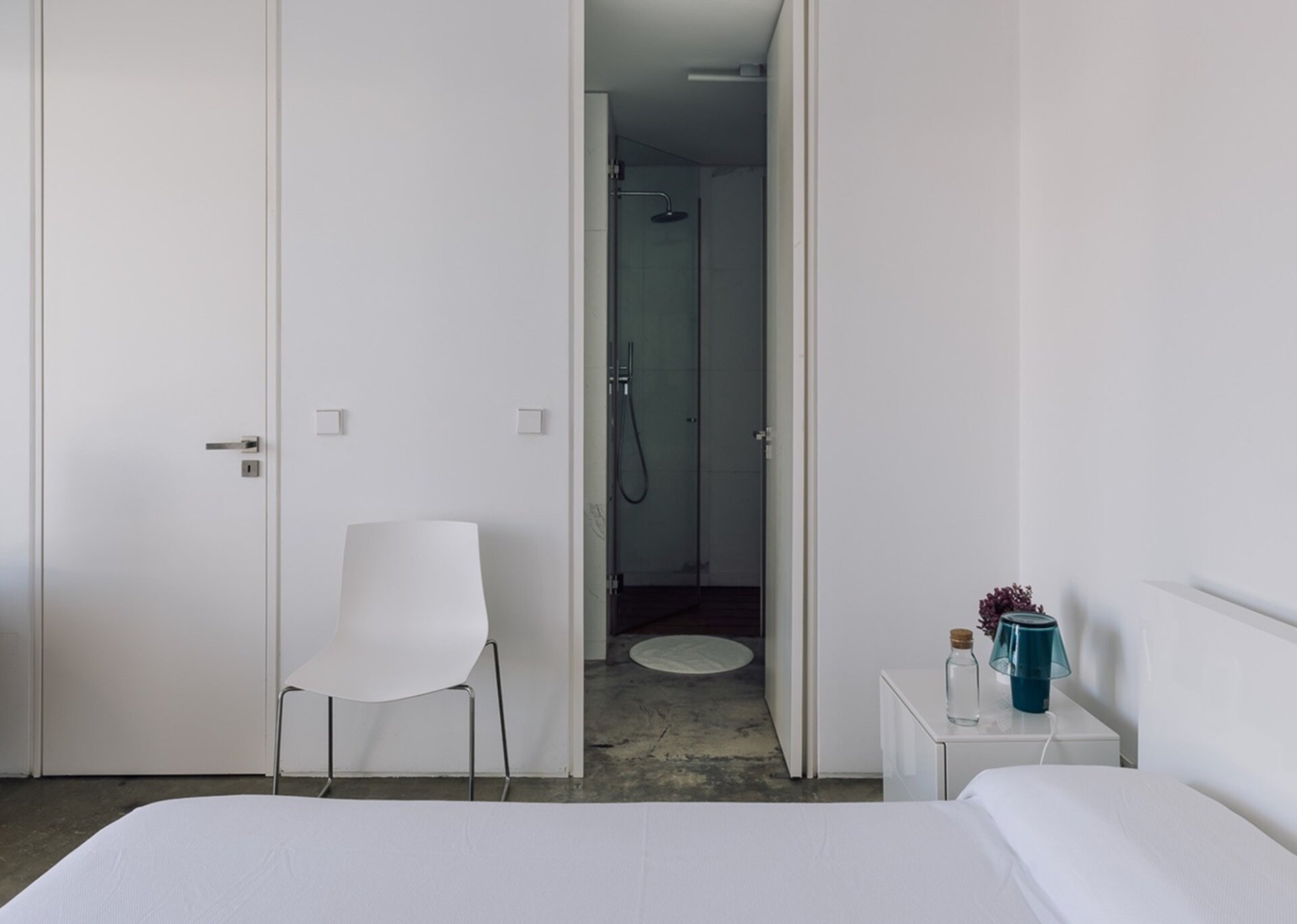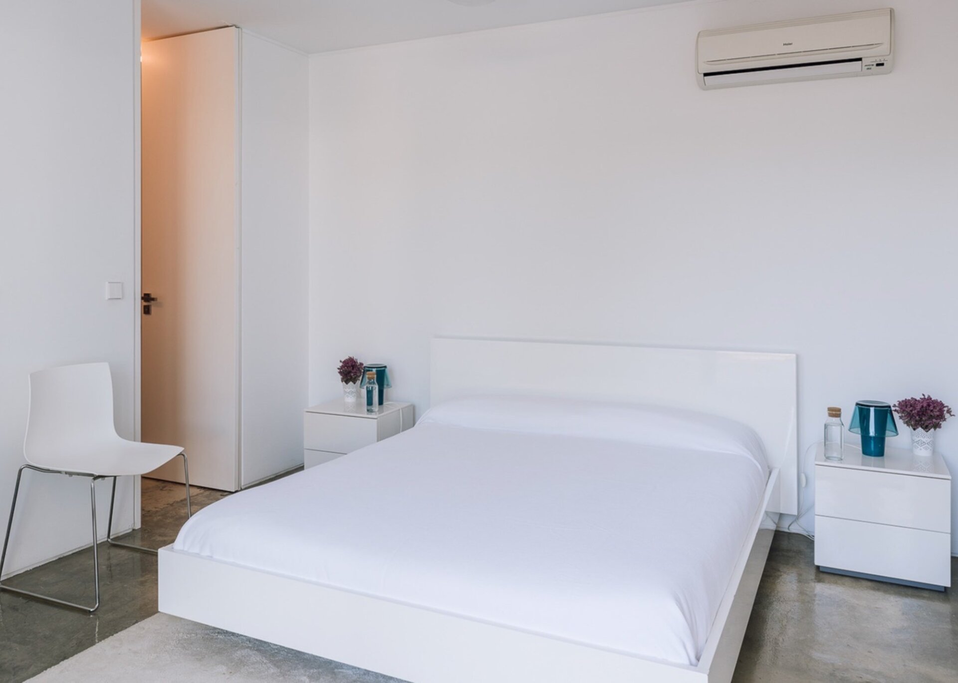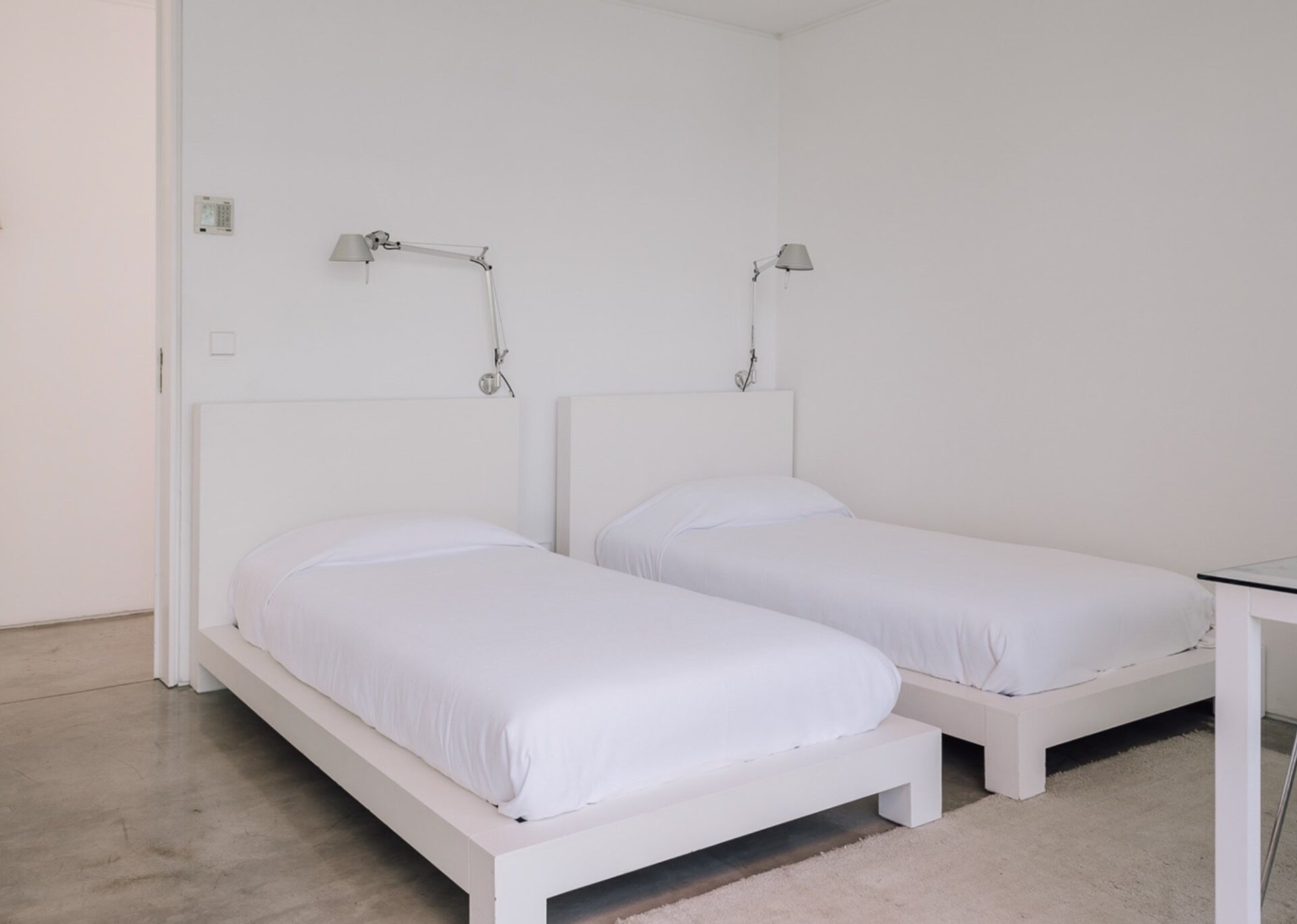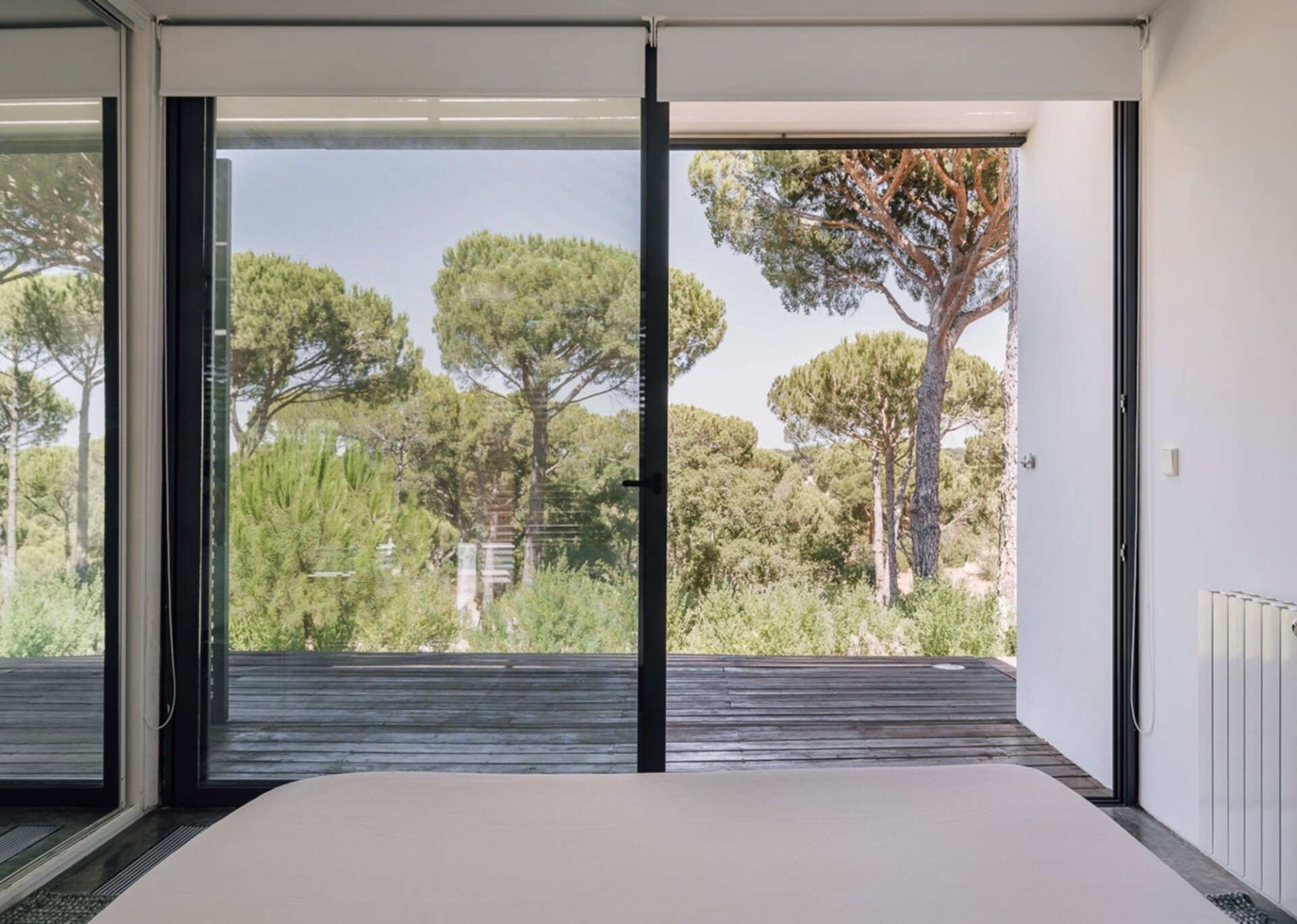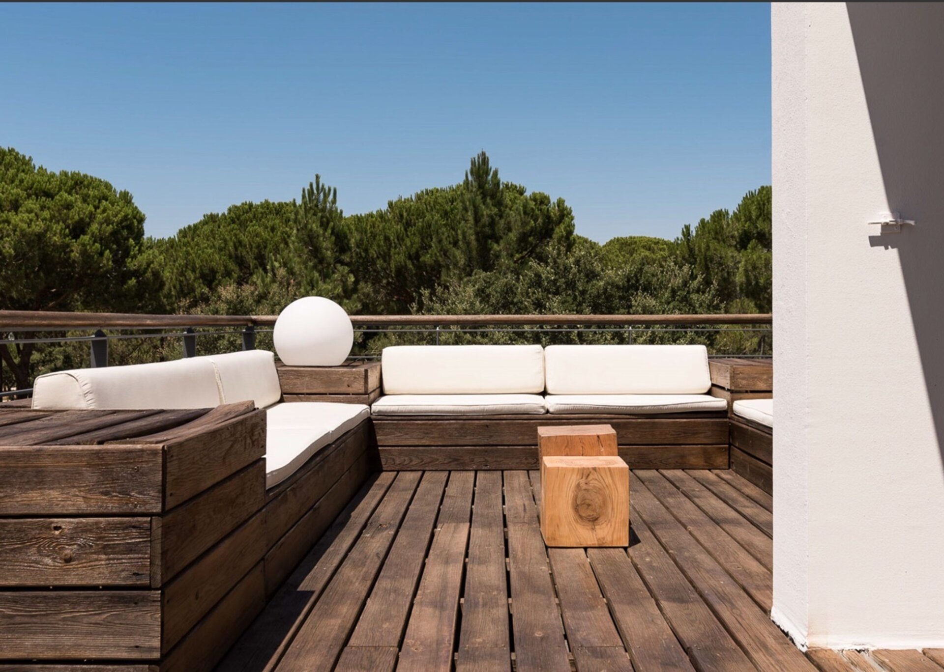 Dressed in very light tones mostly dominated by white, Bedrooms 1-3 in the main house are close to one another and Bedroom 4 can be reached outside near the terrace. All have access to the wrap-around deck and the magnificent pines.