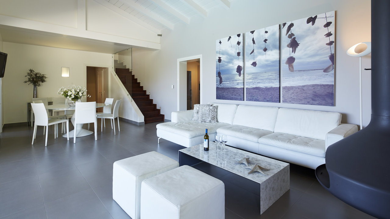- Living room with dining area, large patio doors opening to terracce, jacuzzi and infinity pool