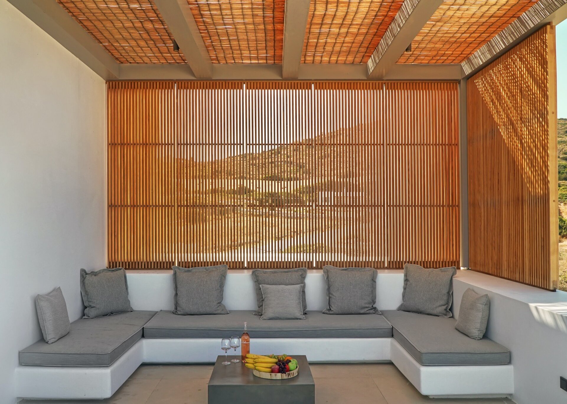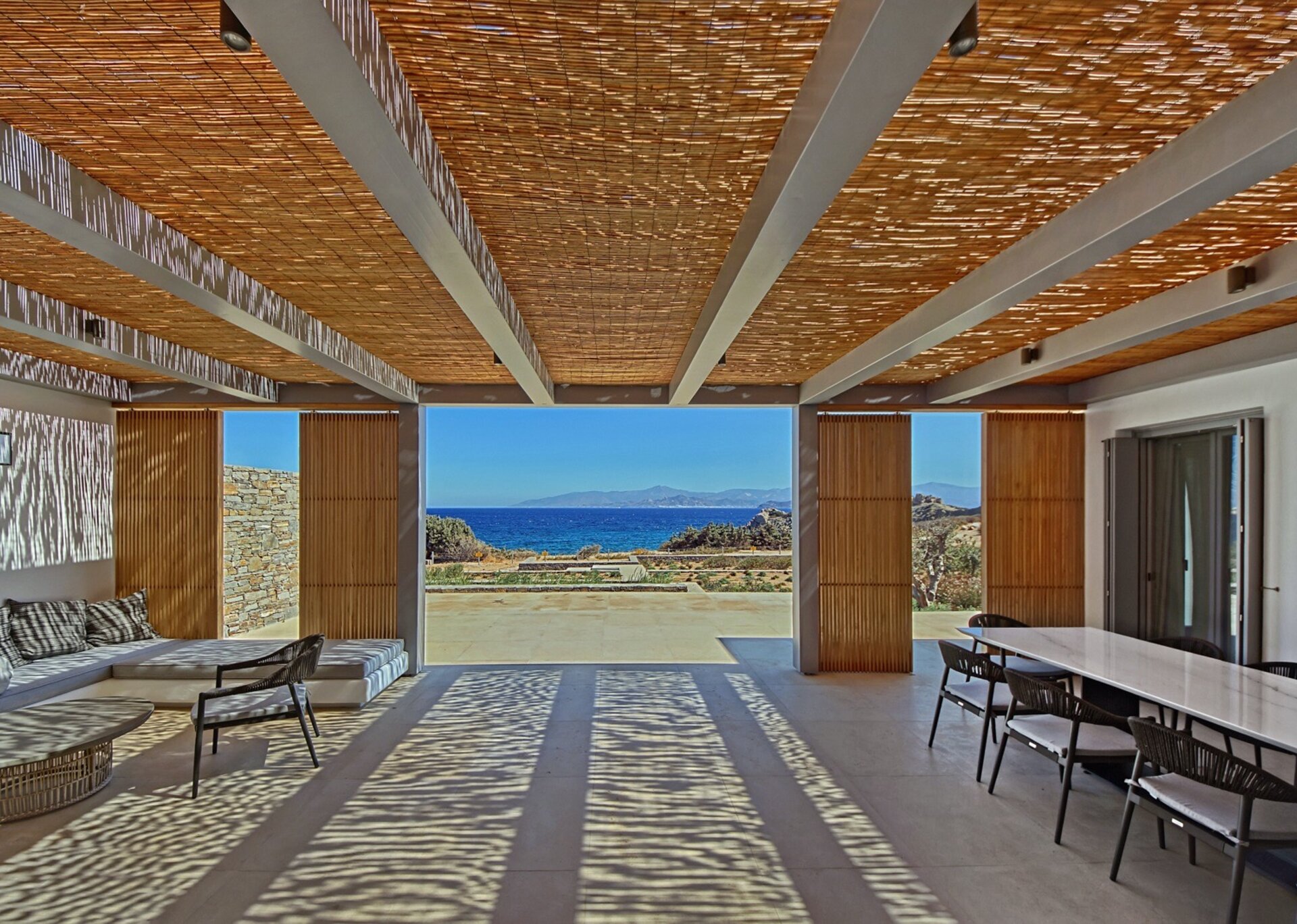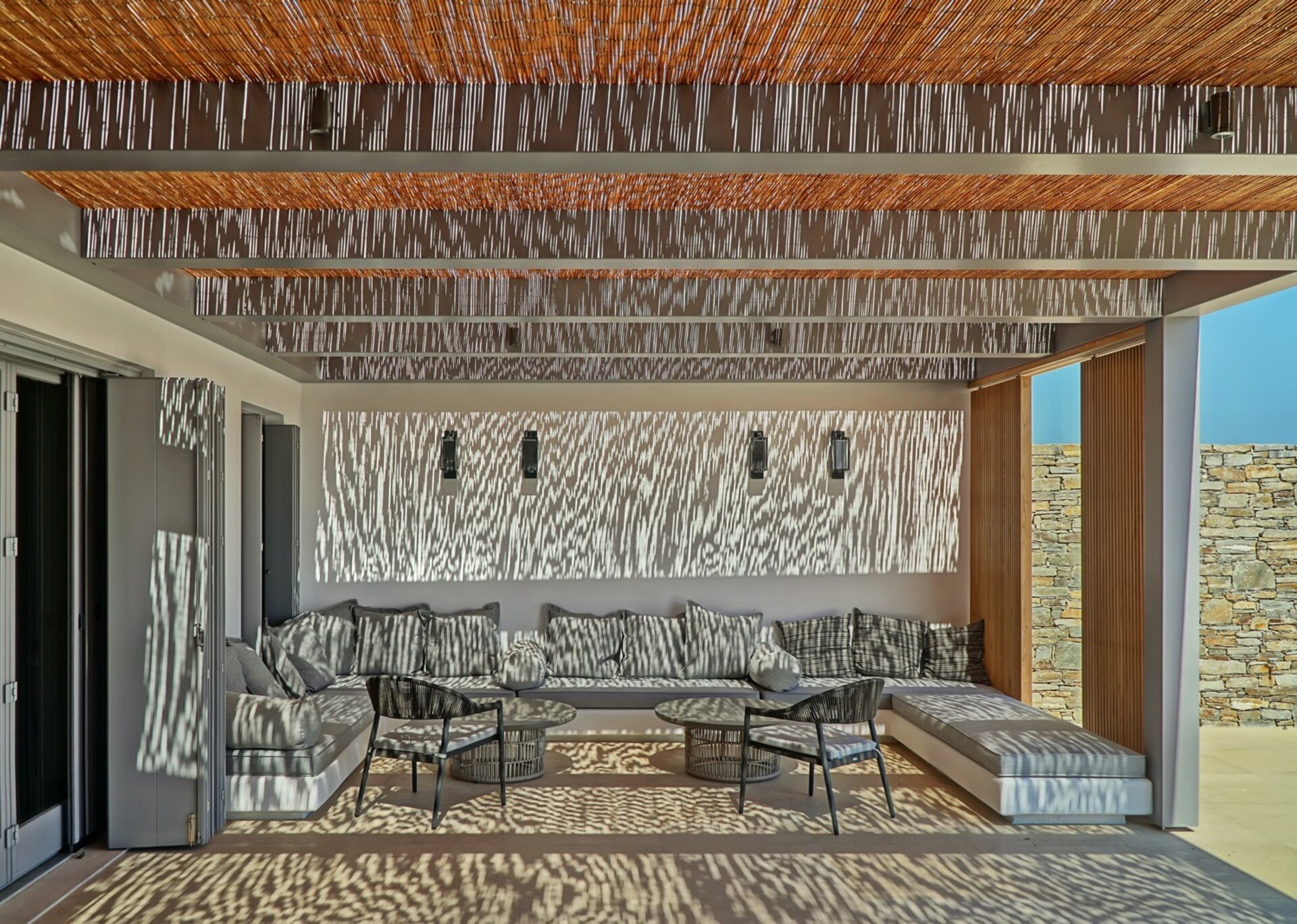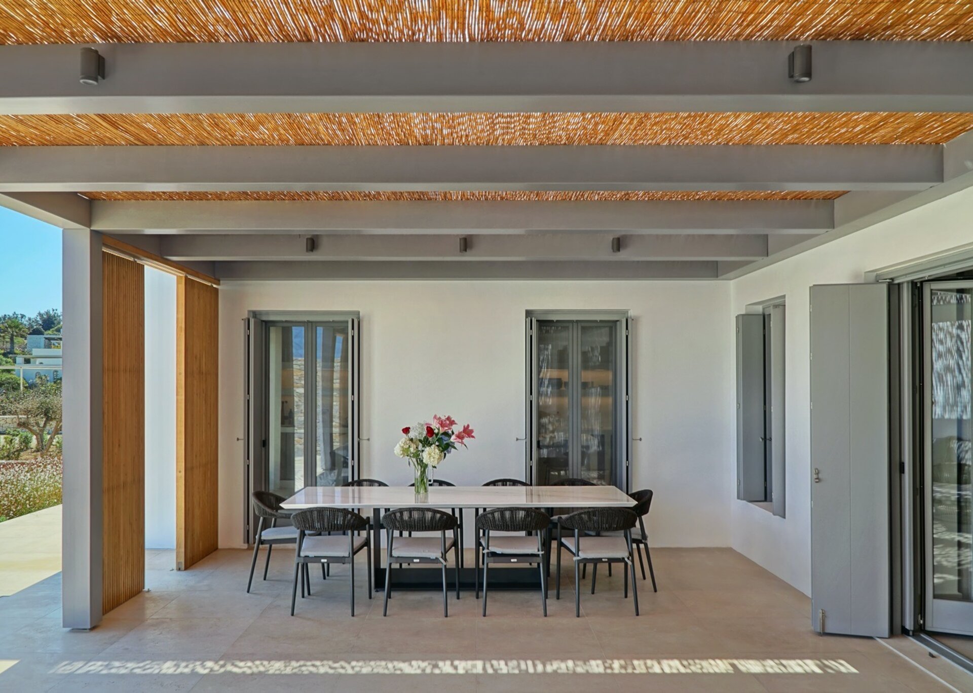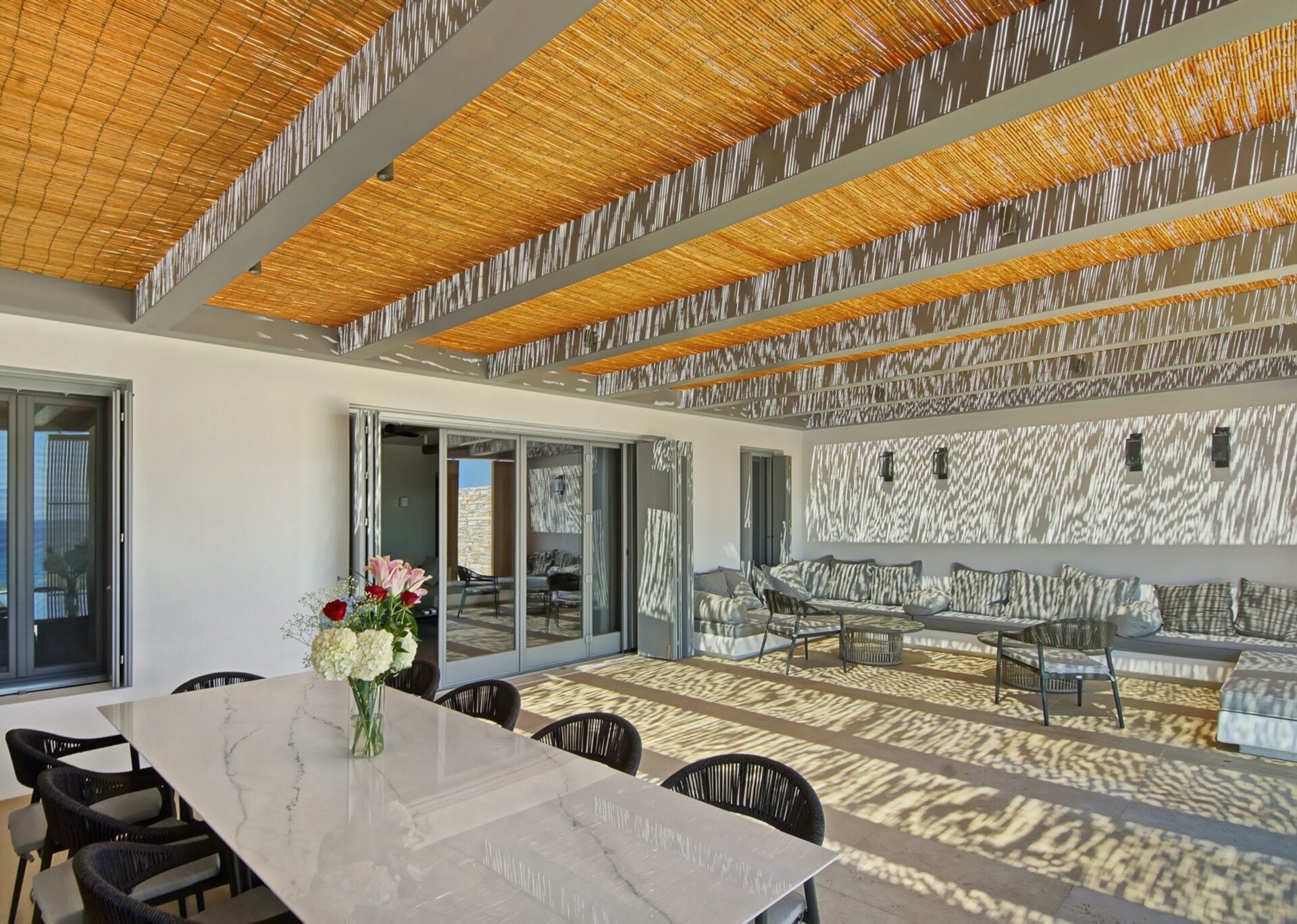Step outside, and you'll be greeted by an outdoor area that exudes tranquility, using materials that seamlessly blend with the natural surroundings. The expansive swimming pool, covering over 100 square meters, seamlessly merges with the sea, creating a captivating visual. The oversized open-air lounge, offering breathtaking views of the Aegean, along with the well-protected outdoor dining area, is designed to facilitate your open-air gatherings and get-togethers, regardless of the hour, shielding you from the Mediterranean's summer winds.