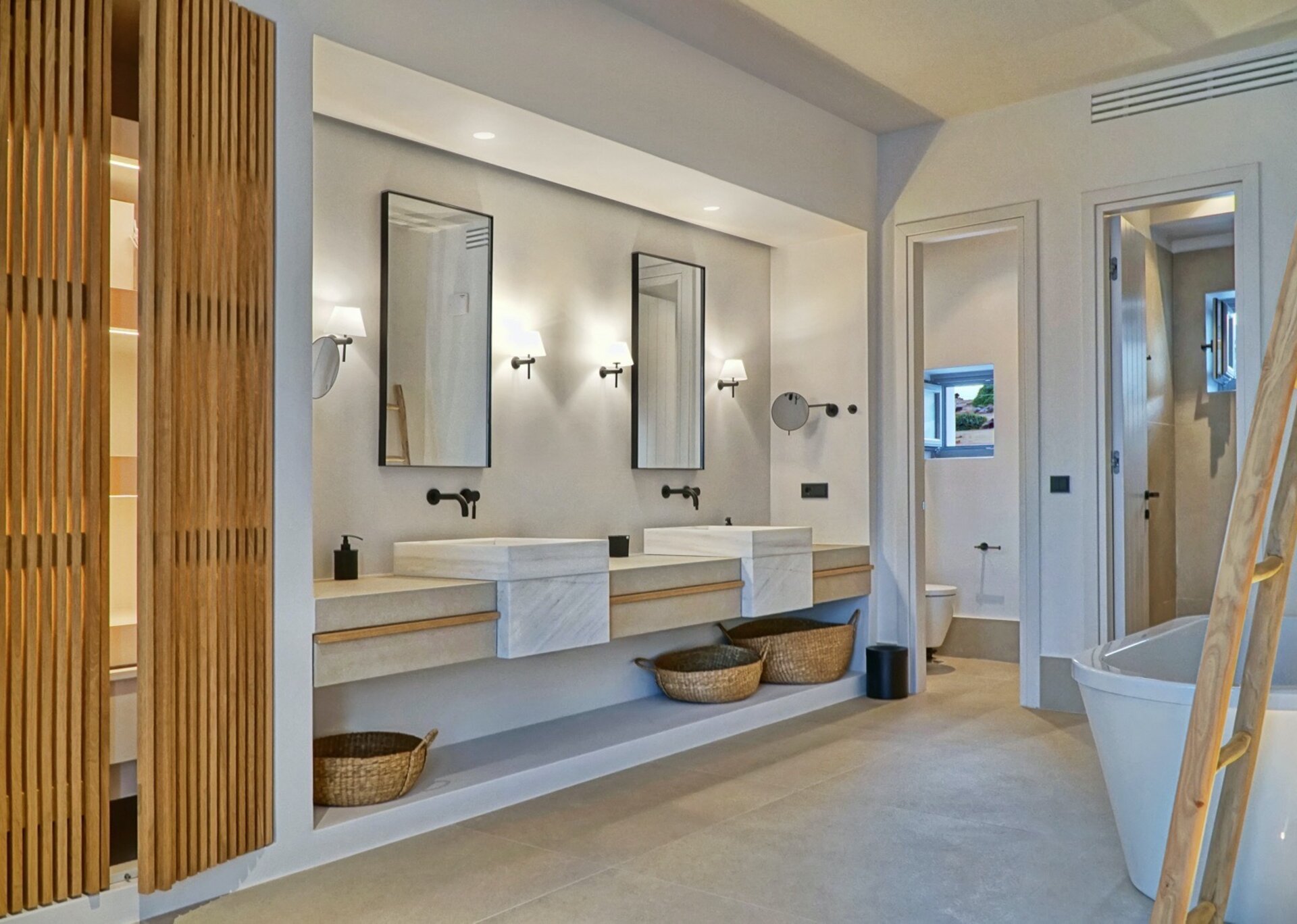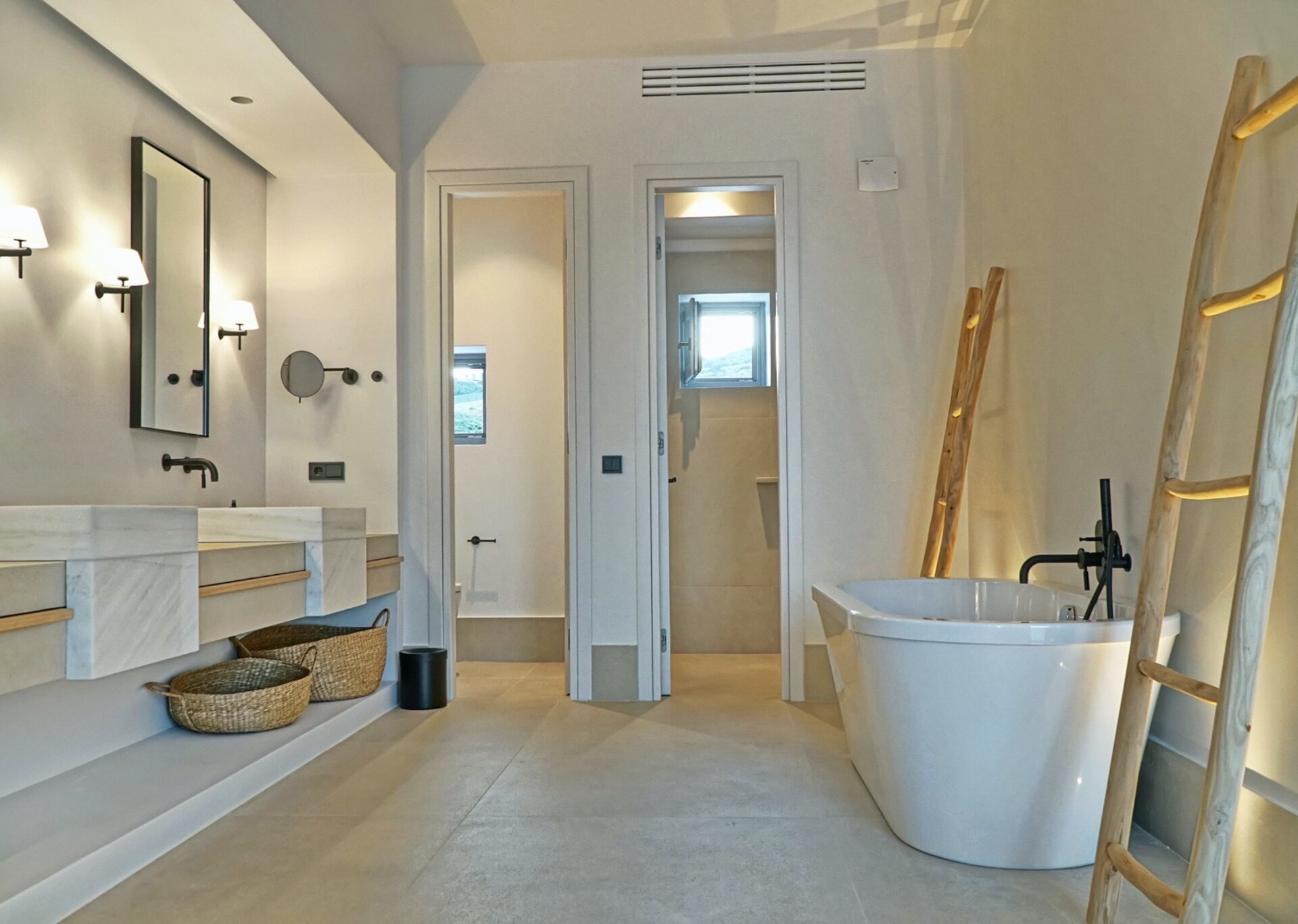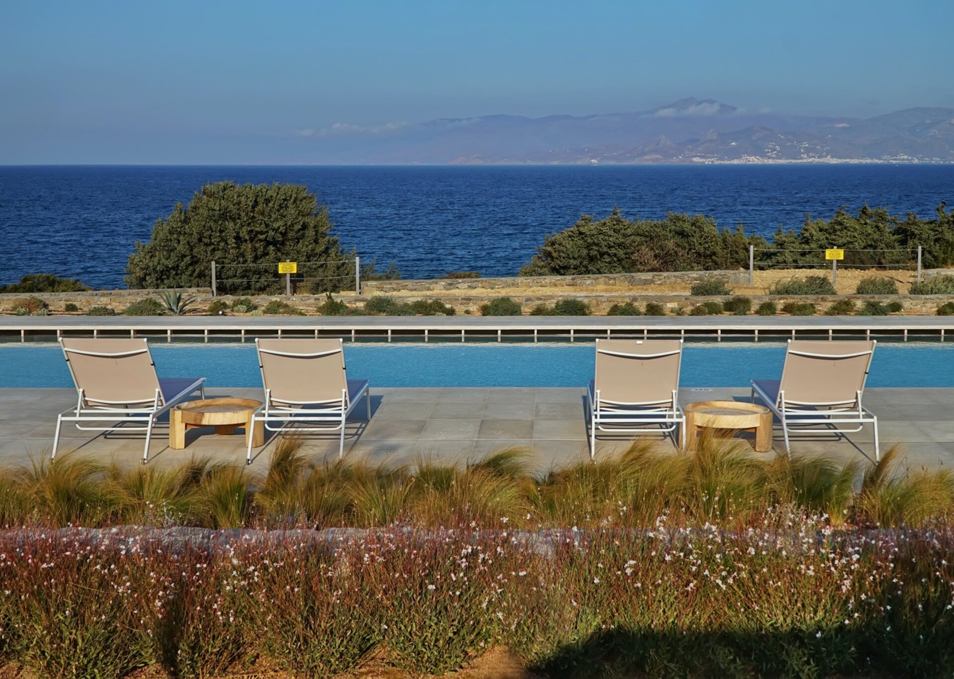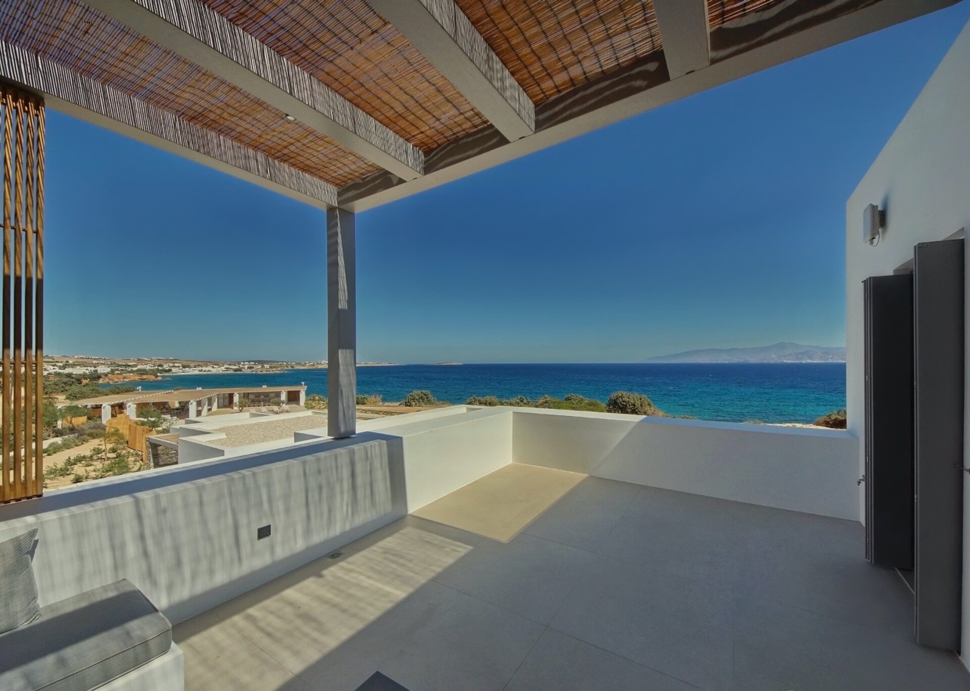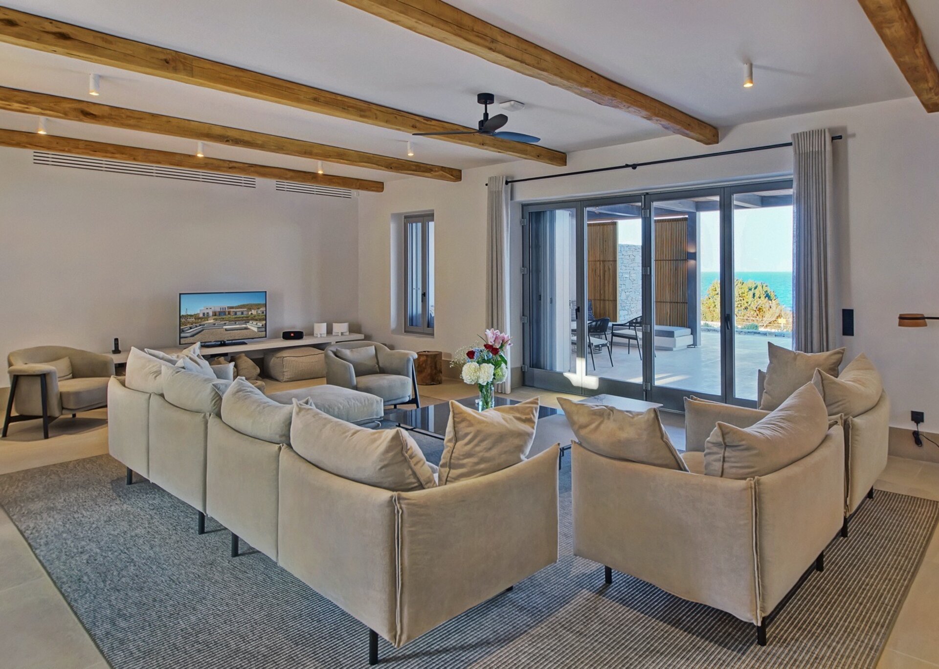 Step outside, and you'll be greeted by an outdoor area that exudes tranquility, using materials that seamlessly blend with the natural surroundings. The expansive swimming pool, covering over 100 square meters, seamlessly merges with the sea, creating a captivating visual. The oversized open-air lounge, offering breathtaking views of the Aegean, along with the well-protected outdoor dining area, is designed to facilitate your open-air gatherings and get-togethers, regardless of the hour, shielding you from the Mediterranean's summer winds.