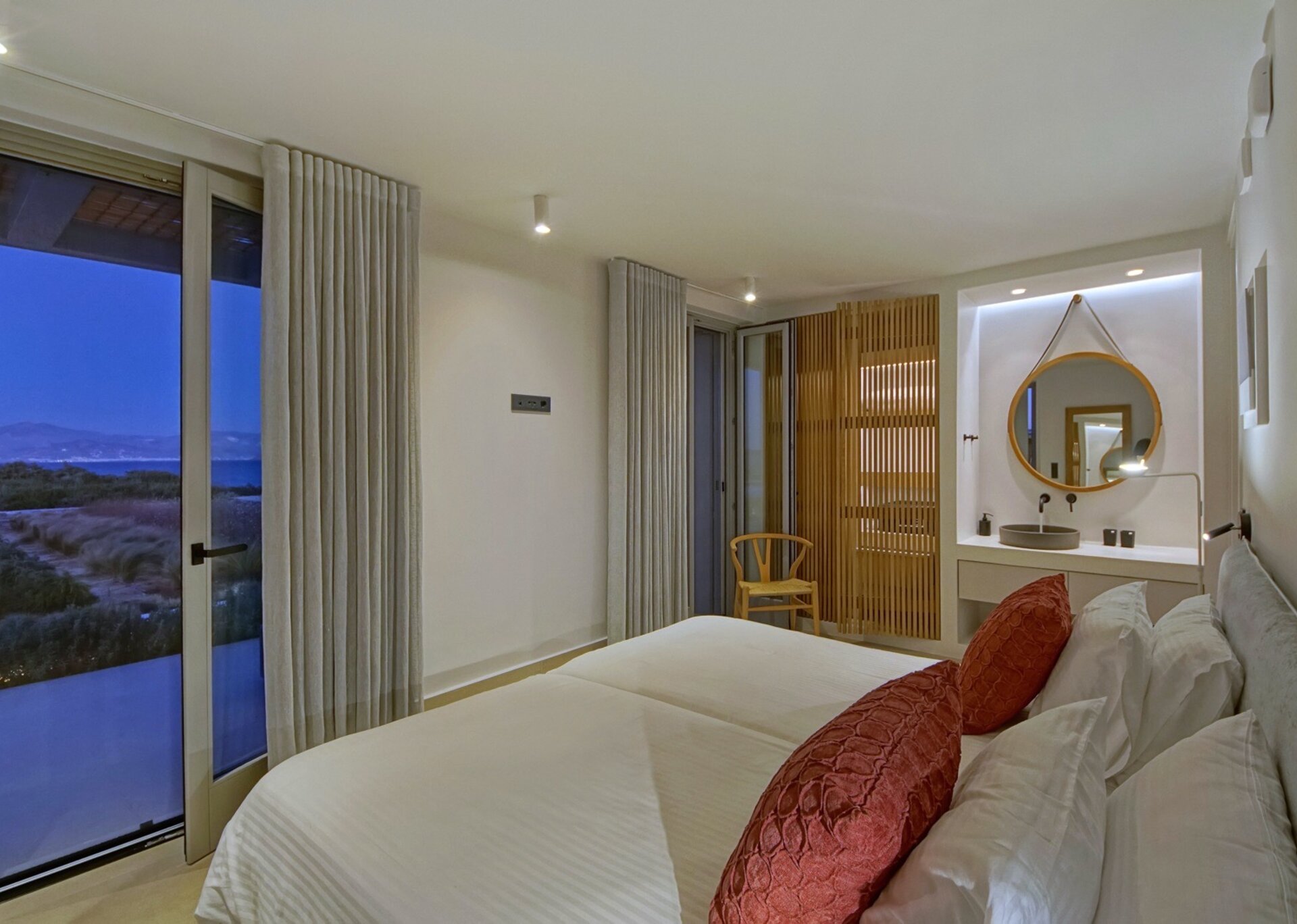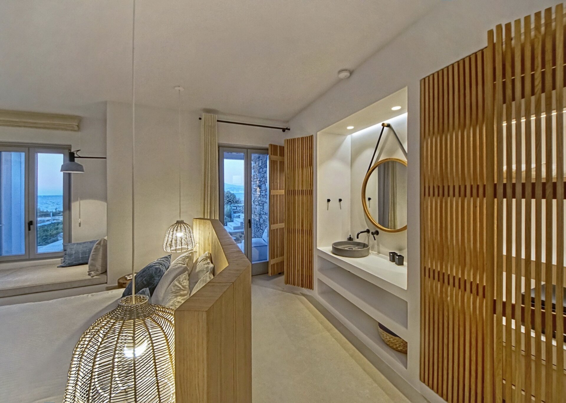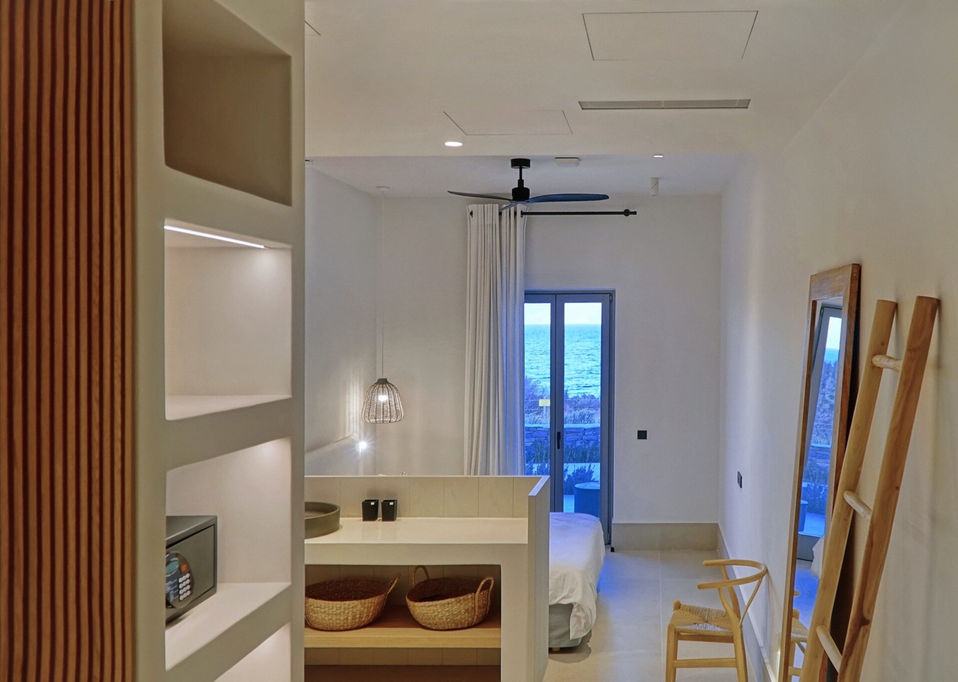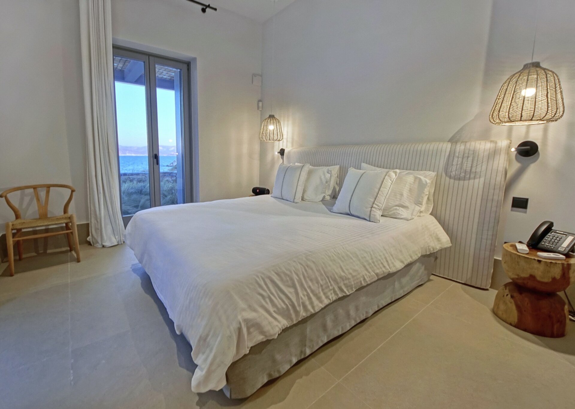 Inside, a predominantly white interior sets the stage for the Aegean Sea's modern aesthetics, allowing the wooden elements to shine. The oak beams of the roof, the carefully chosen lighting fixtures, and the handcrafted decorative items elevate the overall aesthetics of the building. Designer furniture and fine cotton or linen fabrics blend harmoniously with the abundant natural light and sleek surfaces, creating a serene and unpretentious space, accentuated only by the occasional blue hue of the sea.
