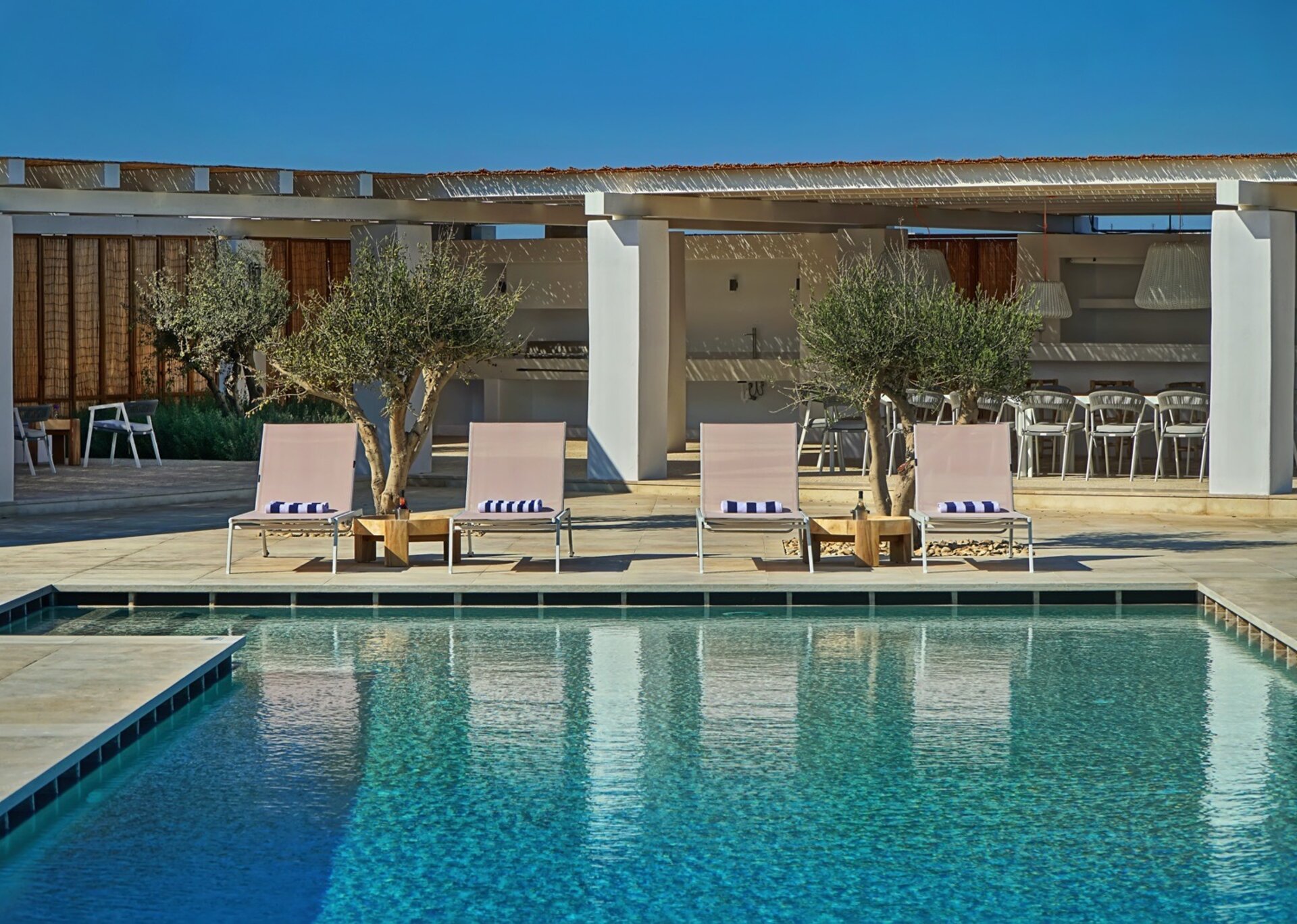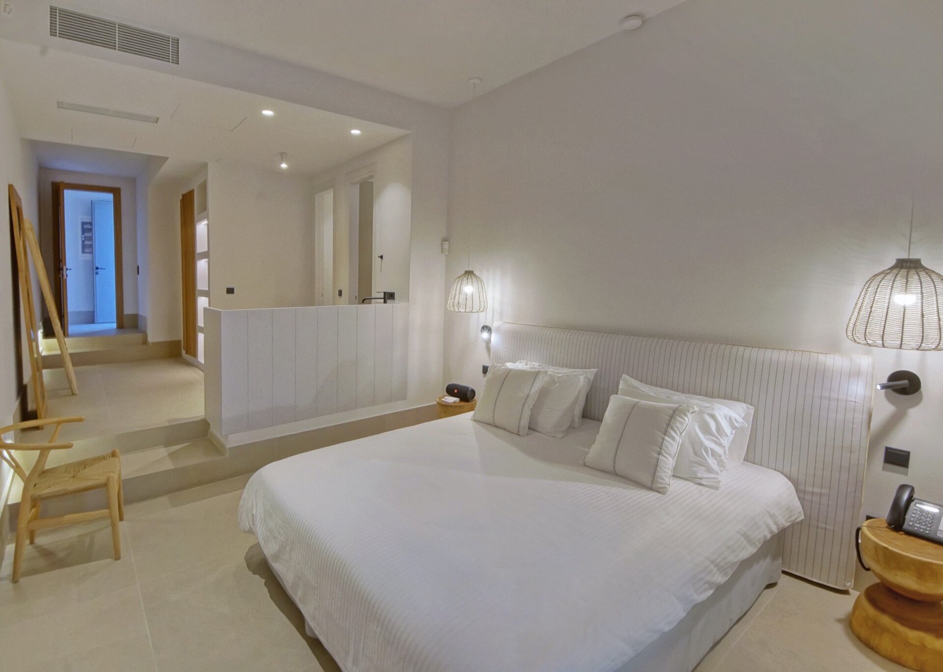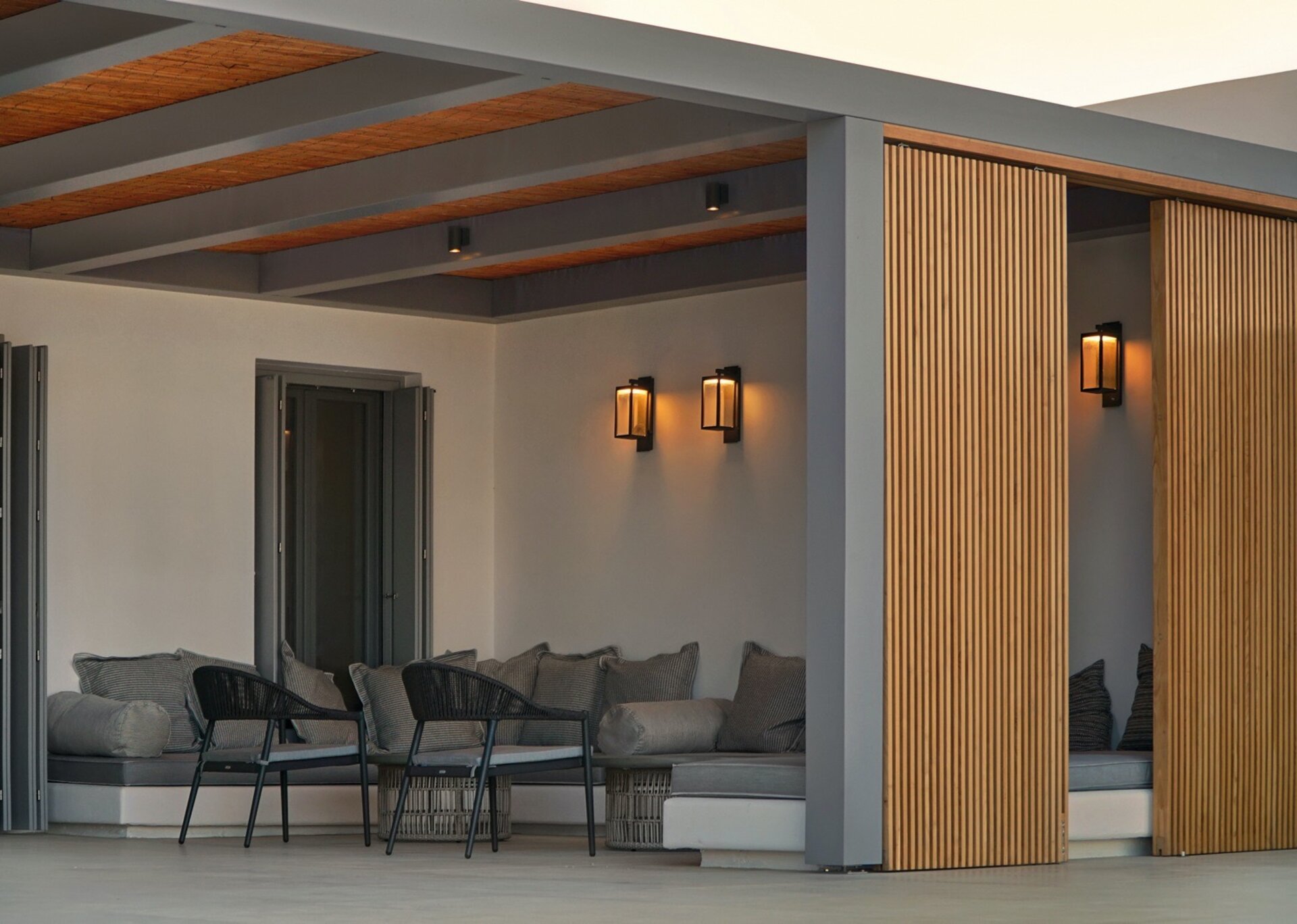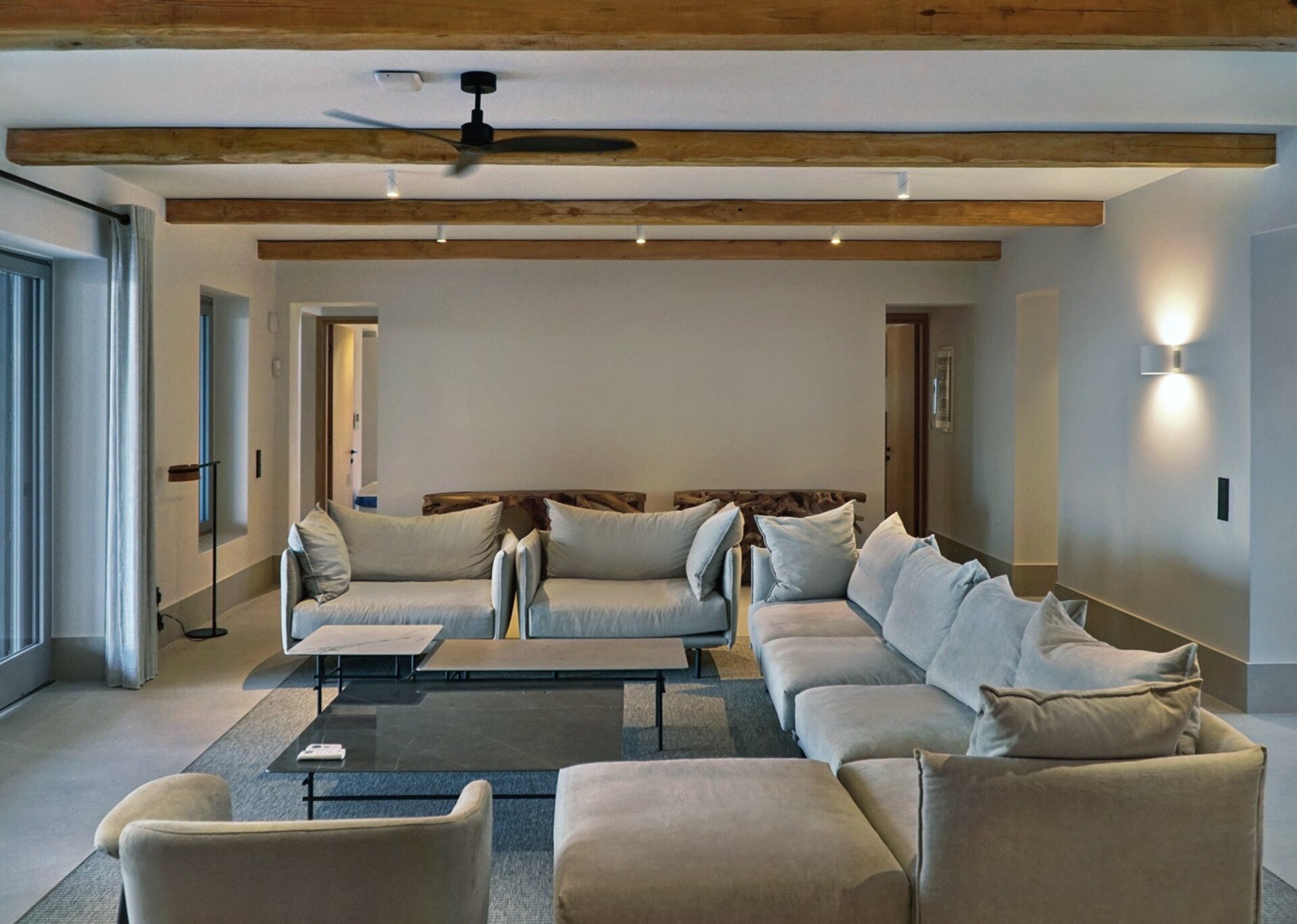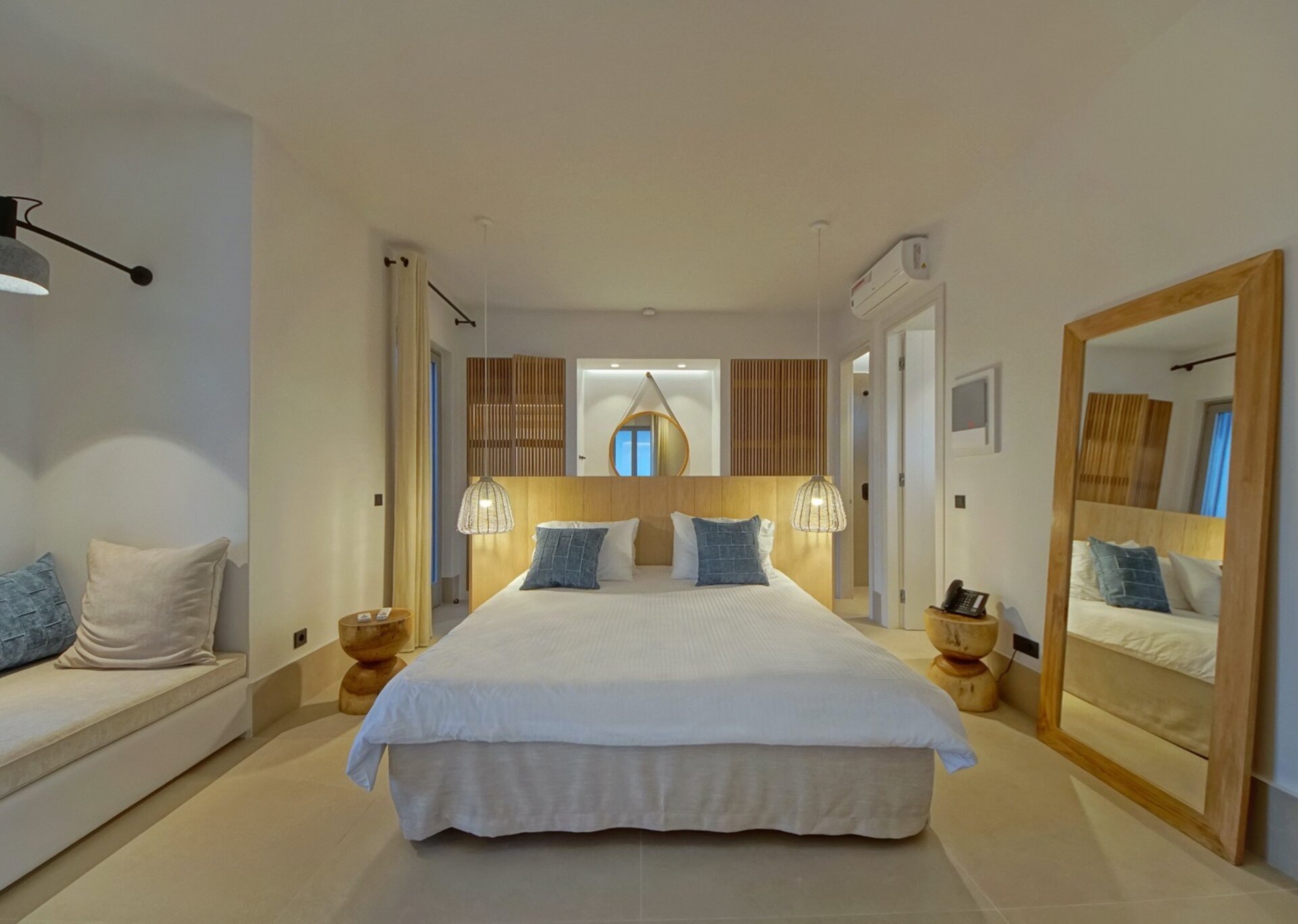 Inside, a predominantly white interior sets the stage for the Aegean Sea's modern aesthetics, allowing the wooden elements to shine. The oak beams of the roof, the carefully chosen lighting fixtures, and the handcrafted decorative items elevate the overall aesthetics of the building. Designer furniture and fine cotton or linen fabrics blend harmoniously with the abundant natural light and sleek surfaces, creating a serene and unpretentious space, accentuated only by the occasional blue hue of the sea.
