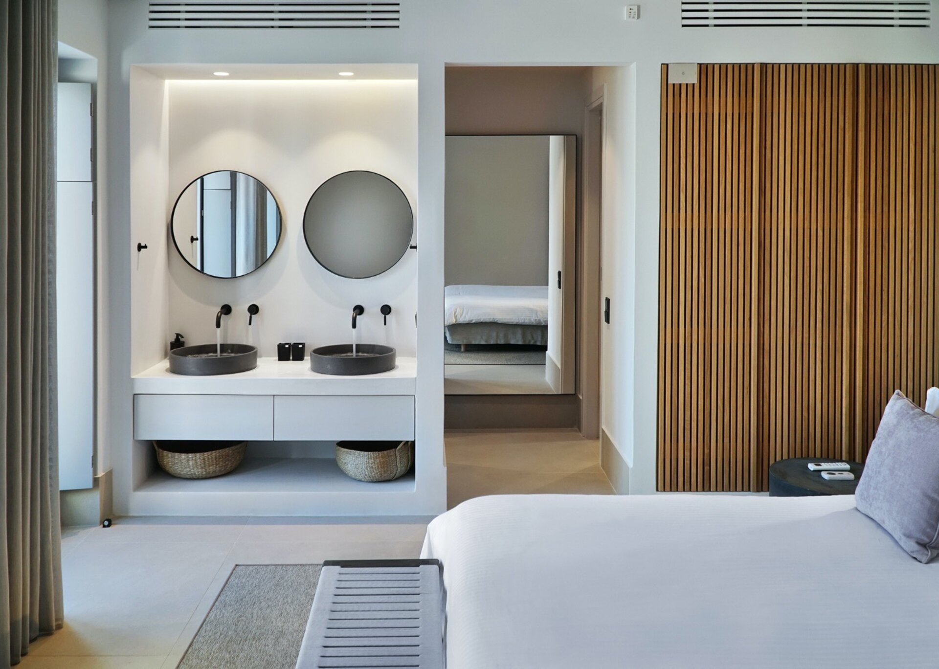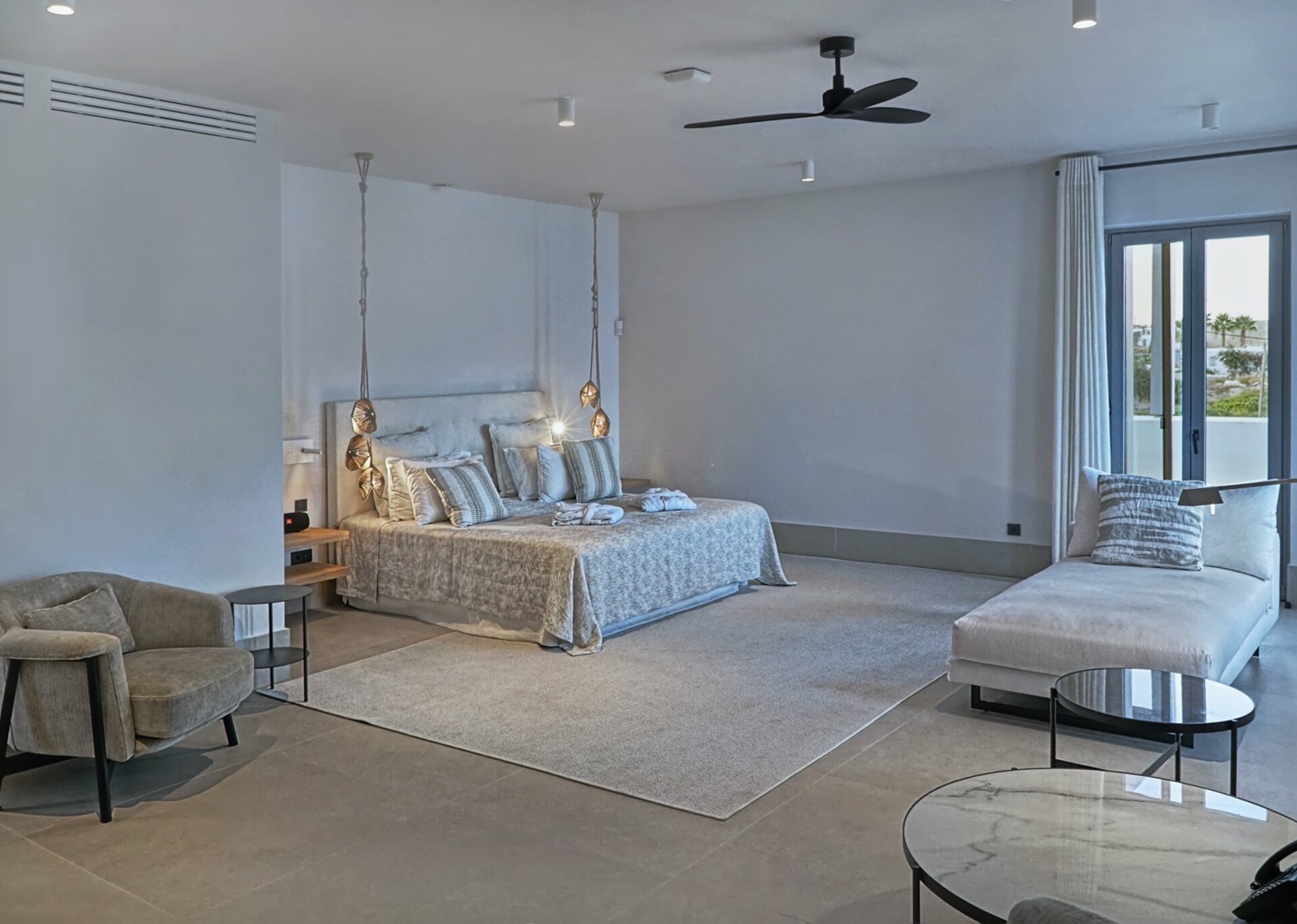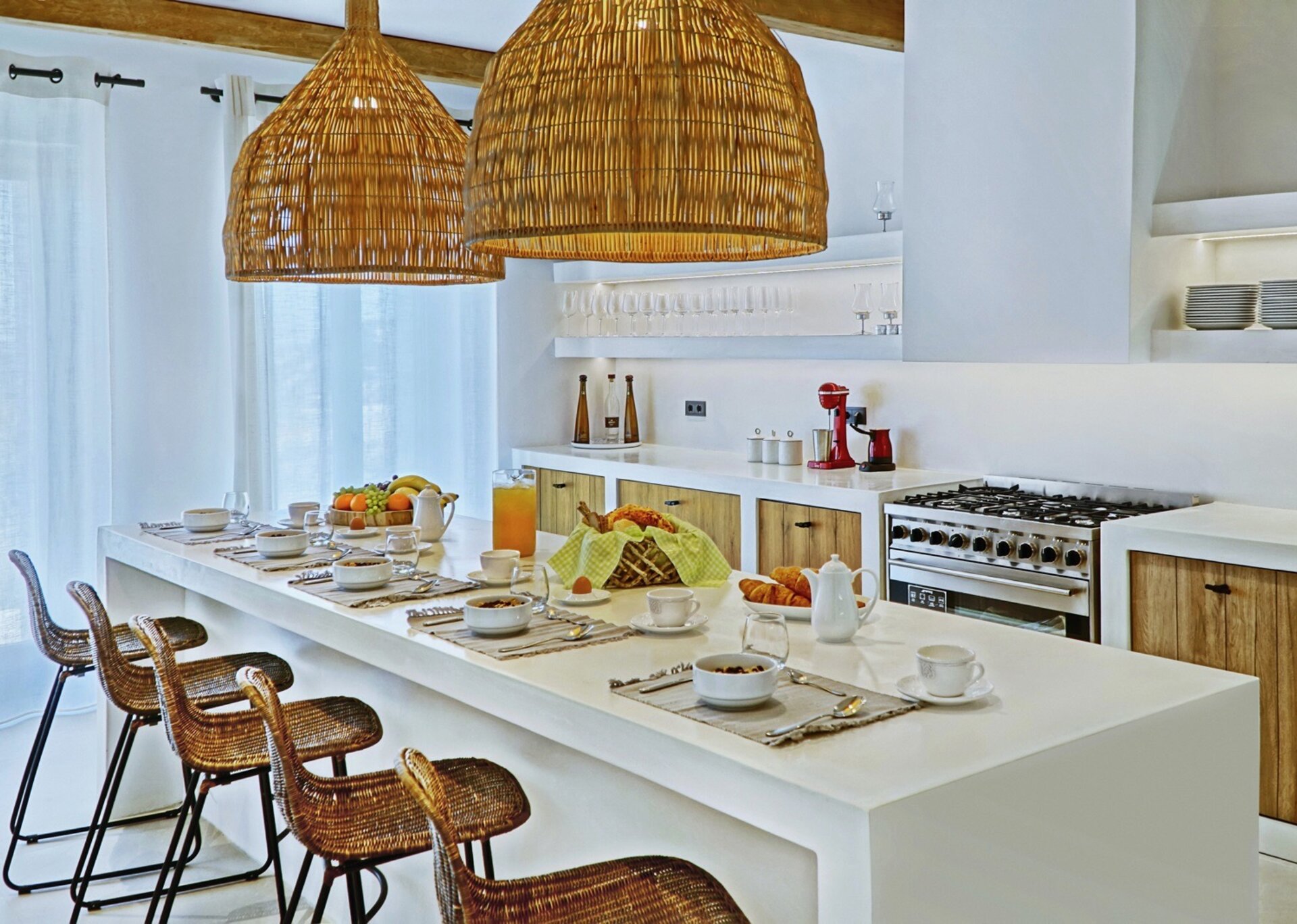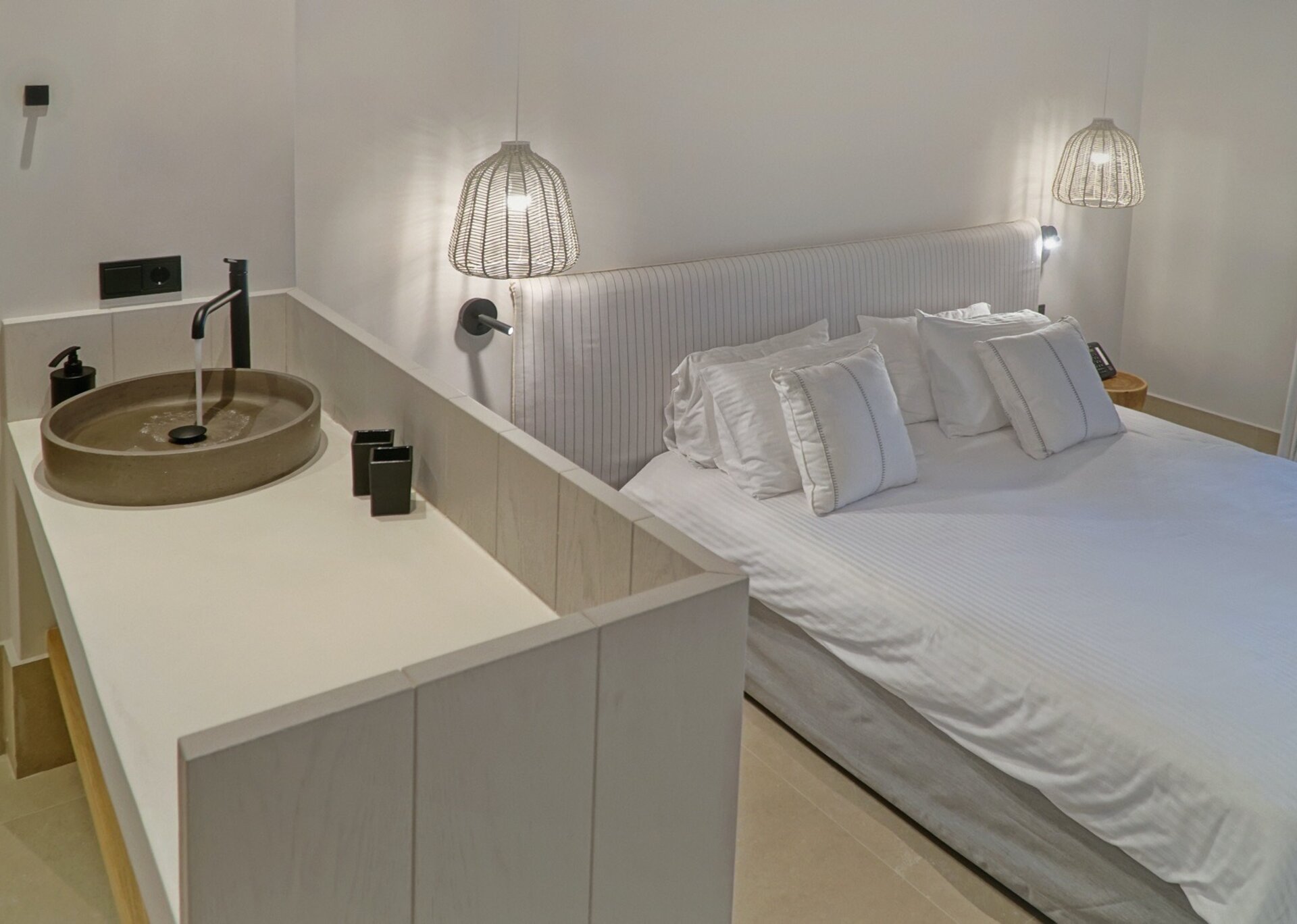 Inside, a predominantly white interior sets the stage for the Aegean Sea's modern aesthetics, allowing the wooden elements to shine. The oak beams of the roof, the carefully chosen lighting fixtures, and the handcrafted decorative items elevate the overall aesthetics of the building. Designer furniture and fine cotton or linen fabrics blend harmoniously with the abundant natural light and sleek surfaces, creating a serene and unpretentious space, accentuated only by the occasional blue hue of the sea.