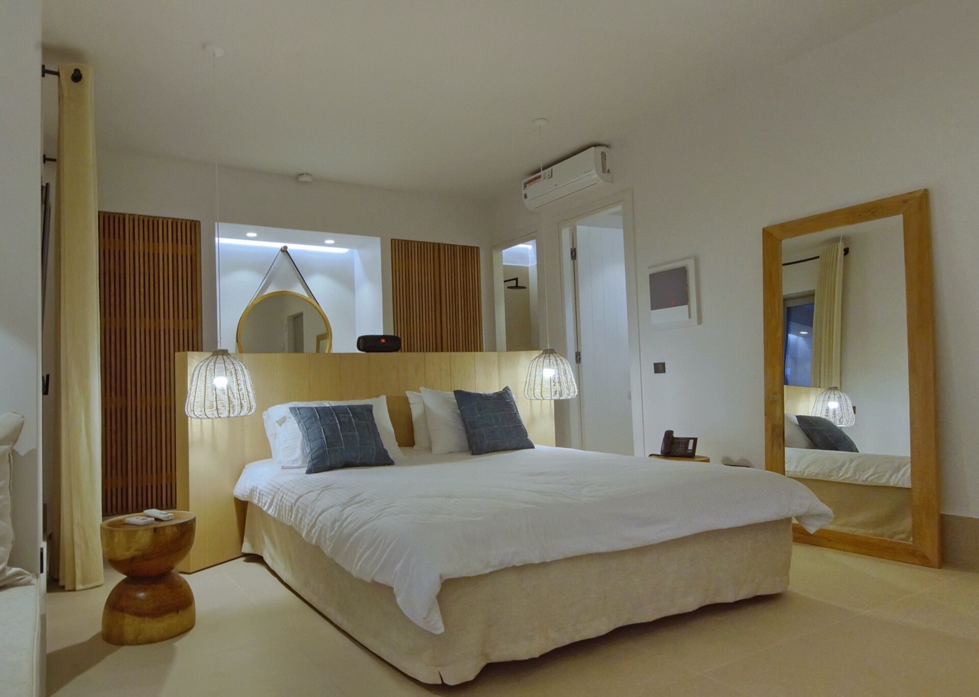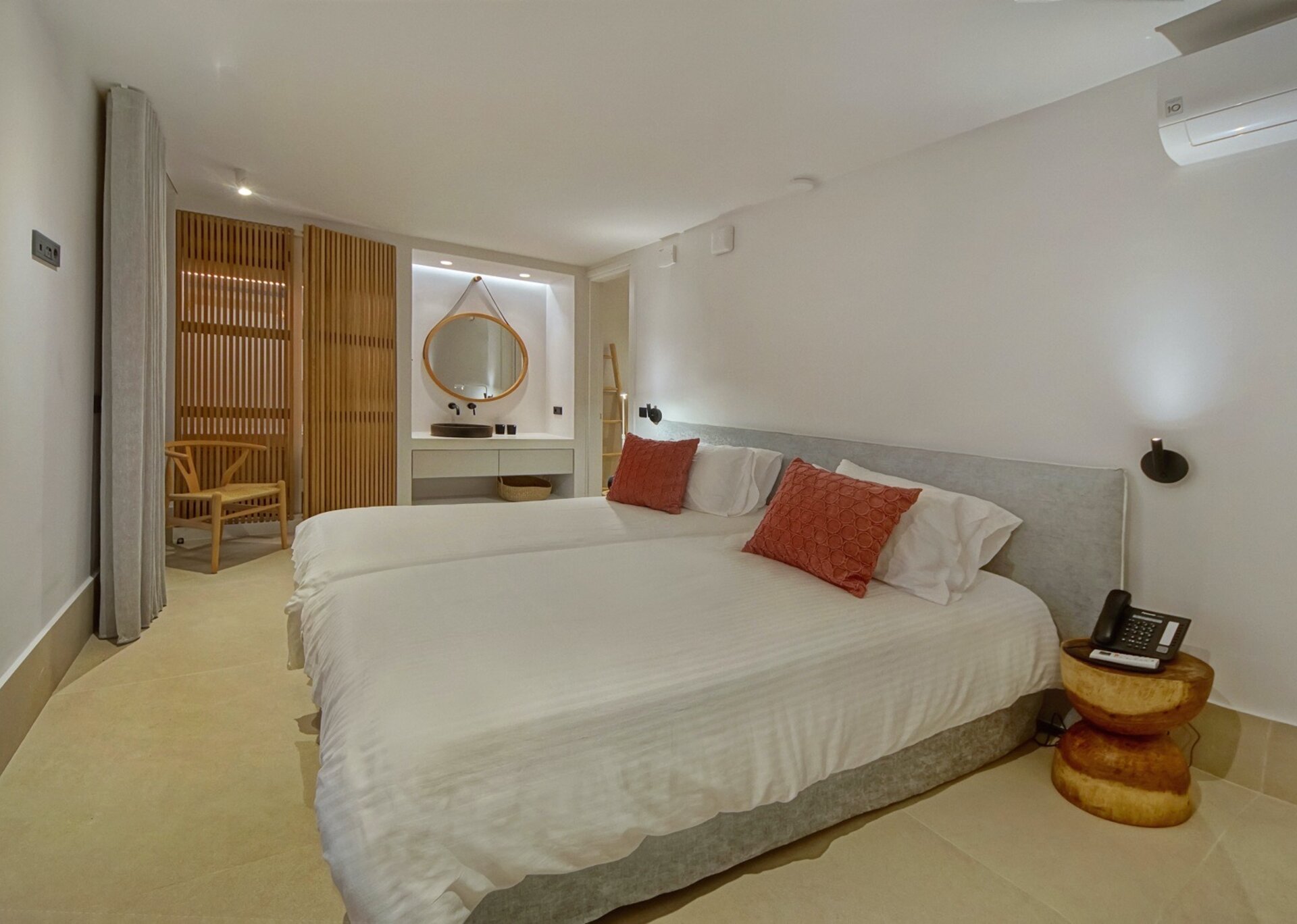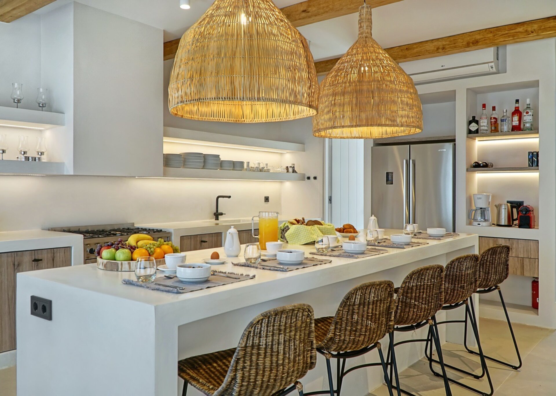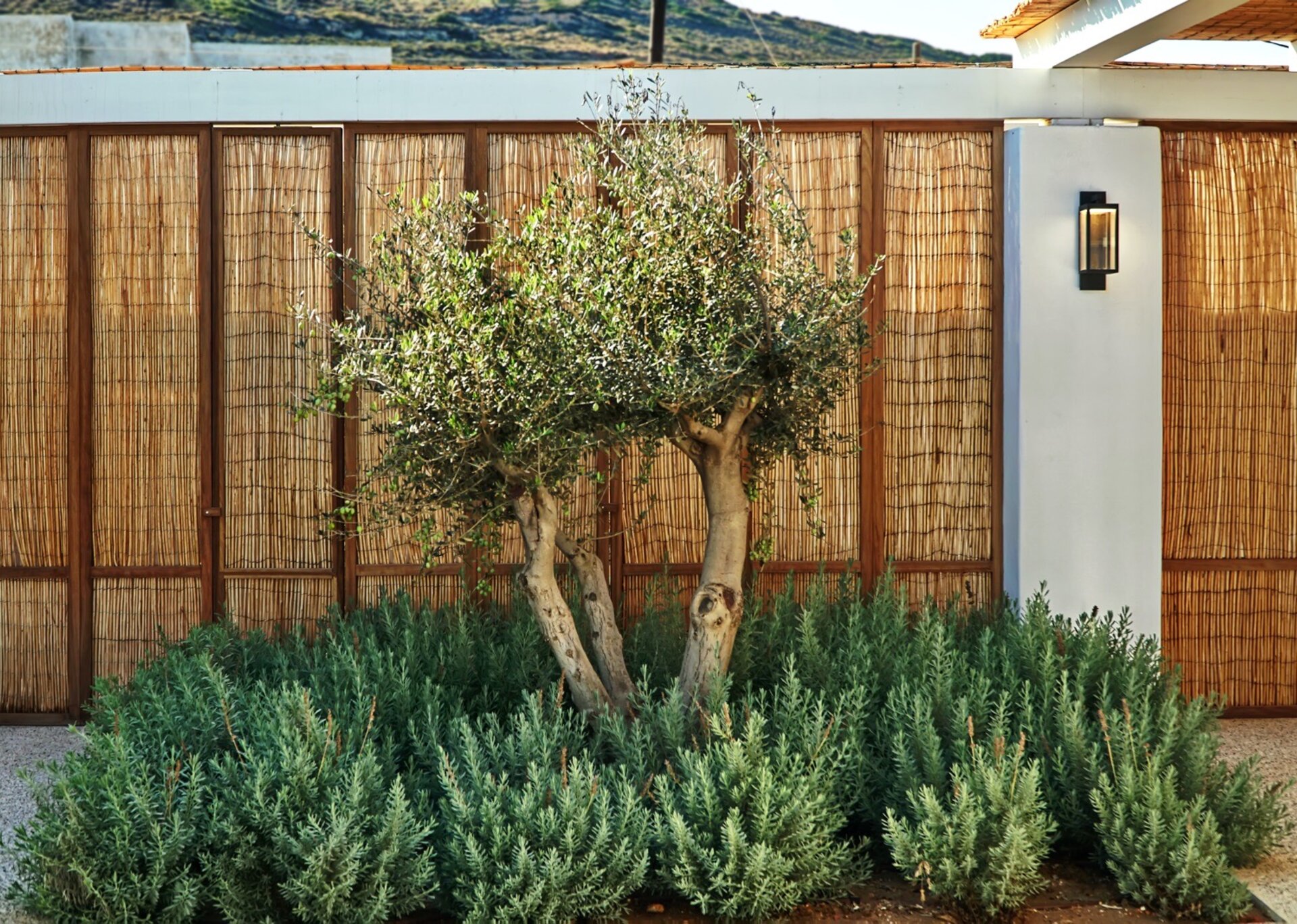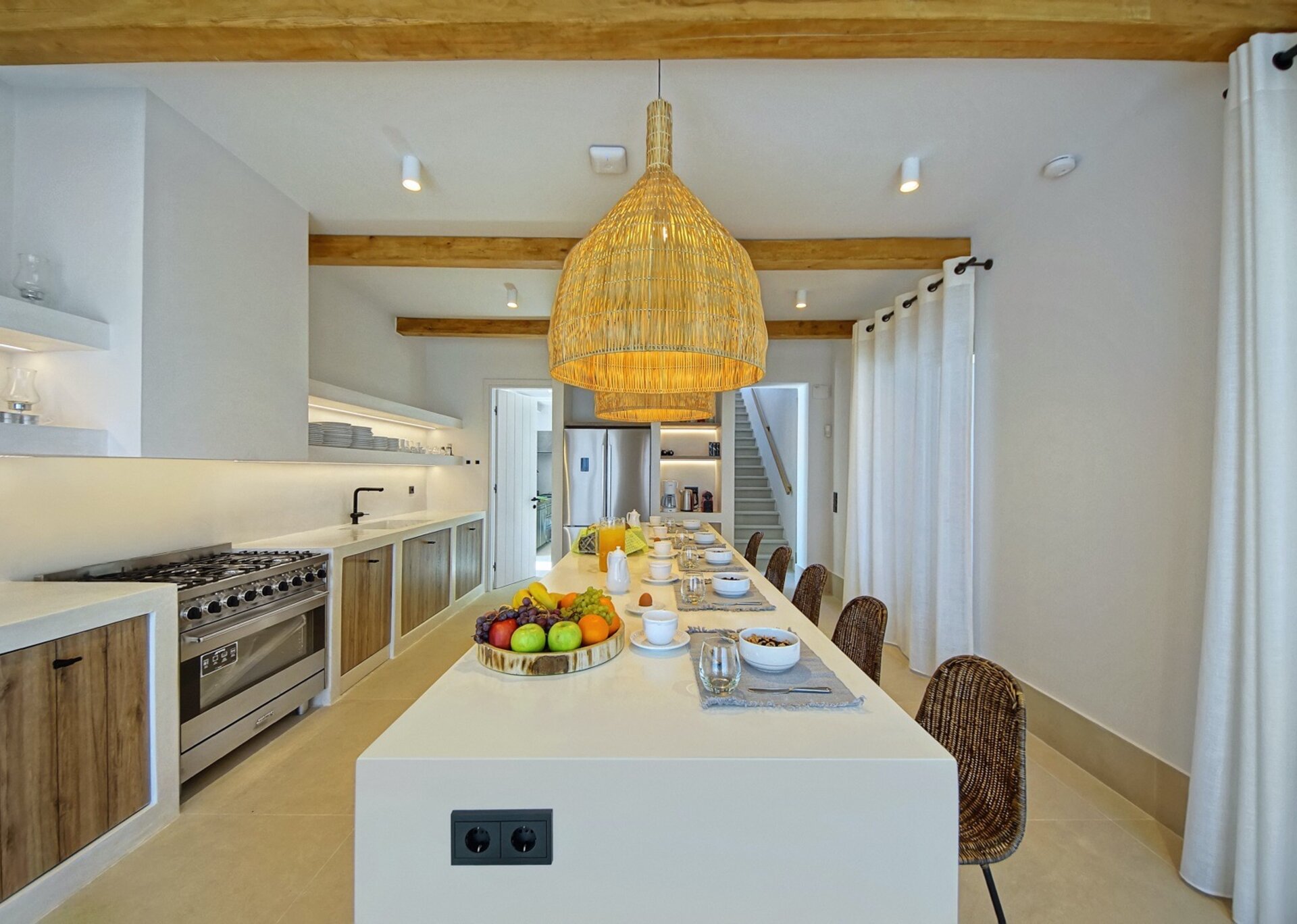 Inside, a predominantly white interior sets the stage for the Aegean Sea's modern aesthetics, allowing the wooden elements to shine. The oak beams of the roof, the carefully chosen lighting fixtures, and the handcrafted decorative items elevate the overall aesthetics of the building. Designer furniture and fine cotton or linen fabrics blend harmoniously with the abundant natural light and sleek surfaces, creating a serene and unpretentious space, accentuated only by the occasional blue hue of the sea.