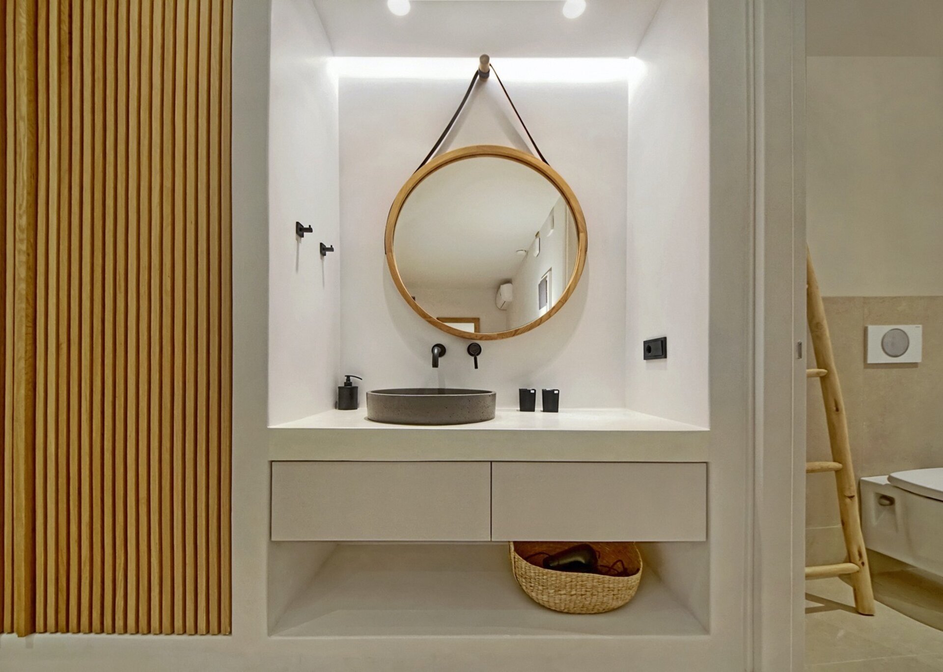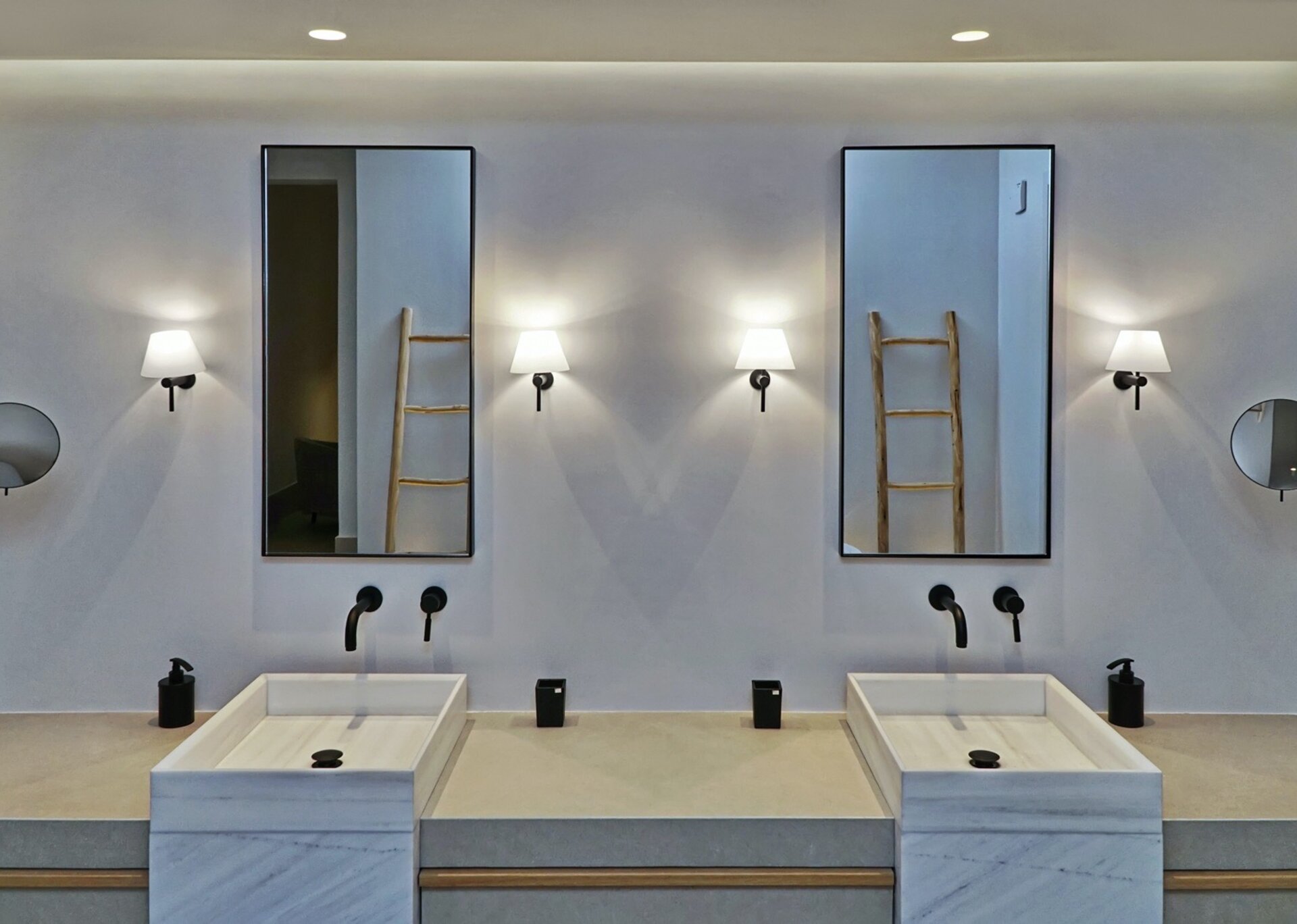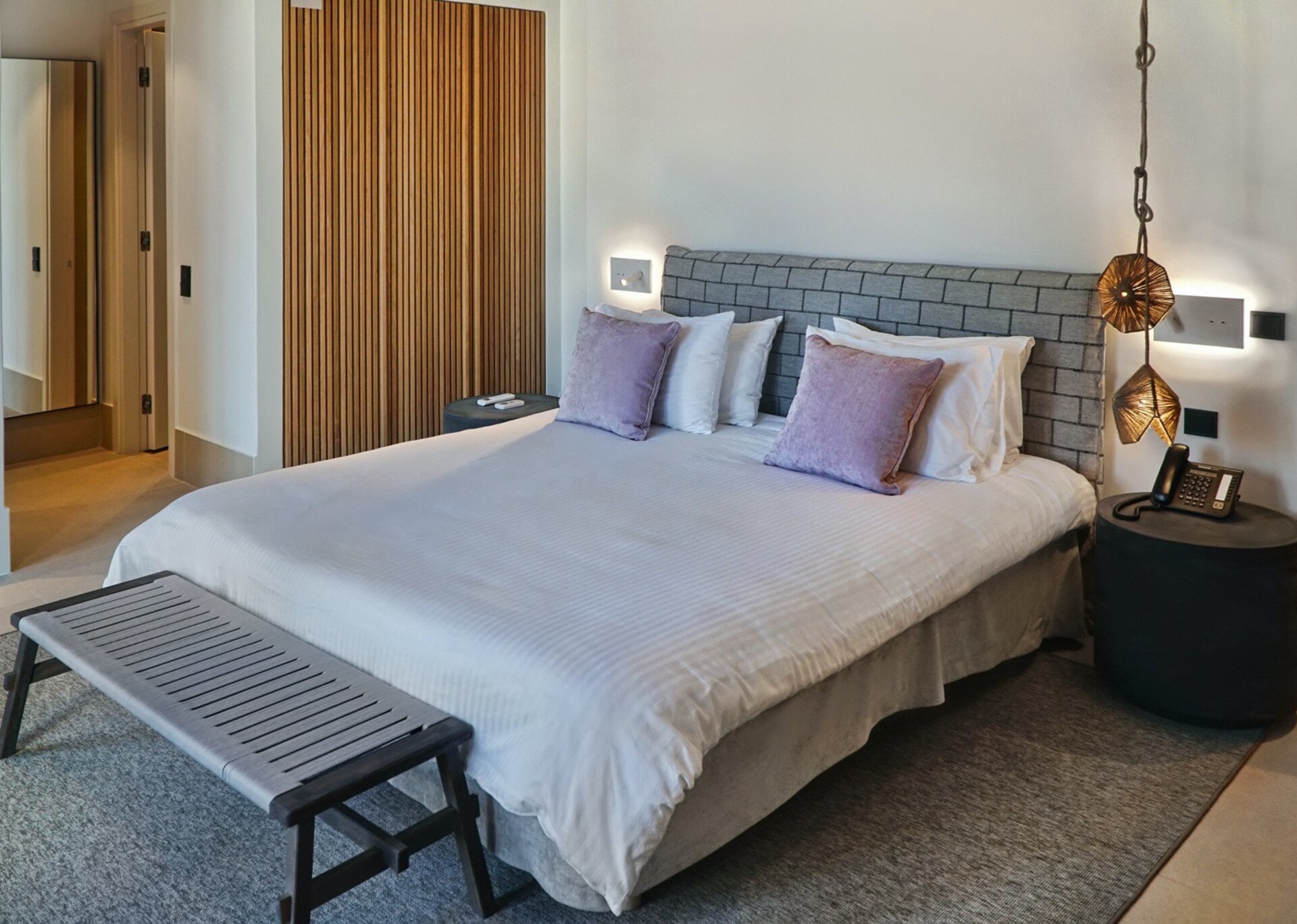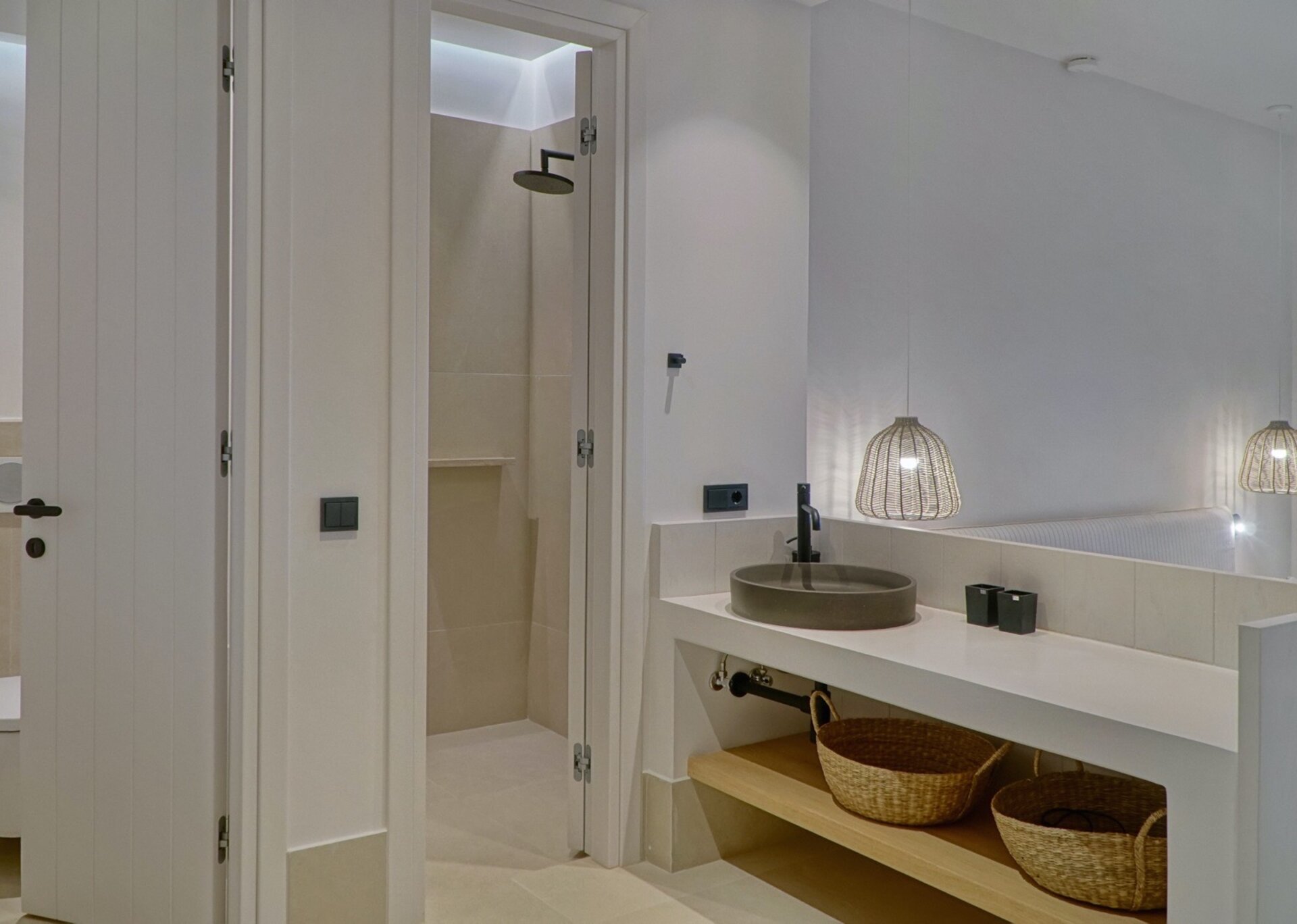 Inside, a predominantly white interior sets the stage for the Aegean Sea's modern aesthetics, allowing the wooden elements to shine. The oak beams of the roof, the carefully chosen lighting fixtures, and the handcrafted decorative items elevate the overall aesthetics of the building. Designer furniture and fine cotton or linen fabrics blend harmoniously with the abundant natural light and sleek surfaces, creating a serene and unpretentious space, accentuated only by the occasional blue hue of the sea.