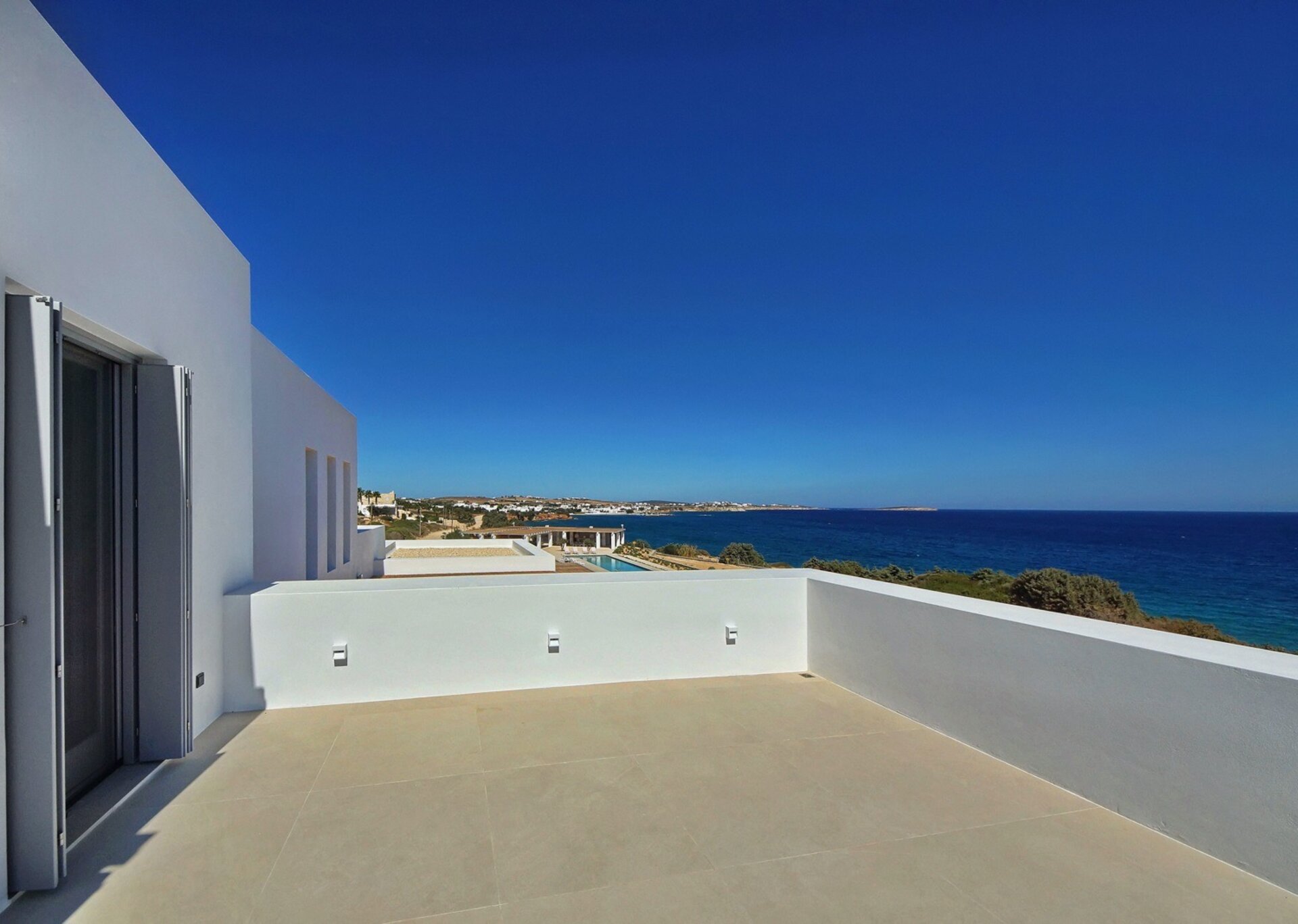 The impressive main building spans two levels, featuring a master suite with an en-suite bathroom on the first floor, and two additional bedrooms on the ground level, one with its own private entrance. Within the same building, you'll find the main indoor lounge boasting a spectacular sea view, a fully equipped kitchen, and a professional catering area. Three more independent rooms with private balconies overlooking the Aegean Sea can serve as guest rooms, ensuring all visitors have a unique living experience.