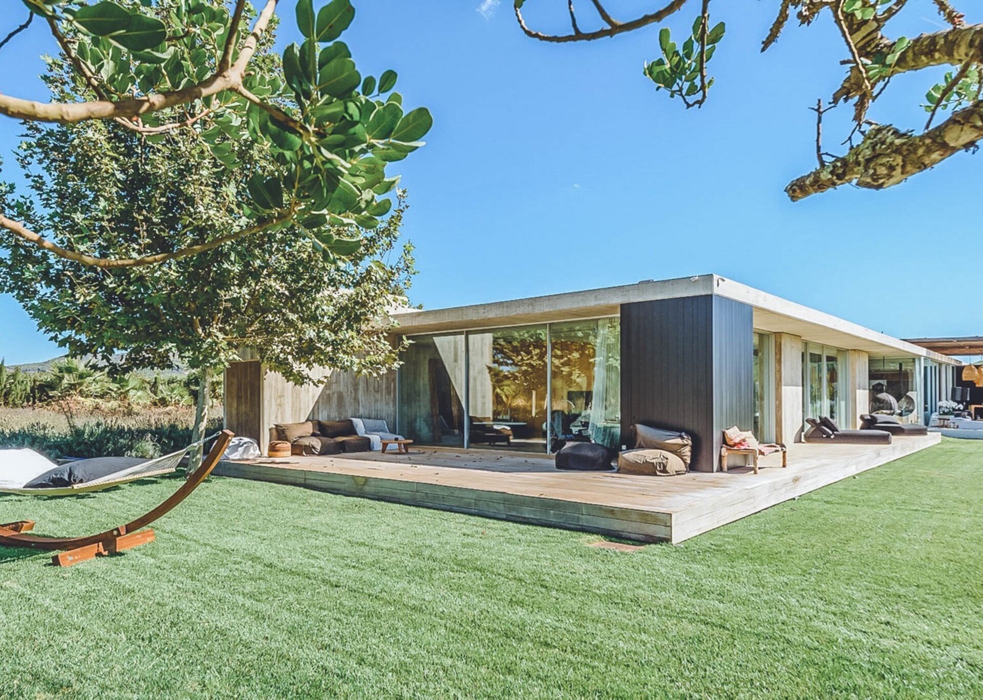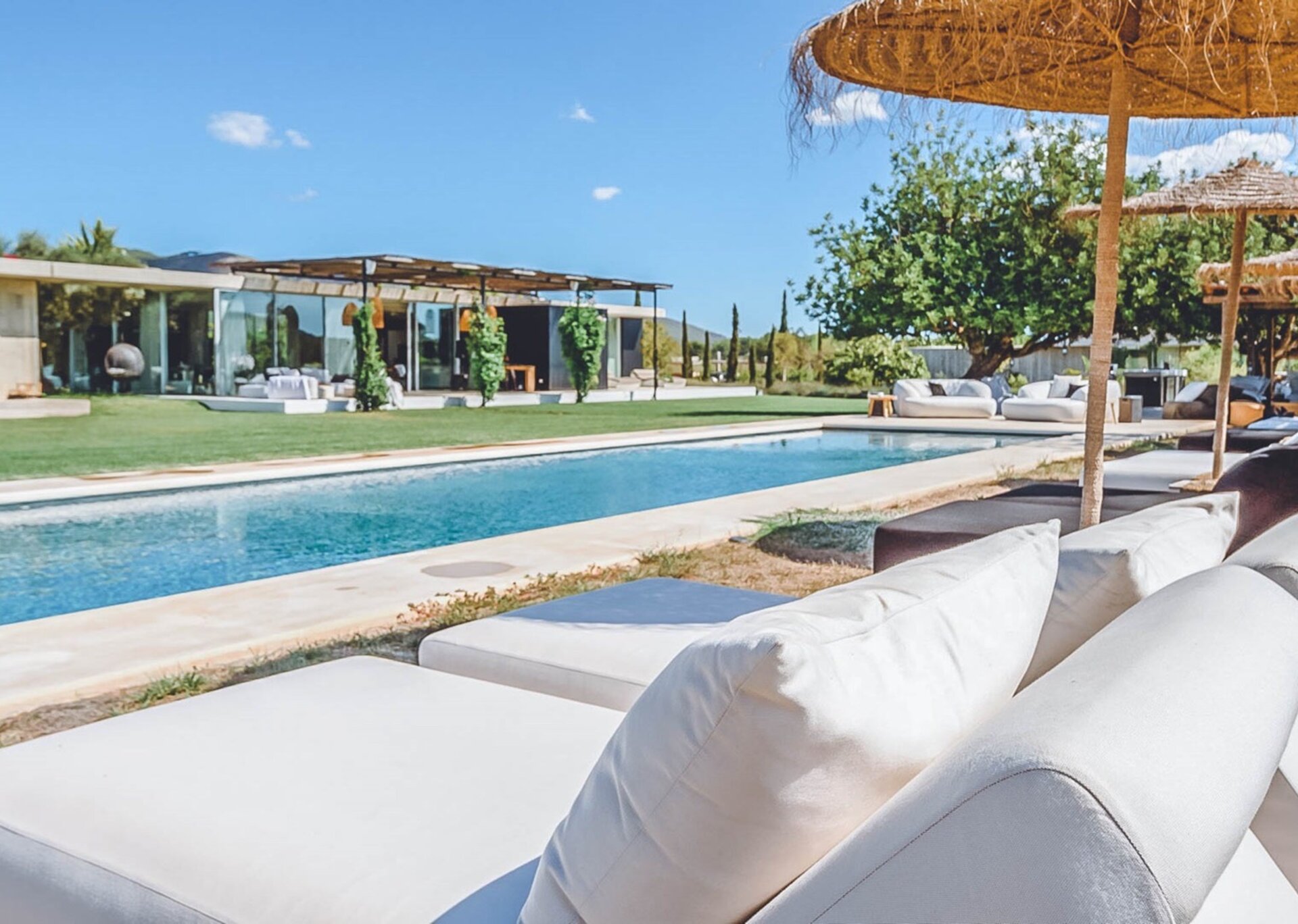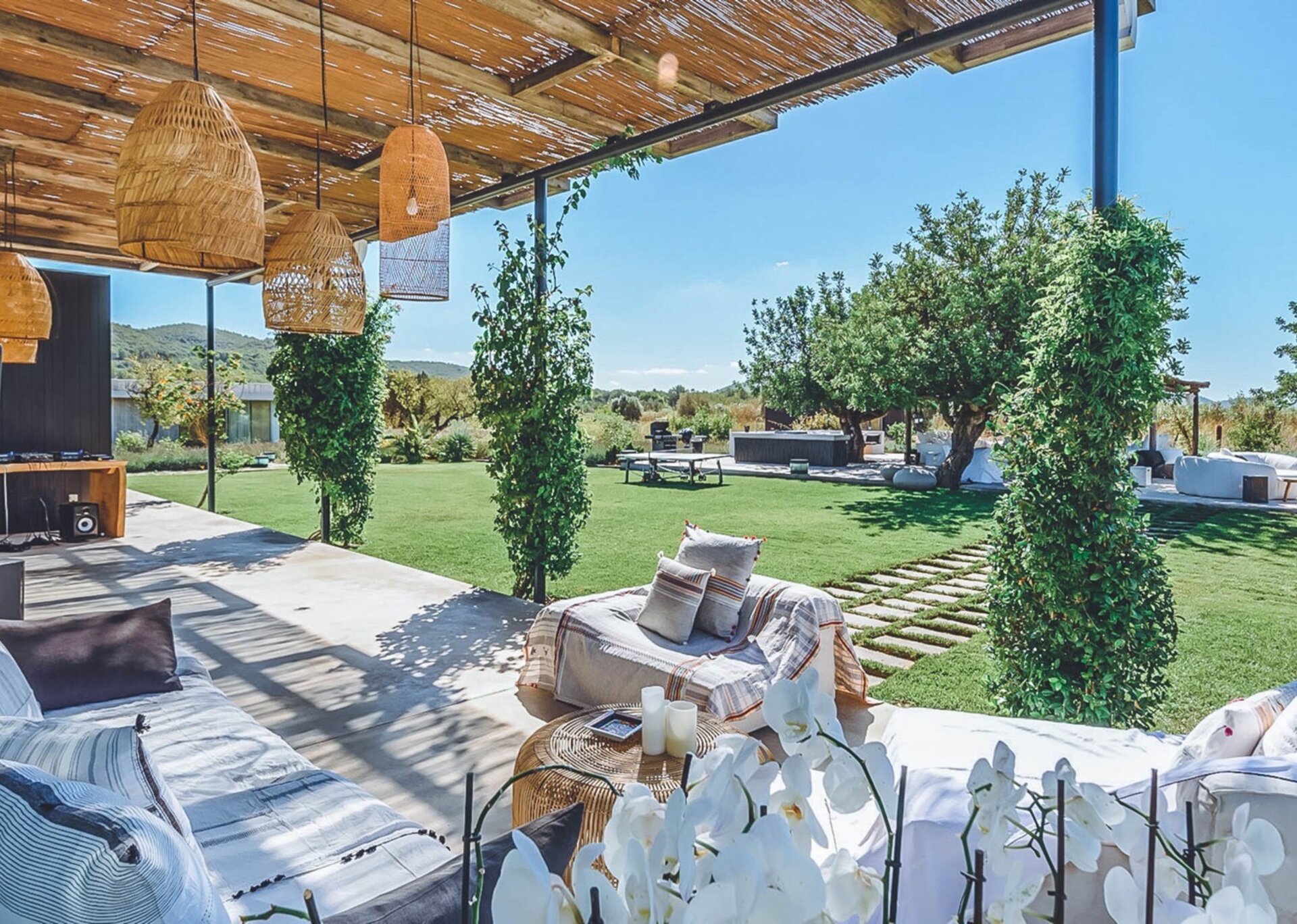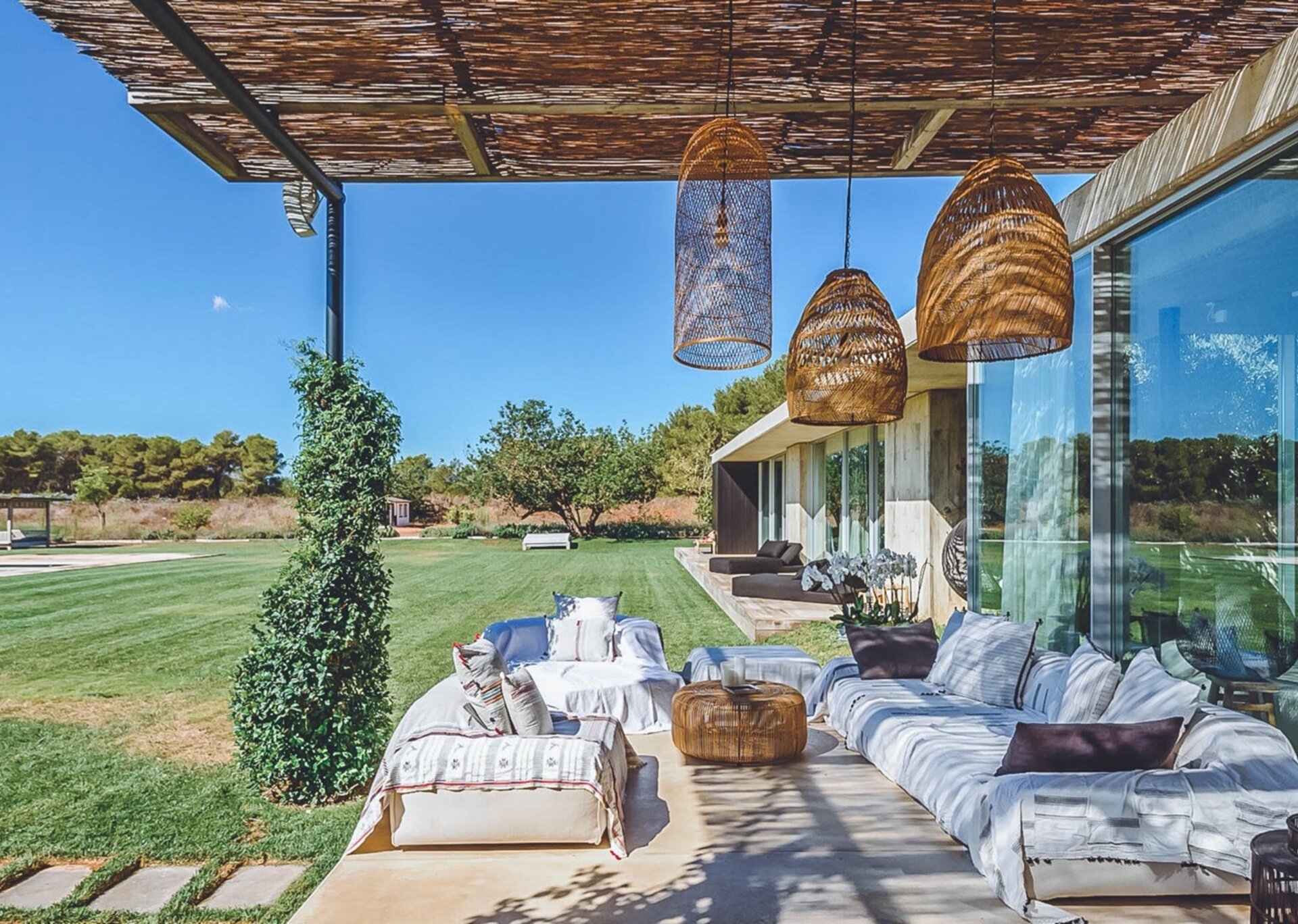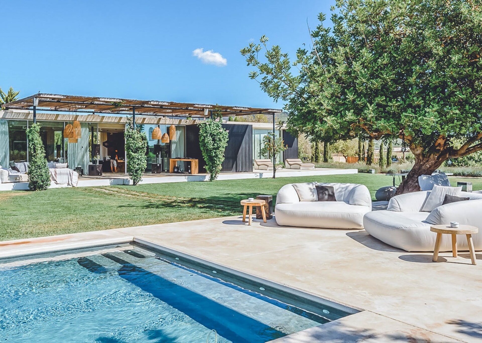 With glass windows throughout, nature becomes an integral part of the setting, perfectly complemented by lush green lawns as the backdrop. Both inside and outside Villa Ronda, you'll find ample low-level seating, allowing you to unwind and connect with your tribe. The French owner's bohemian chic style is beautifully reflected in the interiors, where concrete floors meet warm Scandi wood, and accents of smudgy black charcoal blend with natural linens, wicker, and rattan.But this serene oasis isn't just for relaxation. Keep the young ones entertained on the football pitch while the adults work up a sweat in the fully equipped gym. And when you're in need of a refreshing dip, the large pool awaits, its crystal-clear waters reminiscent of the ocean. As night falls, gather your tribe in the cinema room for a movie night.
