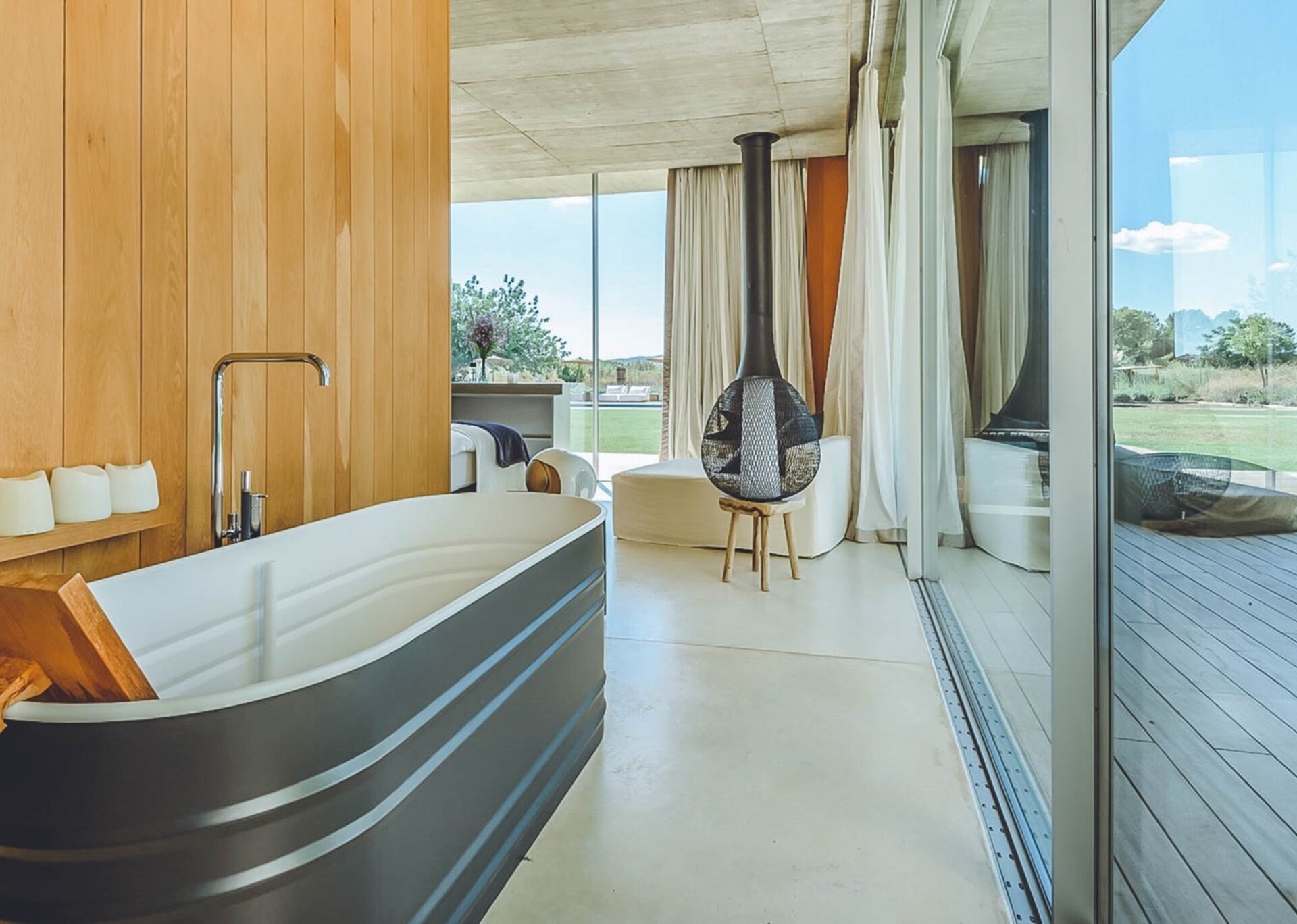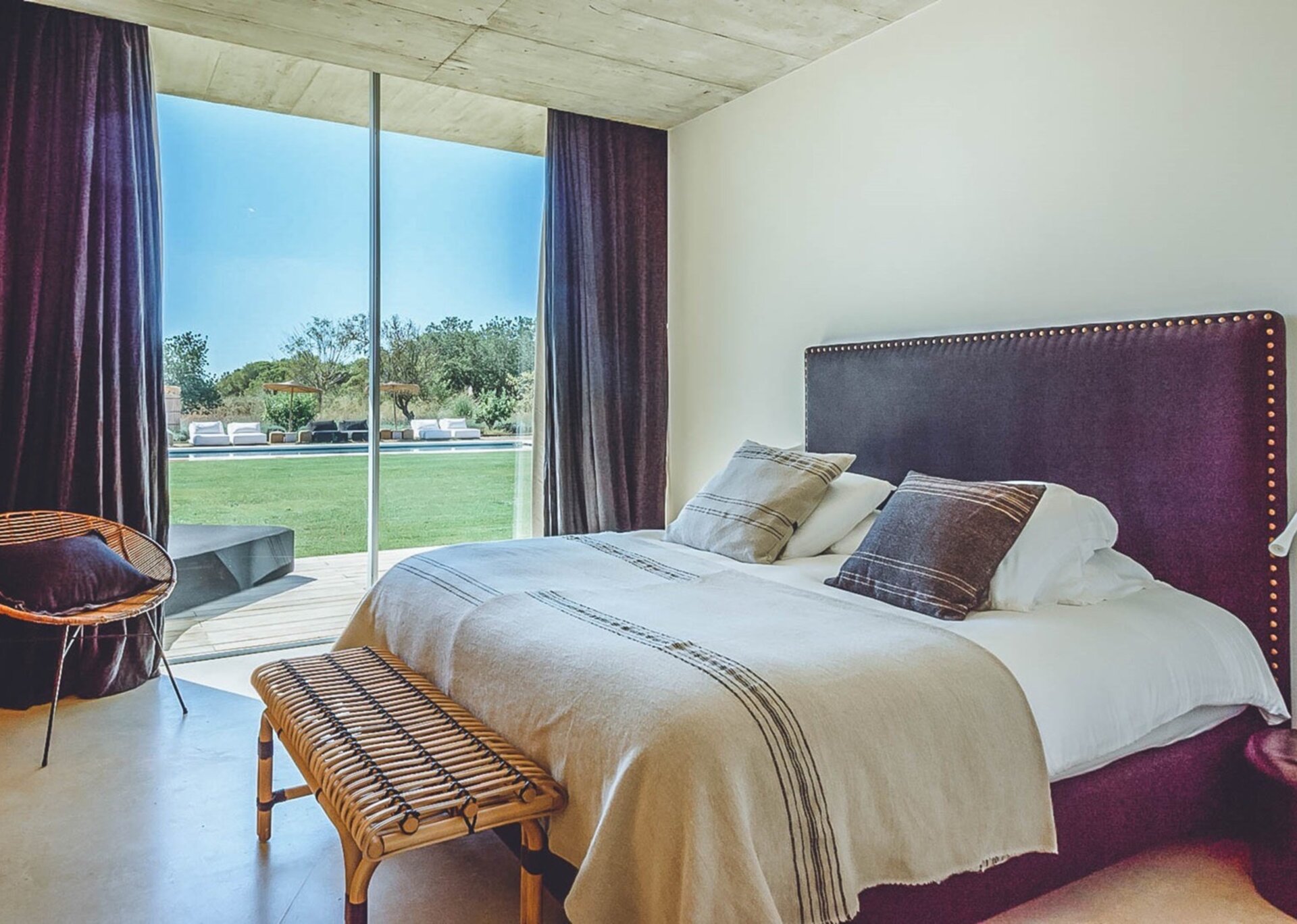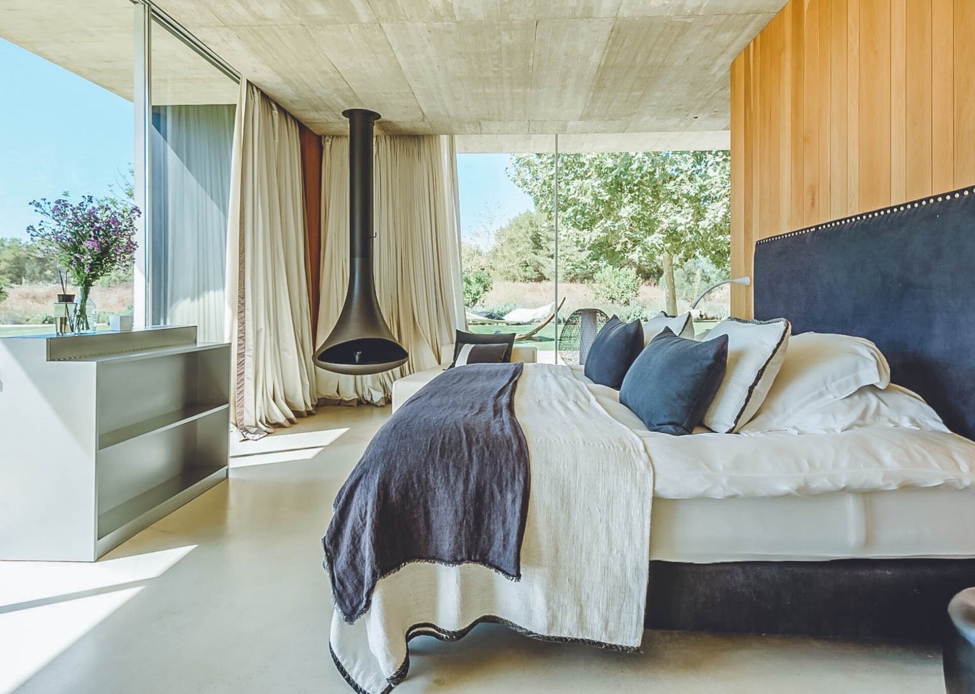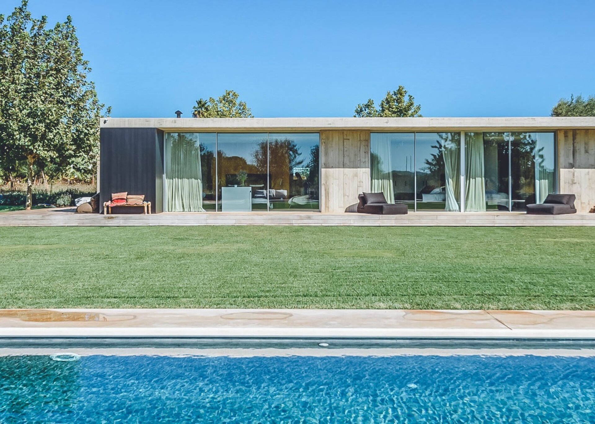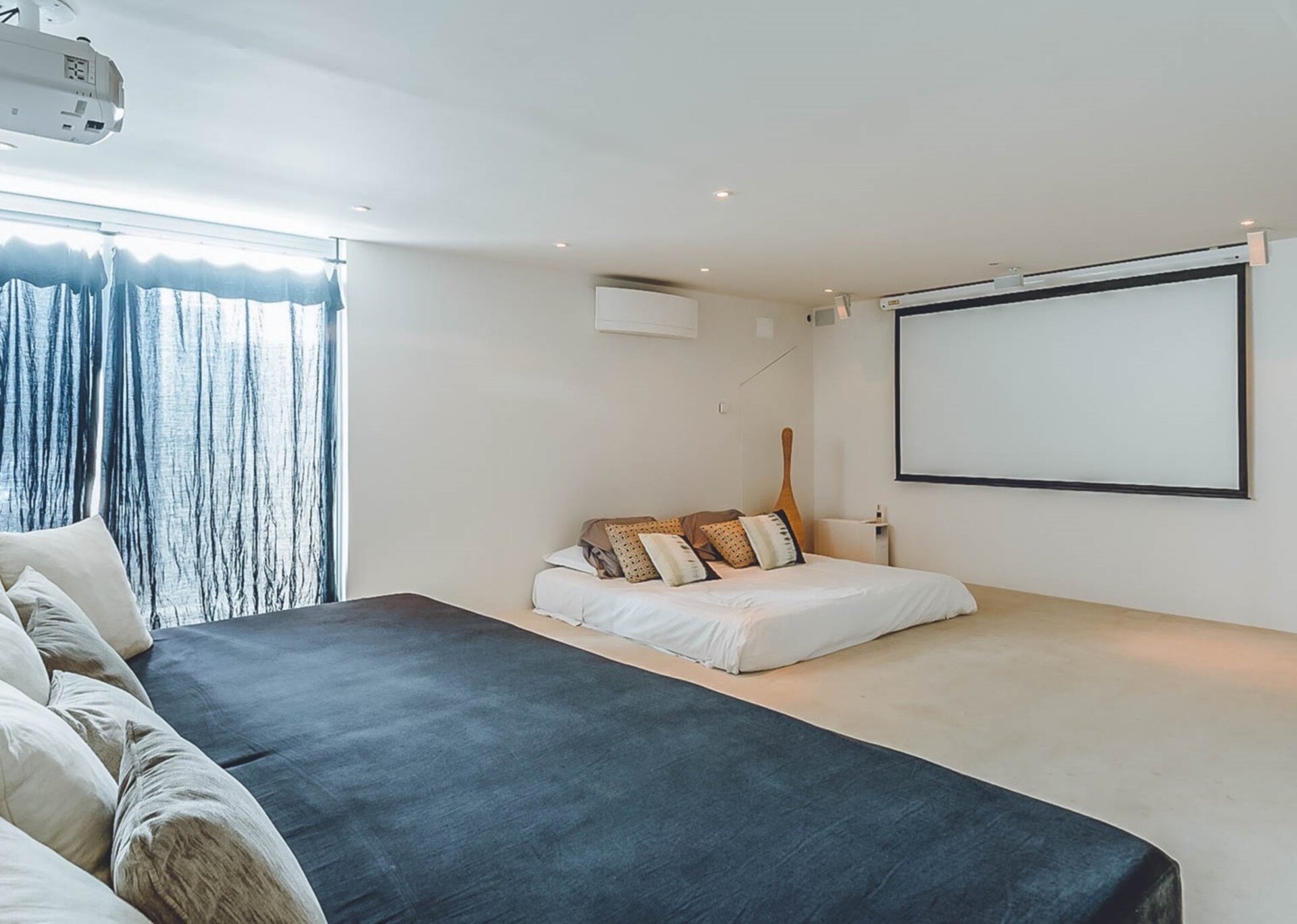 With glass windows throughout, nature becomes an integral part of the setting, perfectly complemented by lush green lawns as the backdrop. Both inside and outside Villa Ronda, you'll find ample low-level seating, allowing you to unwind and connect with your tribe. The French owner's bohemian chic style is beautifully reflected in the interiors, where concrete floors meet warm Scandi wood, and accents of smudgy black charcoal blend with natural linens, wicker, and rattan.But this serene oasis isn't just for relaxation. Keep the young ones entertained on the football pitch while the adults work up a sweat in the fully equipped gym. And when you're in need of a refreshing dip, the large pool awaits, its crystal-clear waters reminiscent of the ocean. As night falls, gather your tribe in the cinema room for a movie night.