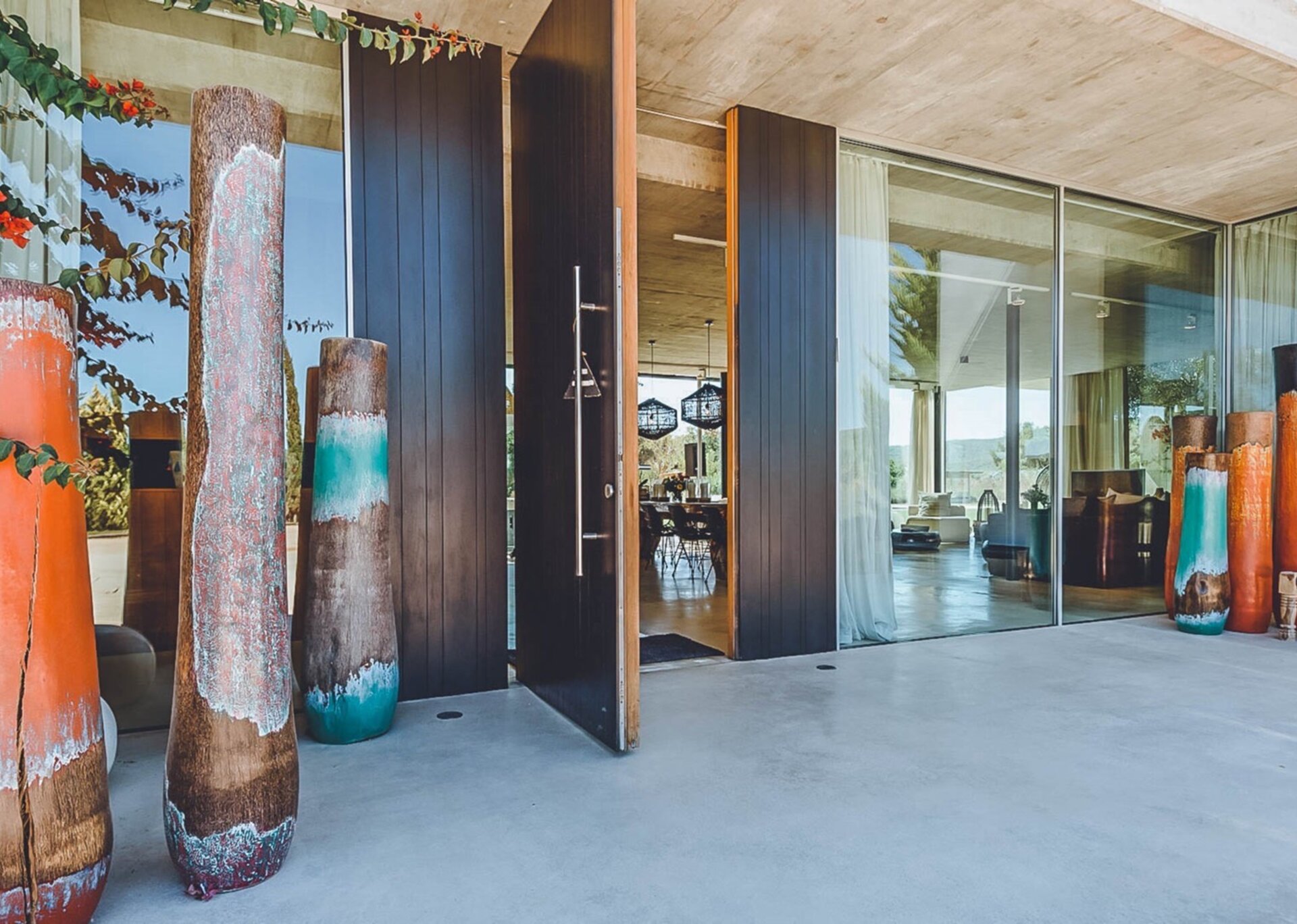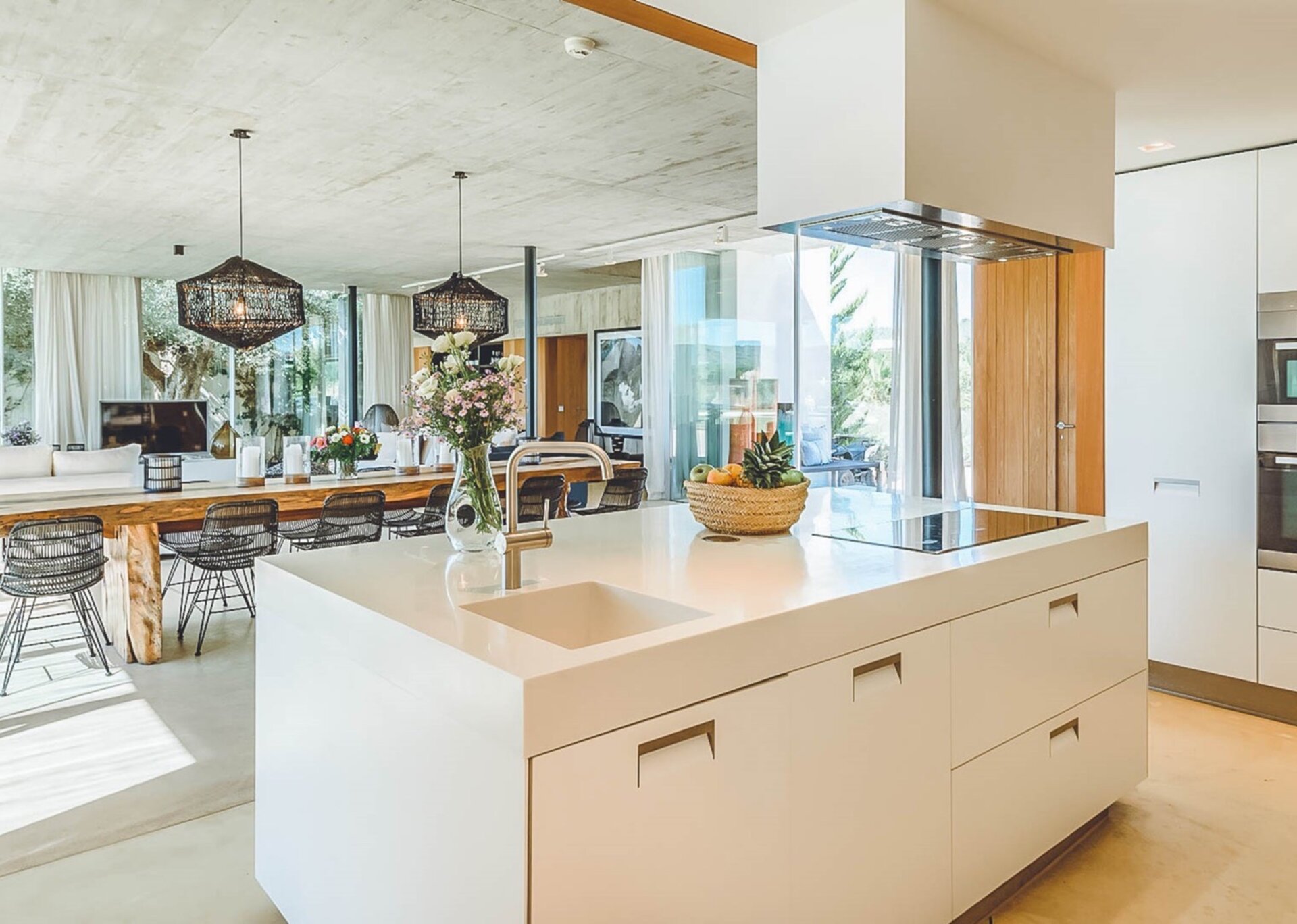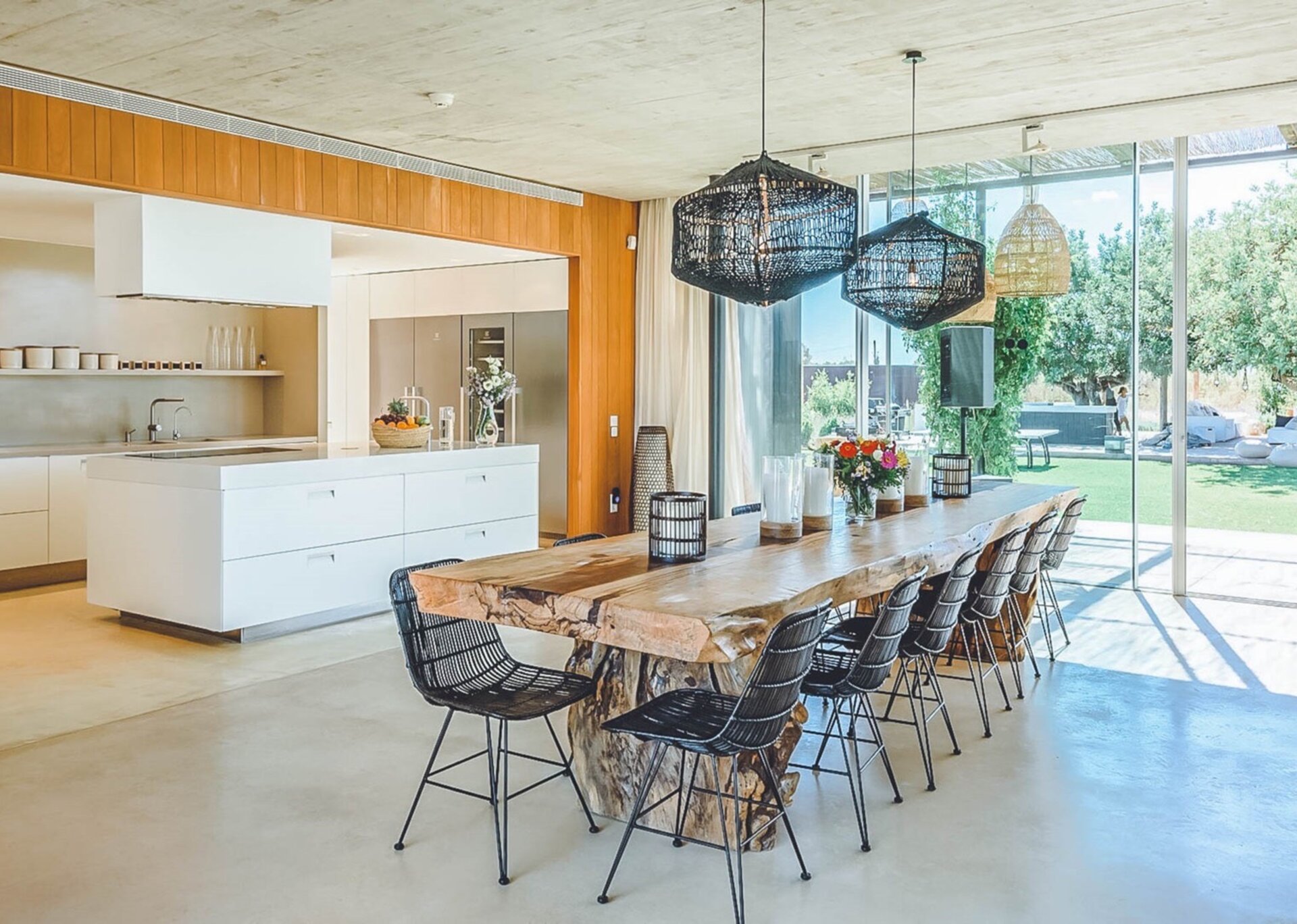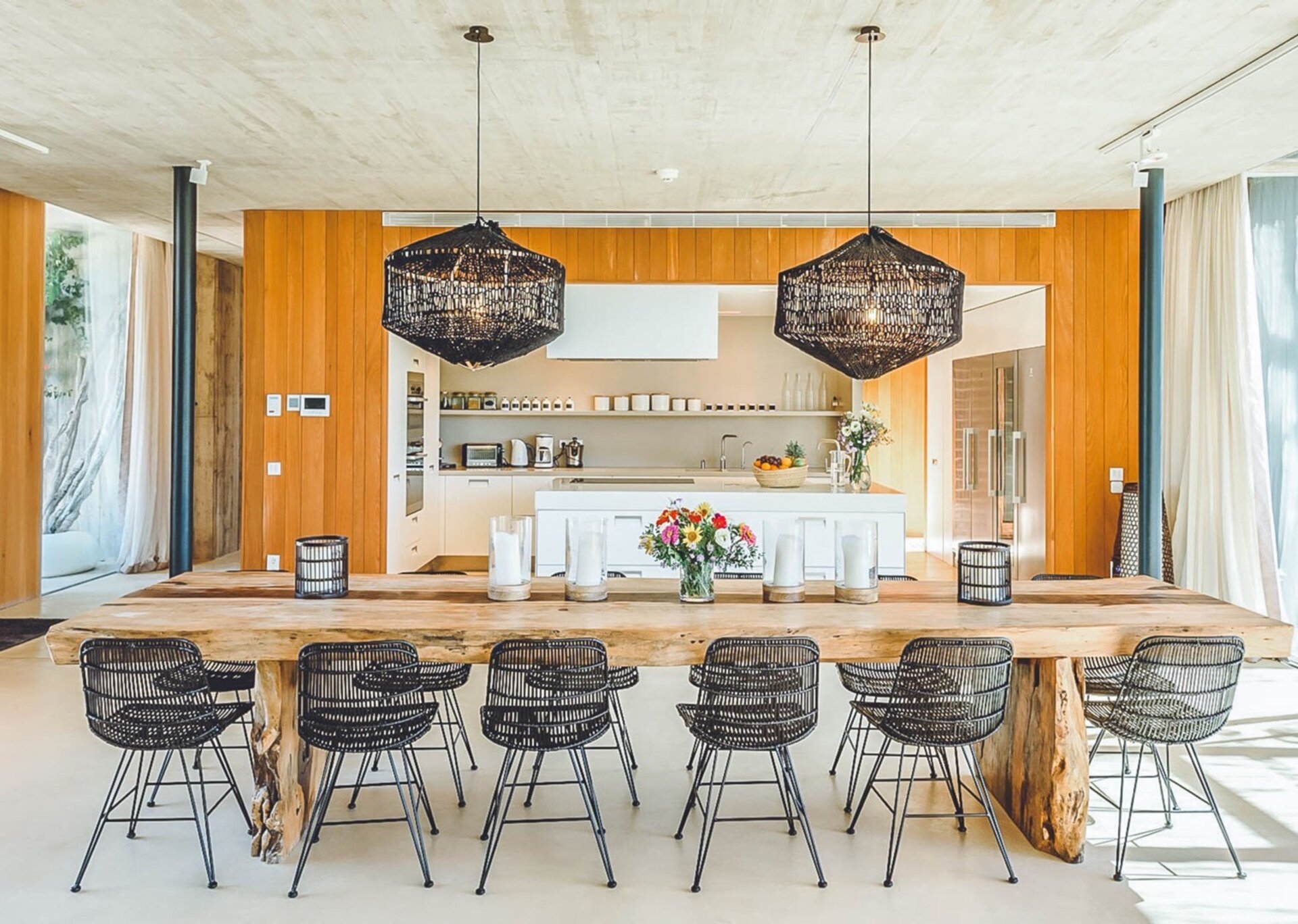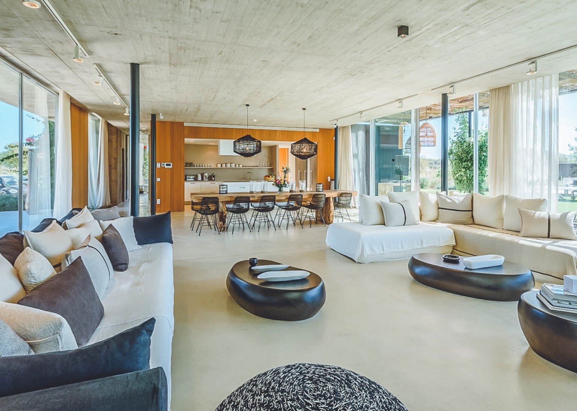 The heart of the villa lies in the expansive open-plan living room, kitchen, and dining area. Bathed in natural light thanks to the floor-to-ceiling glass windows, the room exudes an airy and inviting ambiance. The black columns add an edgy industrial touch, while the creamy beige concrete floor and ceiling soften the overall aesthetic. You'll find comfort in the abundance of sumptuous seating options, and the large reclaimed wooden dining table, paired with modern black wicker chairs, sets the stage for unforgettable gatherings.