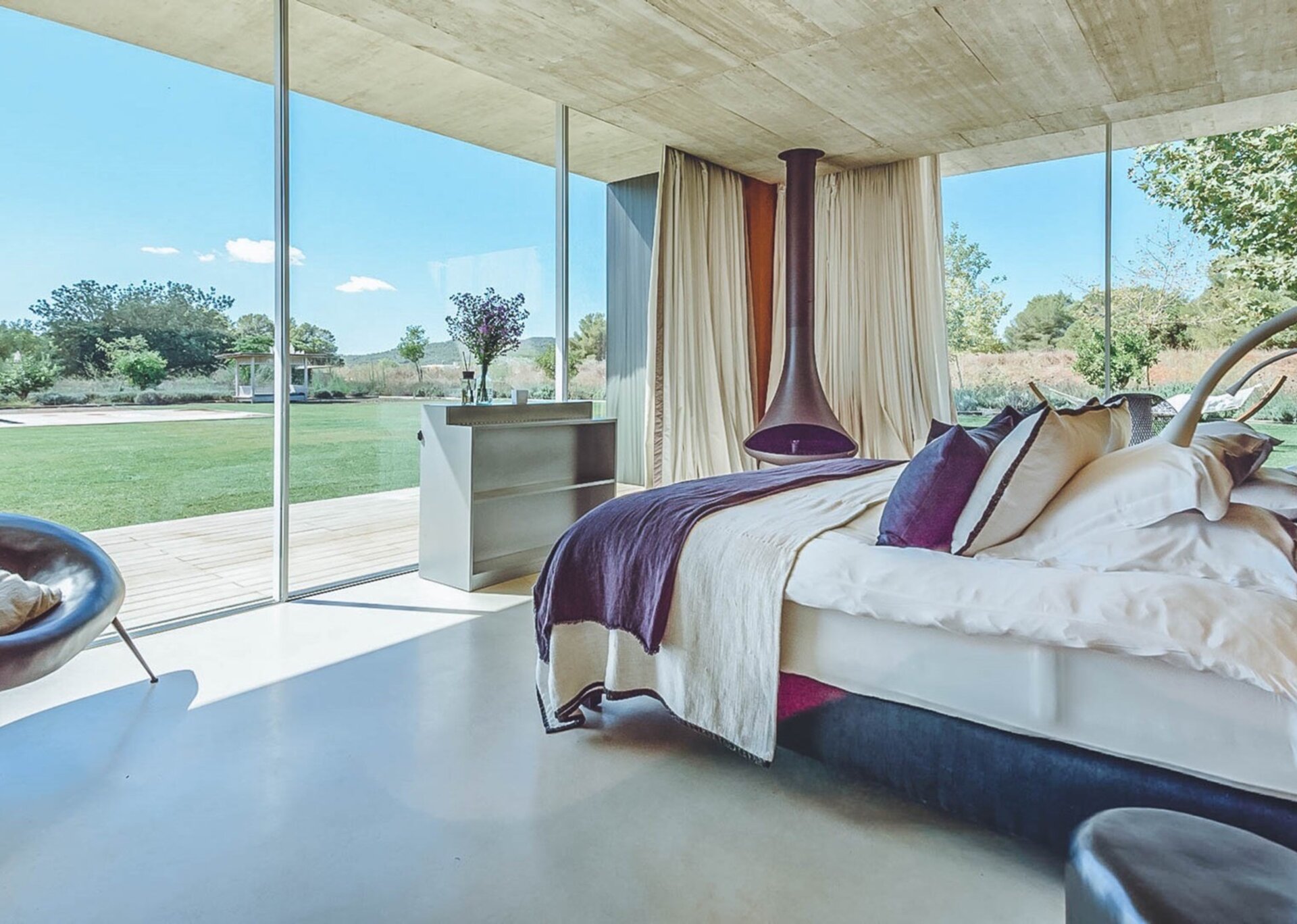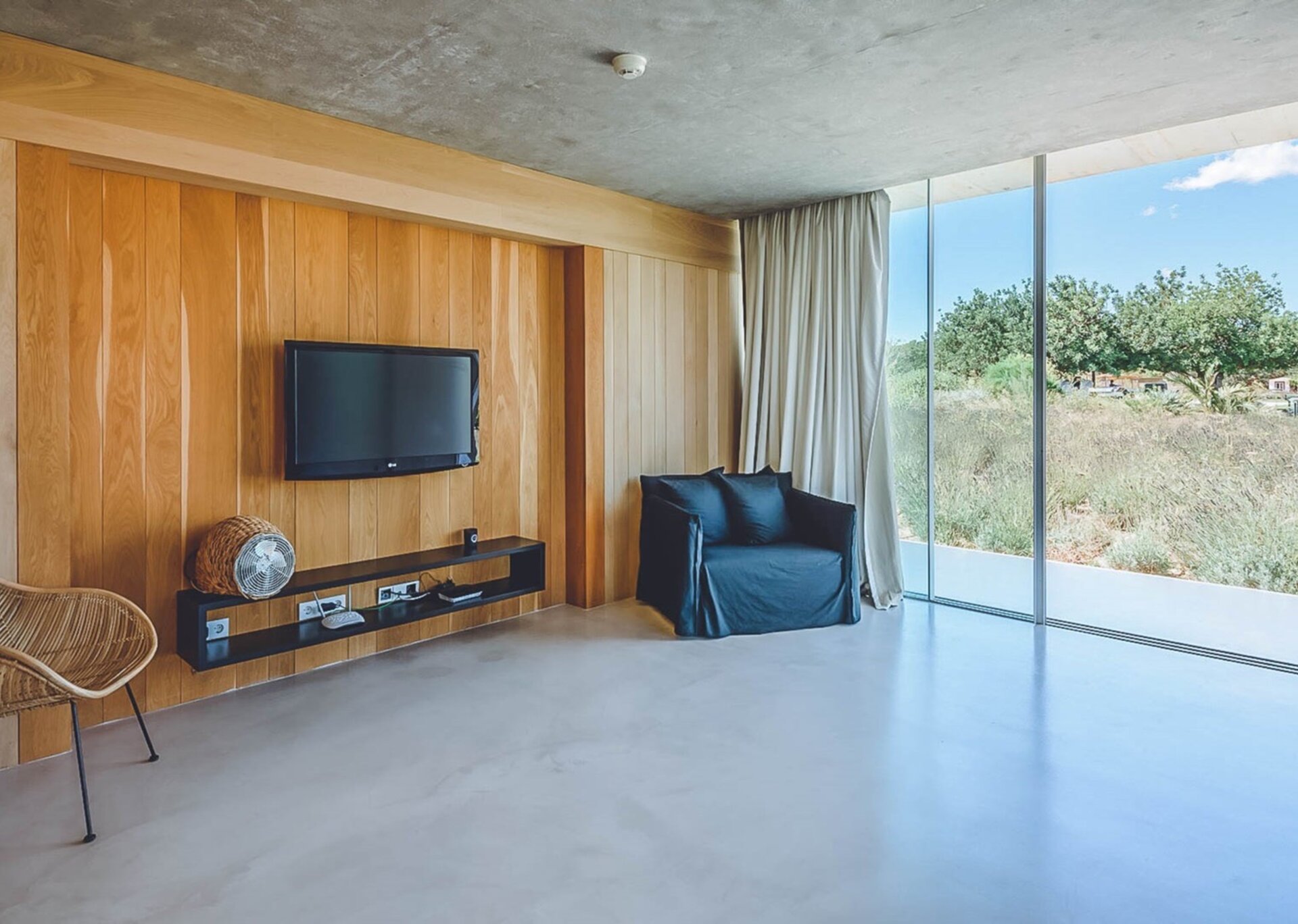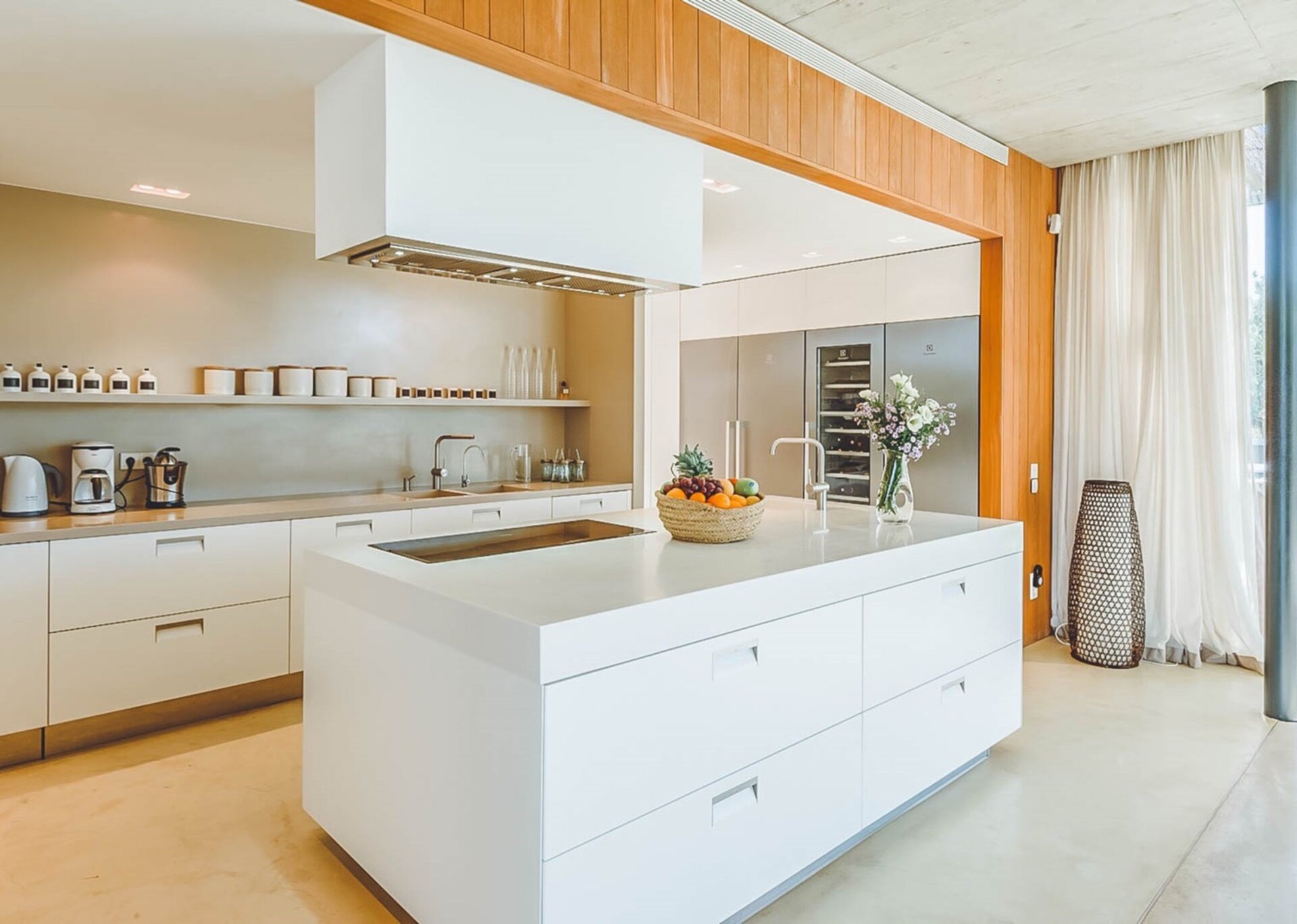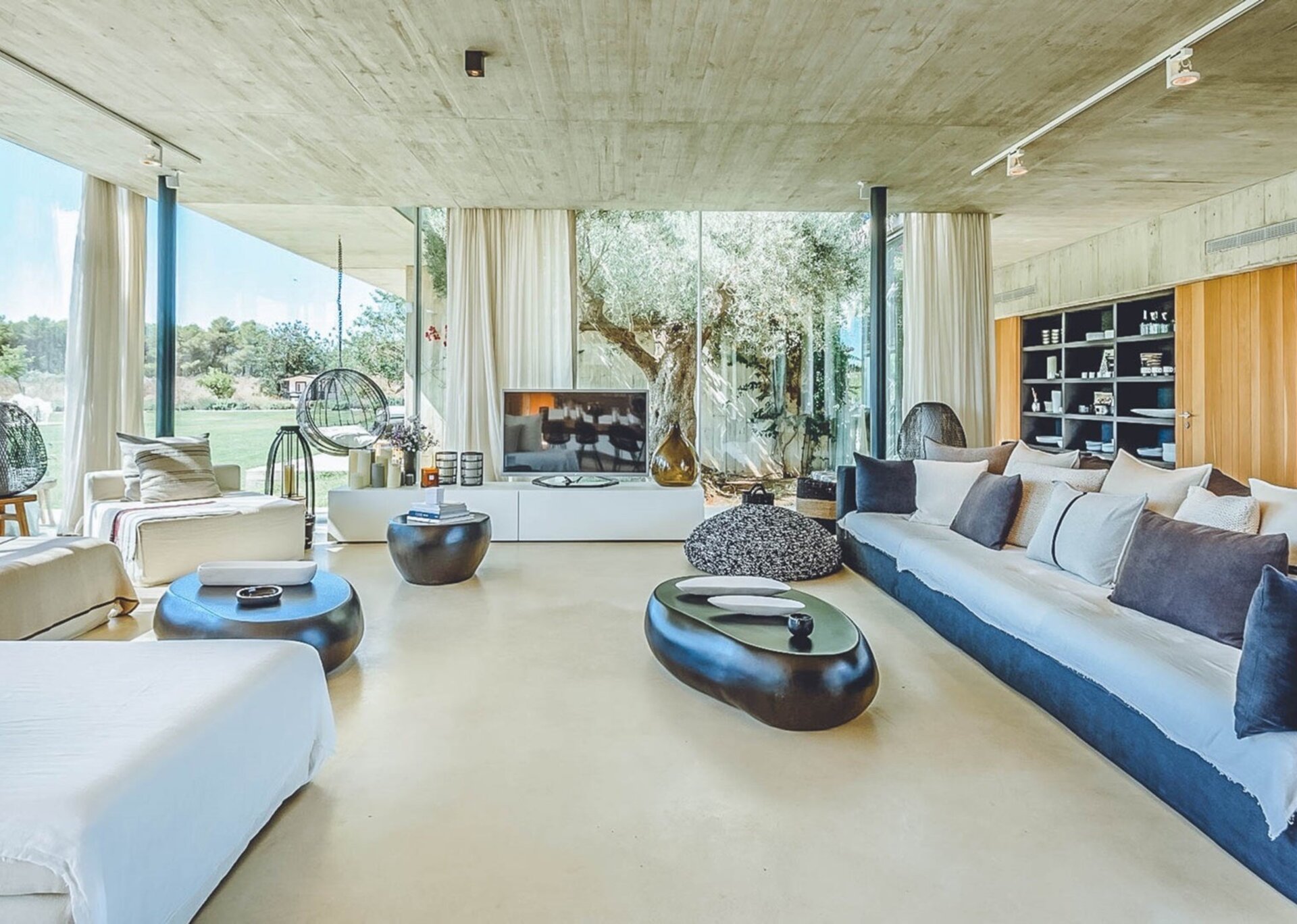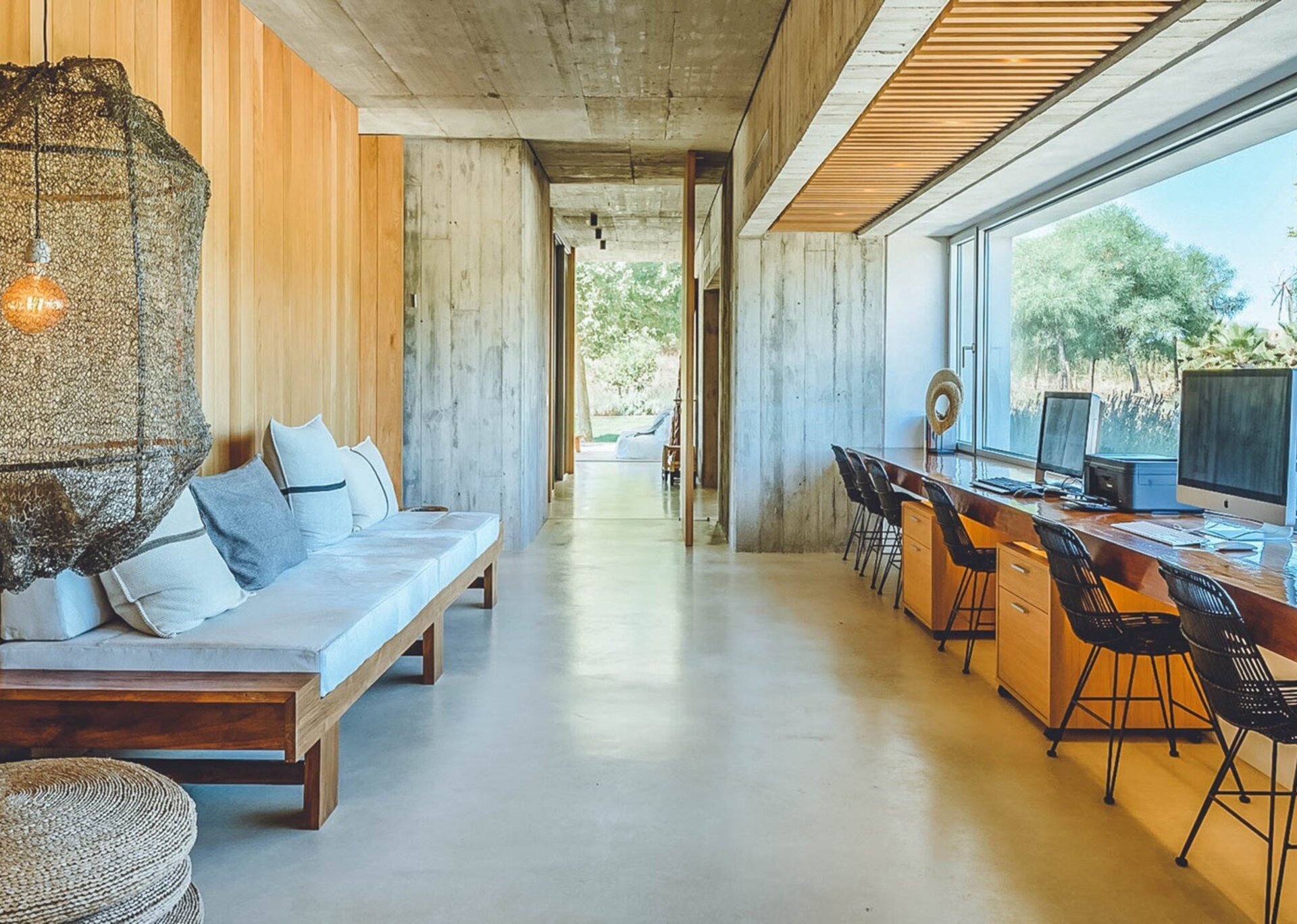 The heart of the villa lies in the expansive open-plan living room, kitchen, and dining area. Bathed in natural light thanks to the floor-to-ceiling glass windows, the room exudes an airy and inviting ambiance. The black columns add an edgy industrial touch, while the creamy beige concrete floor and ceiling soften the overall aesthetic. You'll find comfort in the abundance of sumptuous seating options, and the large reclaimed wooden dining table, paired with modern black wicker chairs, sets the stage for unforgettable gatherings.