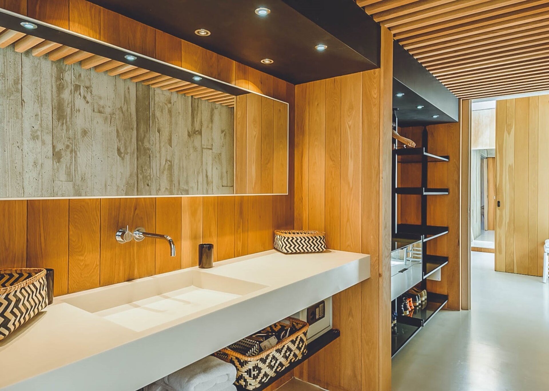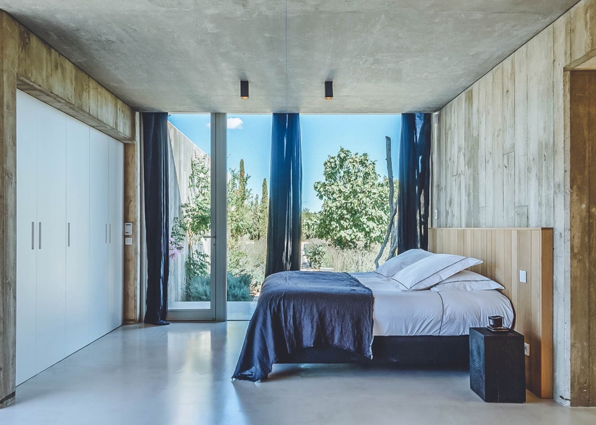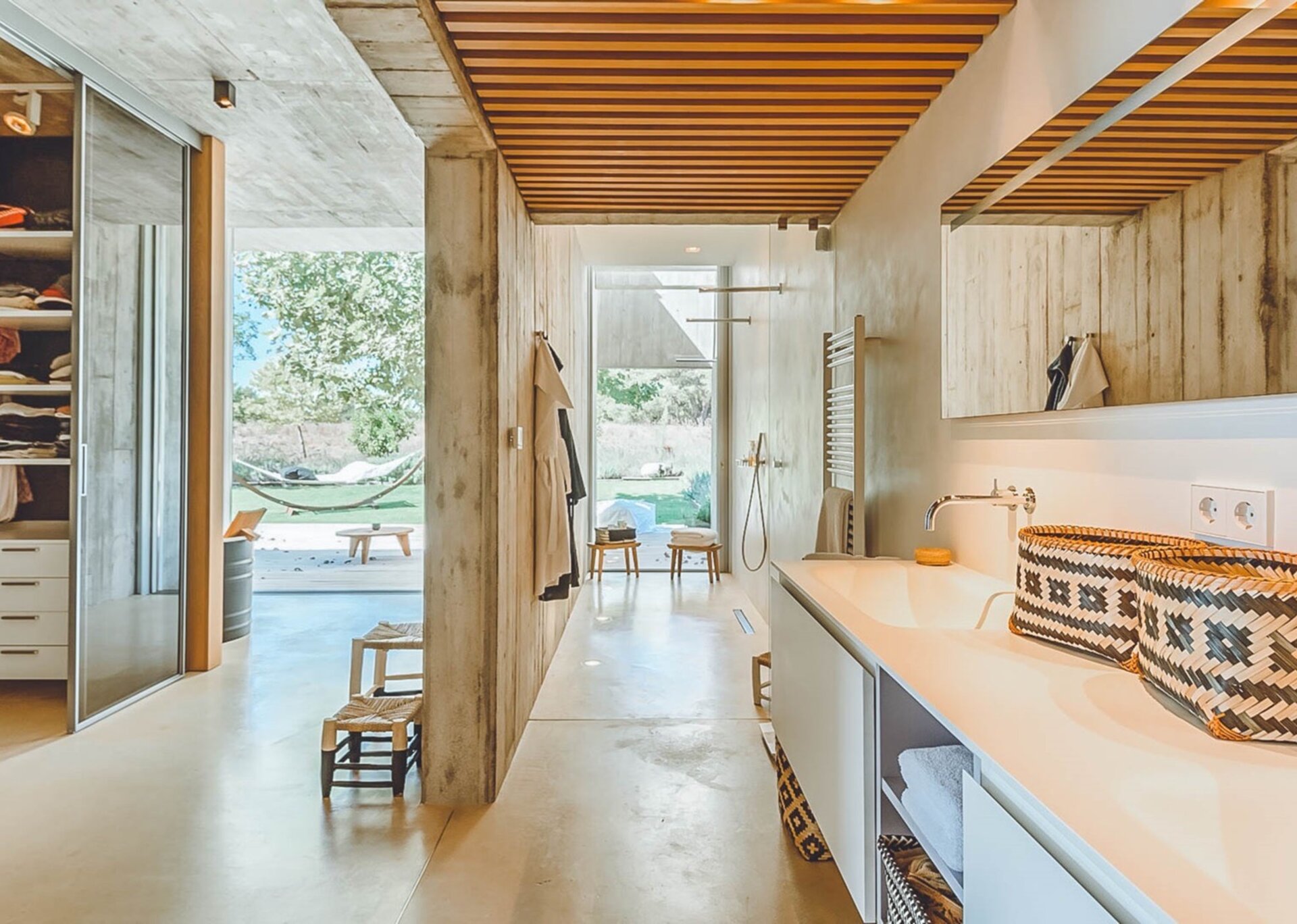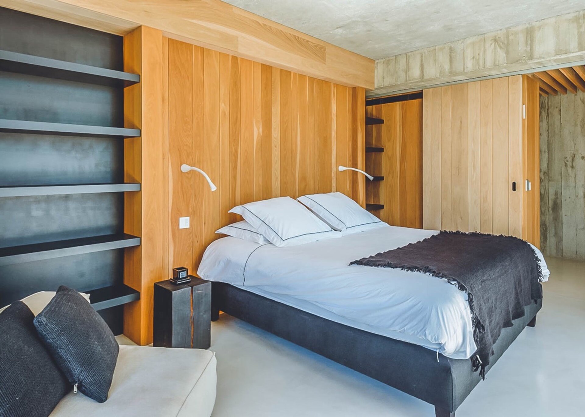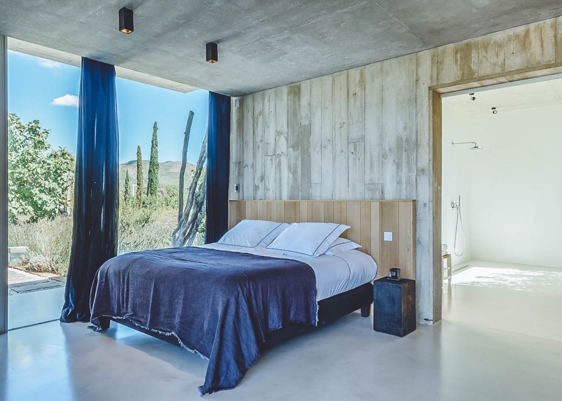 The heart of the villa lies in the expansive open-plan living room, kitchen, and dining area. Bathed in natural light thanks to the floor-to-ceiling glass windows, the room exudes an airy and inviting ambiance. The black columns add an edgy industrial touch, while the creamy beige concrete floor and ceiling soften the overall aesthetic. You'll find comfort in the abundance of sumptuous seating options, and the large reclaimed wooden dining table, paired with modern black wicker chairs, sets the stage for unforgettable gatherings.