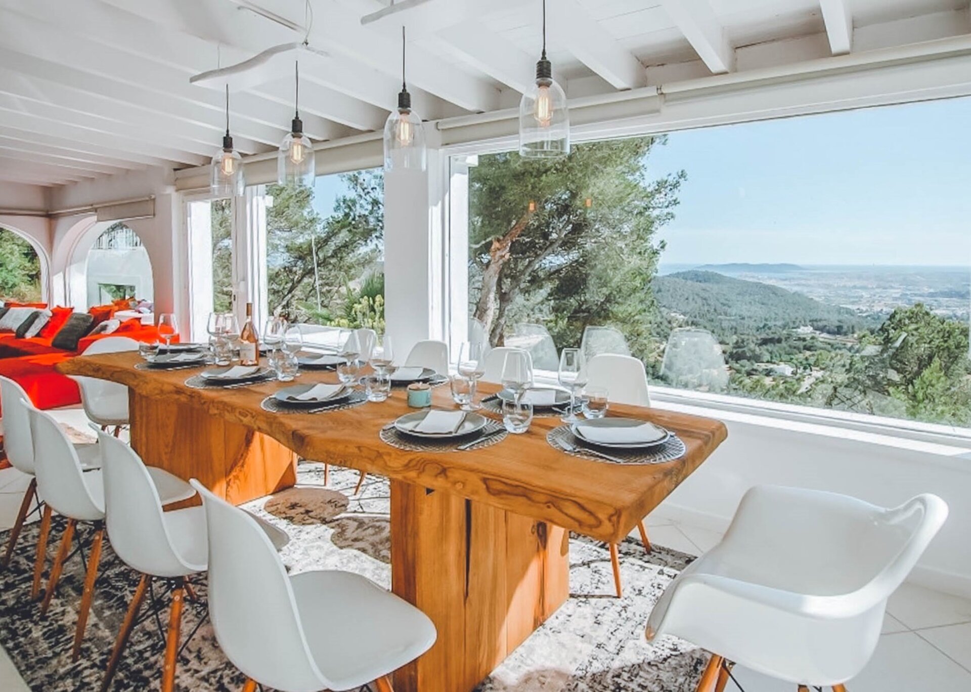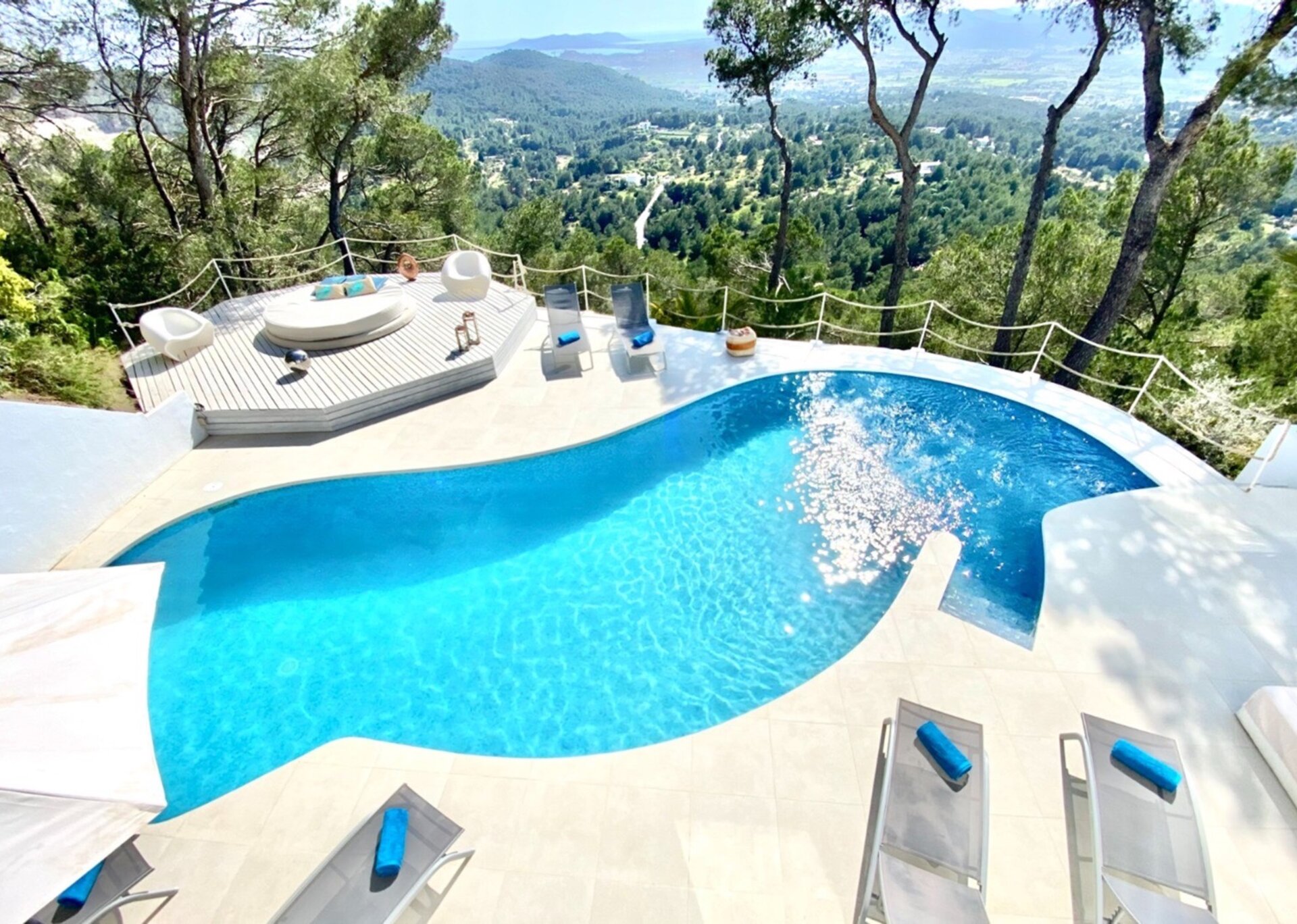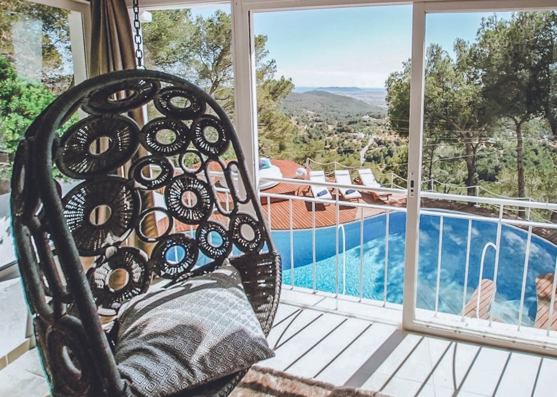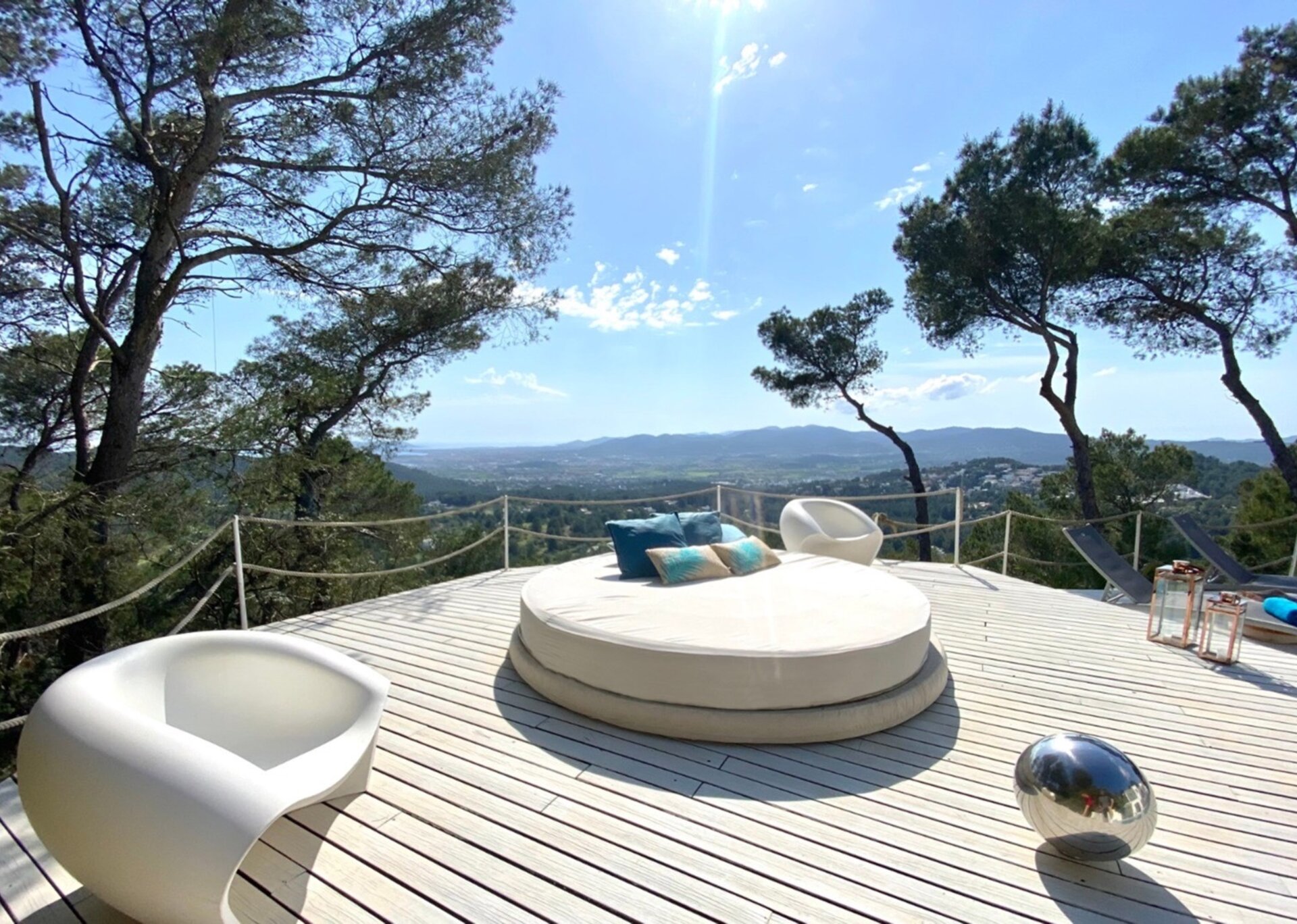 Nled atop one of the highest hills in Ibiza, Villa Rosa is a breathtaking 5-bedroom estate that offers majestic views. Surrounded by a serene pine tree forest, this hidden gem is conveniently located near the desirable Can Furnet Area. The charming village of Jesus and the bustling capital of Ibiza Town, renowned for its vibrant nightlife and delectable dining options, are easily accessible.