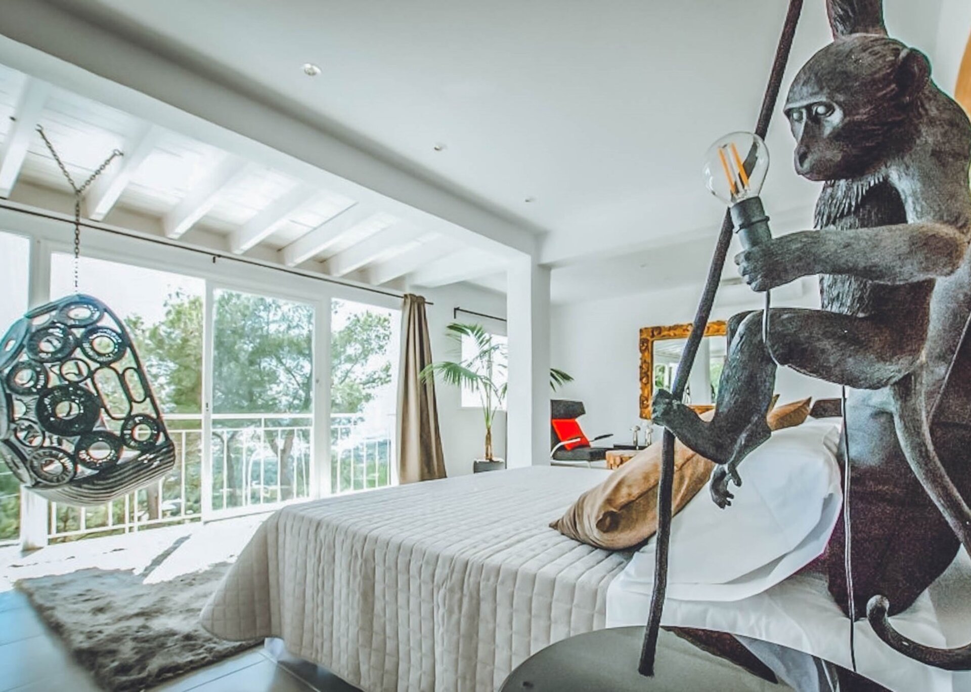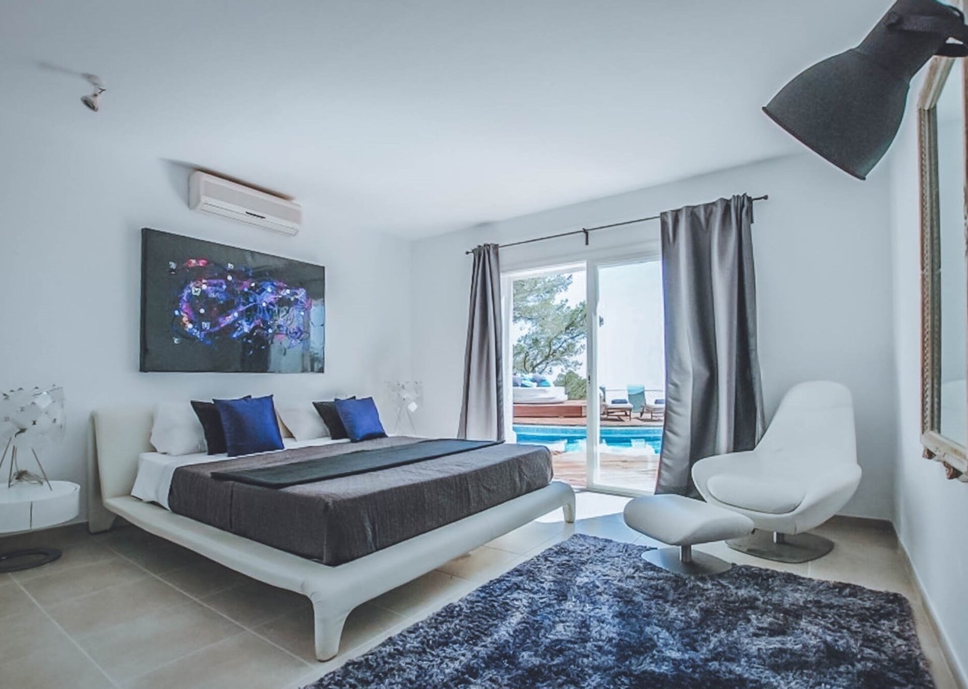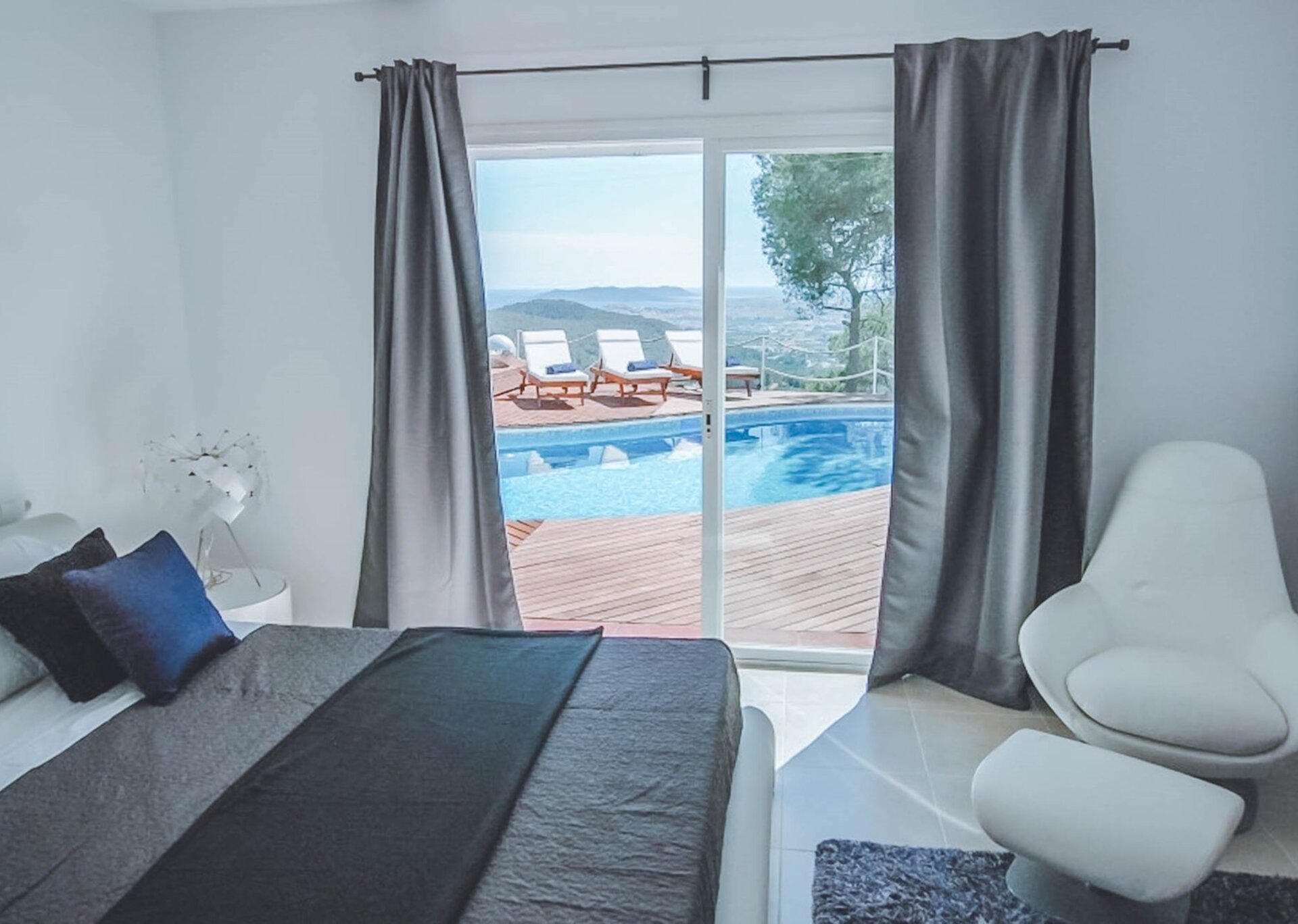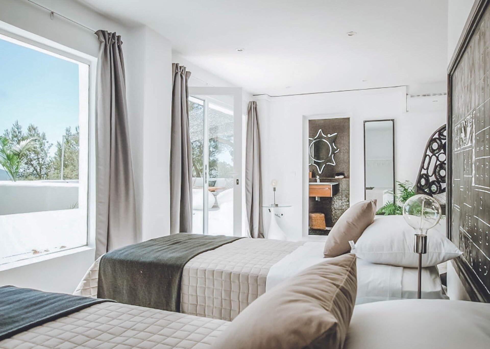 The upper level features a lavish master bedroom with an en-suite bathroom, a private living area, and sweeping windows that offer one of the most stunning views in Ibiza. The remaining four bedrooms are situated on the middle and lower levels, two of which have en-suite bathrooms, while the other two share a bathroom. One of the rooms also offers the flexibility of a double twin bed that can be joined if needed.