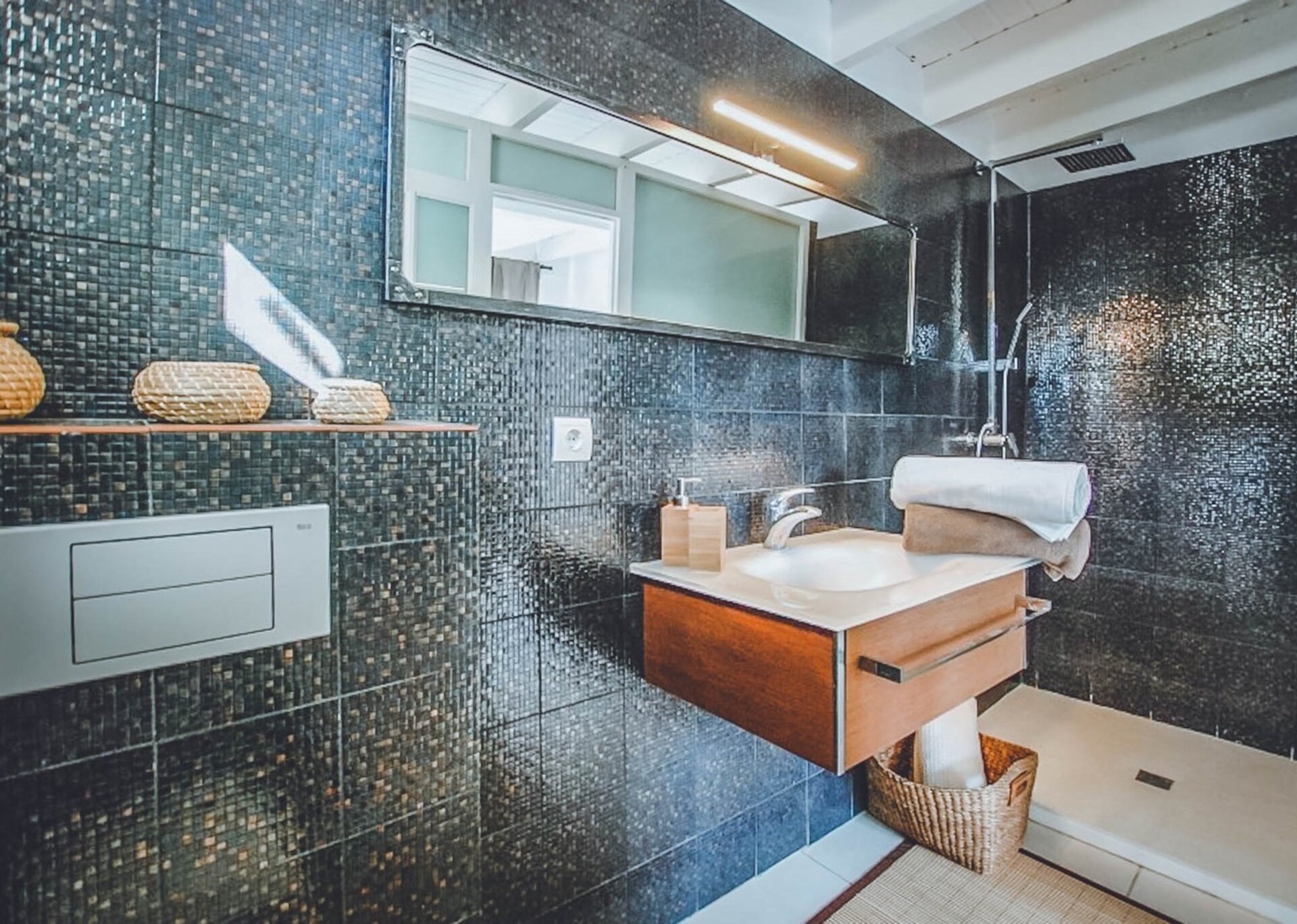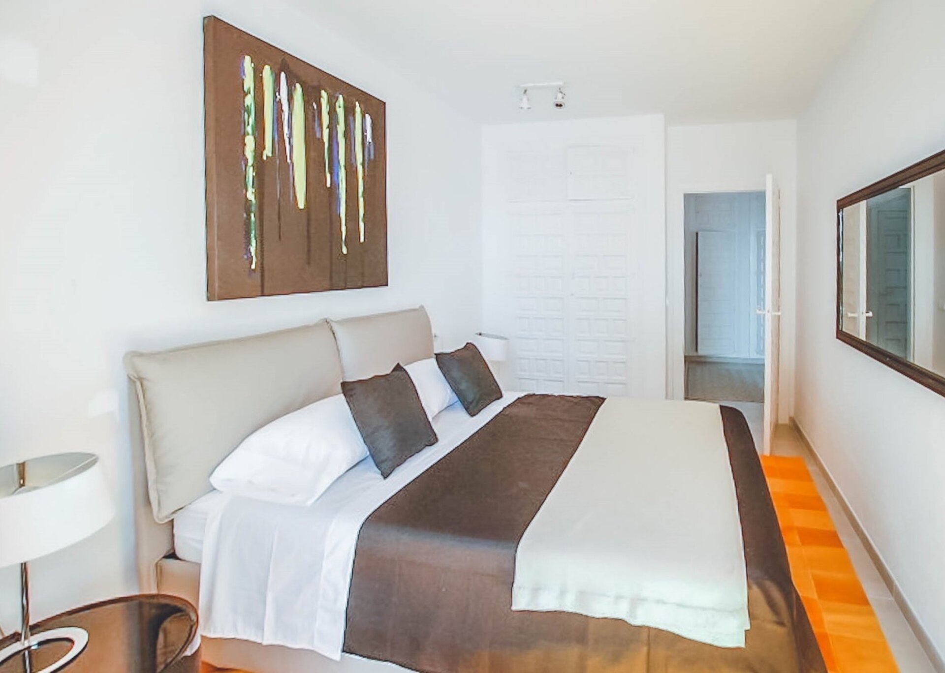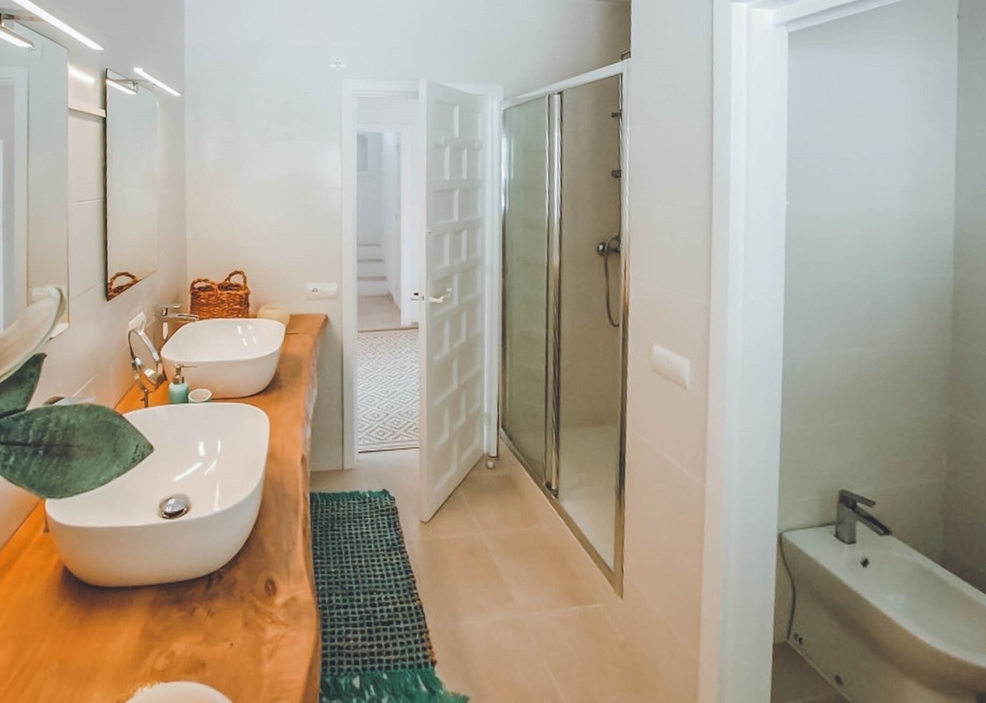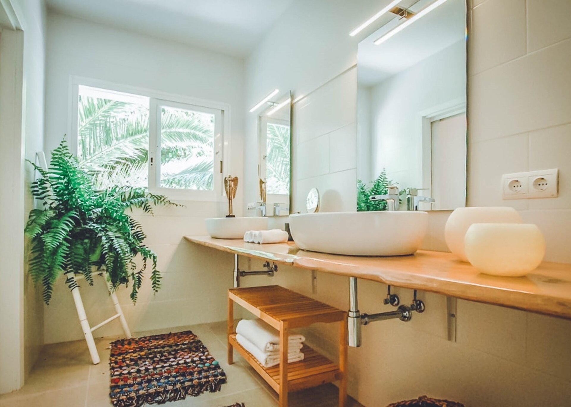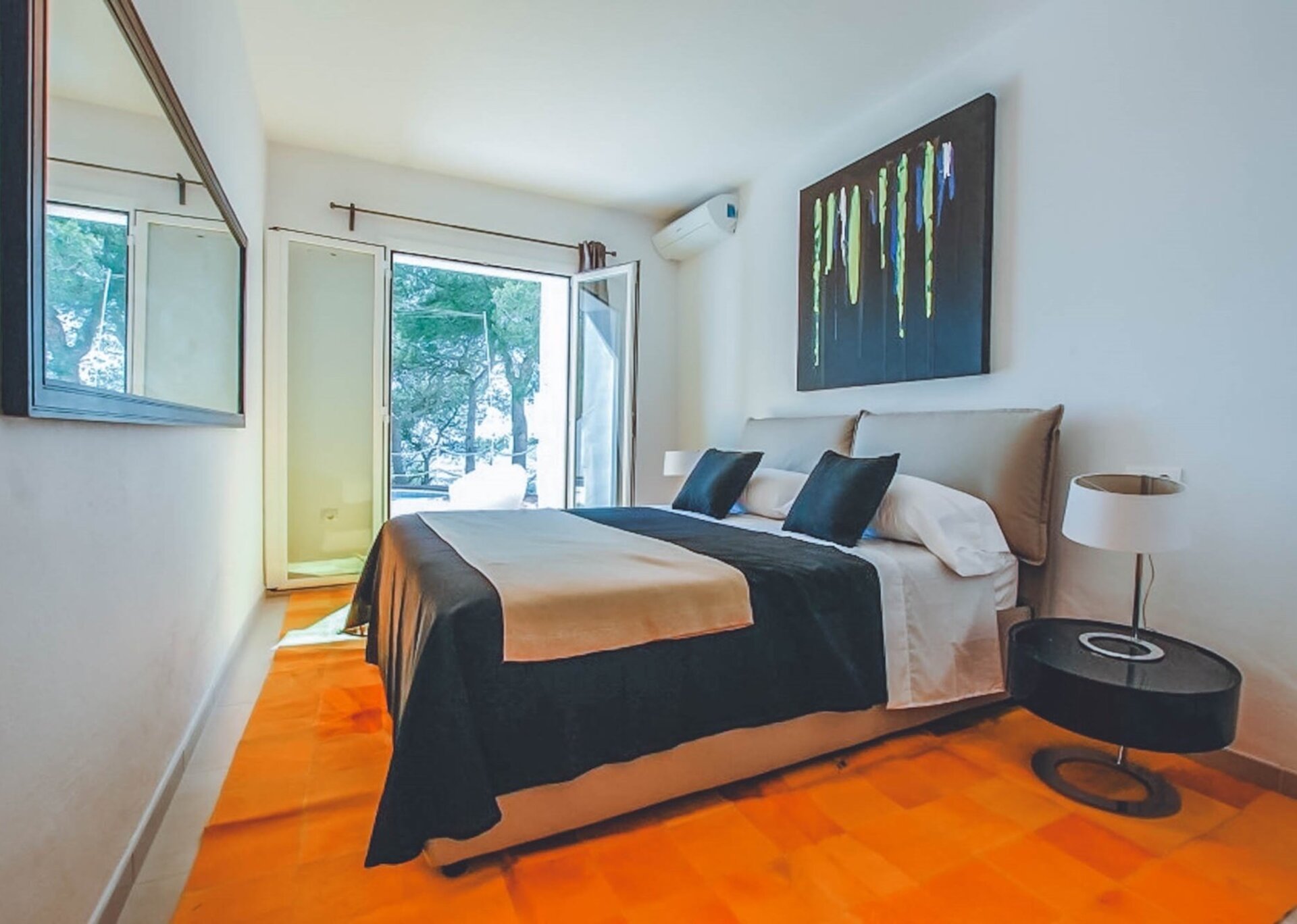 The upper level features a lavish master bedroom with an en-suite bathroom, a private living area, and sweeping windows that offer one of the most stunning views in Ibiza. The remaining four bedrooms are situated on the middle and lower levels, two of which have en-suite bathrooms, while the other two share a bathroom. One of the rooms also offers the flexibility of a double twin bed that can be joined if needed.