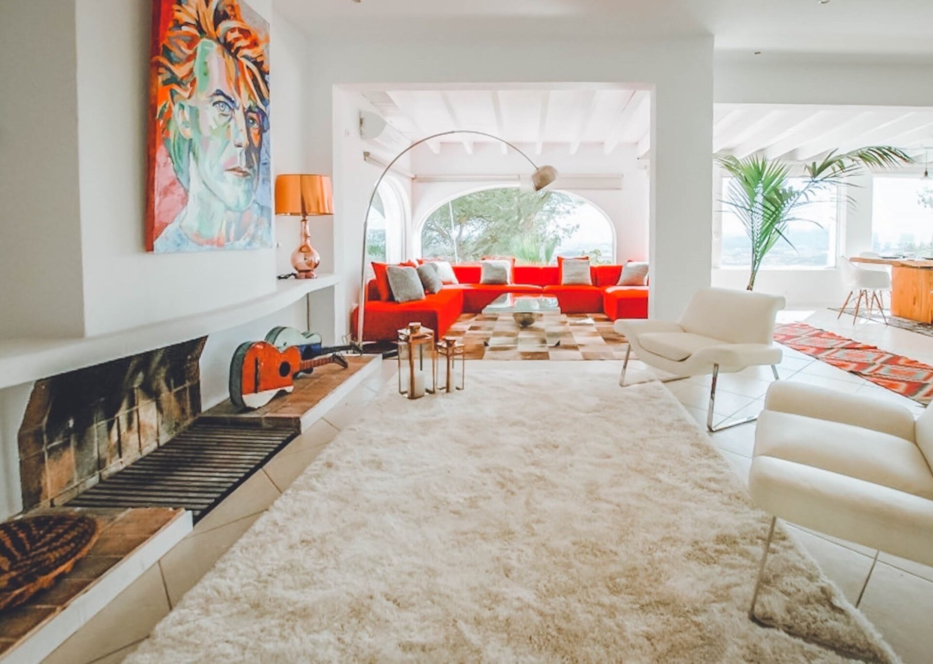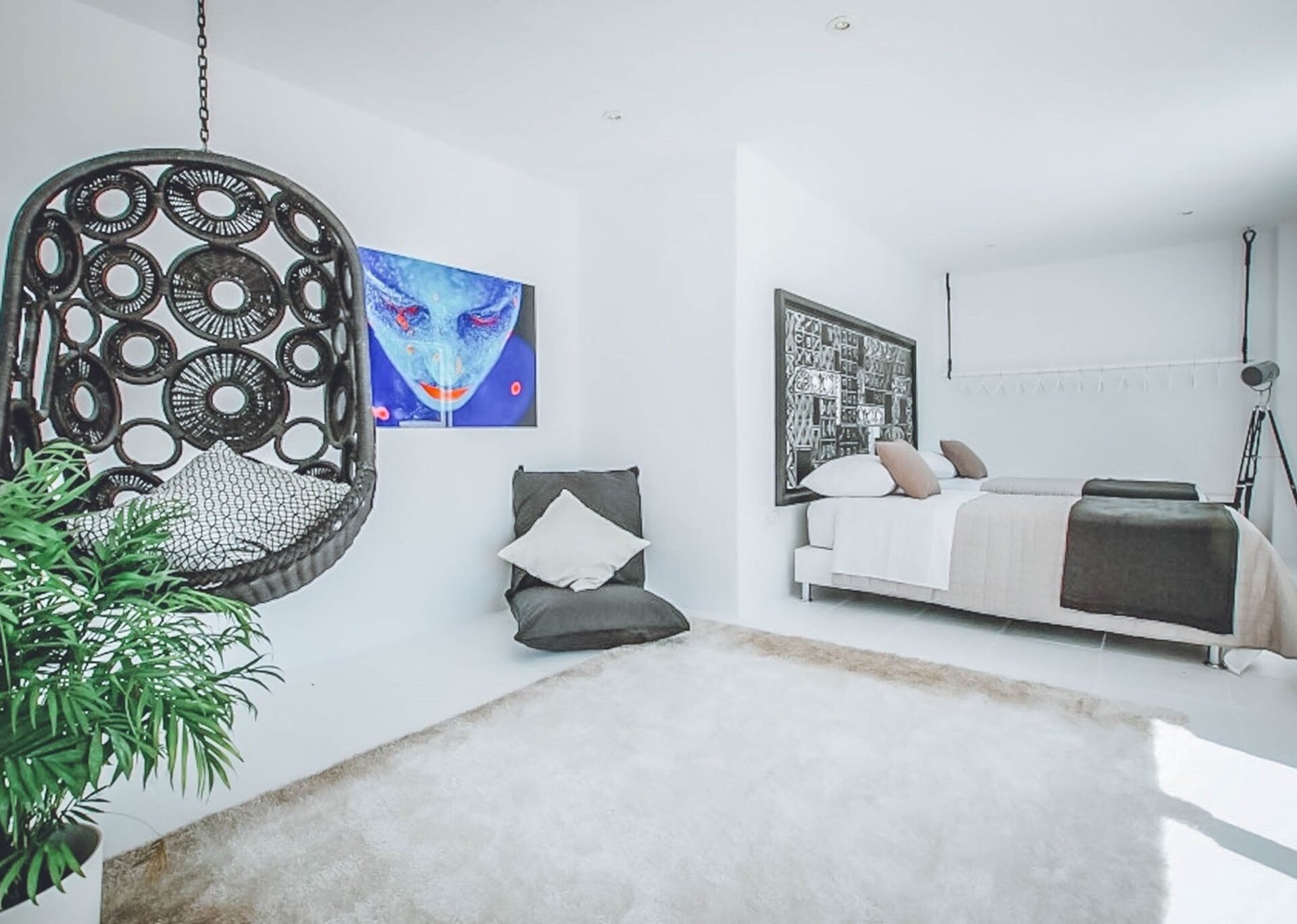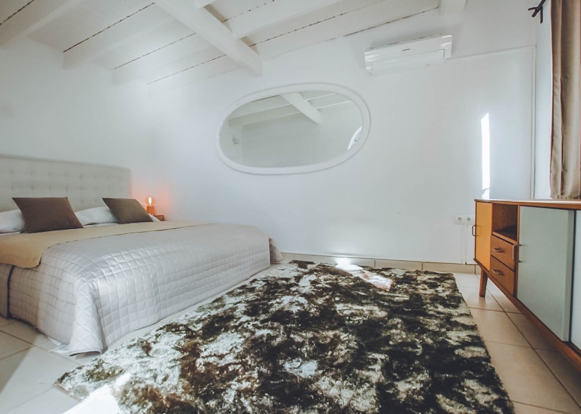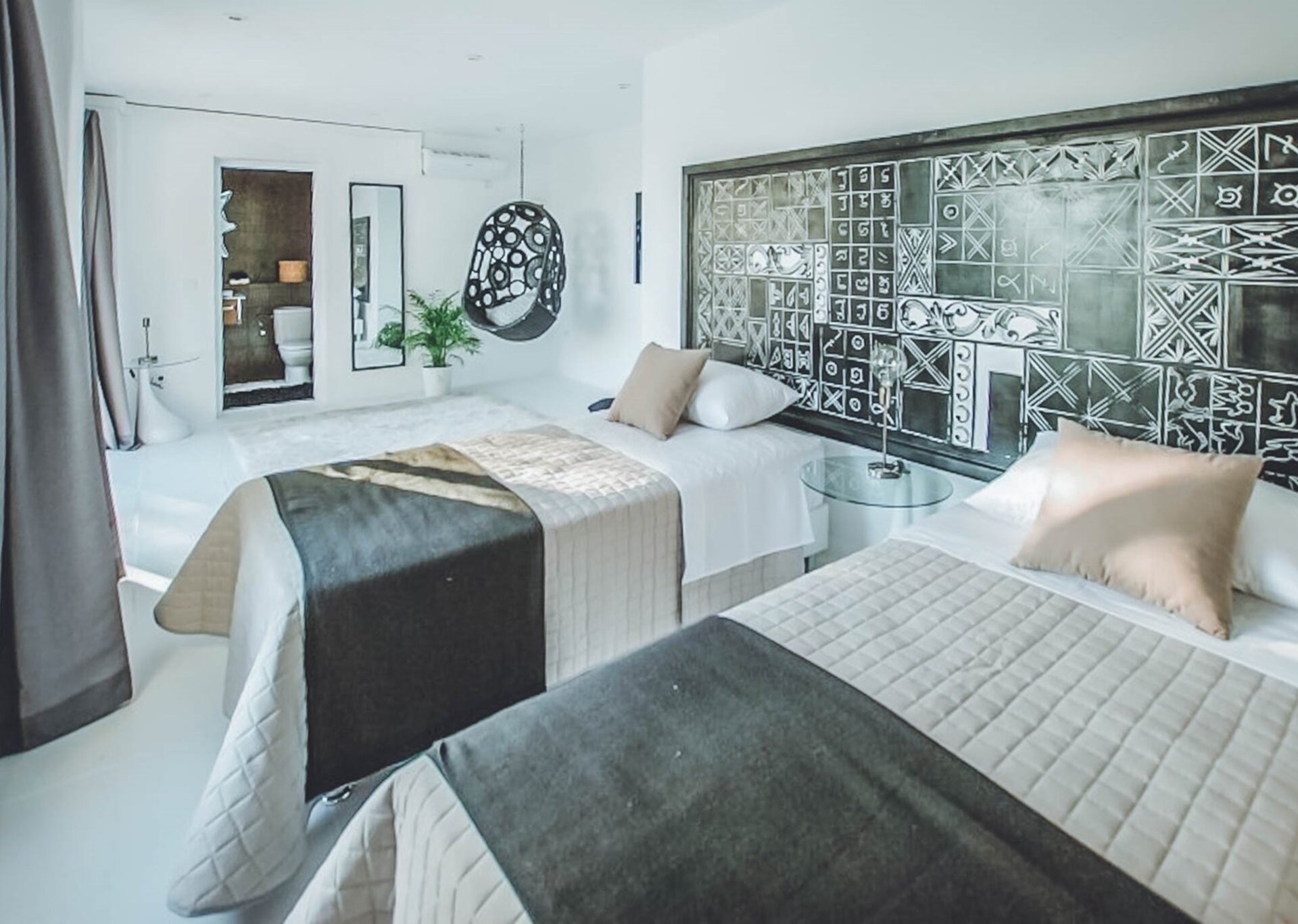 The upper level features a lavish master bedroom with an en-suite bathroom, a private living area, and sweeping windows that offer one of the most stunning views in Ibiza. The remaining four bedrooms are situated on the middle and lower levels, two of which have en-suite bathrooms, while the other two share a bathroom. One of the rooms also offers the flexibility of a double twin bed that can be joined if needed.