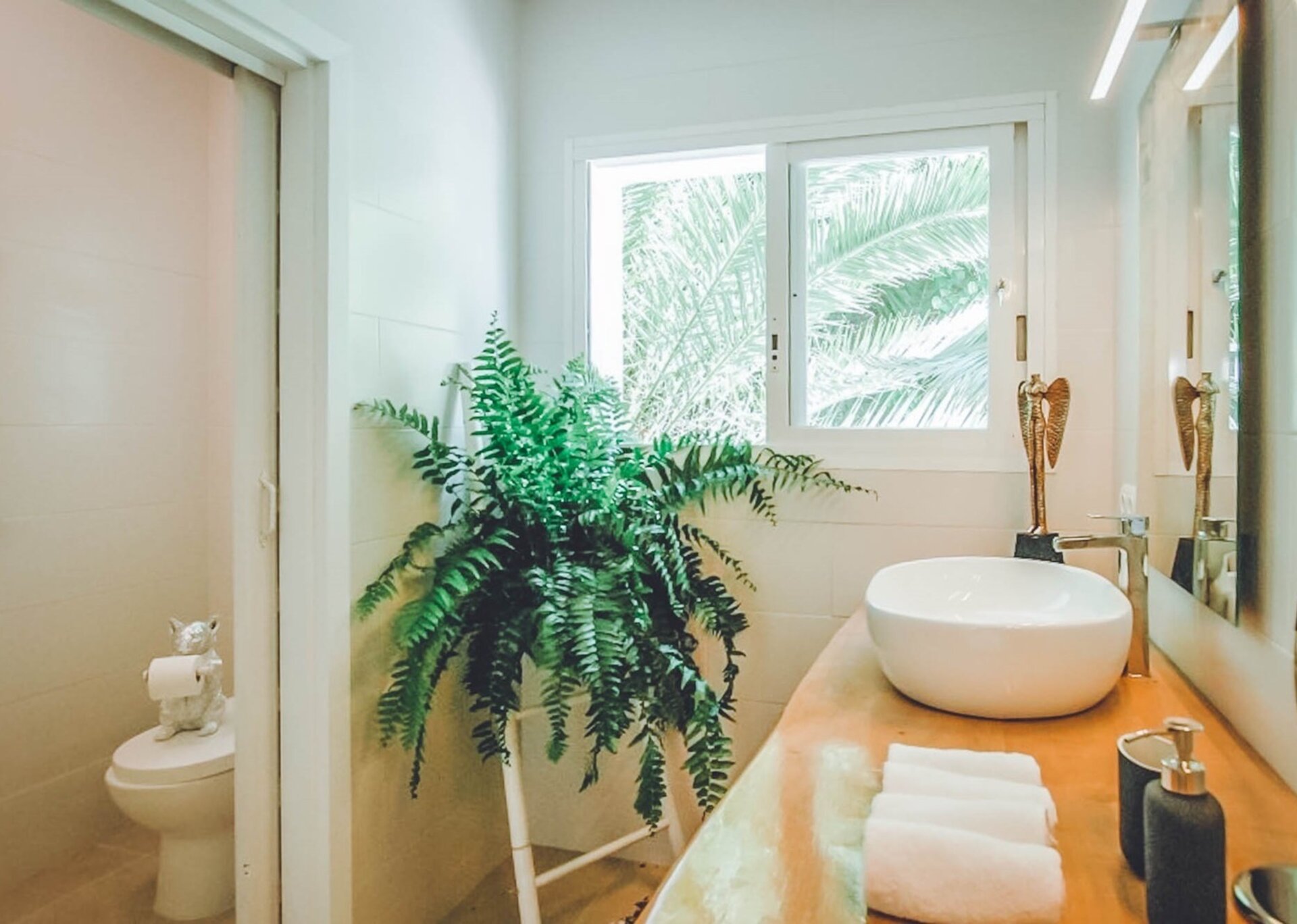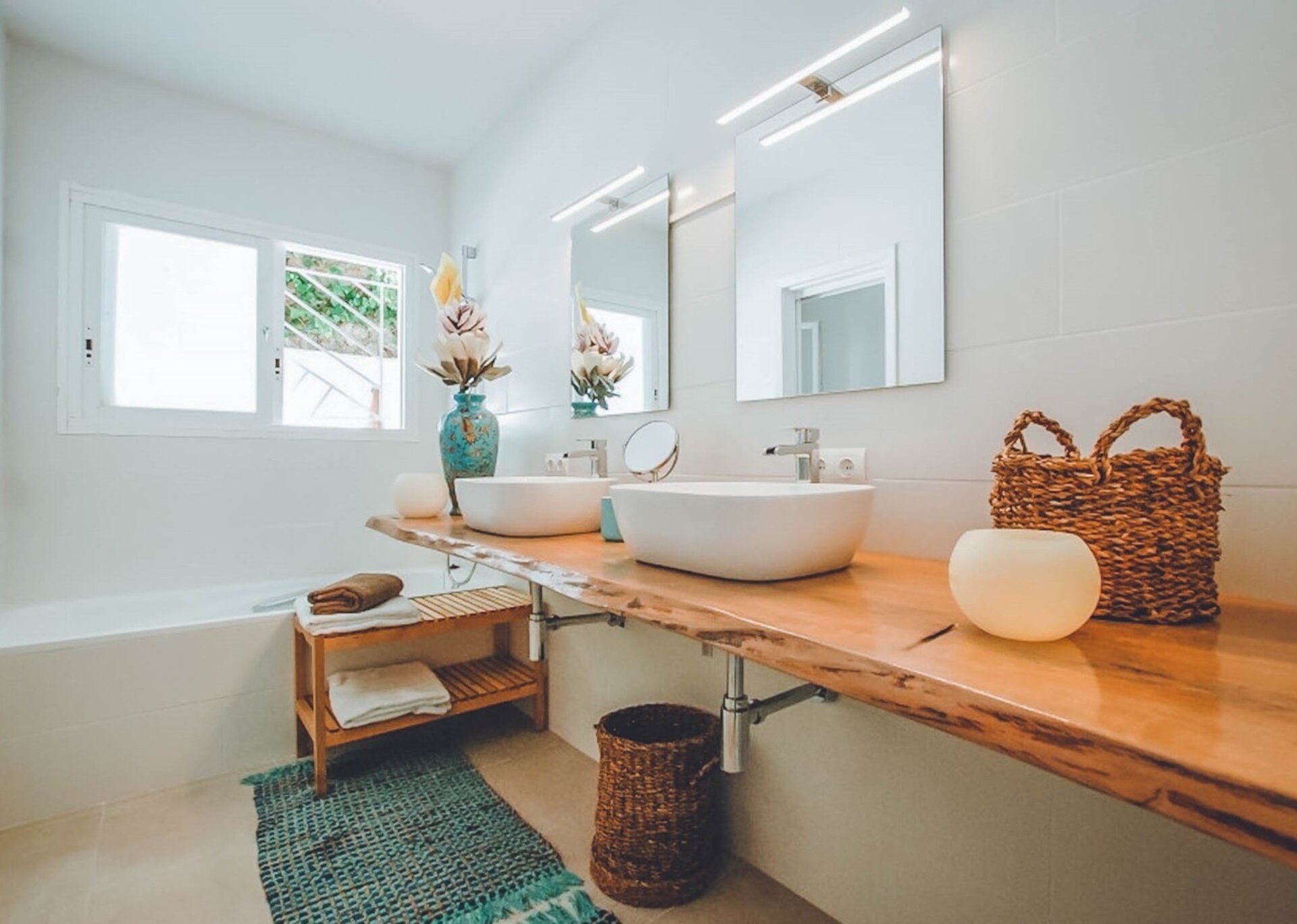Spanning three levels, Villa Rosa provides a luxurious living experience. The main level boasts a spacious open-plan living and dining area with large windows that showcase the mesmerizing vistas of Ibiza City and the coastline stretching from Talamanca Beach to Salinas. A fully equipped kitchen is available for guests, complete with all the necessary appliances and provisions to entertain friends and family.