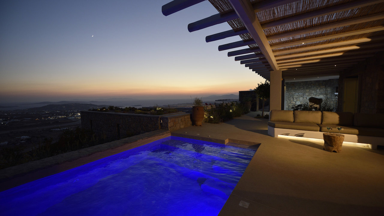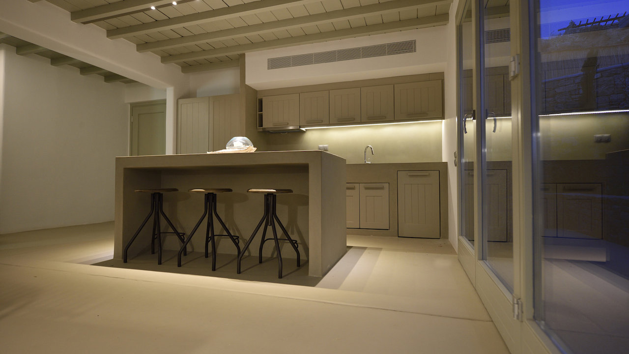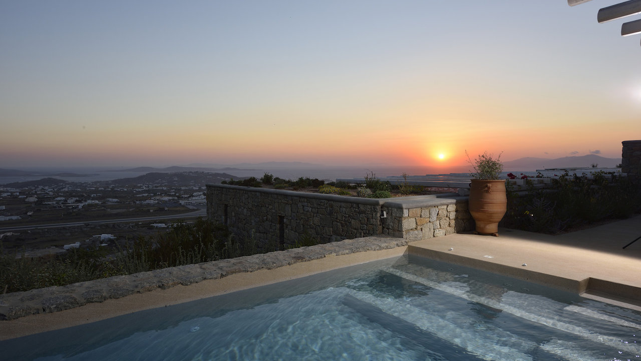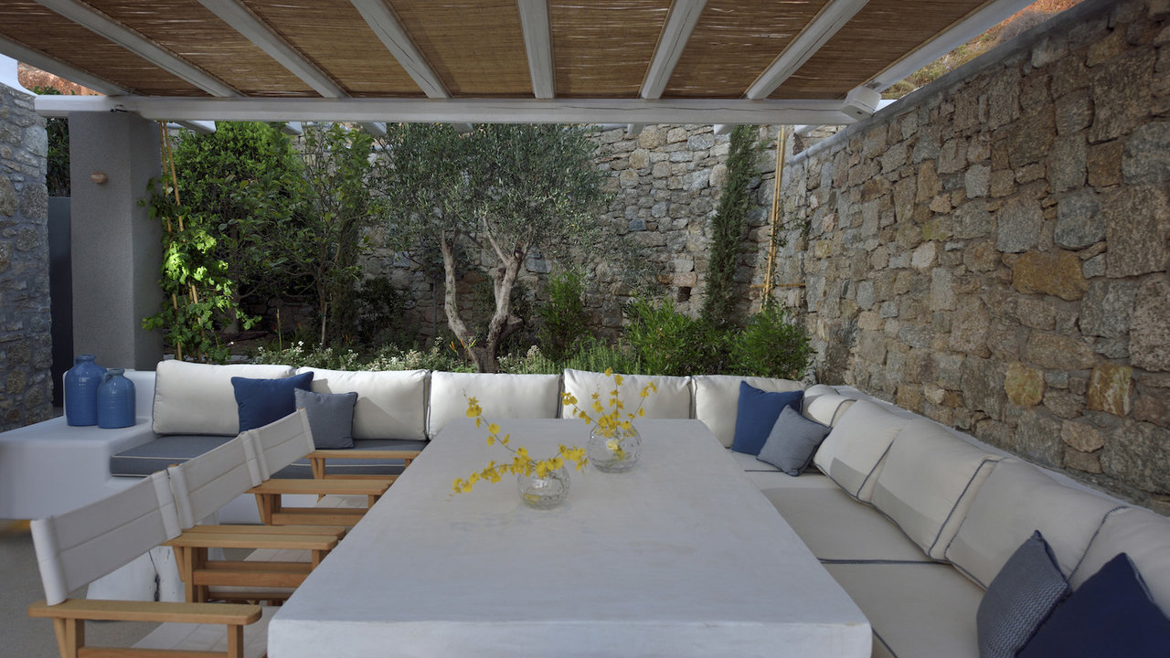 The villa has its own private pool with Jacuzzi (30sqm), magnificent outdoor dining and sitting areas that spread over the 220sqm. The marvelous plantations match perfectly the scenery of Kounoupas hill and provide the isolation needed from other guests in the complex.