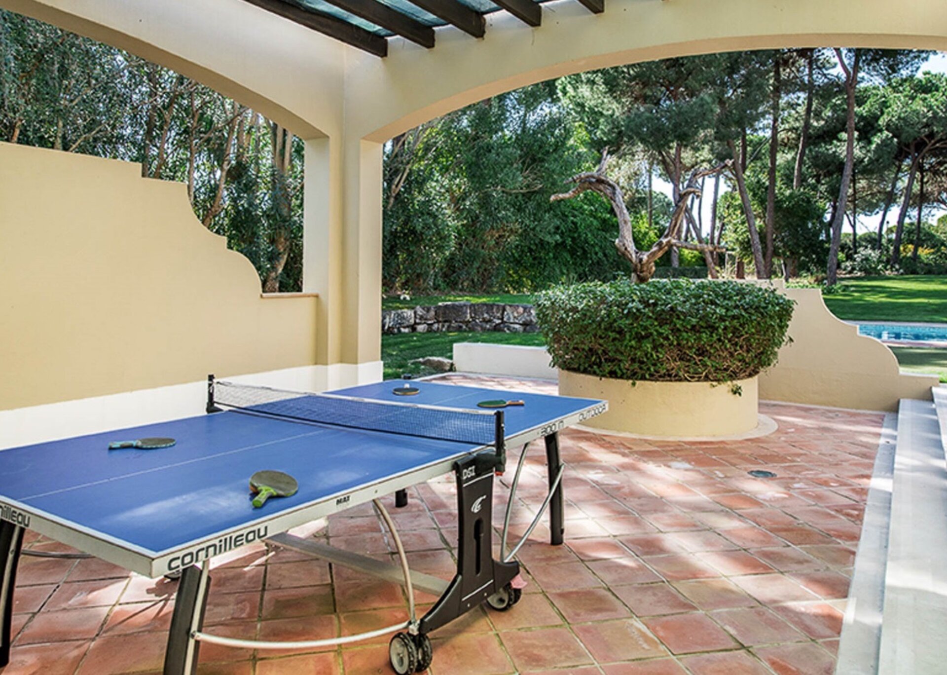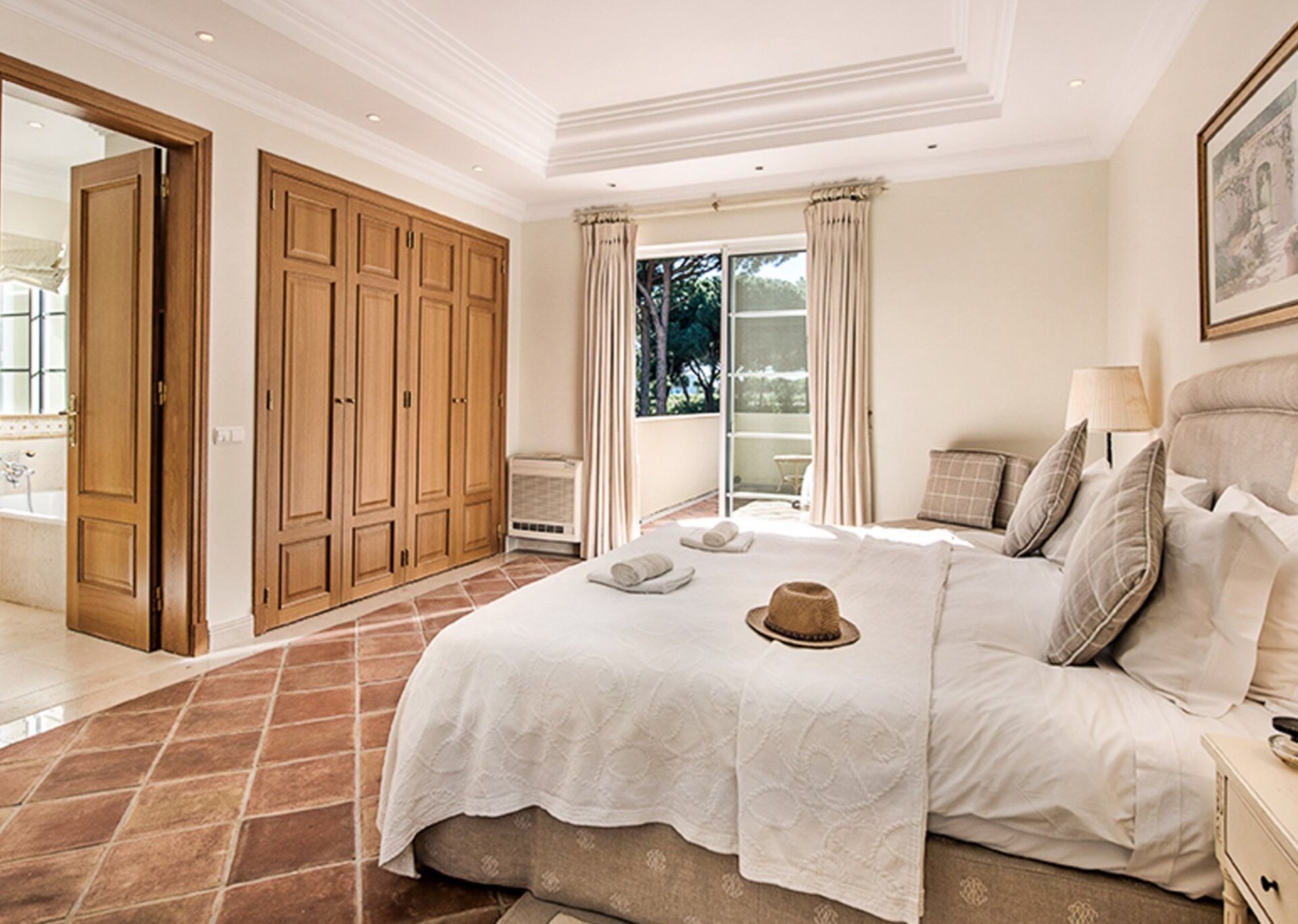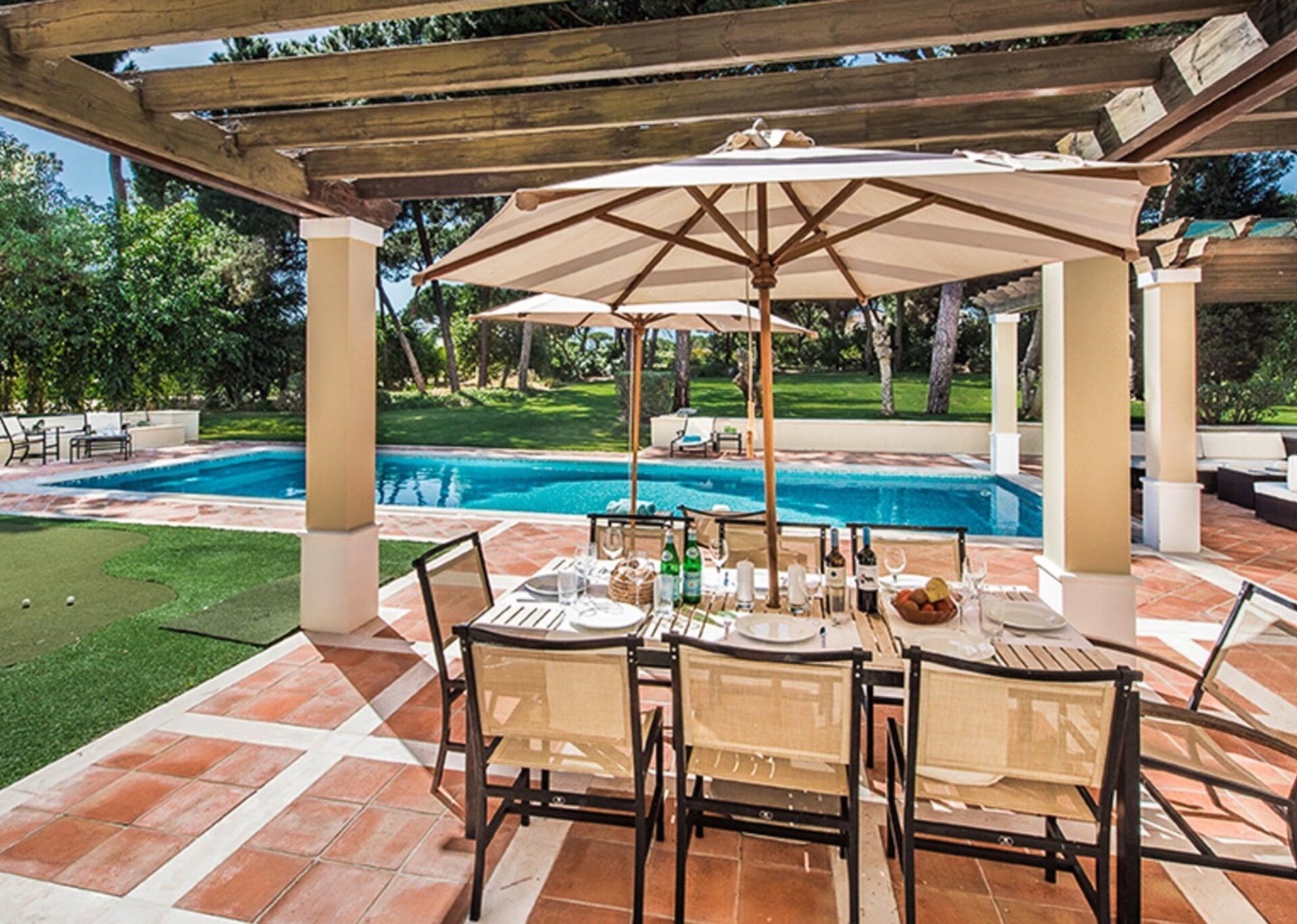 Upon entry, the reception hall gives you an idea of things to come with its double-height celling and imposing staircase. Meanwhile, the living areas all focus upon the pool terrace which you can access through the large slide doors or leave them open to enjoy the warm Algarve temperatures. Outside on the pool terrace, is a lovely al fresco dining area with a wooden pergola roof and gas BBQ. Here is a good place for spectators as golf lovers practice putting on the customized green.