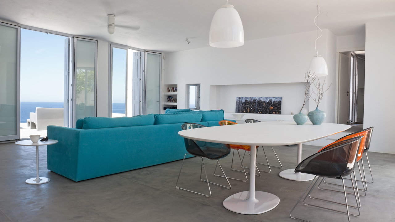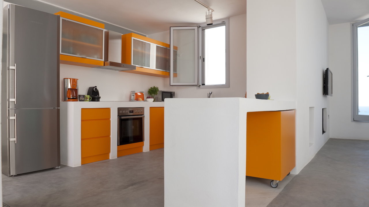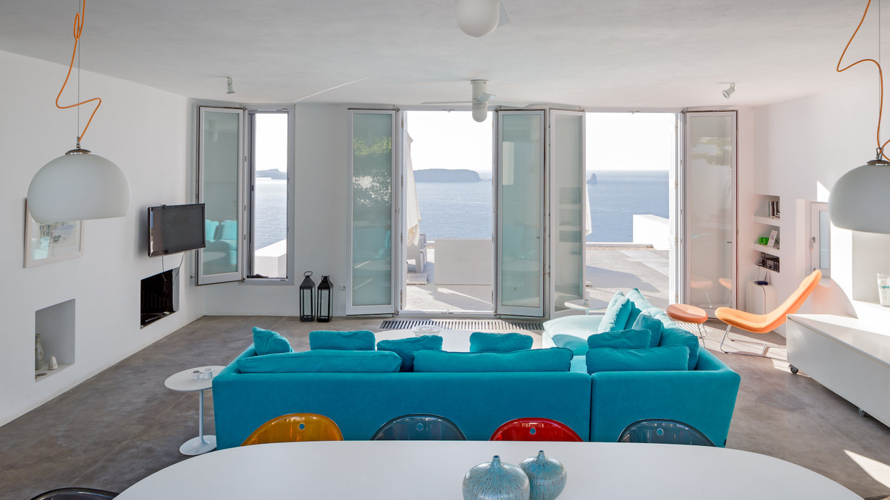 The property is made up of two houses and two studios, designed with the guest's ultimate comfort in mind. Stepping into Villa Solange, you'll feel immediately transported to a serene and luxurious getaway. The interiors are designed with a unique style, effectively fusing modernity and effortless elegance. The living room features a towering glass wall which frames the blue waters of the sea and the endless sky. The villa's modern and spacious kitchen comes fully equipped, giving you the freedom to whip up your favourite local delicacies.