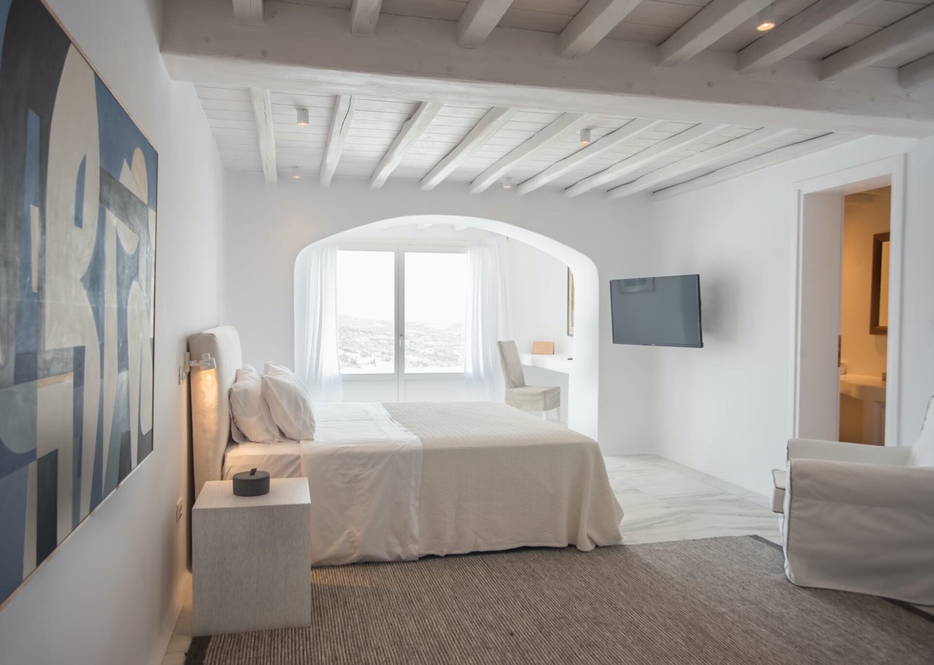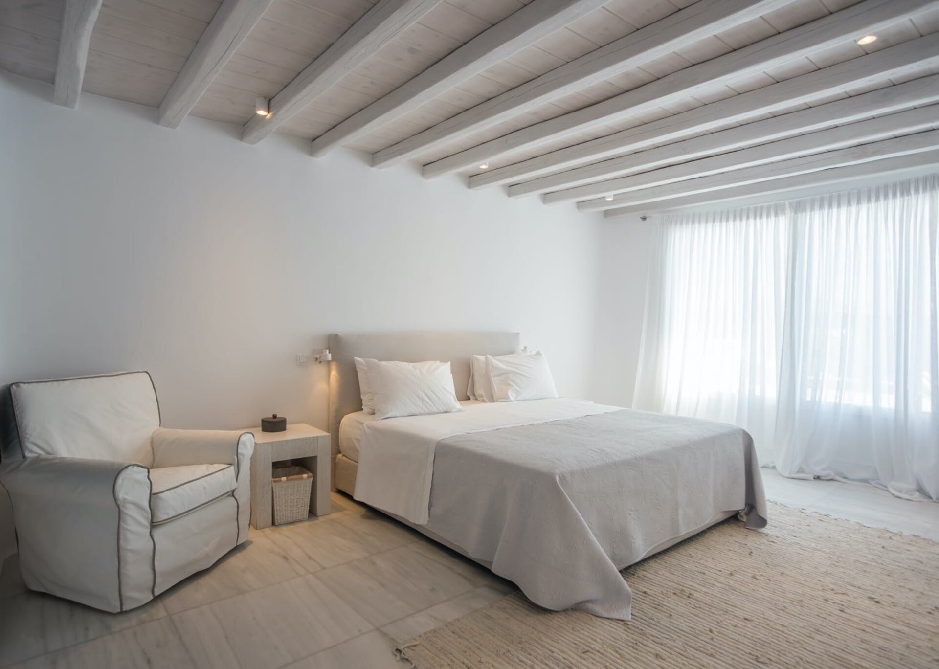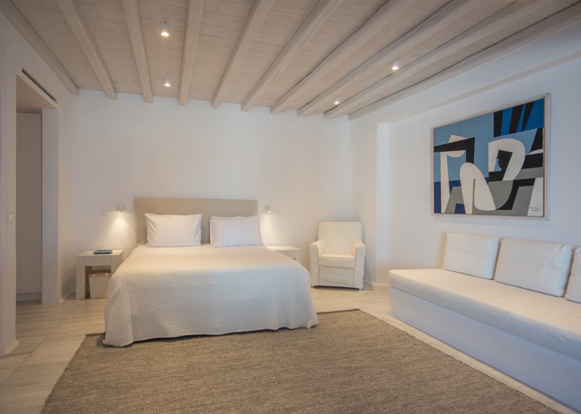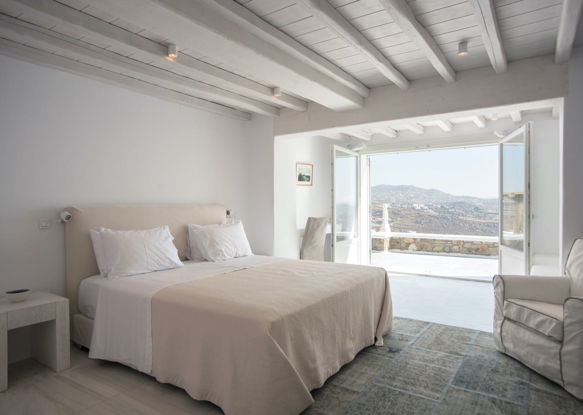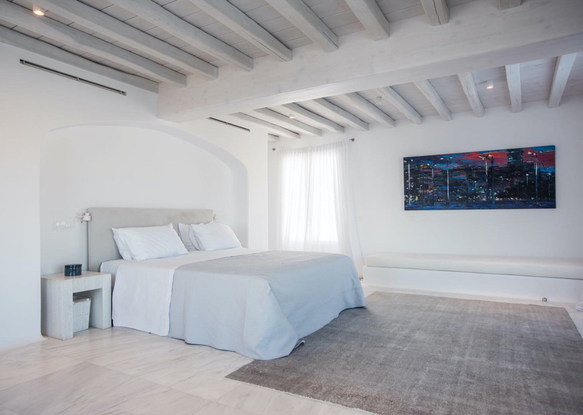 A typical Cycladic sculpted staircase leads to the three different levels, where ten spacious bedrooms offer first-class accommodation, featuring elegant décor, luxurious bedding, large flat-screen televisions, air conditioning, and spacious en-suite bathrooms. Nine of them are graced with breathtaking sea views, while the two master bedrooms on the upper level provide private rooftop balconies.