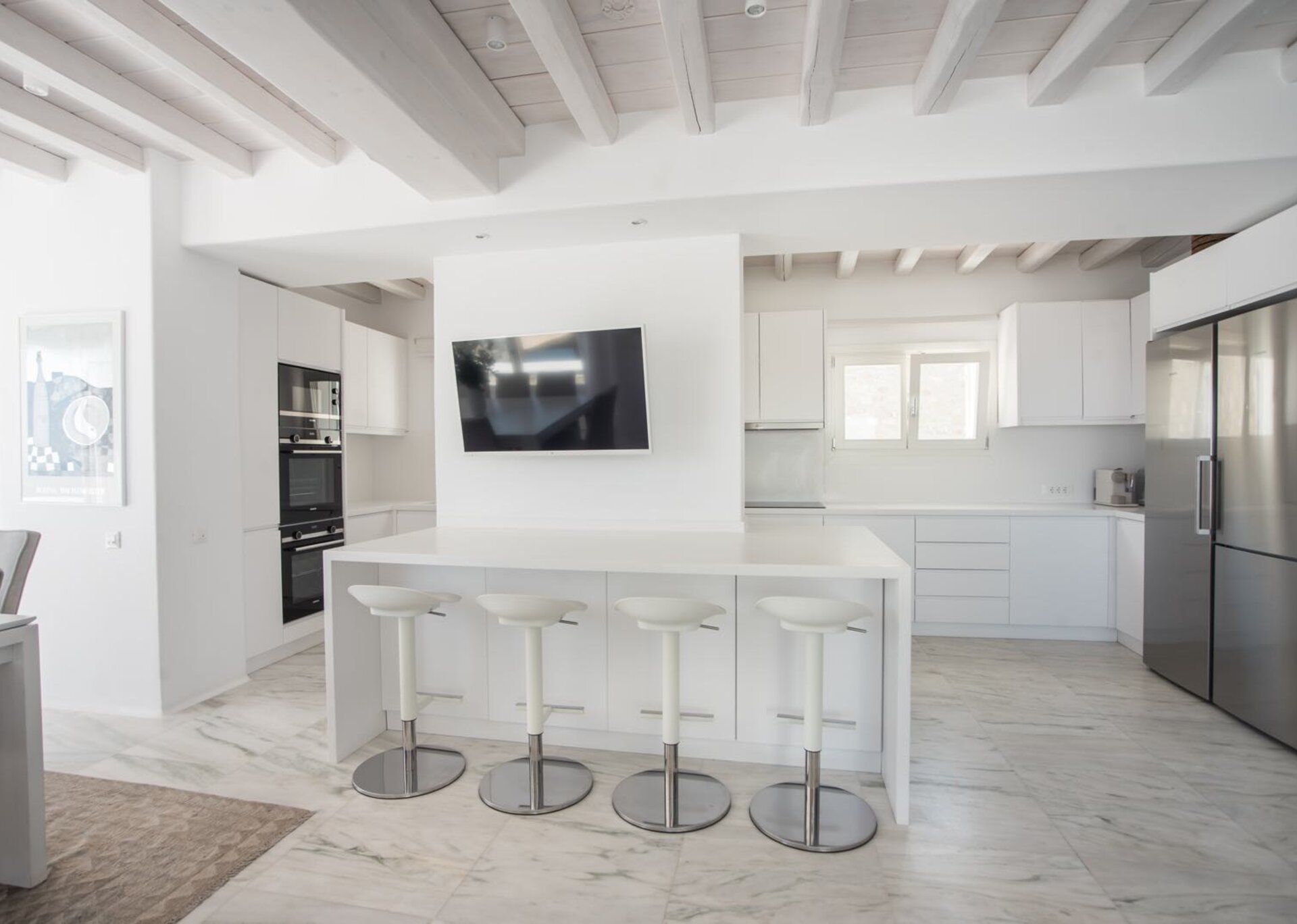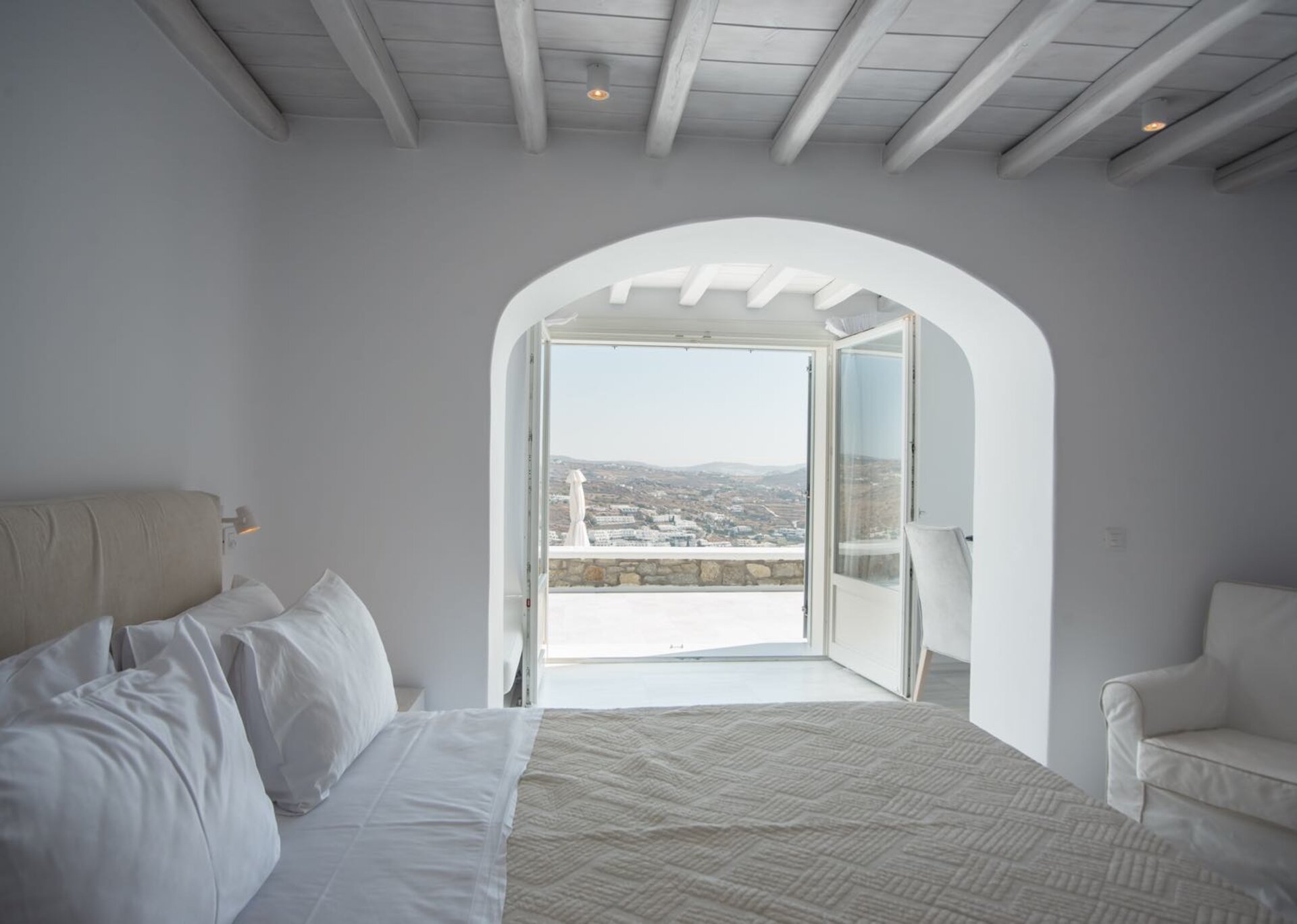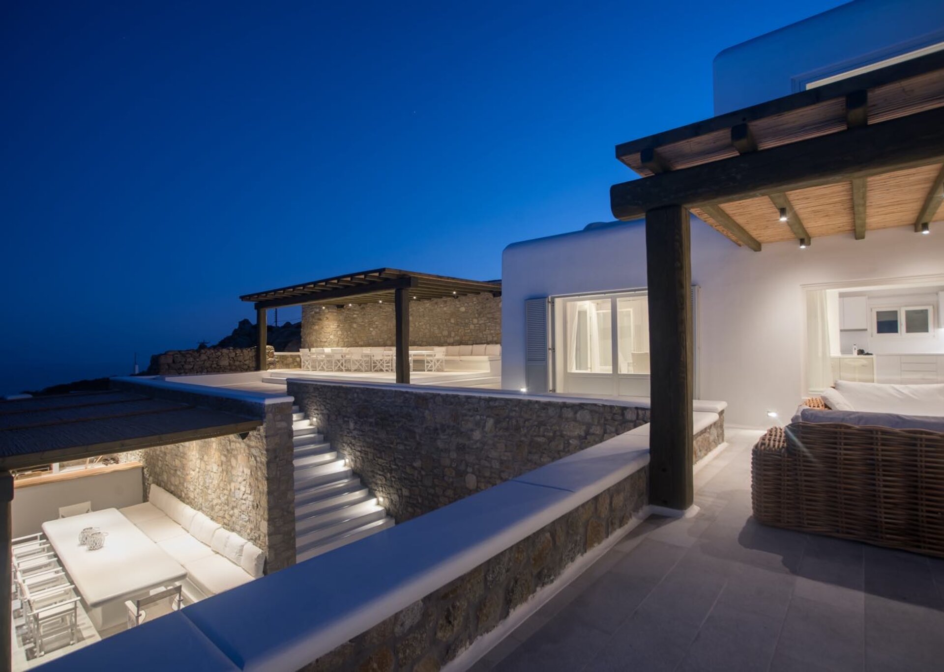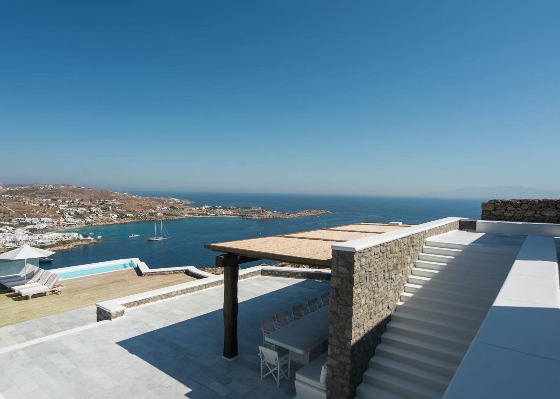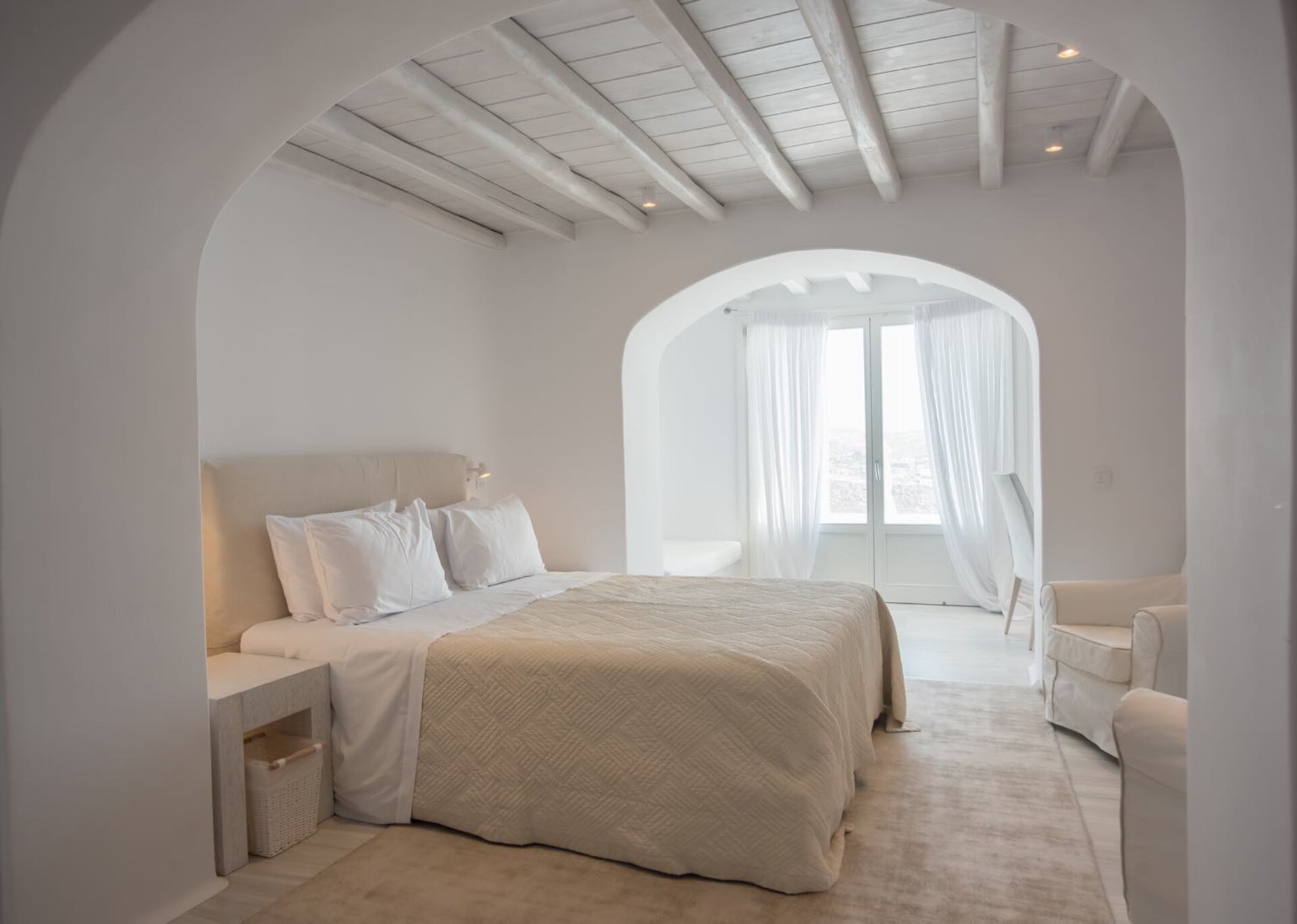 A typical Cycladic sculpted staircase leads to the three different levels, where ten spacious bedrooms offer first-class accommodation, featuring elegant décor, luxurious bedding, large flat-screen televisions, air conditioning, and spacious en-suite bathrooms. Nine of them are graced with breathtaking sea views, while the two master bedrooms on the upper level provide private rooftop balconies.