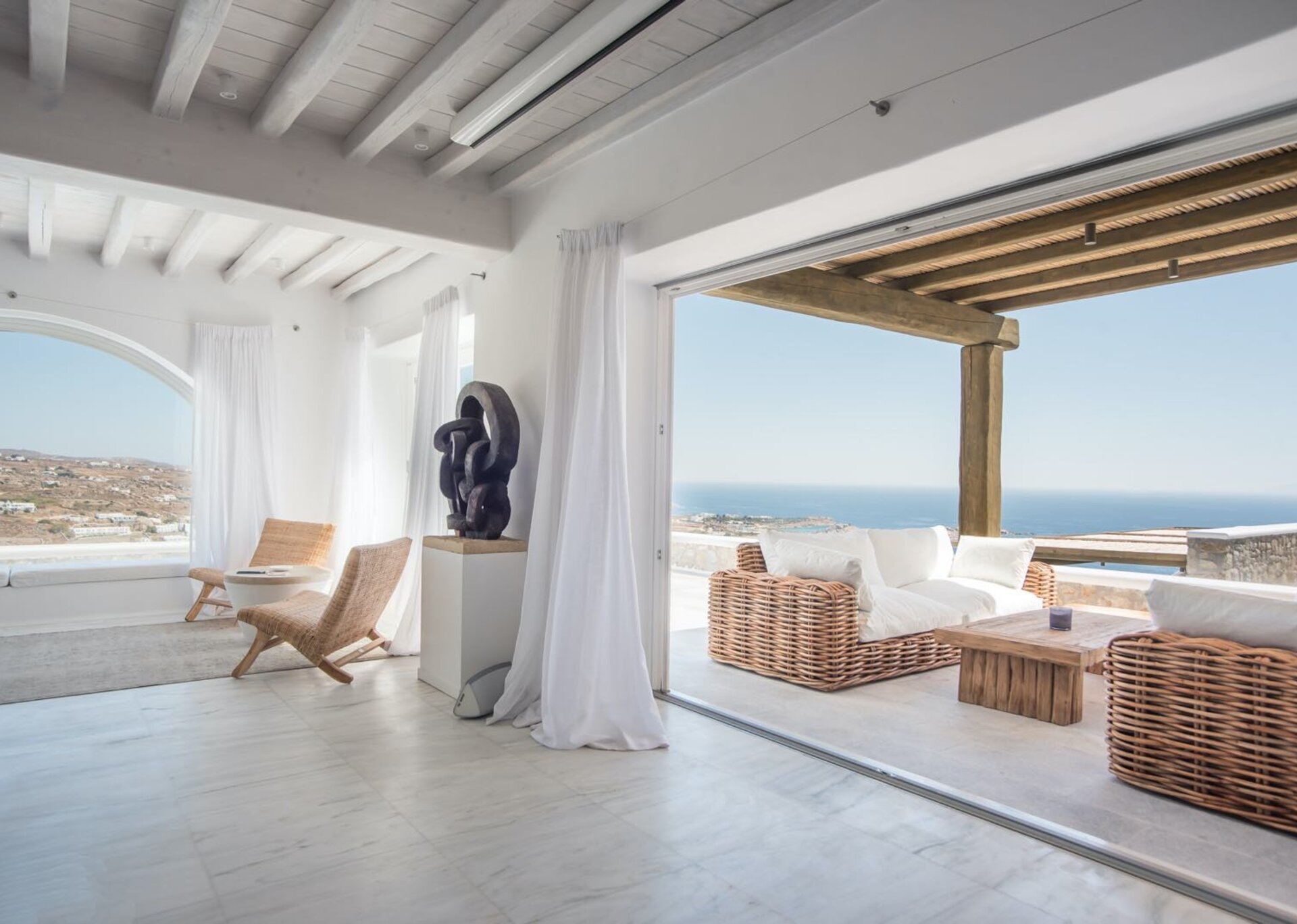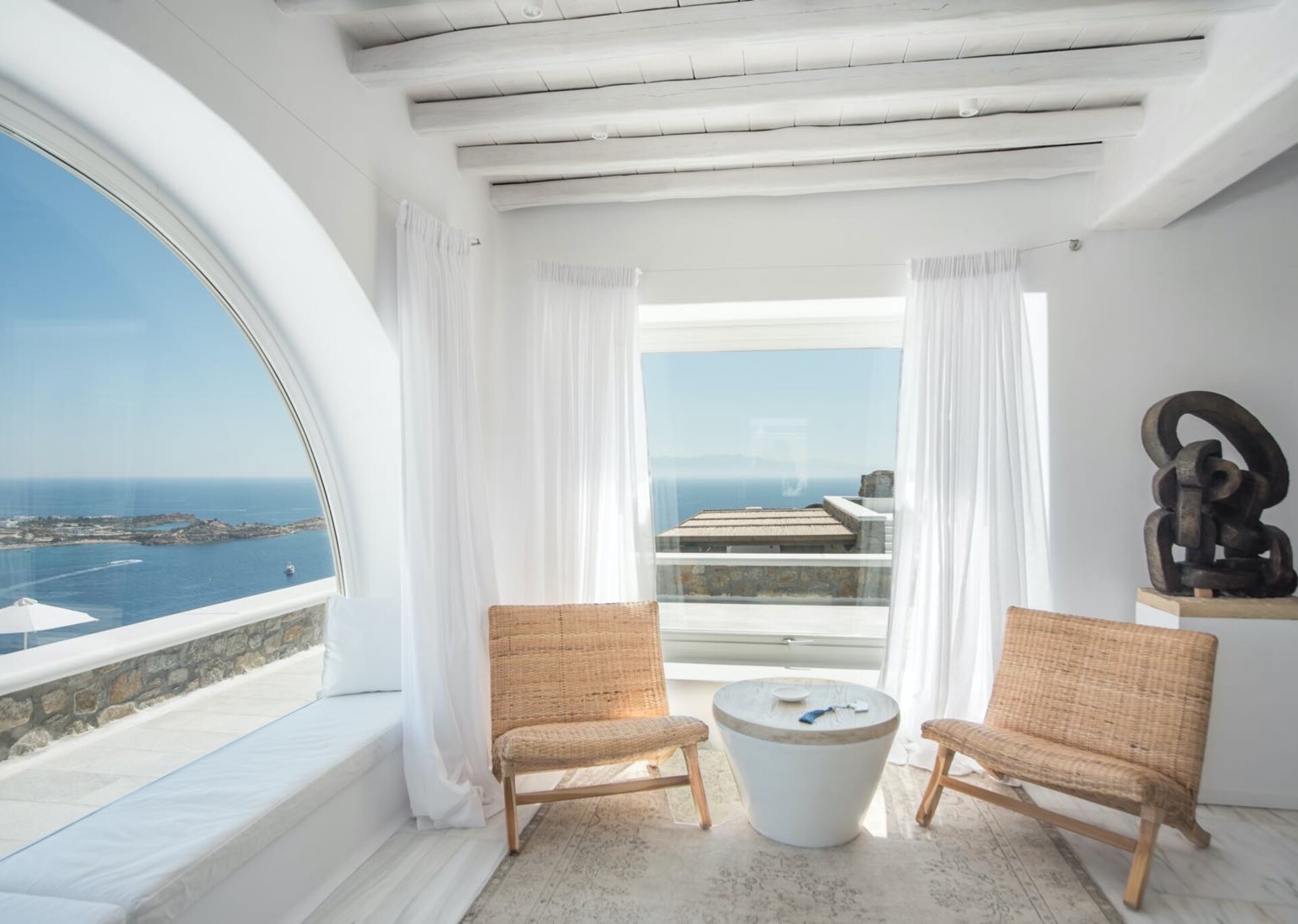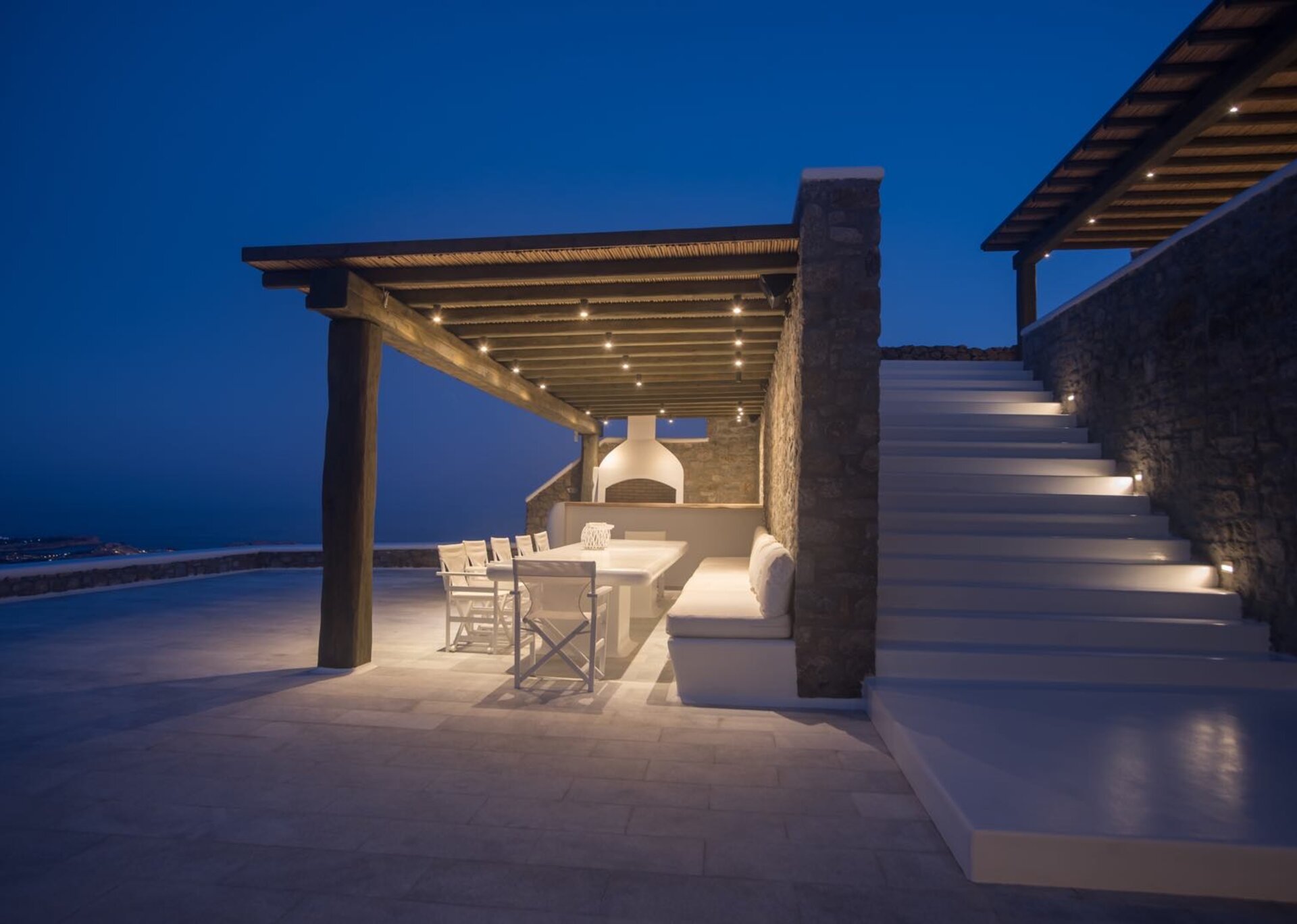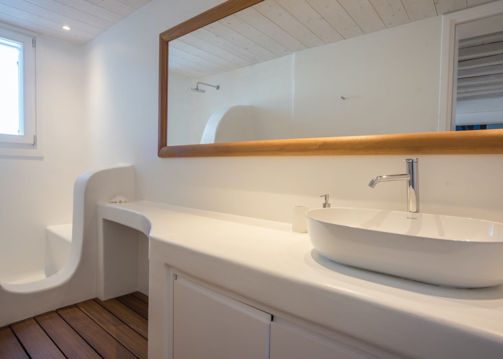 A typical Cycladic sculpted staircase leads to the three different levels, where ten spacious bedrooms offer first-class accommodation, featuring elegant décor, luxurious bedding, large flat-screen televisions, air conditioning, and spacious en-suite bathrooms. Nine of them are graced with breathtaking sea views, while the two master bedrooms on the upper level provide private rooftop balconies.