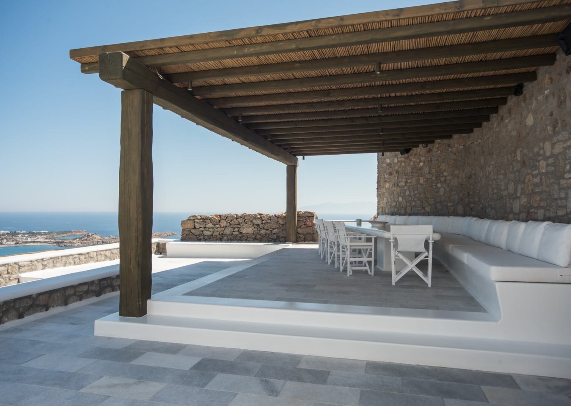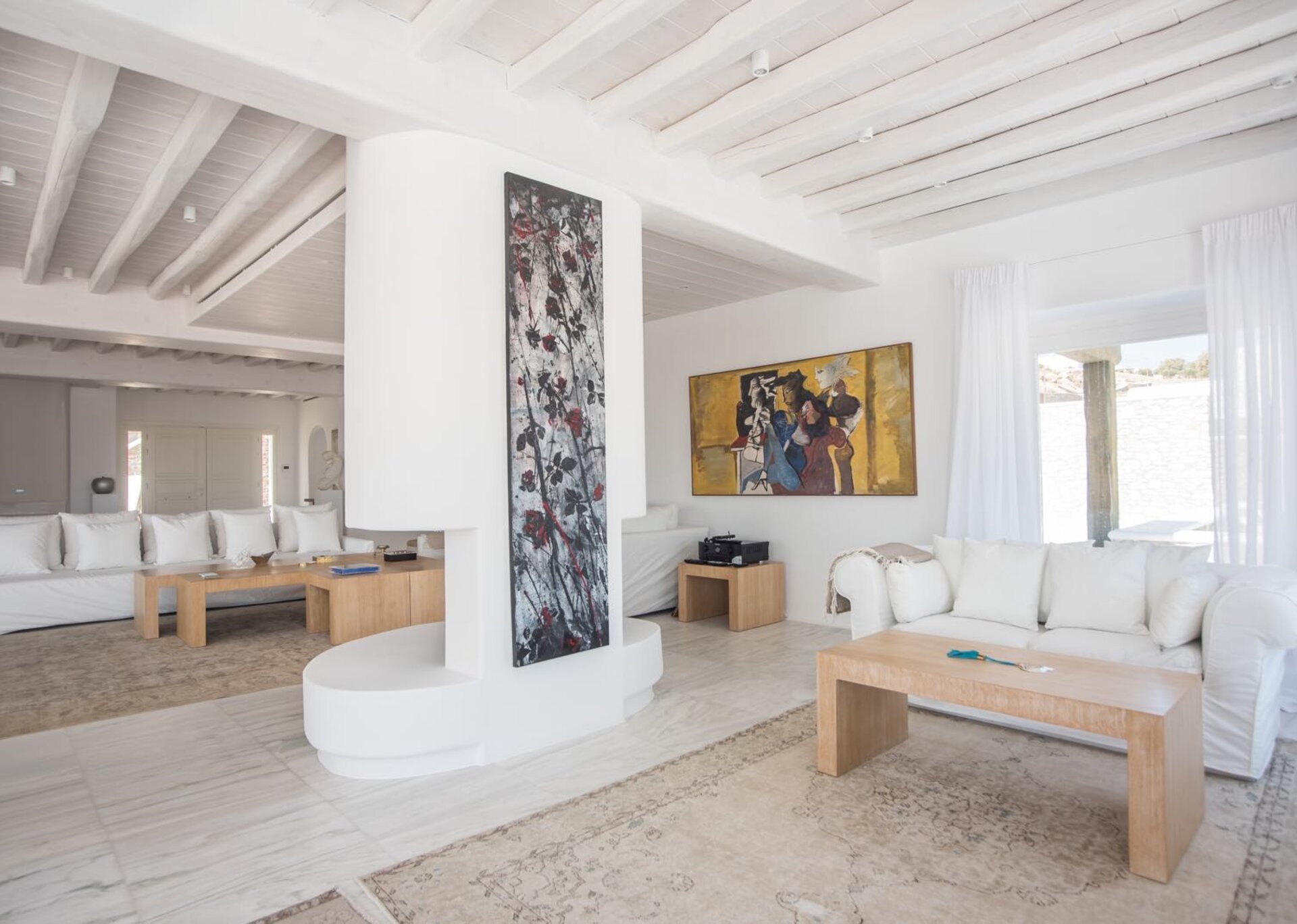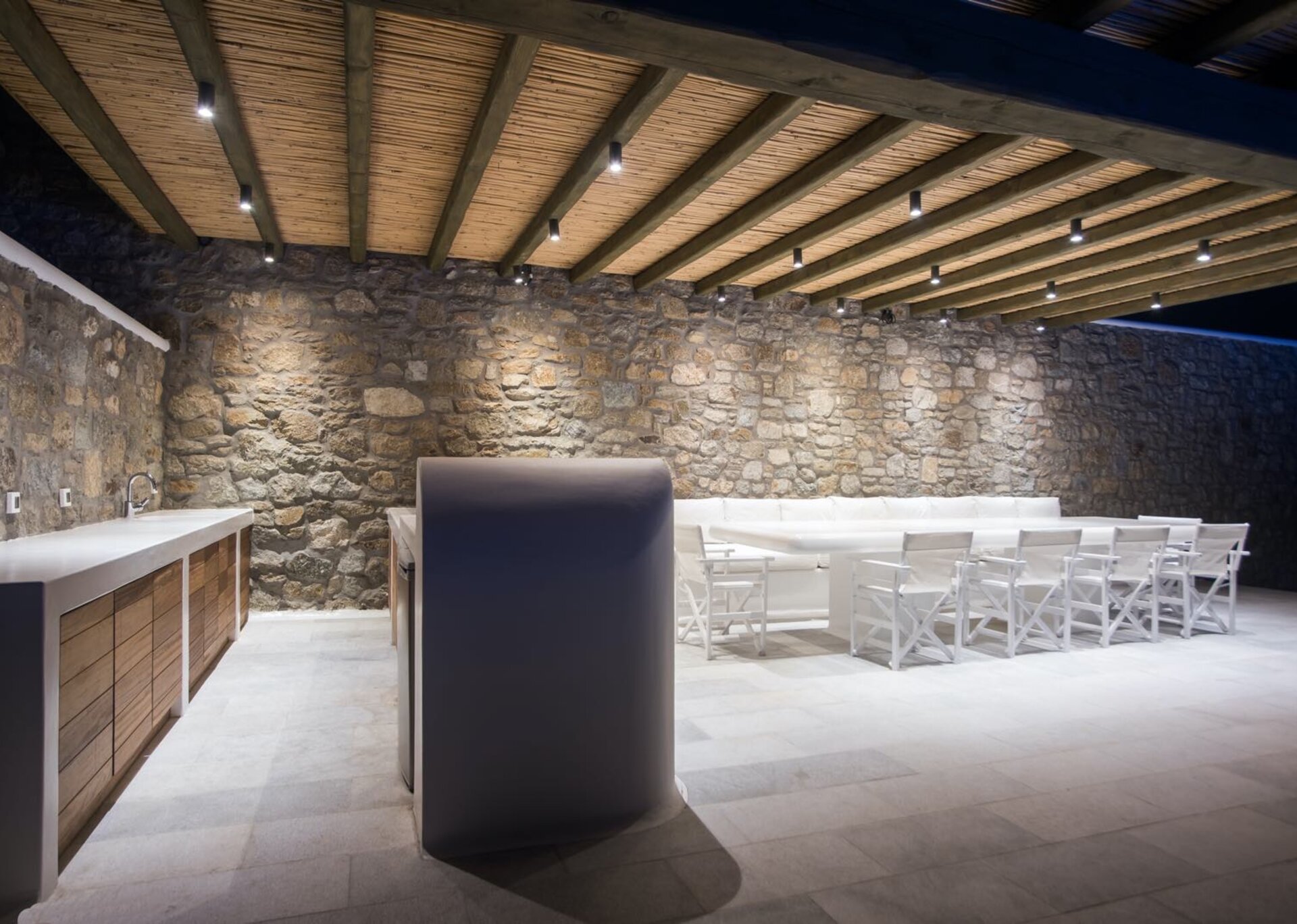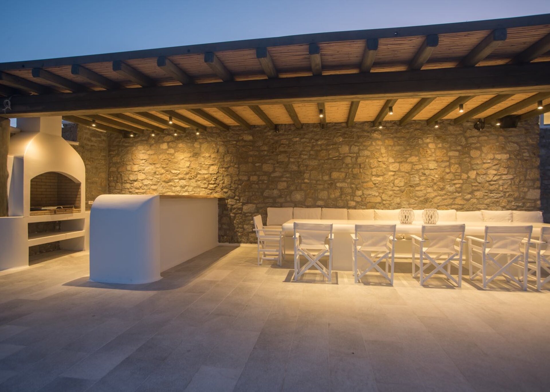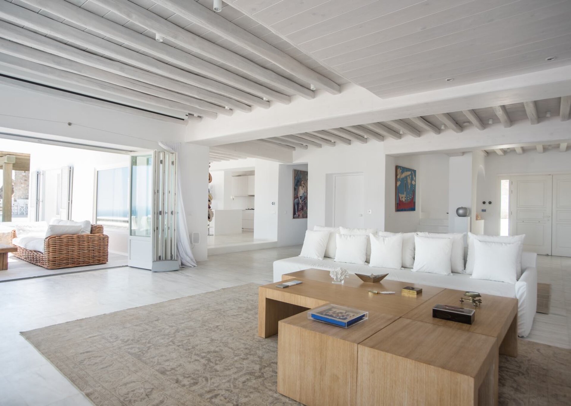 A typical Cycladic sculpted staircase leads to the three different levels, where ten spacious bedrooms offer first-class accommodation, featuring elegant décor, luxurious bedding, large flat-screen televisions, air conditioning, and spacious en-suite bathrooms. Nine of them are graced with breathtaking sea views, while the two master bedrooms on the upper level provide private rooftop balconies.