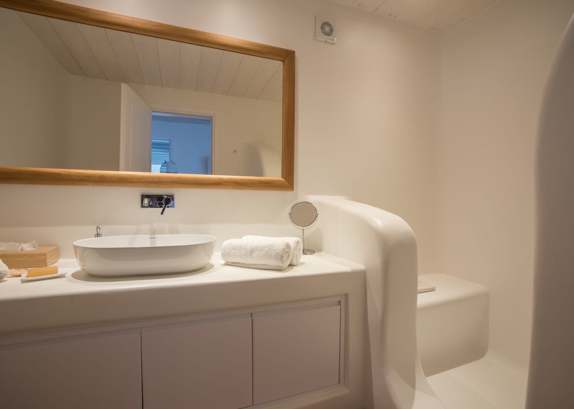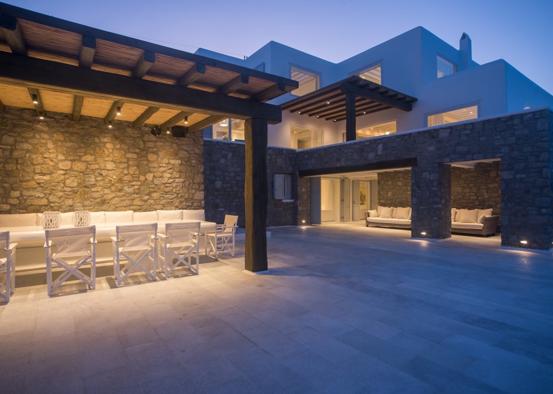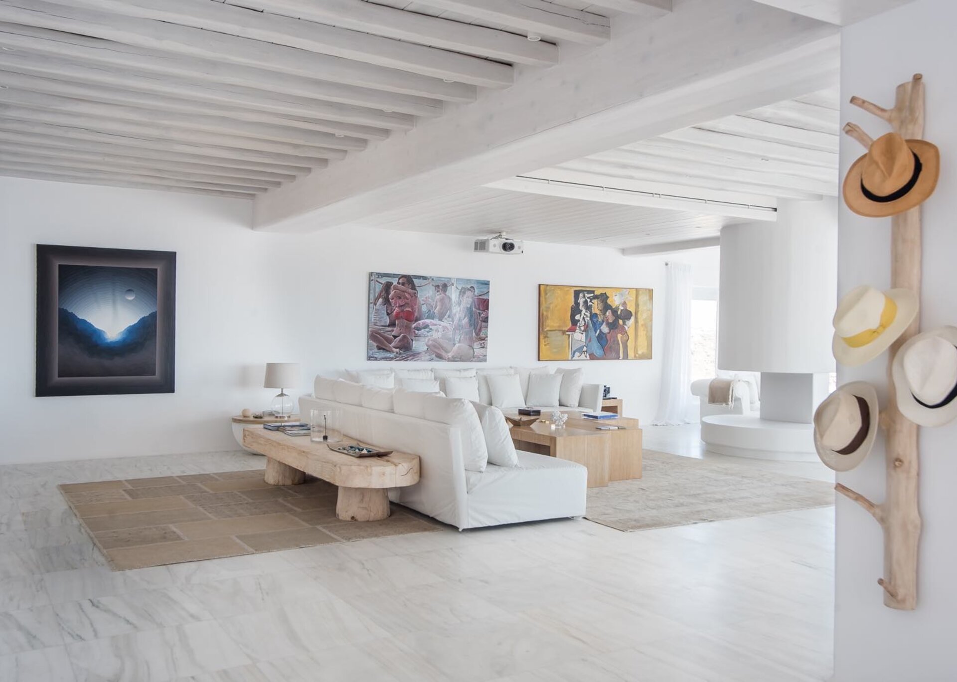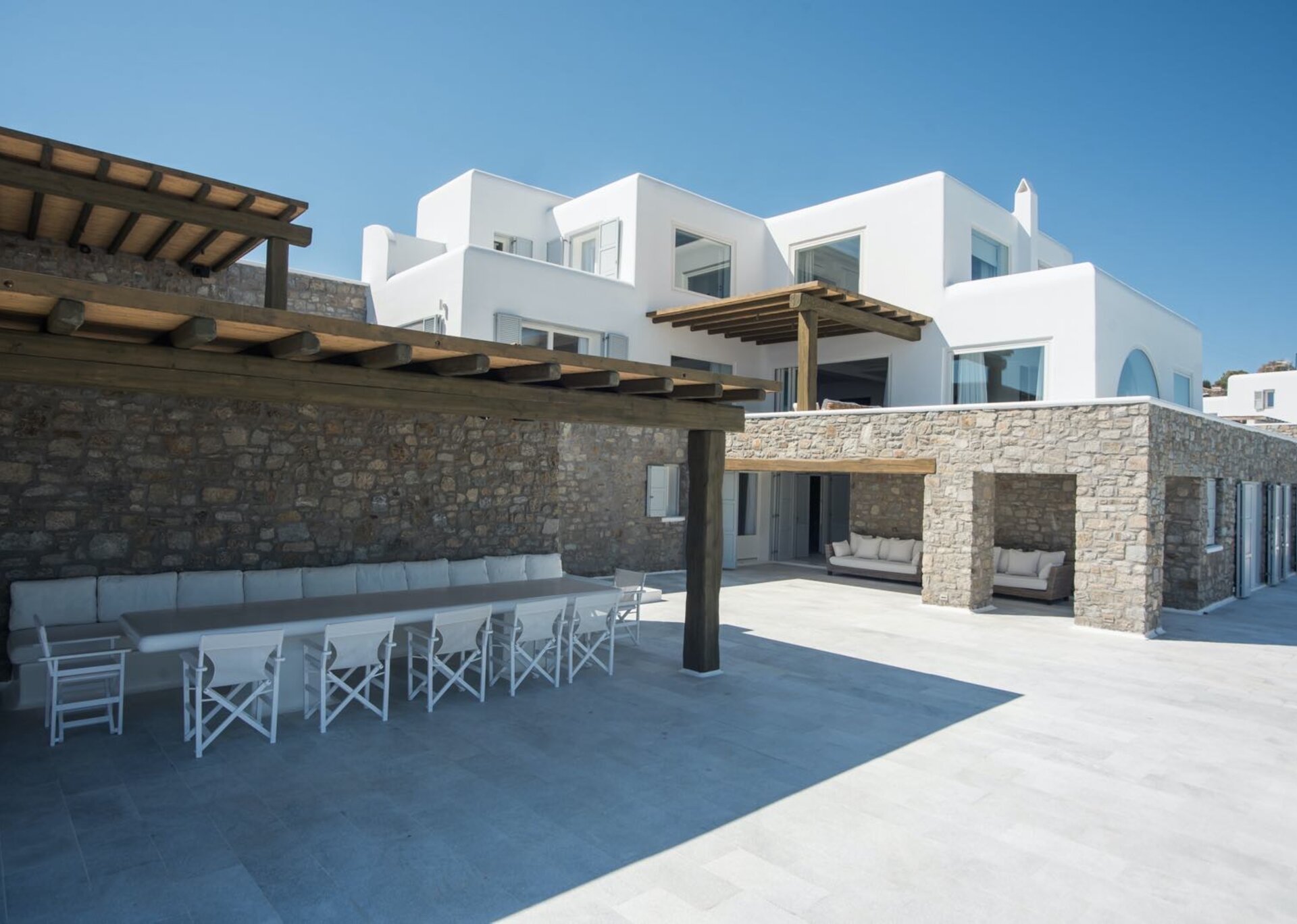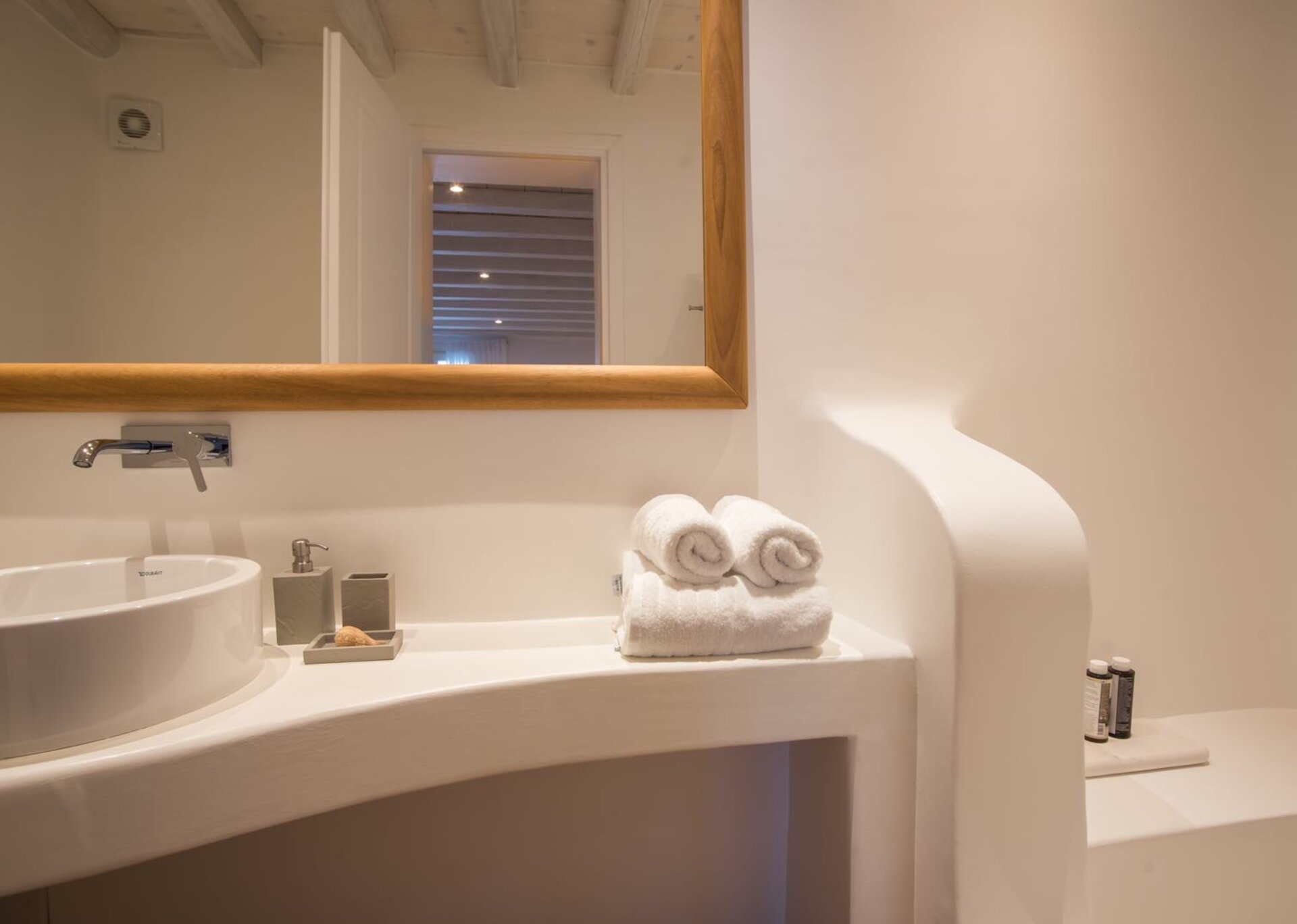 A typical Cycladic sculpted staircase leads to the three different levels, where ten spacious bedrooms offer first-class accommodation, featuring elegant décor, luxurious bedding, large flat-screen televisions, air conditioning, and spacious en-suite bathrooms. Nine of them are graced with breathtaking sea views, while the two master bedrooms on the upper level provide private rooftop balconies.