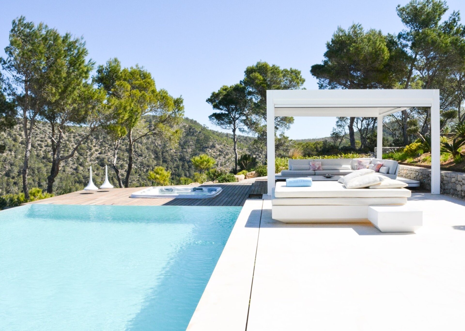 Tash's exterior is equally remarkable, featuring a charming garden adorned with olive and lemon trees, captivating stone walls, an exquisite infinity pool, and a luxurious jacuzzi. The use of natural materials, such as stone, wood, and lush vegetation, seamlessly integrates the villa with its enchanting landscape.