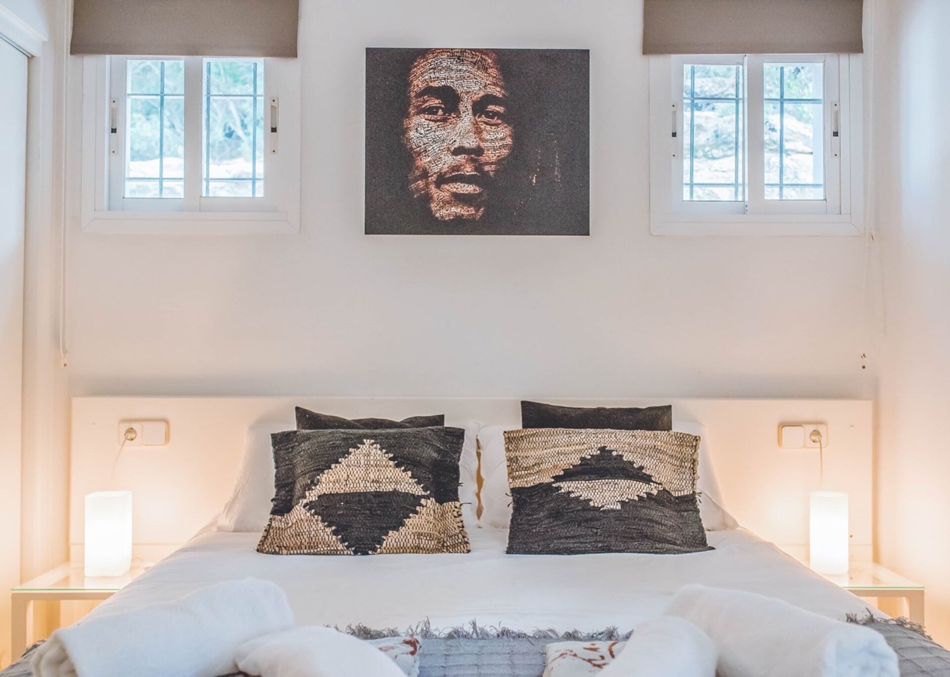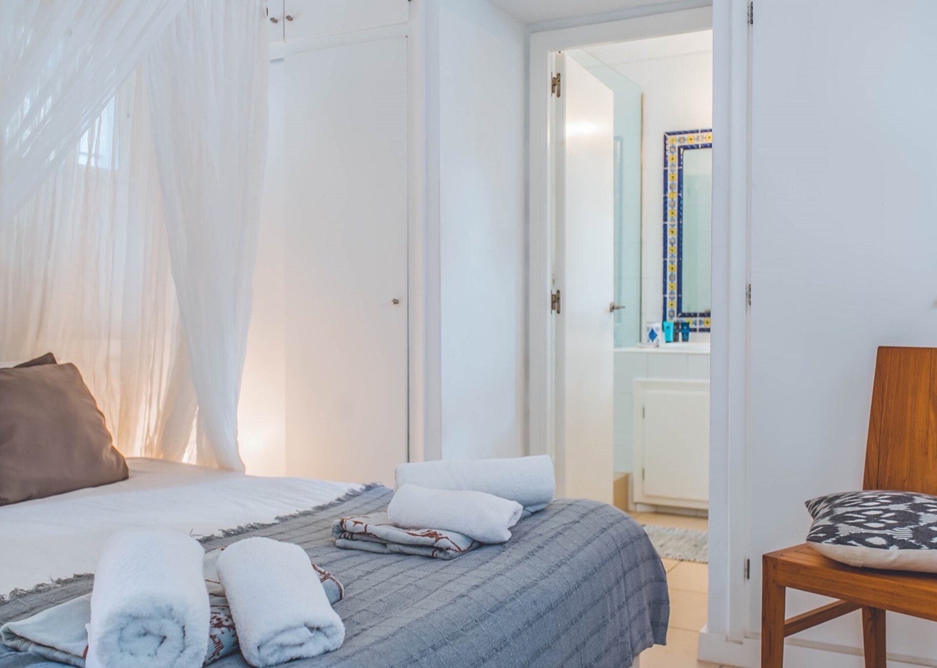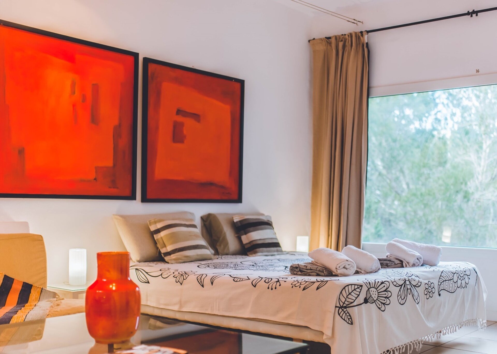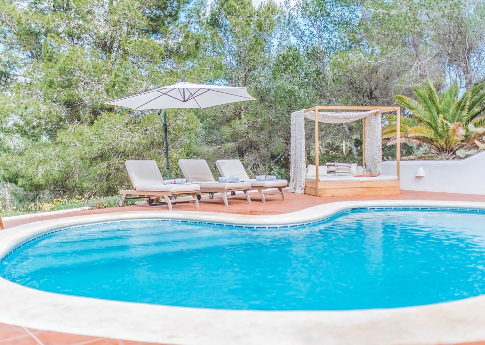 Stepping outside, Tranquility welcomes guests to indulge in the joy of outdoor living. Numerous beautifully furnished spots await, including several cozy chill-out areas, sunbeds by the poolside, a double four-poster daybed, and even a hammock. Additionally, a spacious al fresco dining and entertaining terrace, complete with an electric barbecue, sets the stage for memorable gatherings. Here, immerse yourself in the true essence of an Ibizan-style home adorned with views that will leave an indelible mark on your soul.