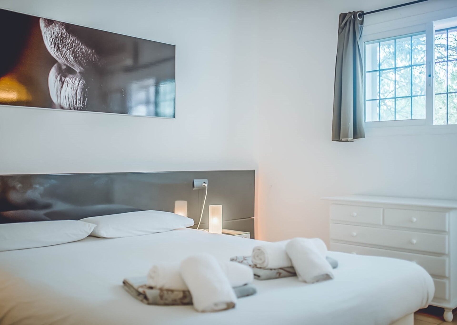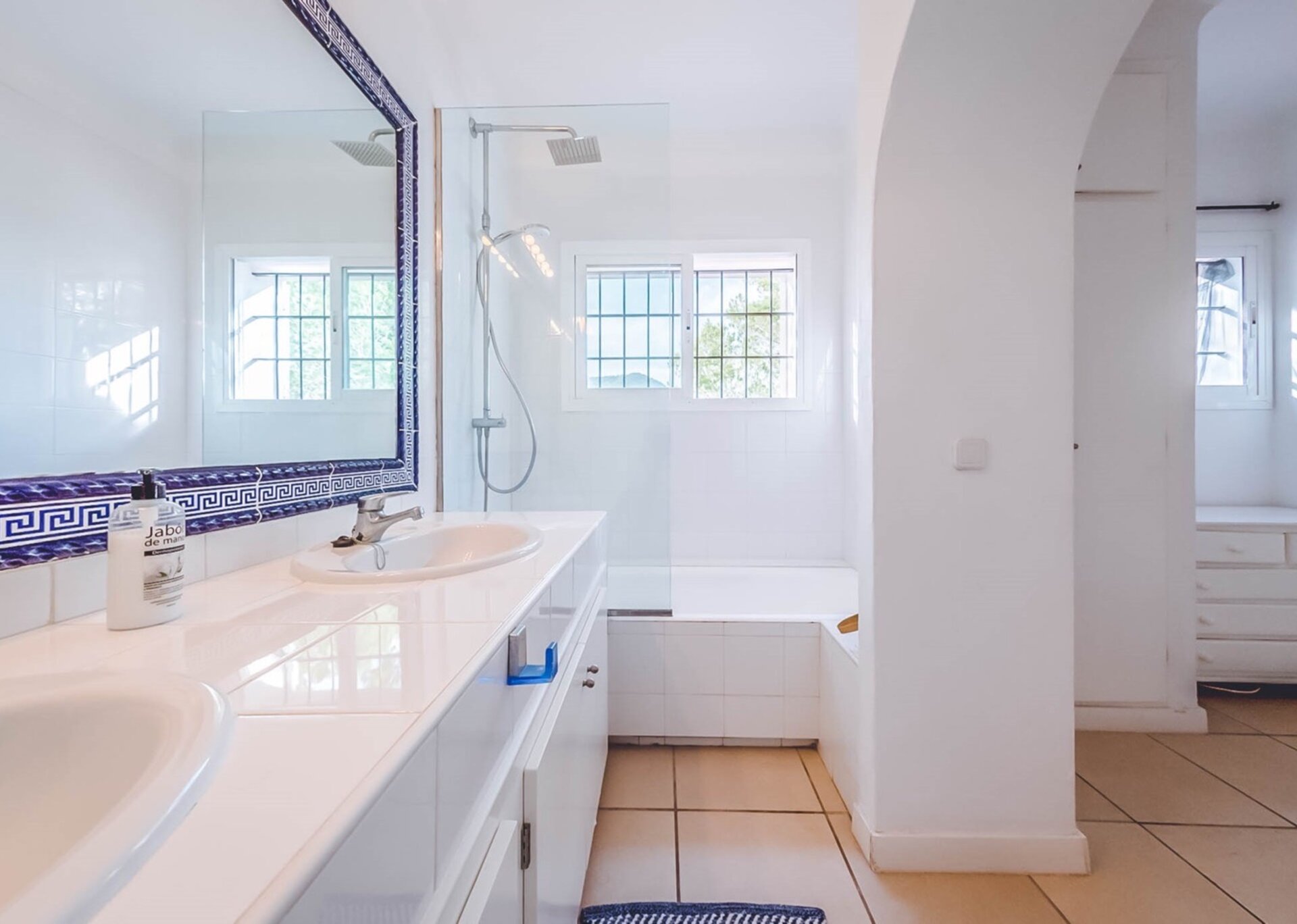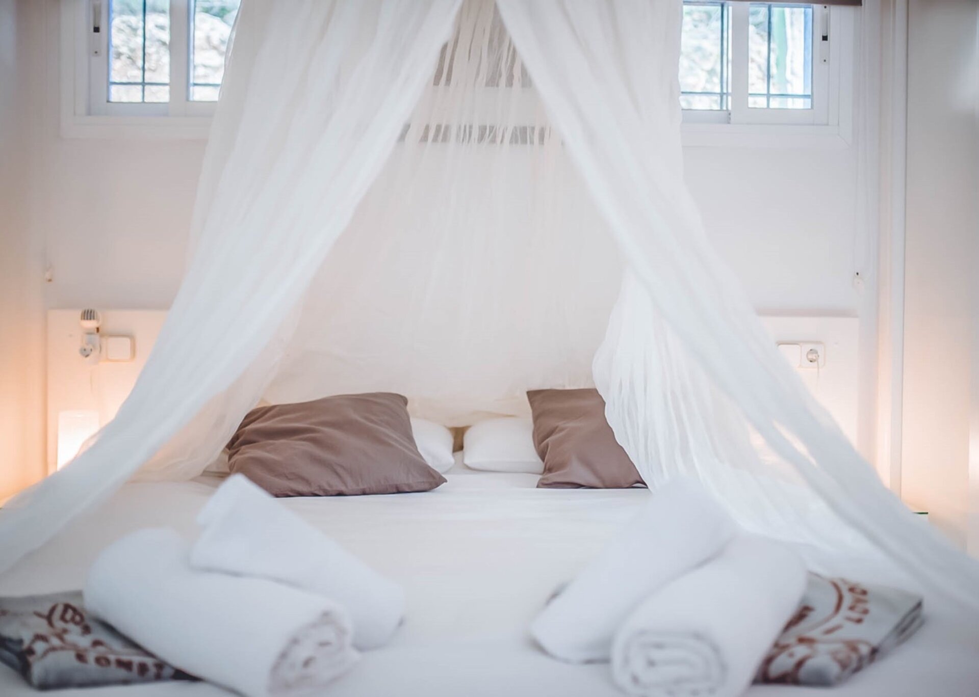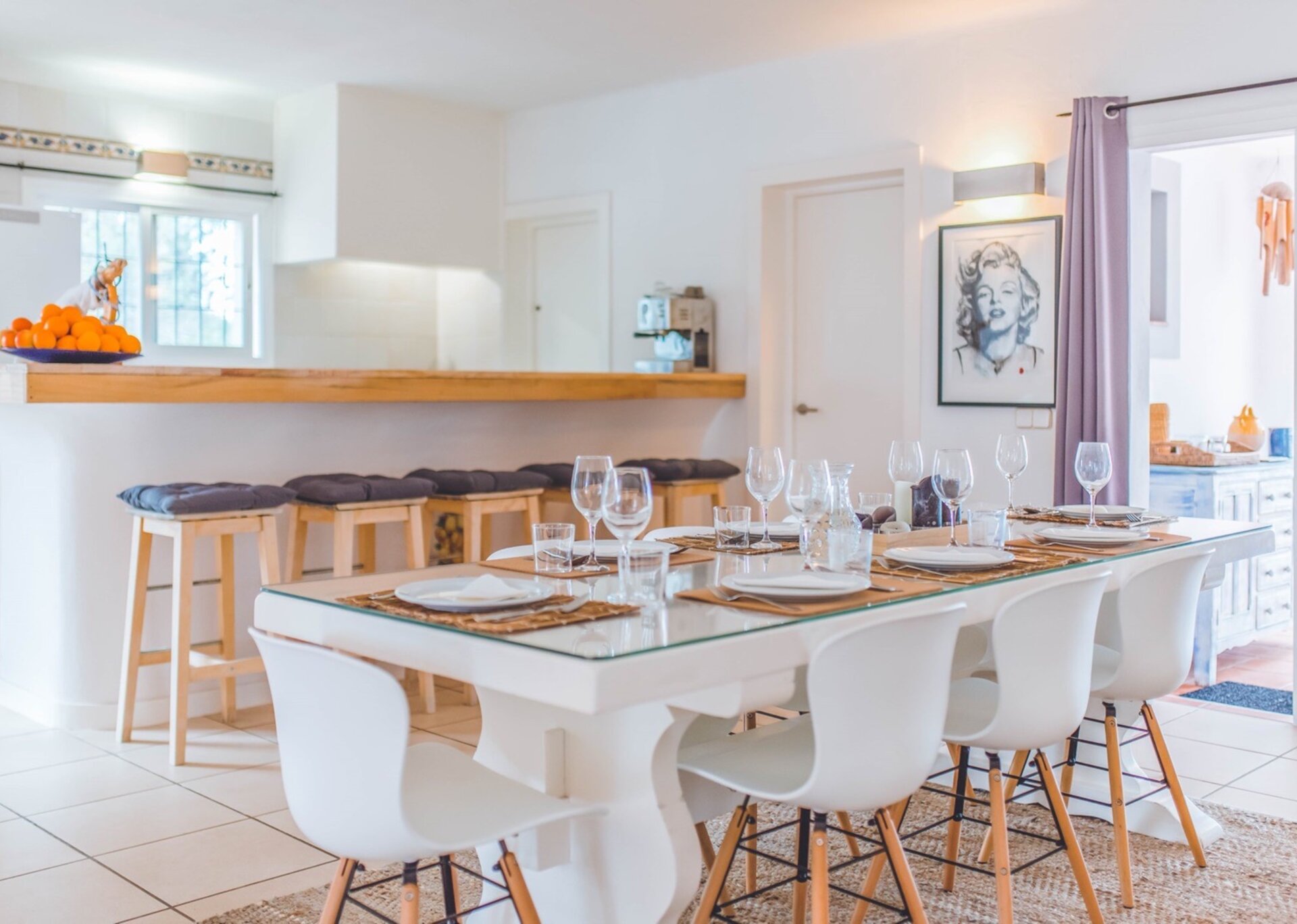 Stepping outside, Tranquility welcomes guests to indulge in the joy of outdoor living. Numerous beautifully furnished spots await, including several cozy chill-out areas, sunbeds by the poolside, a double four-poster daybed, and even a hammock. Additionally, a spacious al fresco dining and entertaining terrace, complete with an electric barbecue, sets the stage for memorable gatherings. Here, immerse yourself in the true essence of an Ibizan-style home adorned with views that will leave an indelible mark on your soul.