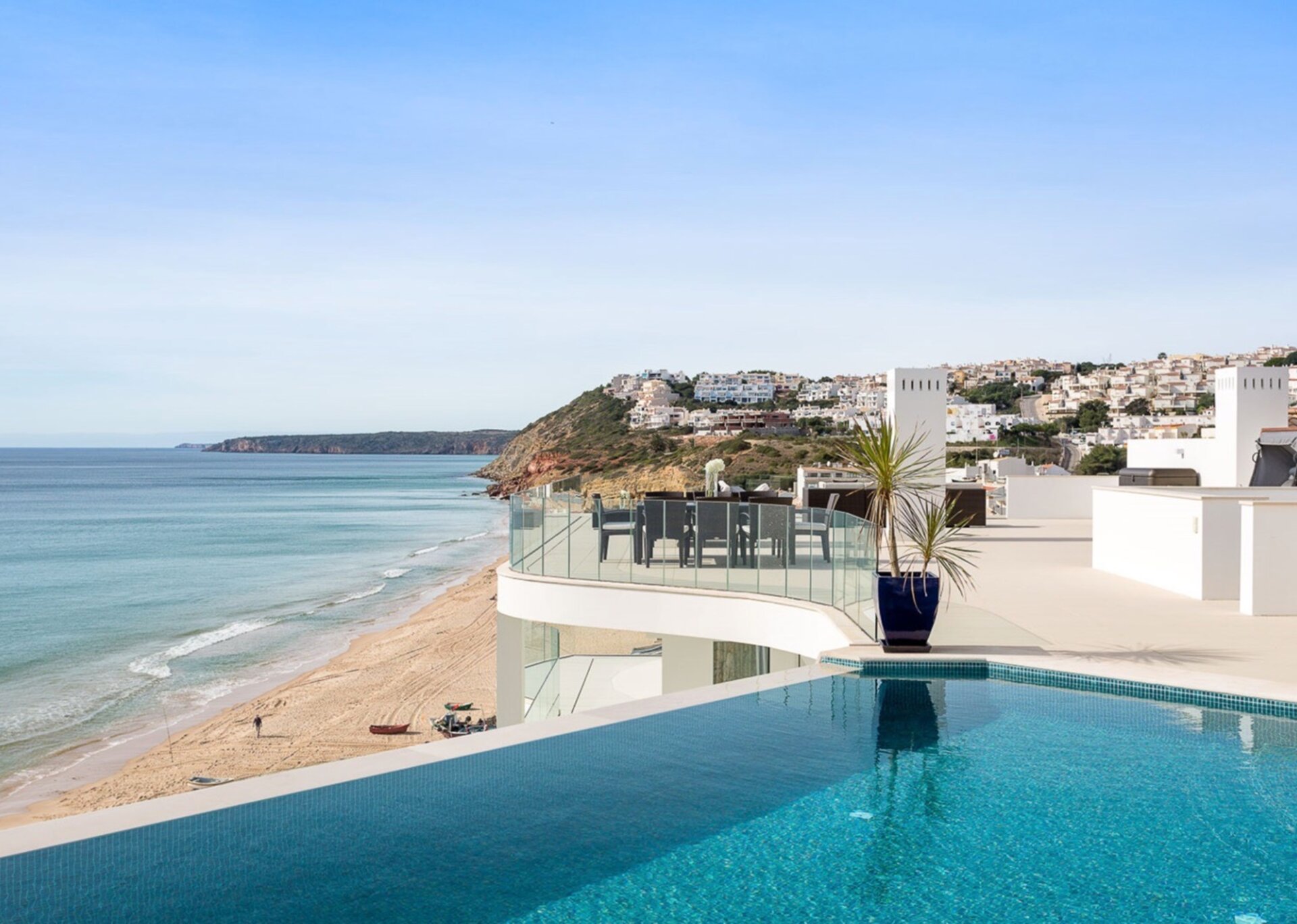 Stunning views and immaculate attention to detail do not begin to describe this fantastic home with the primo position on Praia Salema. In fact, Salema Beach literally starts at this home that sits in a prime location to take in the views of the blue and white traditional fishermen’s village and the golden sand beach below.
