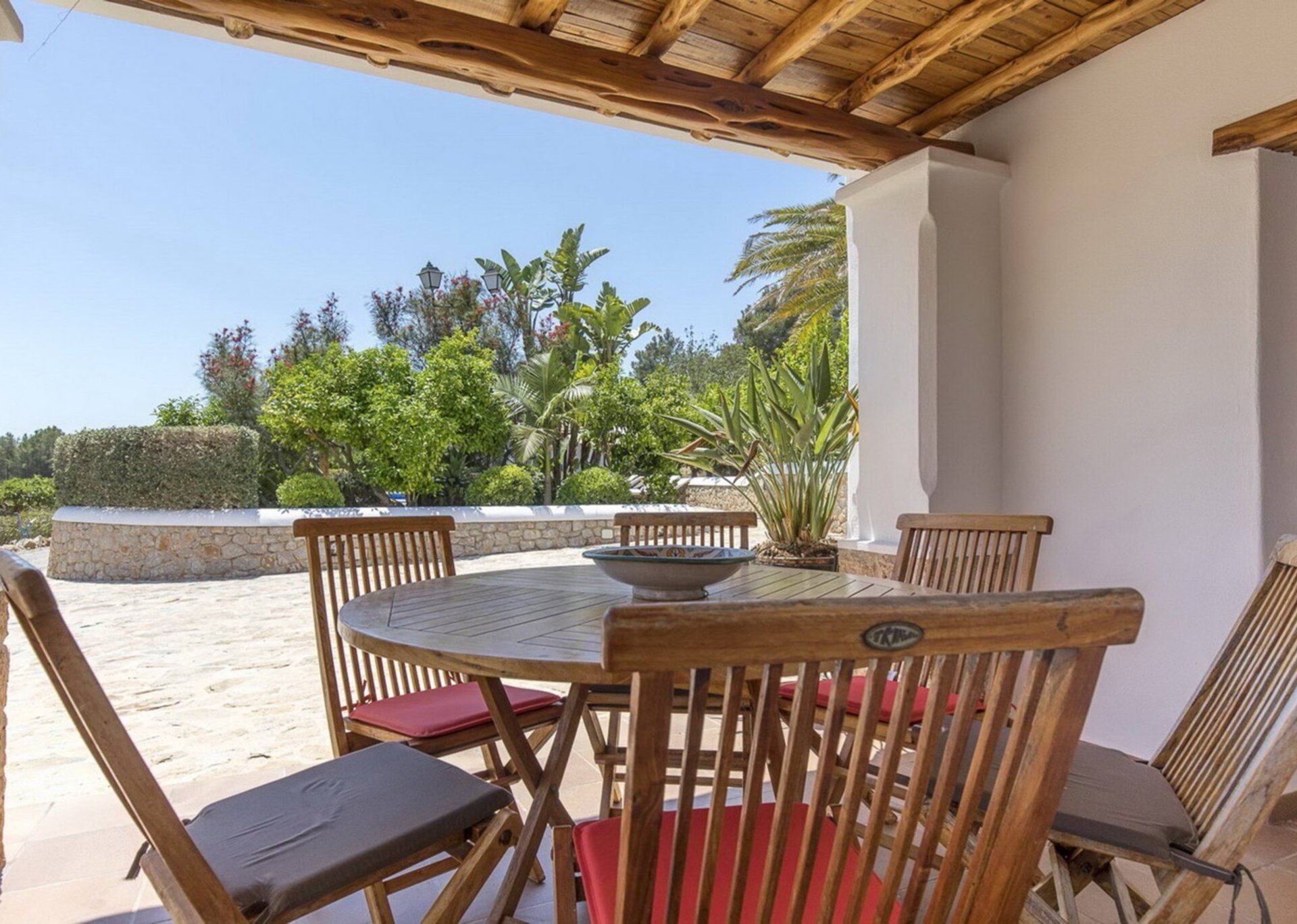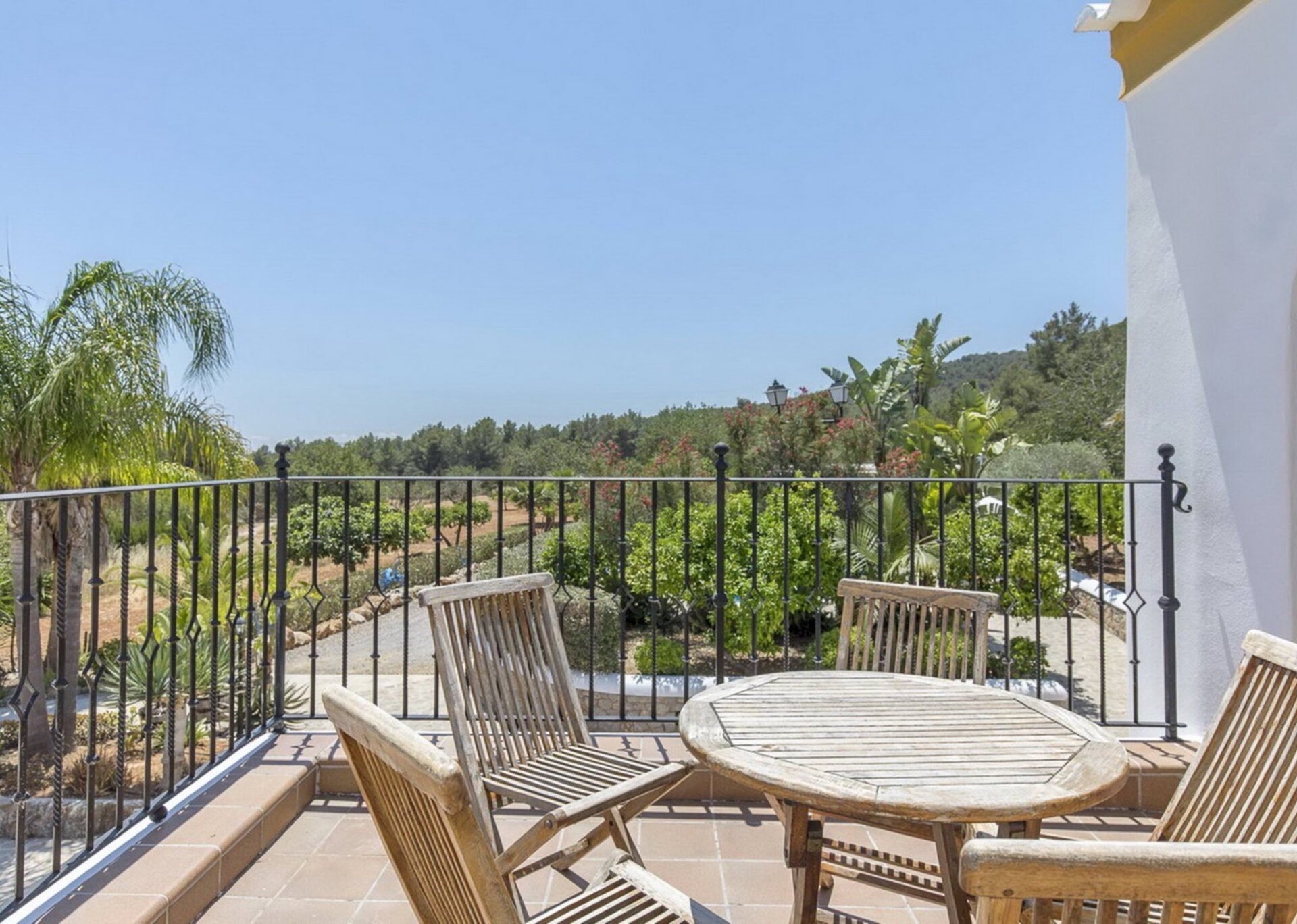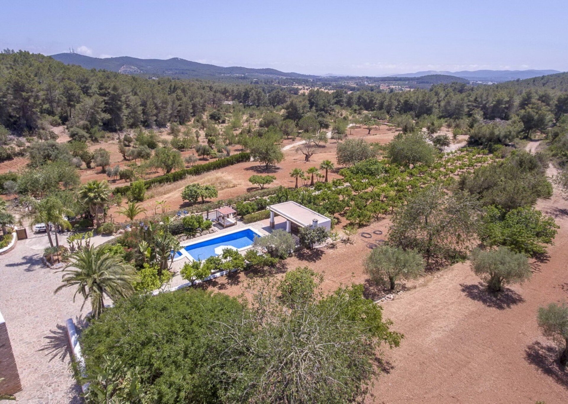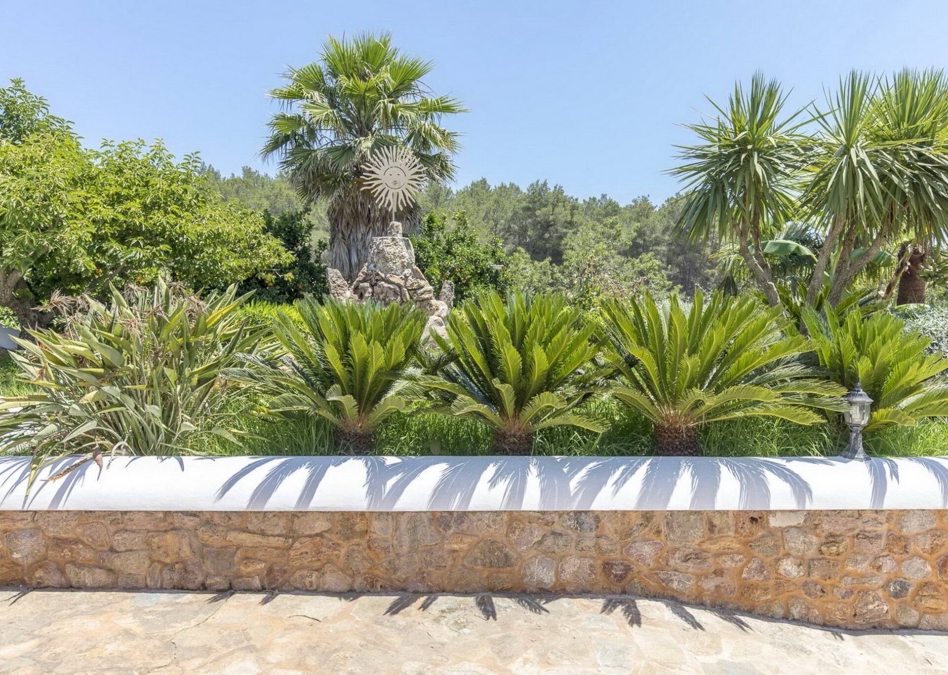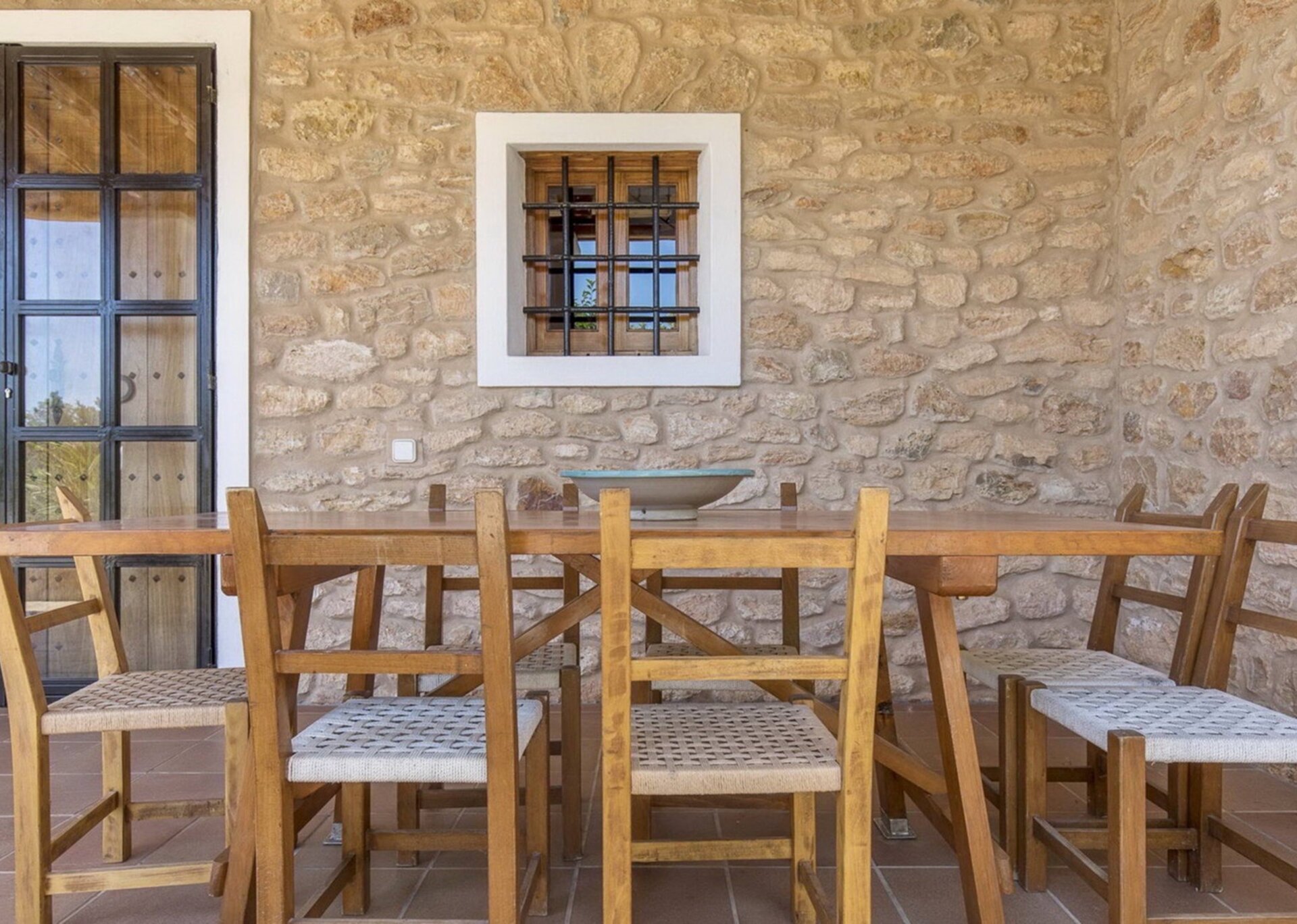 This superbly renovated finca property is situated on an expansive plot of approximately 10,000m2, adorned with about 100 orange trees. Every aspect has been meticulously designed with utmost attention to detail. The ambiance and interior of the finca exude an authentic Ibizan country hotel style. The original Sabina woodwork and finely crafted ironwork were meticulously created by the owner's family in Ibiza. Within this spacious 450m2 finca, you will relish in the unspoiled natural beauty and generous allure of Ibiza. A harmonious blend of natural stone, olive, Sabina wood, and authentic Ibicencan style envelops the property. By night, the driveway, garden, and pool illuminate beautifully, creating an enchanting atmosphere.