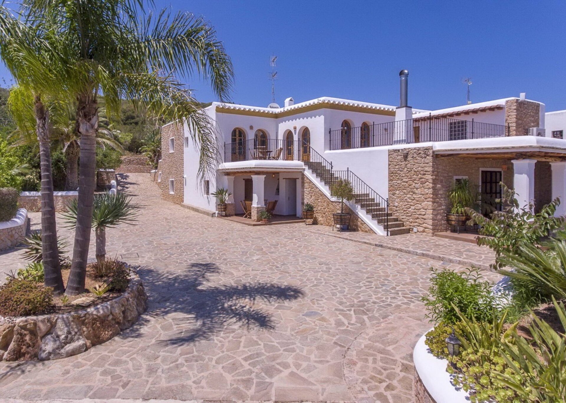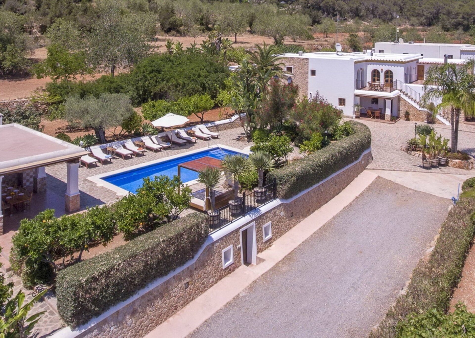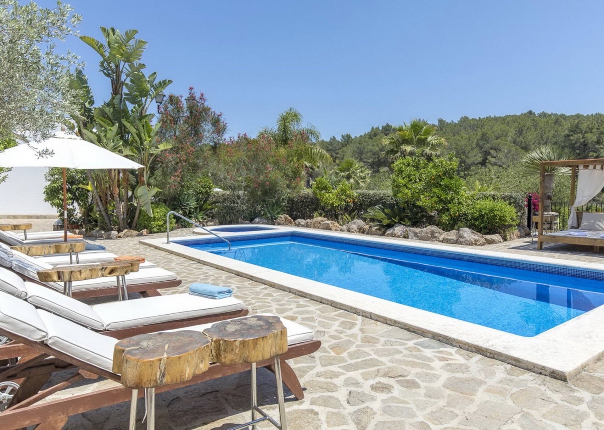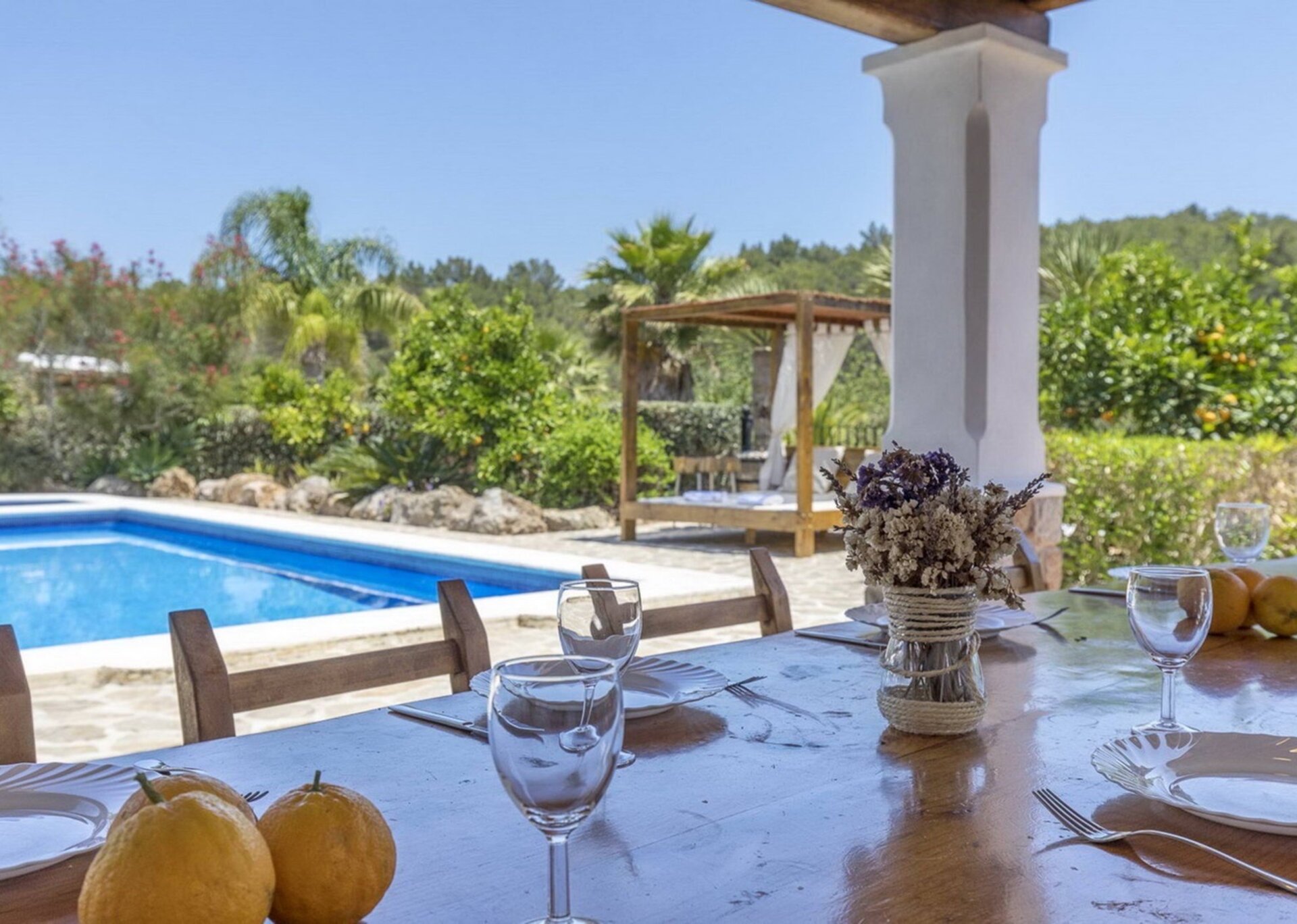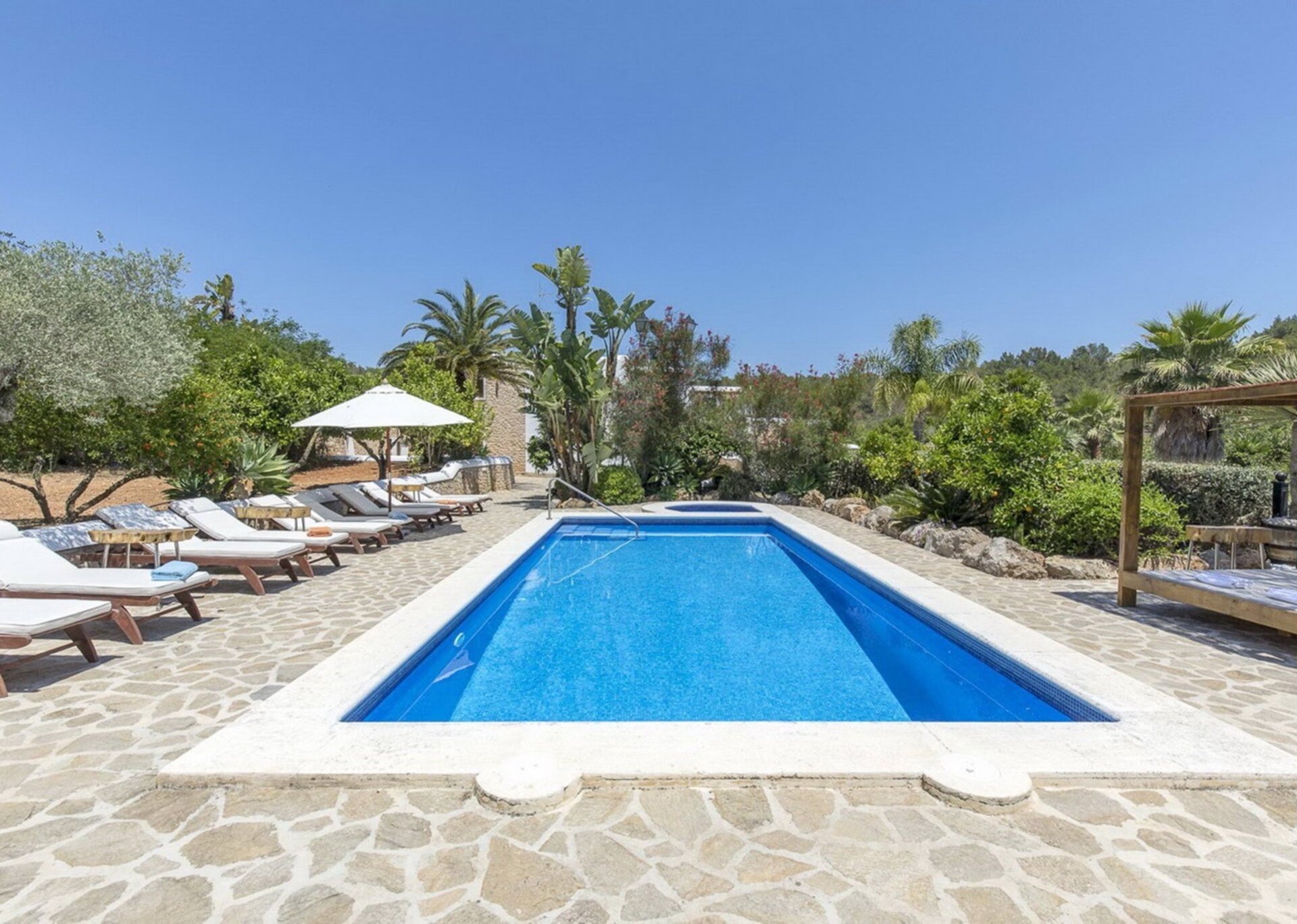This superbly renovated finca property is situated on an expansive plot of approximately 10,000m2, adorned with about 100 orange trees. Every aspect has been meticulously designed with utmost attention to detail. The ambiance and interior of the finca exude an authentic Ibizan country hotel style. The original Sabina woodwork and finely crafted ironwork were meticulously created by the owner's family in Ibiza. Within this spacious 450m2 finca, you will relish in the unspoiled natural beauty and generous allure of Ibiza. A harmonious blend of natural stone, olive, Sabina wood, and authentic Ibicencan style envelops the property. By night, the driveway, garden, and pool illuminate beautifully, creating an enchanting atmosphere.