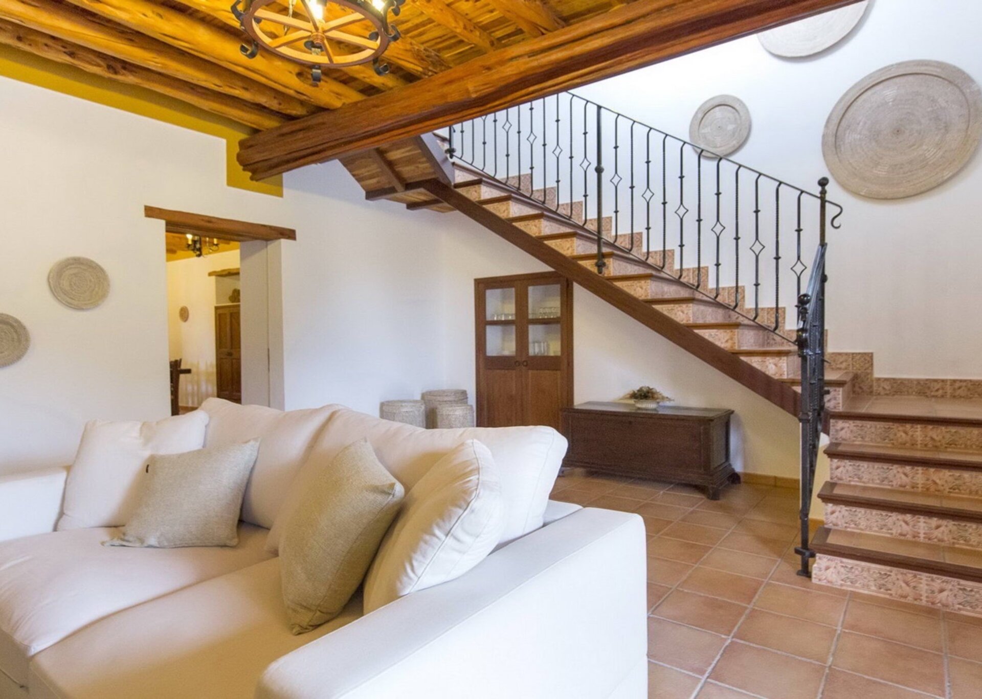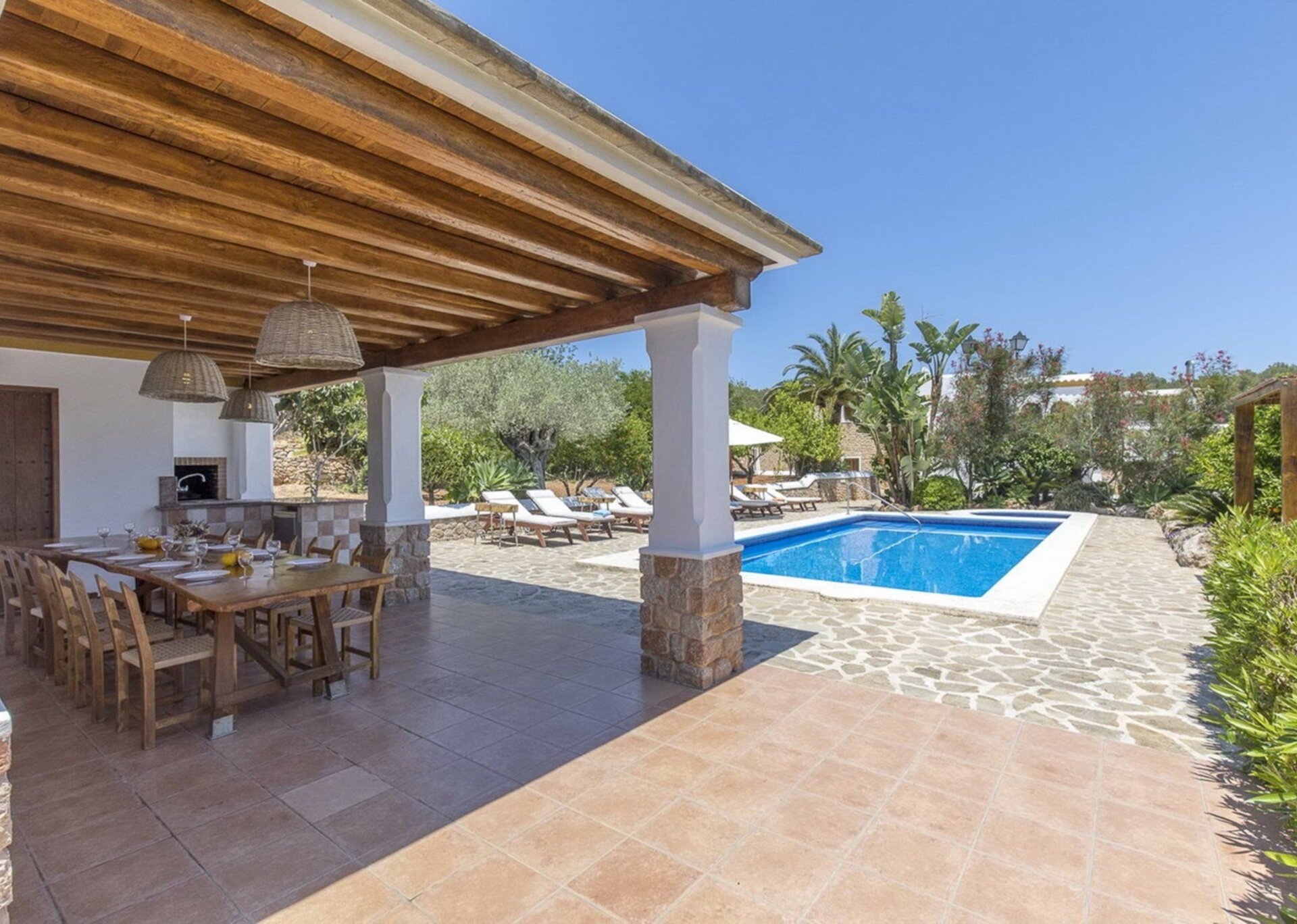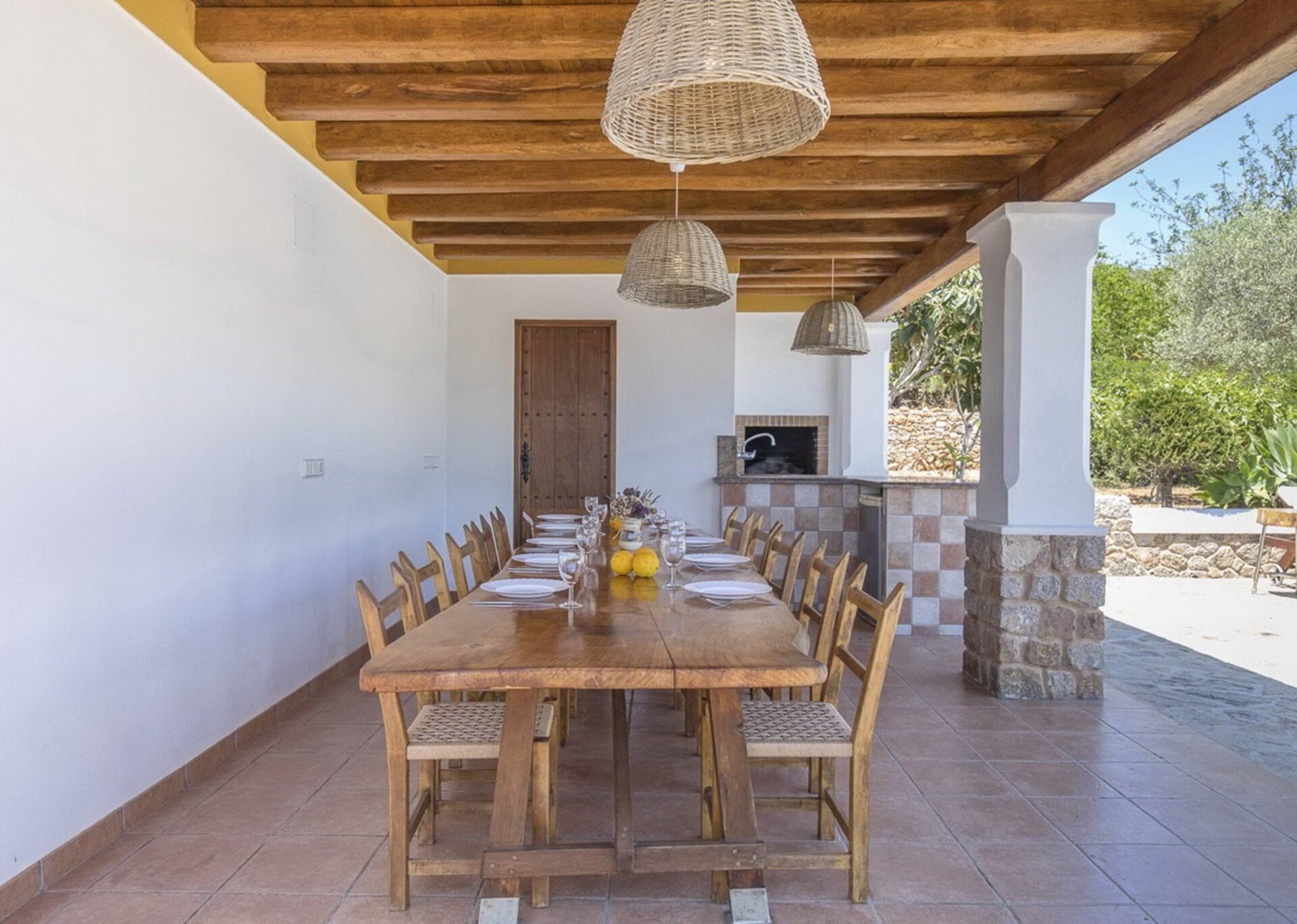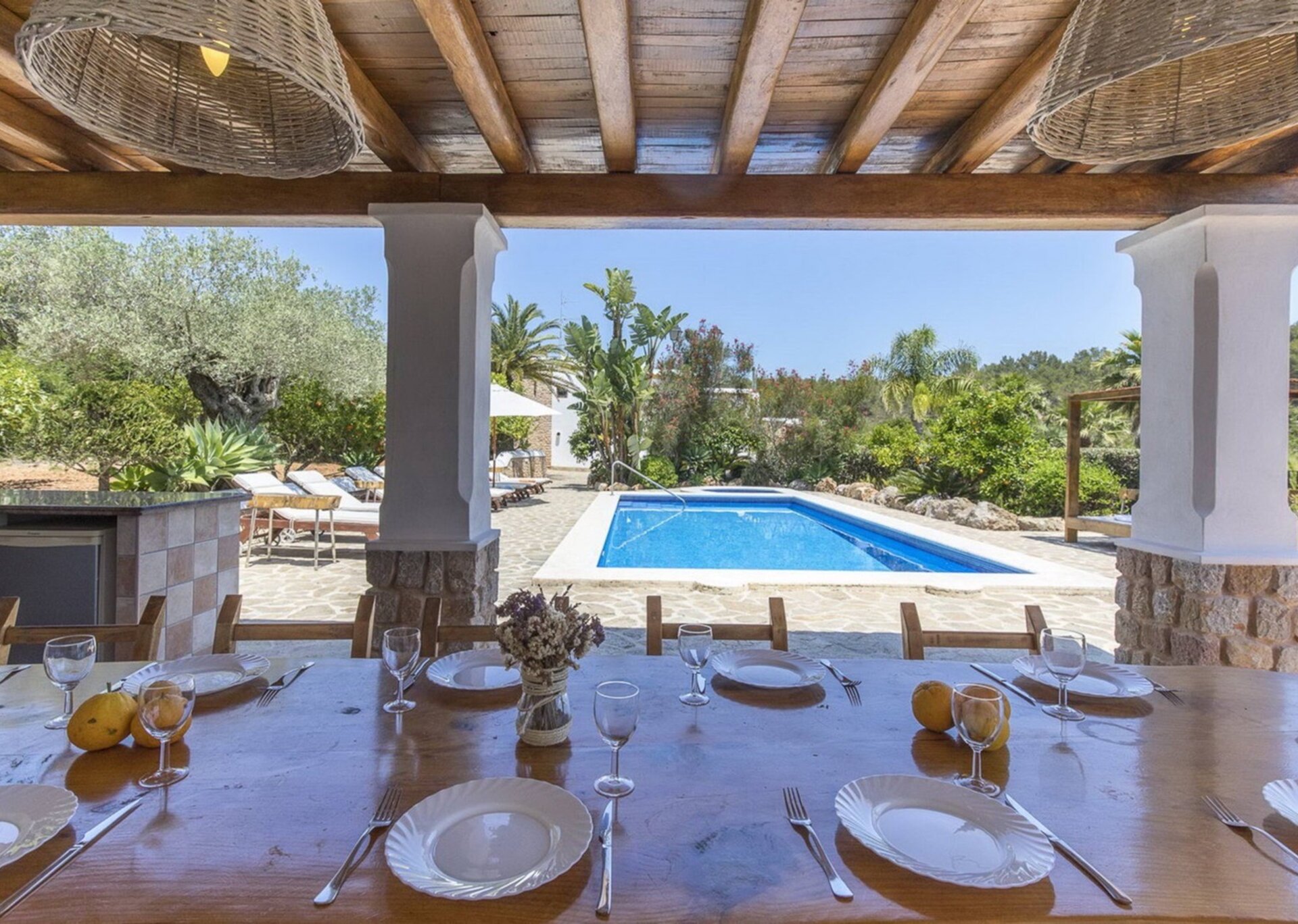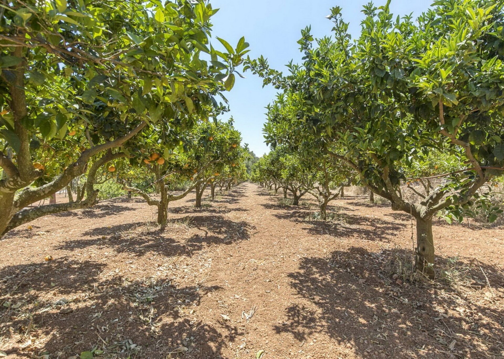 This superbly renovated finca property is situated on an expansive plot of approximately 10,000m2, adorned with about 100 orange trees. Every aspect has been meticulously designed with utmost attention to detail. The ambiance and interior of the finca exude an authentic Ibizan country hotel style. The original Sabina woodwork and finely crafted ironwork were meticulously created by the owner's family in Ibiza. Within this spacious 450m2 finca, you will relish in the unspoiled natural beauty and generous allure of Ibiza. A harmonious blend of natural stone, olive, Sabina wood, and authentic Ibicencan style envelops the property. By night, the driveway, garden, and pool illuminate beautifully, creating an enchanting atmosphere.