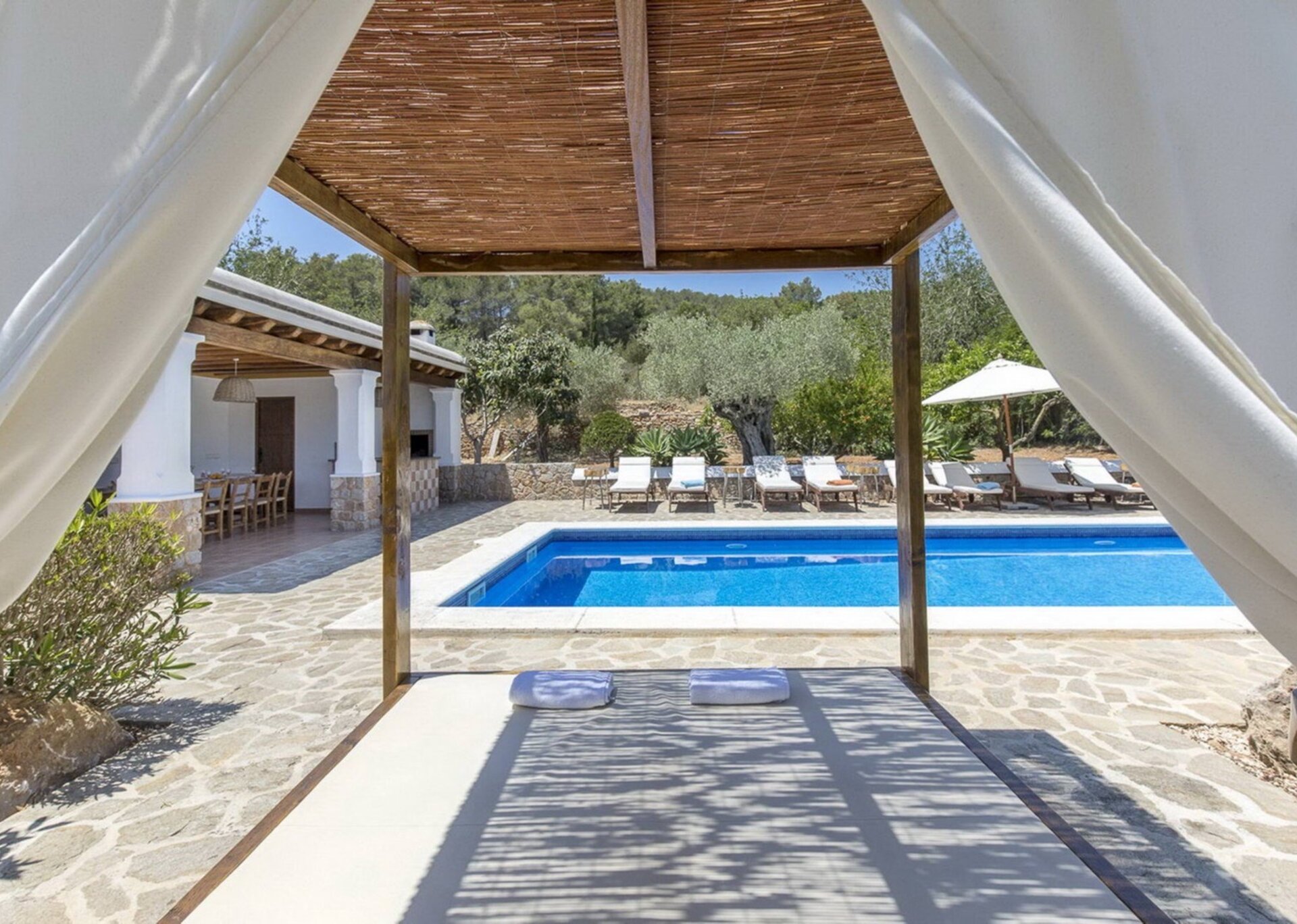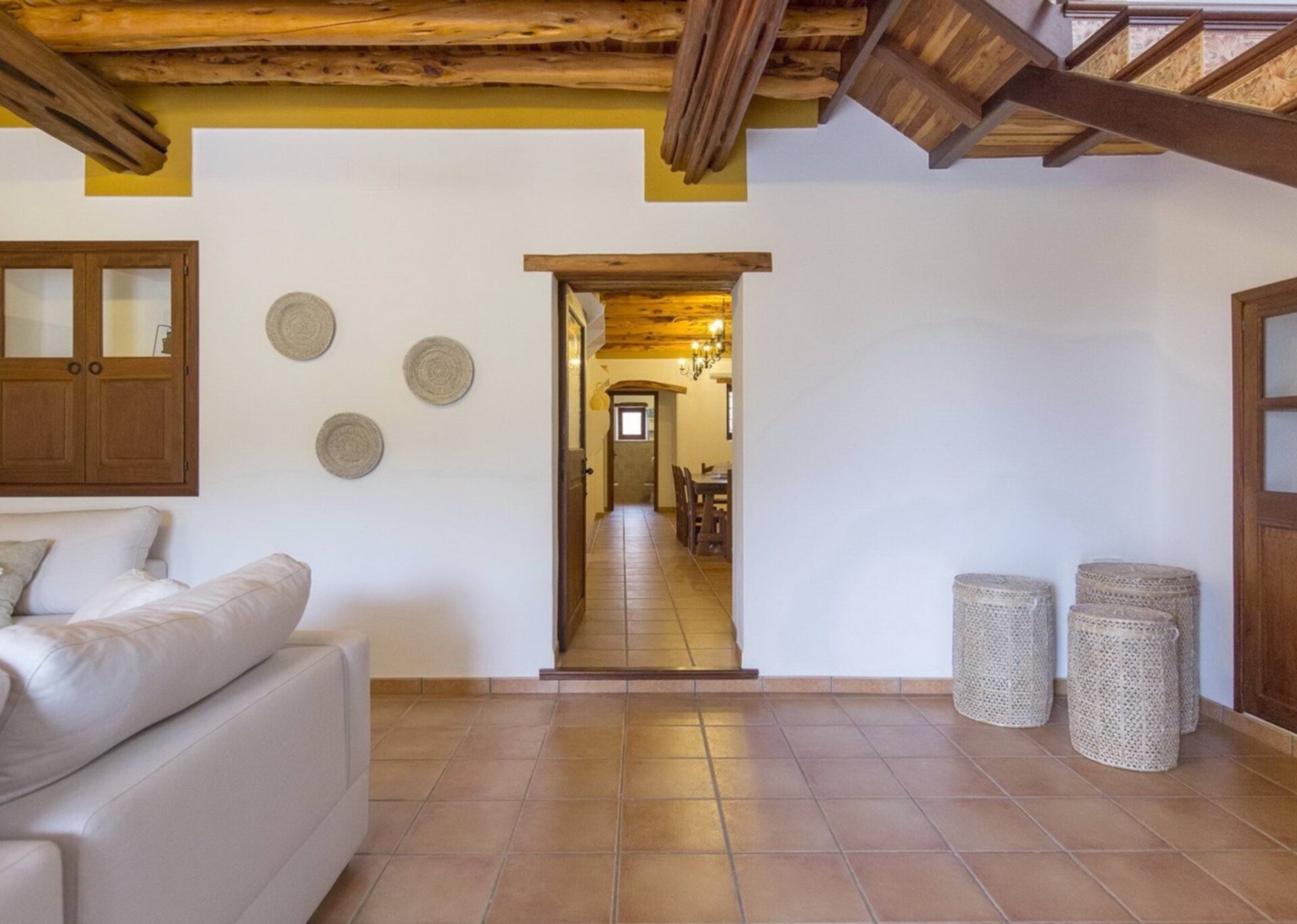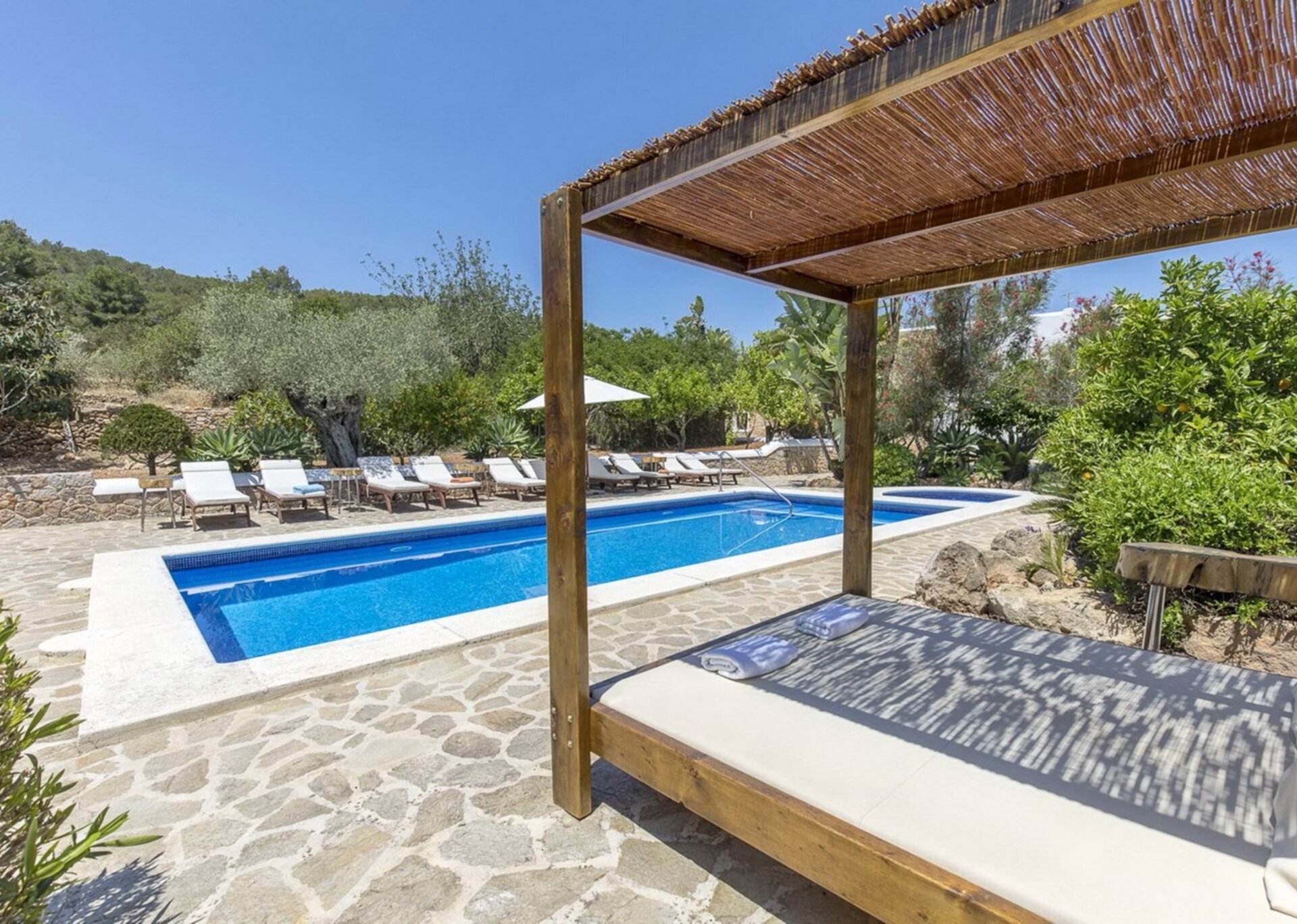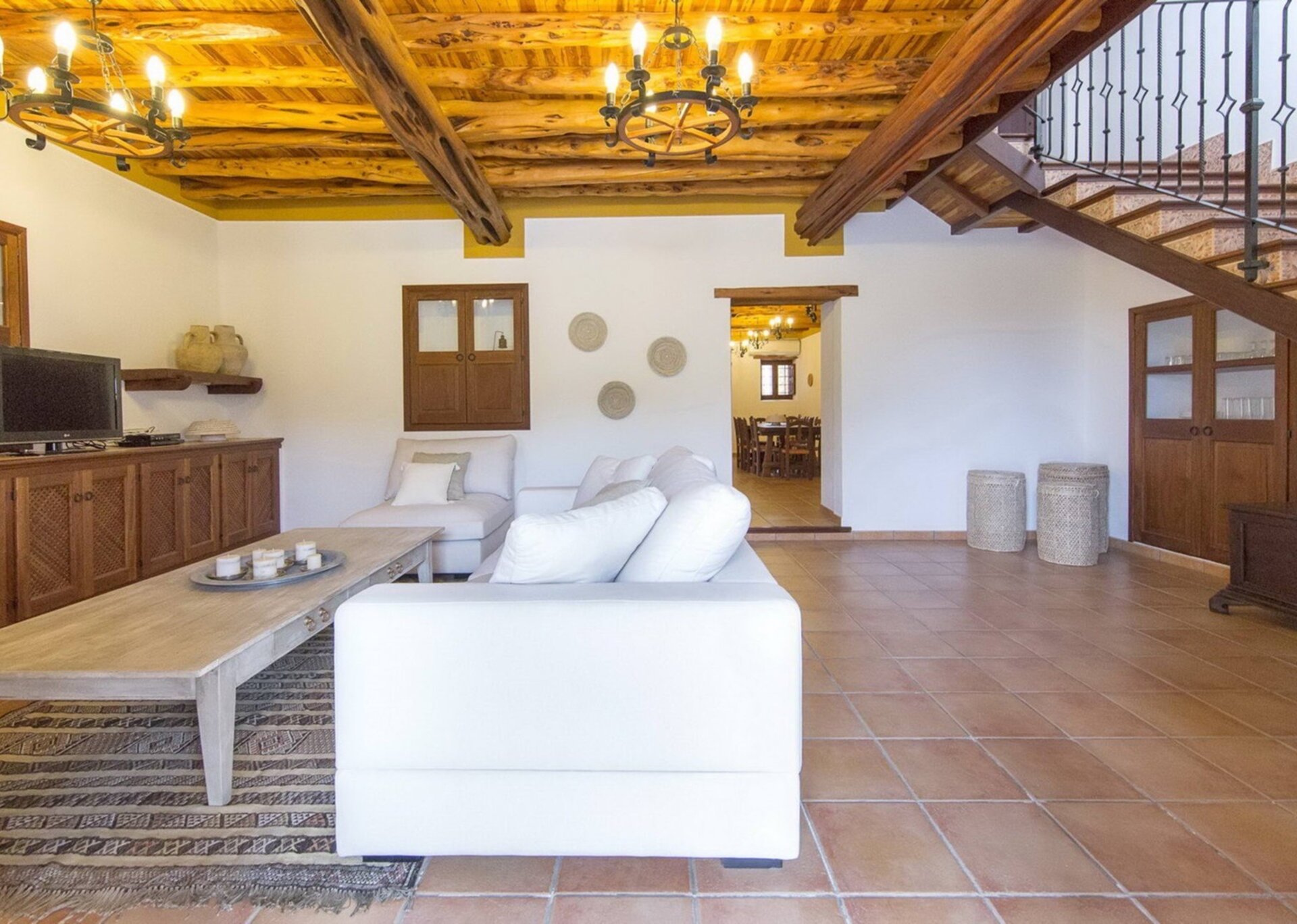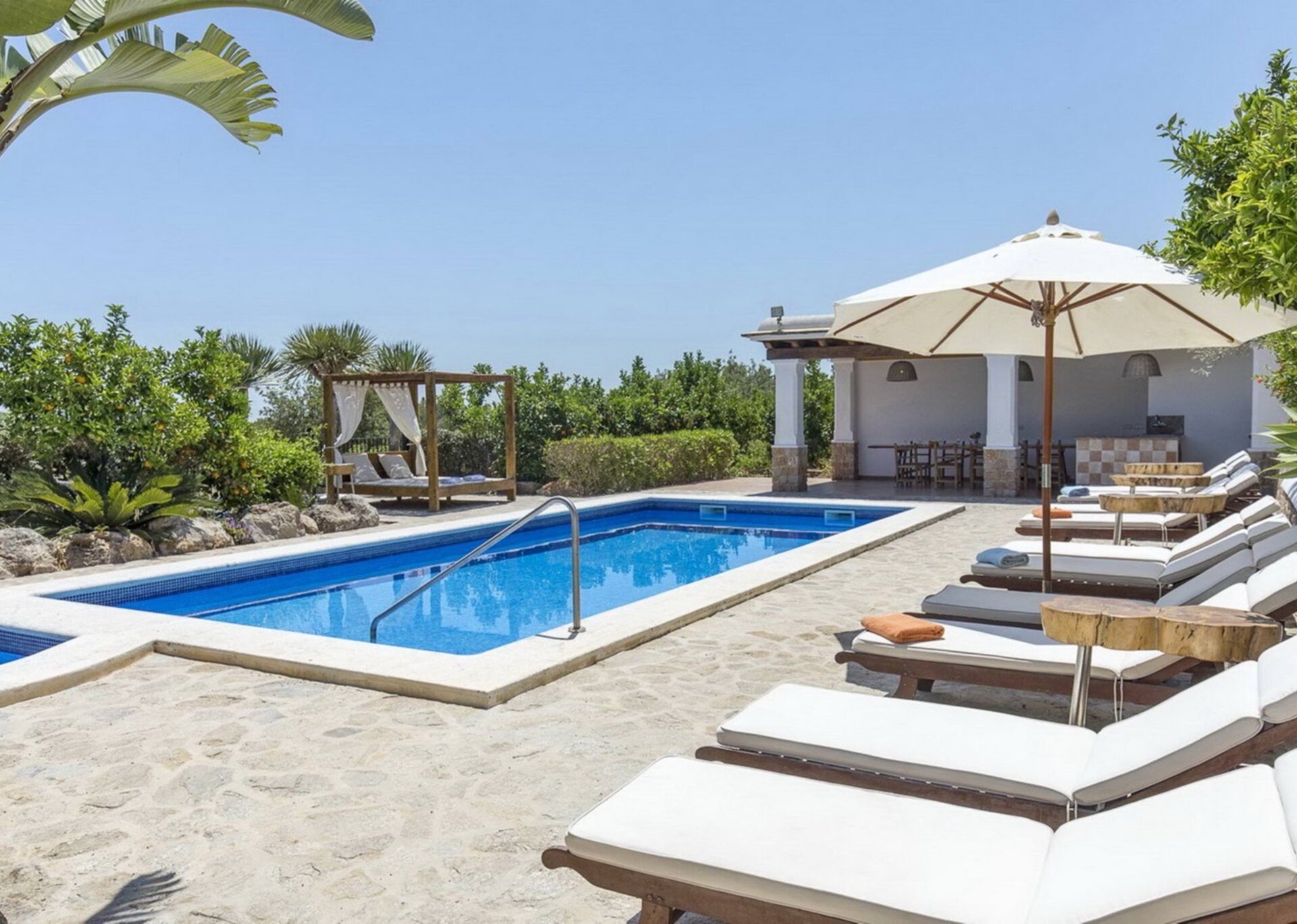 This superbly renovated finca property is situated on an expansive plot of approximately 10,000m2, adorned with about 100 orange trees. Every aspect has been meticulously designed with utmost attention to detail. The ambiance and interior of the finca exude an authentic Ibizan country hotel style. The original Sabina woodwork and finely crafted ironwork were meticulously created by the owner's family in Ibiza. Within this spacious 450m2 finca, you will relish in the unspoiled natural beauty and generous allure of Ibiza. A harmonious blend of natural stone, olive, Sabina wood, and authentic Ibicencan style envelops the property. By night, the driveway, garden, and pool illuminate beautifully, creating an enchanting atmosphere.