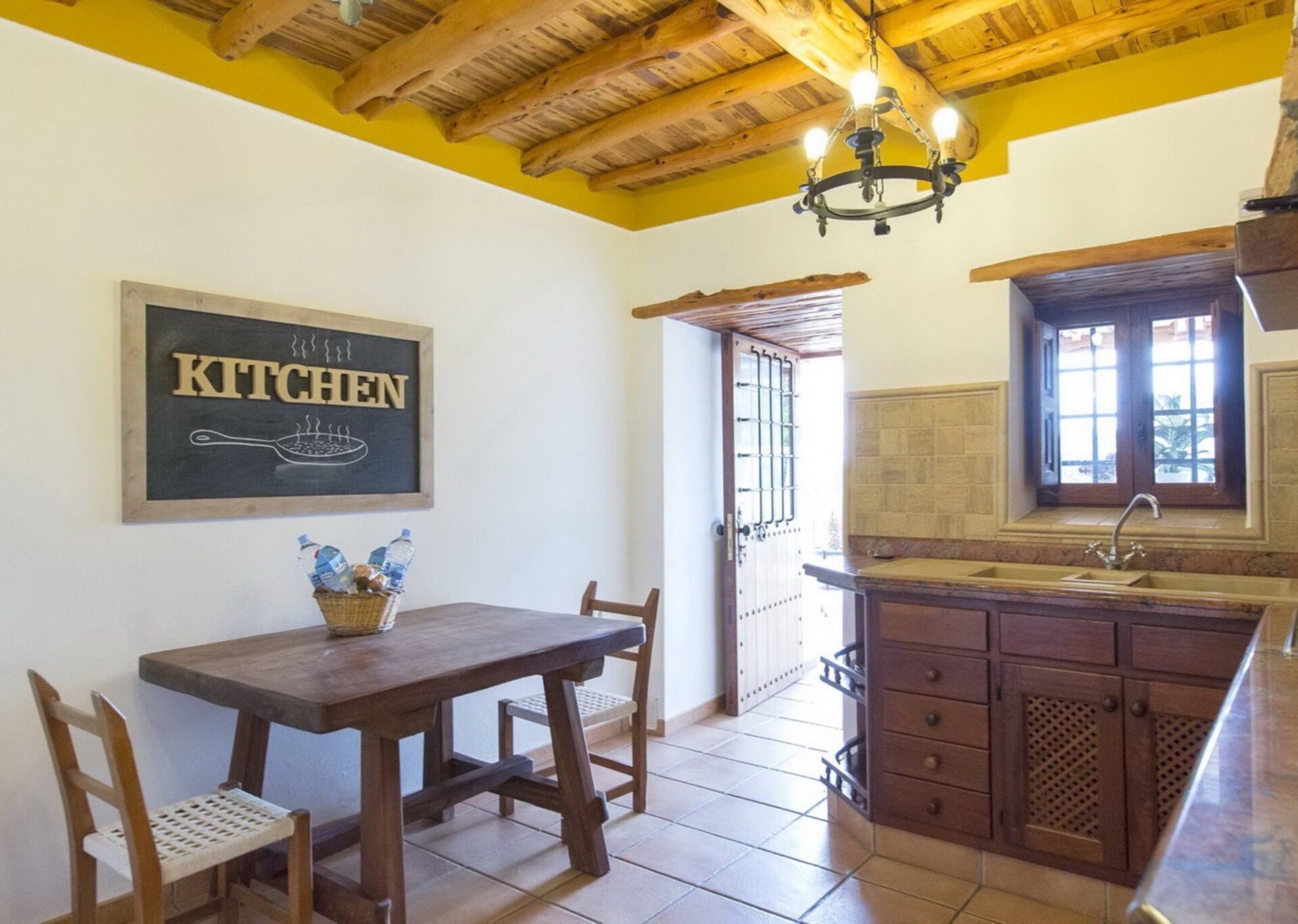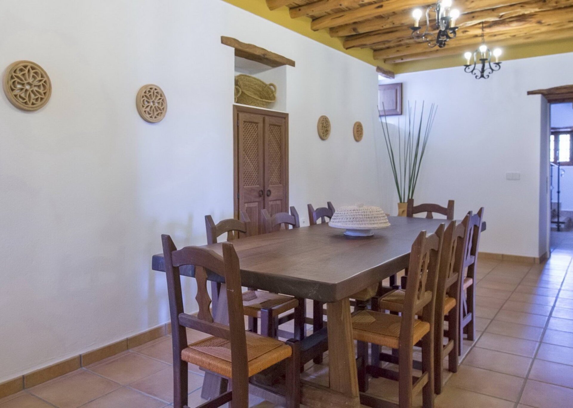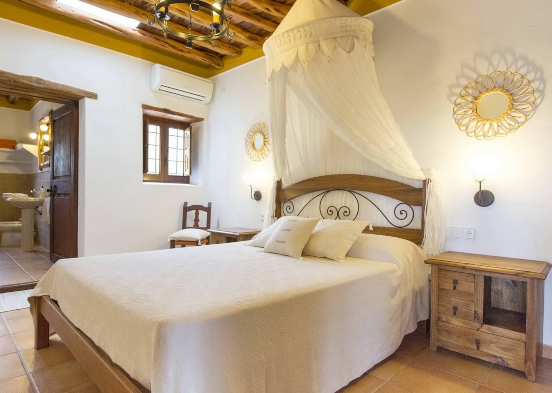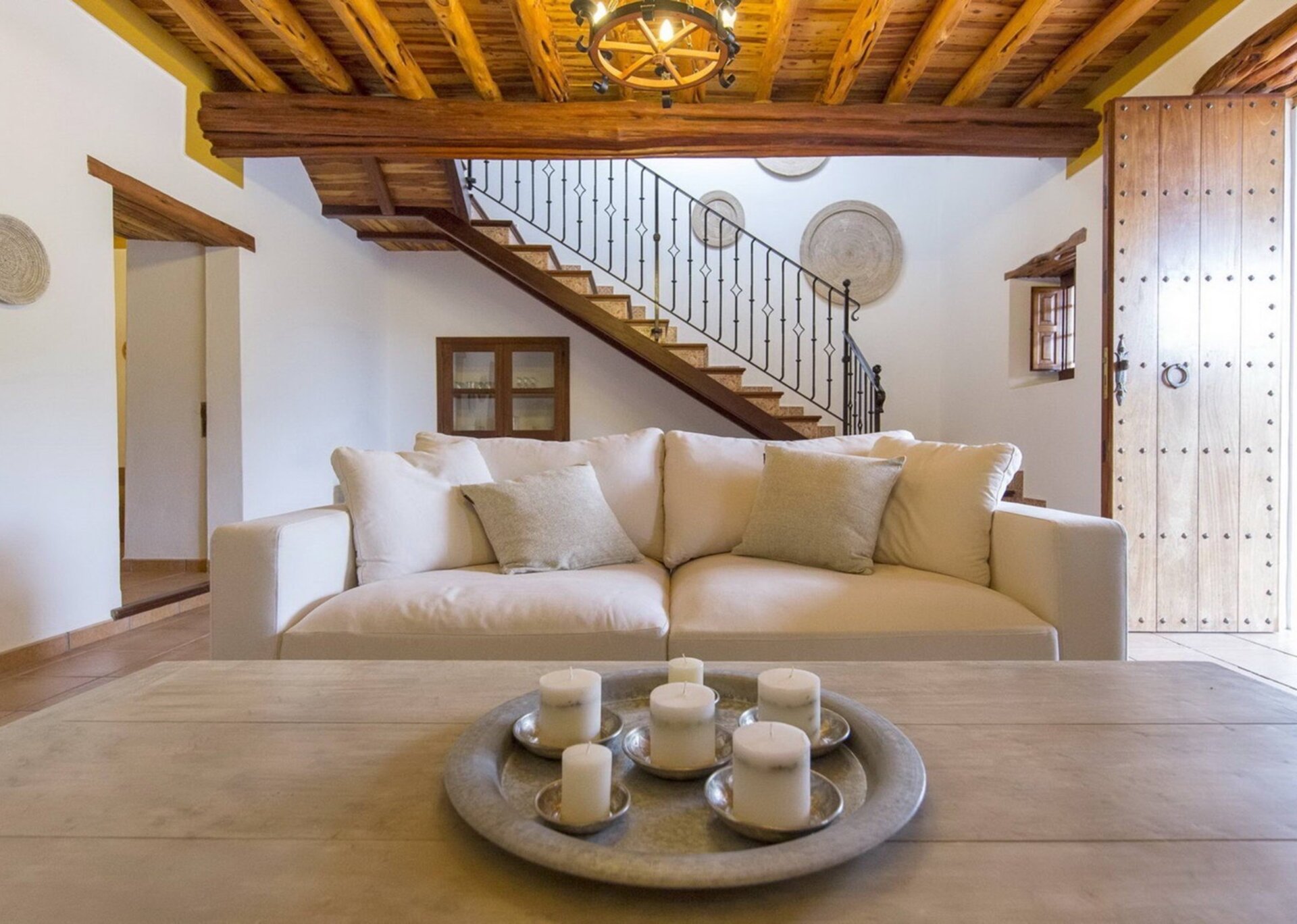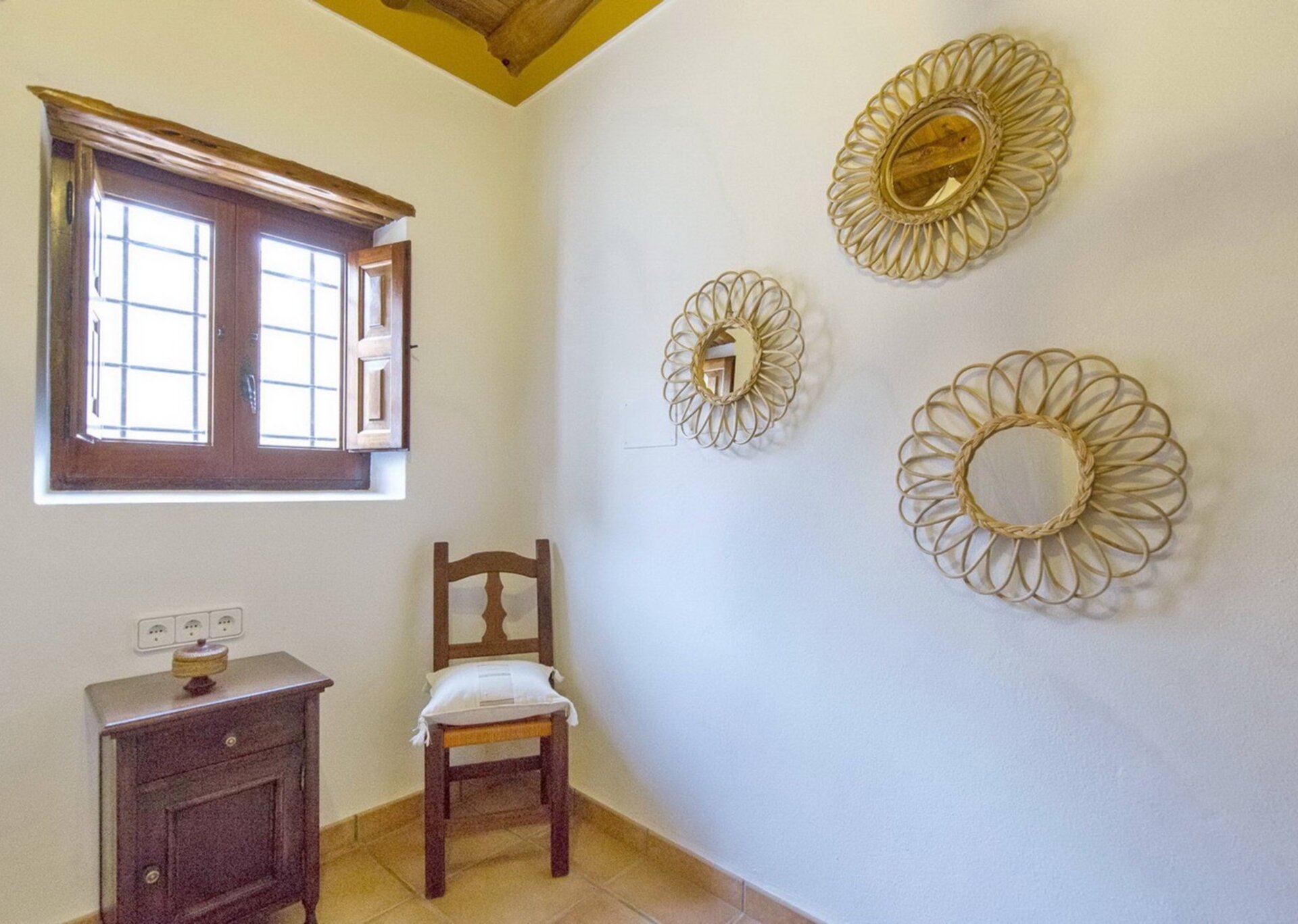 This superbly renovated finca property is situated on an expansive plot of approximately 10,000m2, adorned with about 100 orange trees. Every aspect has been meticulously designed with utmost attention to detail. The ambiance and interior of the finca exude an authentic Ibizan country hotel style. The original Sabina woodwork and finely crafted ironwork were meticulously created by the owner's family in Ibiza. Within this spacious 450m2 finca, you will relish in the unspoiled natural beauty and generous allure of Ibiza. A harmonious blend of natural stone, olive, Sabina wood, and authentic Ibicencan style envelops the property. By night, the driveway, garden, and pool illuminate beautifully, creating an enchanting atmosphere.