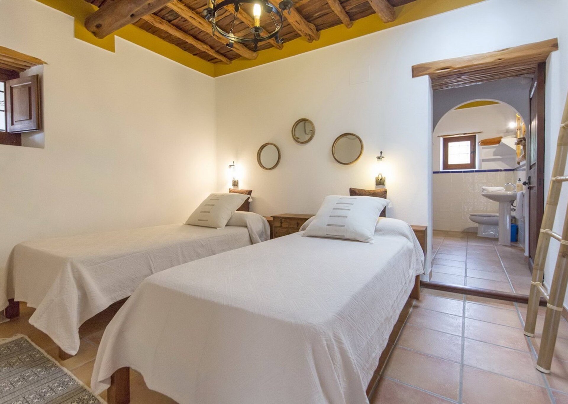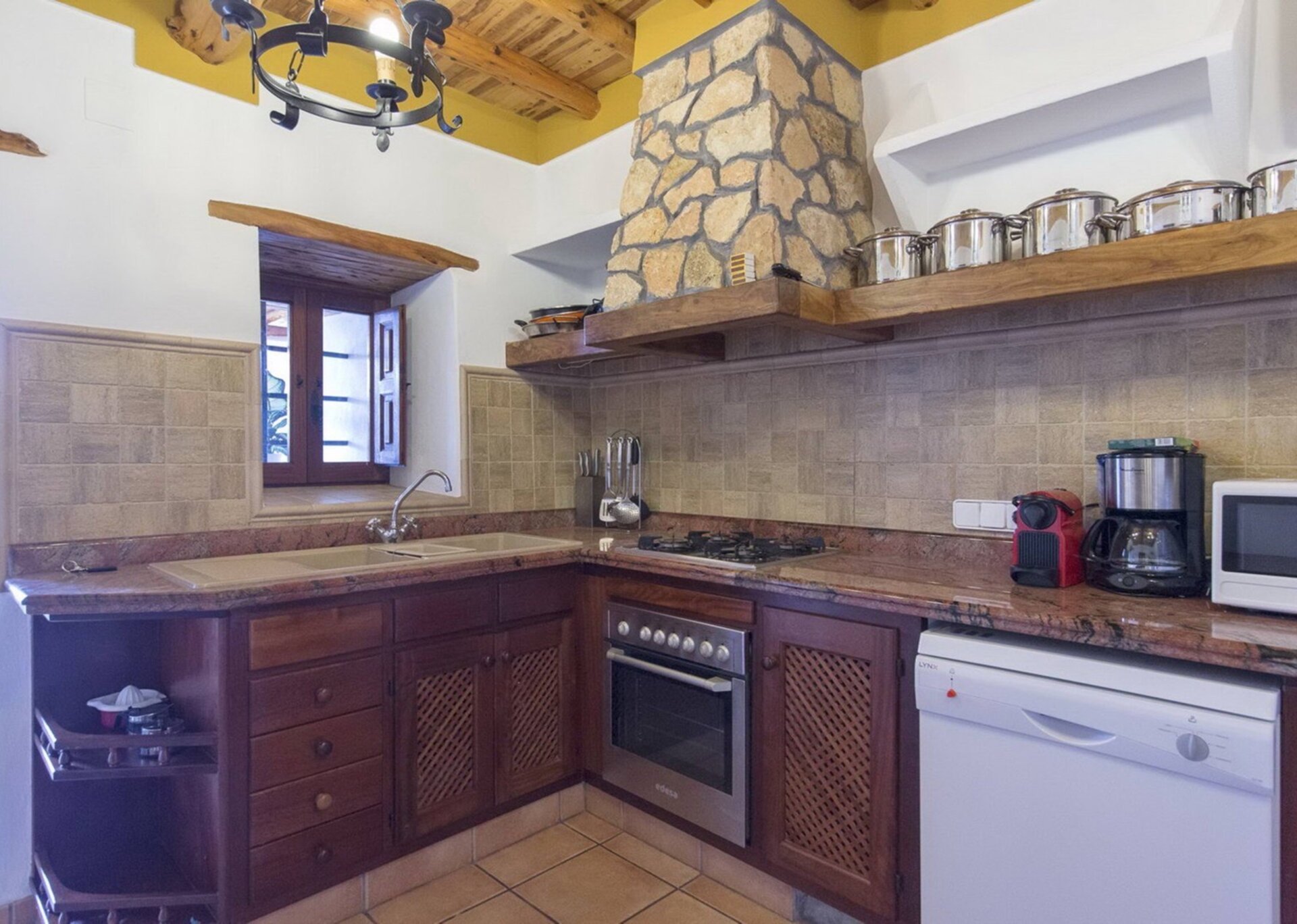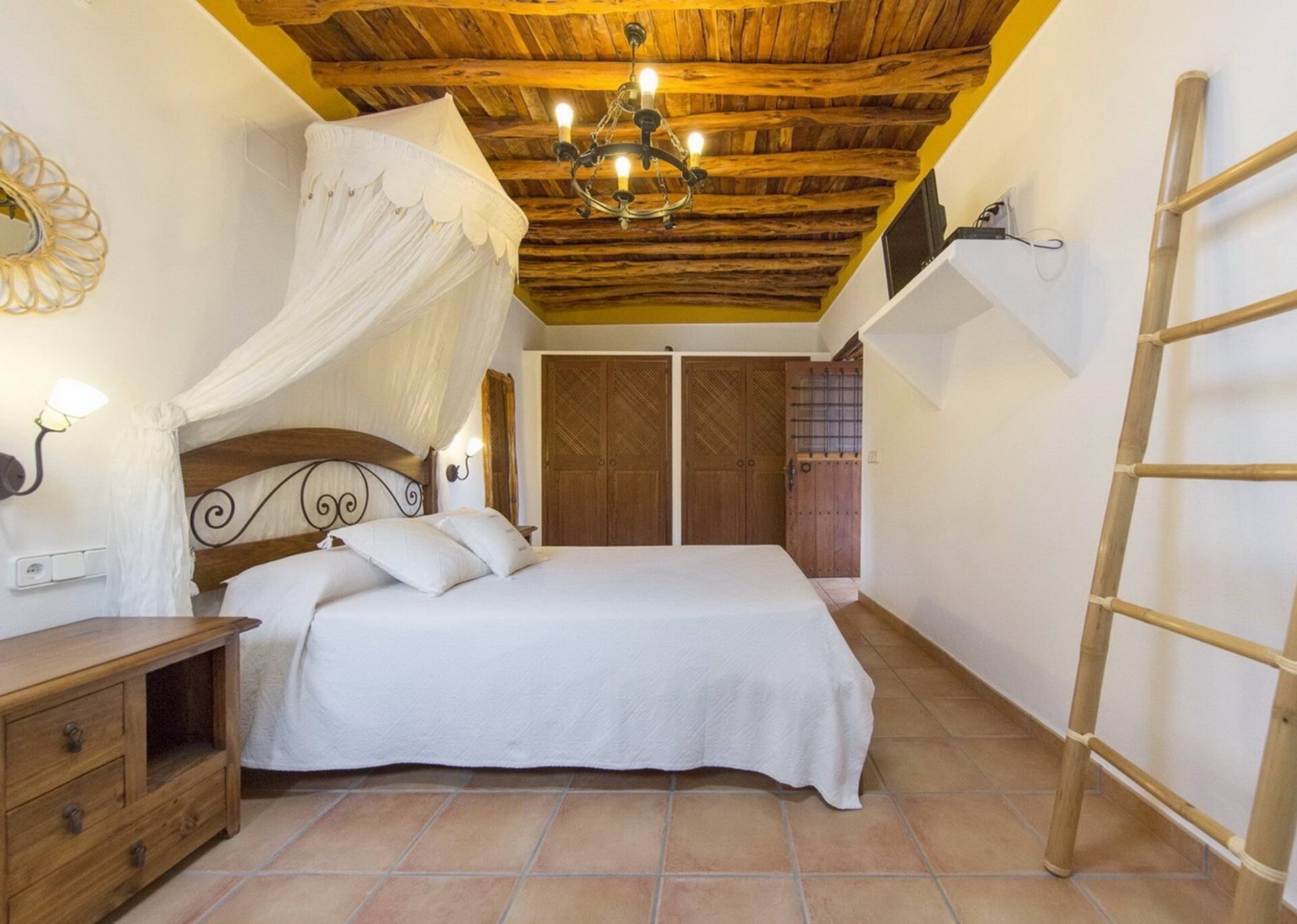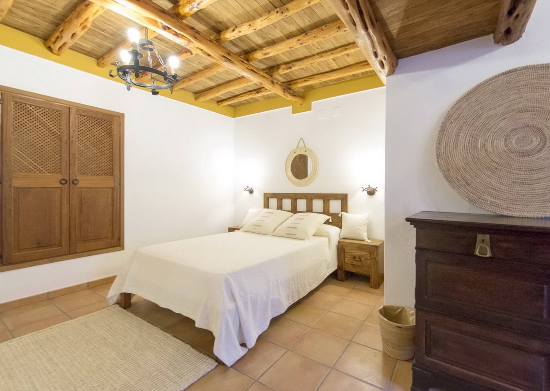 The finca is built across two levels, with two separate living areas. The primary wing of the finca features a master bedroom with a double bed (1.50m x 2.00m), a bedroom with a double bed (1.35m x 2.00m), a bedroom with two single beds (0.90m x 2.00m), a spacious living room, a large dining room, and a well-appointed kitchen. In the side wing, you'll find another bedroom with a double bed (1 x 1.50m x 2.00m) and a bedroom with two single beds (0.90m x 2.00m). Four out of the five bedrooms are luxuriously equipped with en-suite bathrooms. Additionally, all five bedrooms, the living room, and the sala (a separate lounge area) are equipped with air conditioning (hot/cold) and LCD satellite TVs. The sala boasts an inviting open fireplace, two seating areas, and a high-quality stereo system. Other amenities include a well-furnished living room and a separate utility room with a washing machine and dryer. Despite its peaceful seclusion from the tourist bustle, the finca is only a few minutes away from the vibrant hot spots of Ibiza!