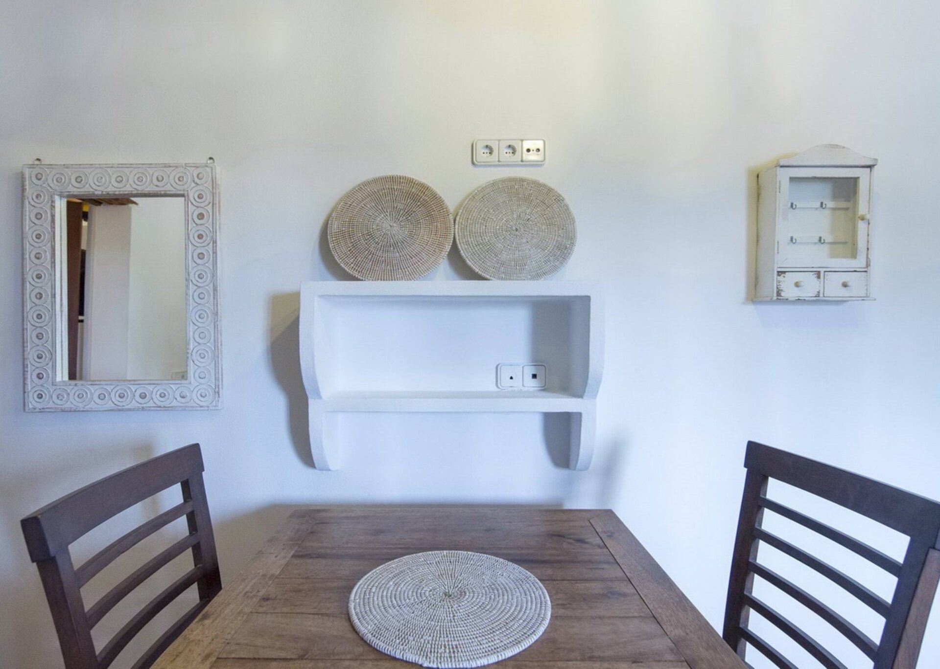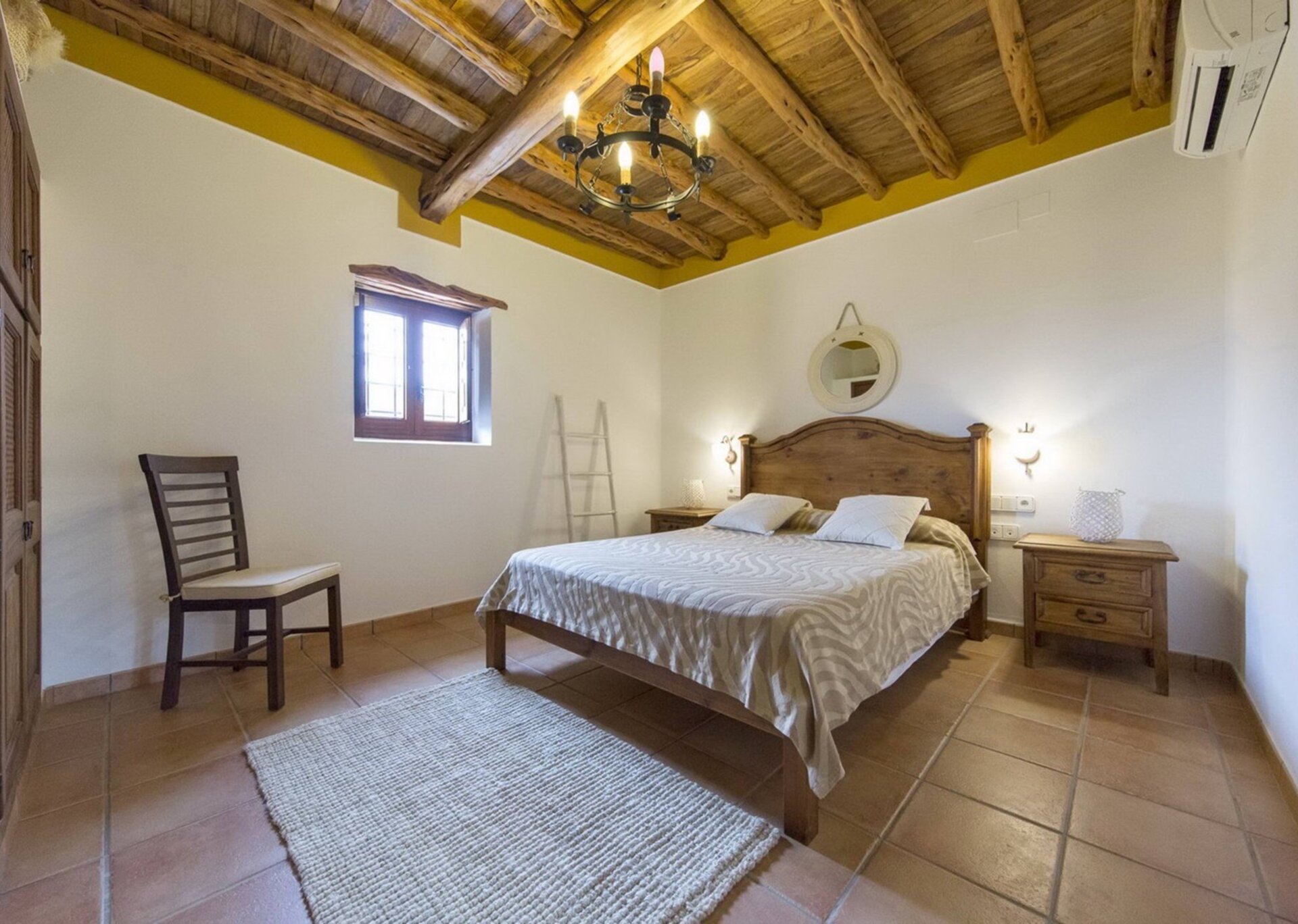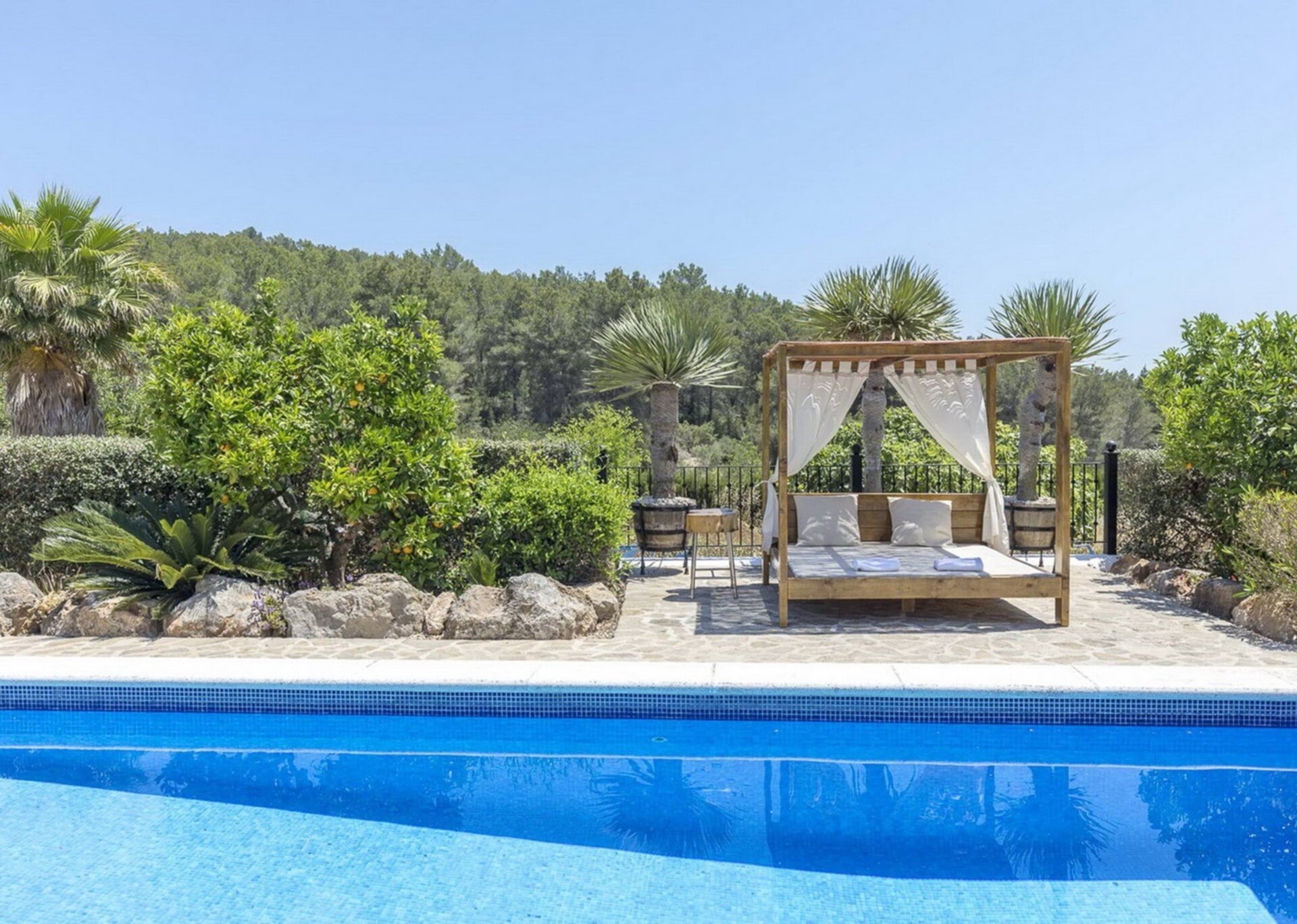 The finca is built across two levels, with two separate living areas. The primary wing of the finca features a master bedroom with a double bed (1.50m x 2.00m), a bedroom with a double bed (1.35m x 2.00m), a bedroom with two single beds (0.90m x 2.00m), a spacious living room, a large dining room, and a well-appointed kitchen. In the side wing, you'll find another bedroom with a double bed (1 x 1.50m x 2.00m) and a bedroom with two single beds (0.90m x 2.00m). Four out of the five bedrooms are luxuriously equipped with en-suite bathrooms. Additionally, all five bedrooms, the living room, and the sala (a separate lounge area) are equipped with air conditioning (hot/cold) and LCD satellite TVs. The sala boasts an inviting open fireplace, two seating areas, and a high-quality stereo system. Other amenities include a well-furnished living room and a separate utility room with a washing machine and dryer. Despite its peaceful seclusion from the tourist bustle, the finca is only a few minutes away from the vibrant hot spots of Ibiza!