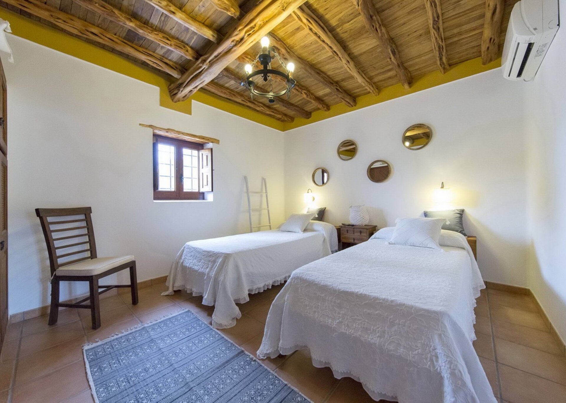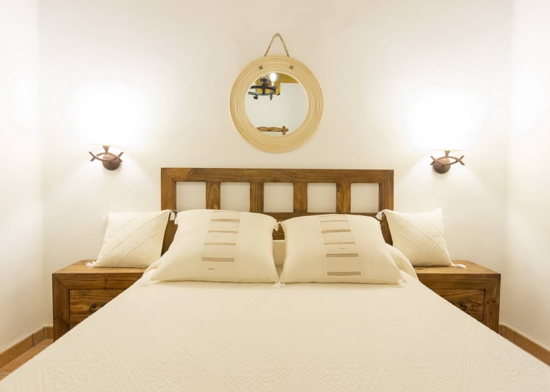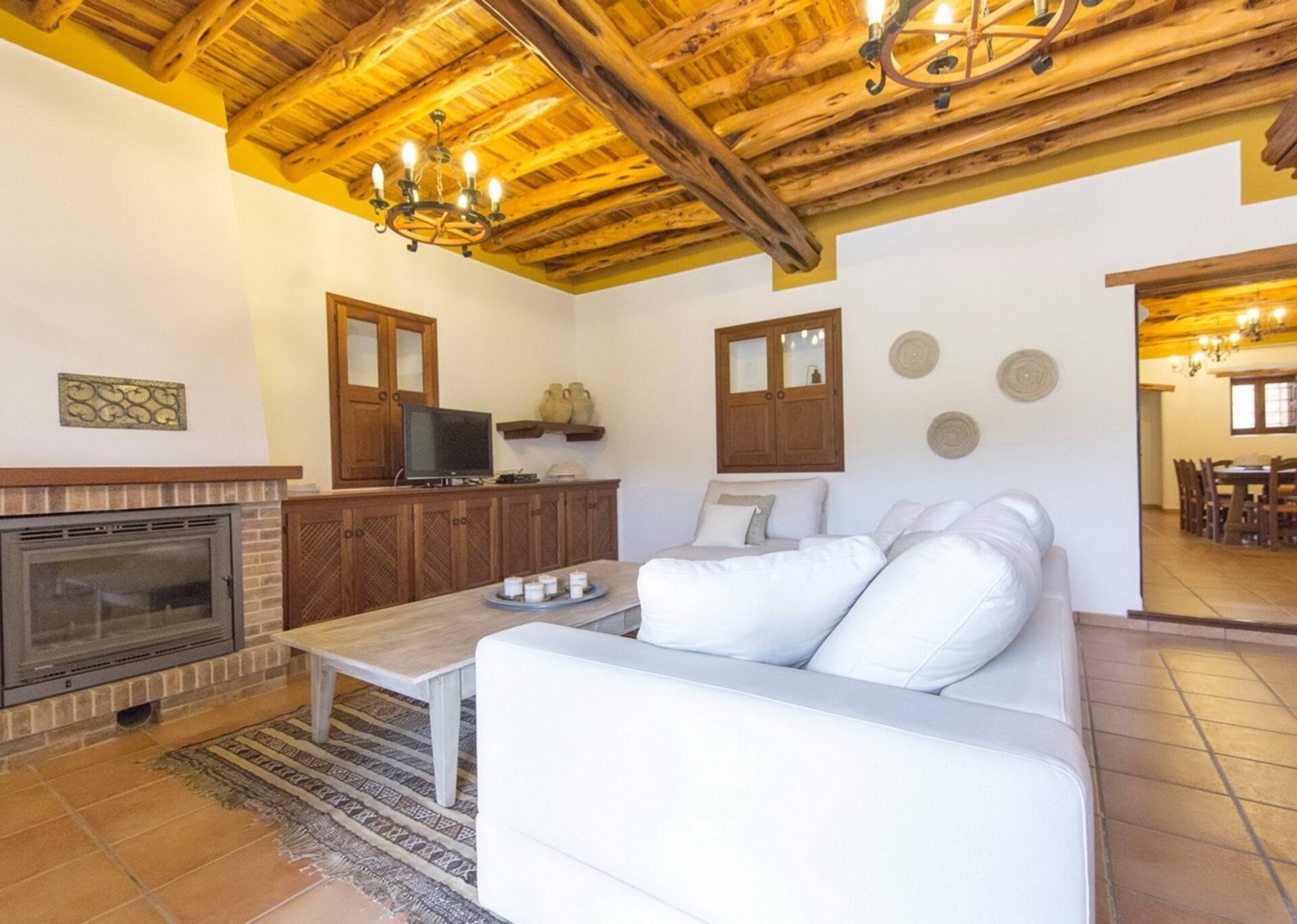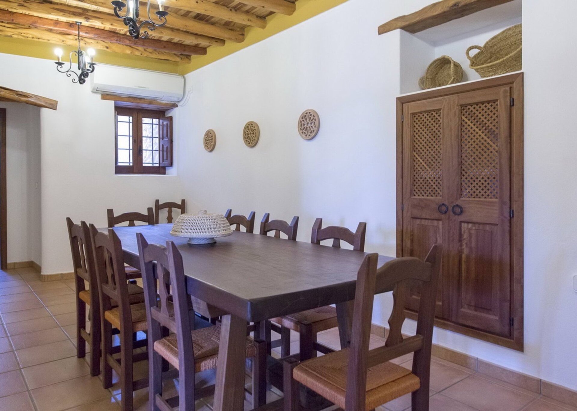 The finca is built across two levels, with two separate living areas. The primary wing of the finca features a master bedroom with a double bed (1.50m x 2.00m), a bedroom with a double bed (1.35m x 2.00m), a bedroom with two single beds (0.90m x 2.00m), a spacious living room, a large dining room, and a well-appointed kitchen. In the side wing, you'll find another bedroom with a double bed (1 x 1.50m x 2.00m) and a bedroom with two single beds (0.90m x 2.00m). Four out of the five bedrooms are luxuriously equipped with en-suite bathrooms. Additionally, all five bedrooms, the living room, and the sala (a separate lounge area) are equipped with air conditioning (hot/cold) and LCD satellite TVs. The sala boasts an inviting open fireplace, two seating areas, and a high-quality stereo system. Other amenities include a well-furnished living room and a separate utility room with a washing machine and dryer. Despite its peaceful seclusion from the tourist bustle, the finca is only a few minutes away from the vibrant hot spots of Ibiza!