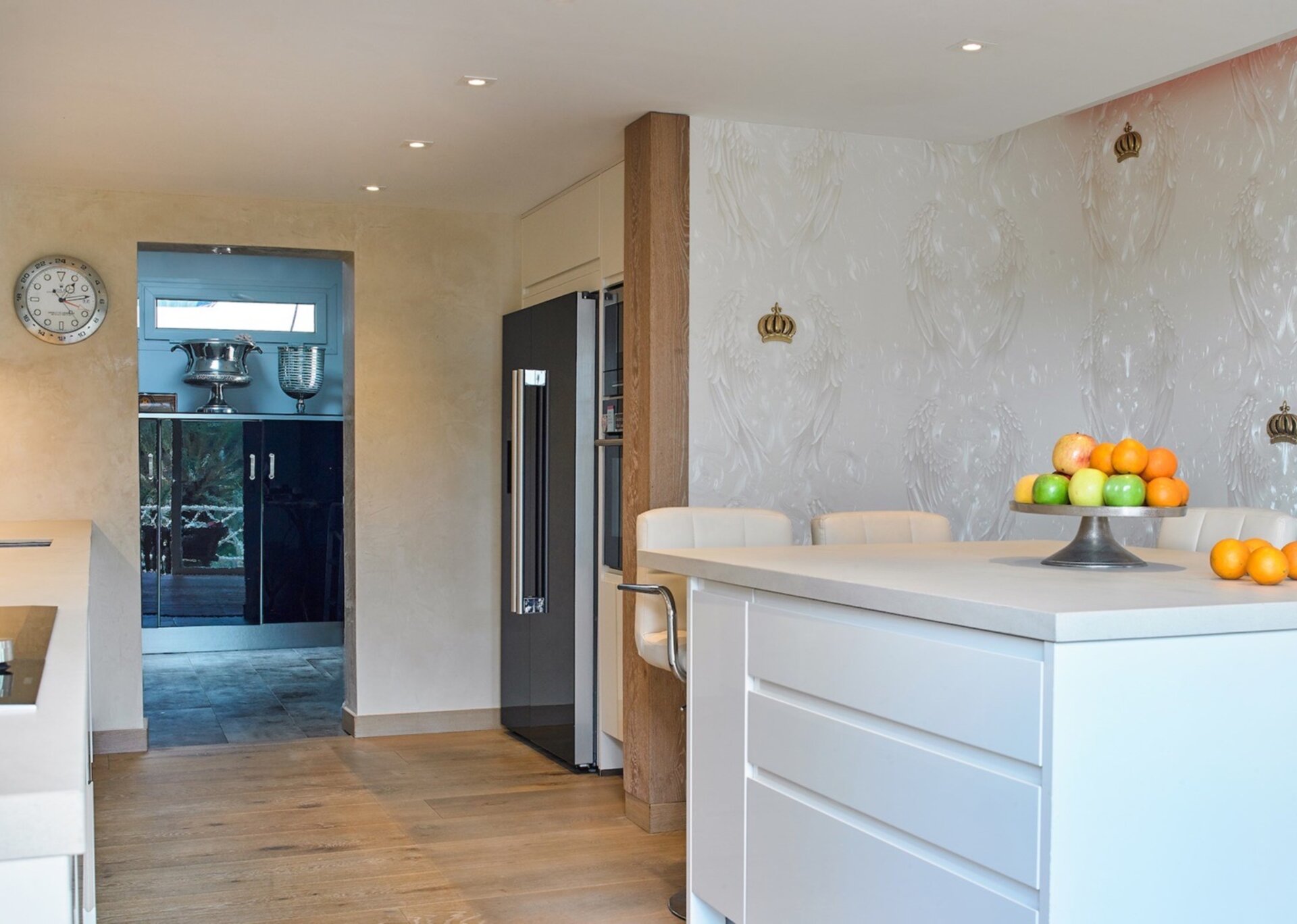 Step inside and be captivated by the bright and airy interiors adorned with vibrant furnishings, exotic artwork, and intricate woodwork. The spacious living room, graced with floor-to-ceiling windows, offers breathtaking views of the countryside. Sink into the divine comfort of the plush sofa as you soak in the beauty that surrounds you. The modern kitchen boasts an array of high-end appliances, complemented by a pantry and a guest WC.