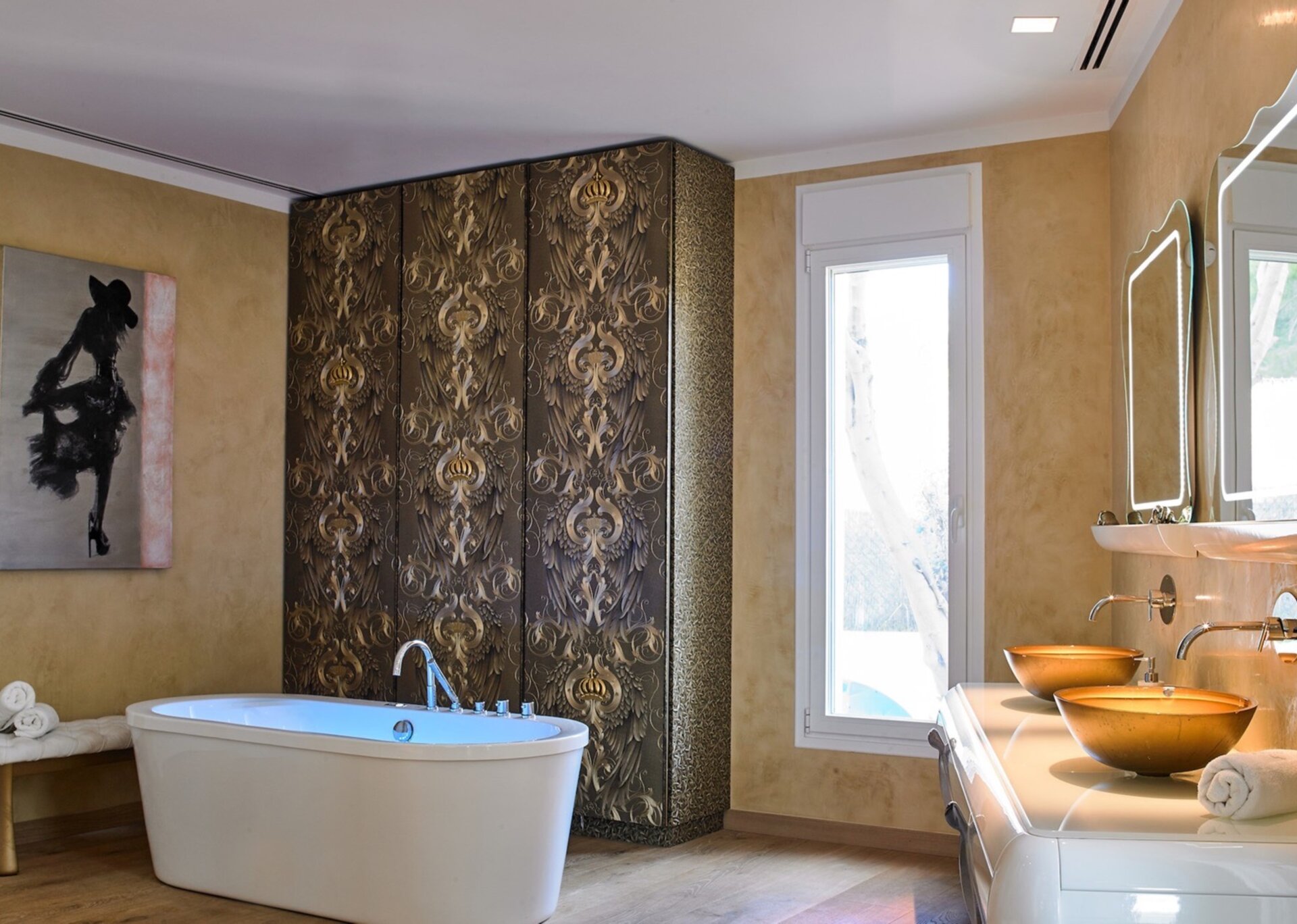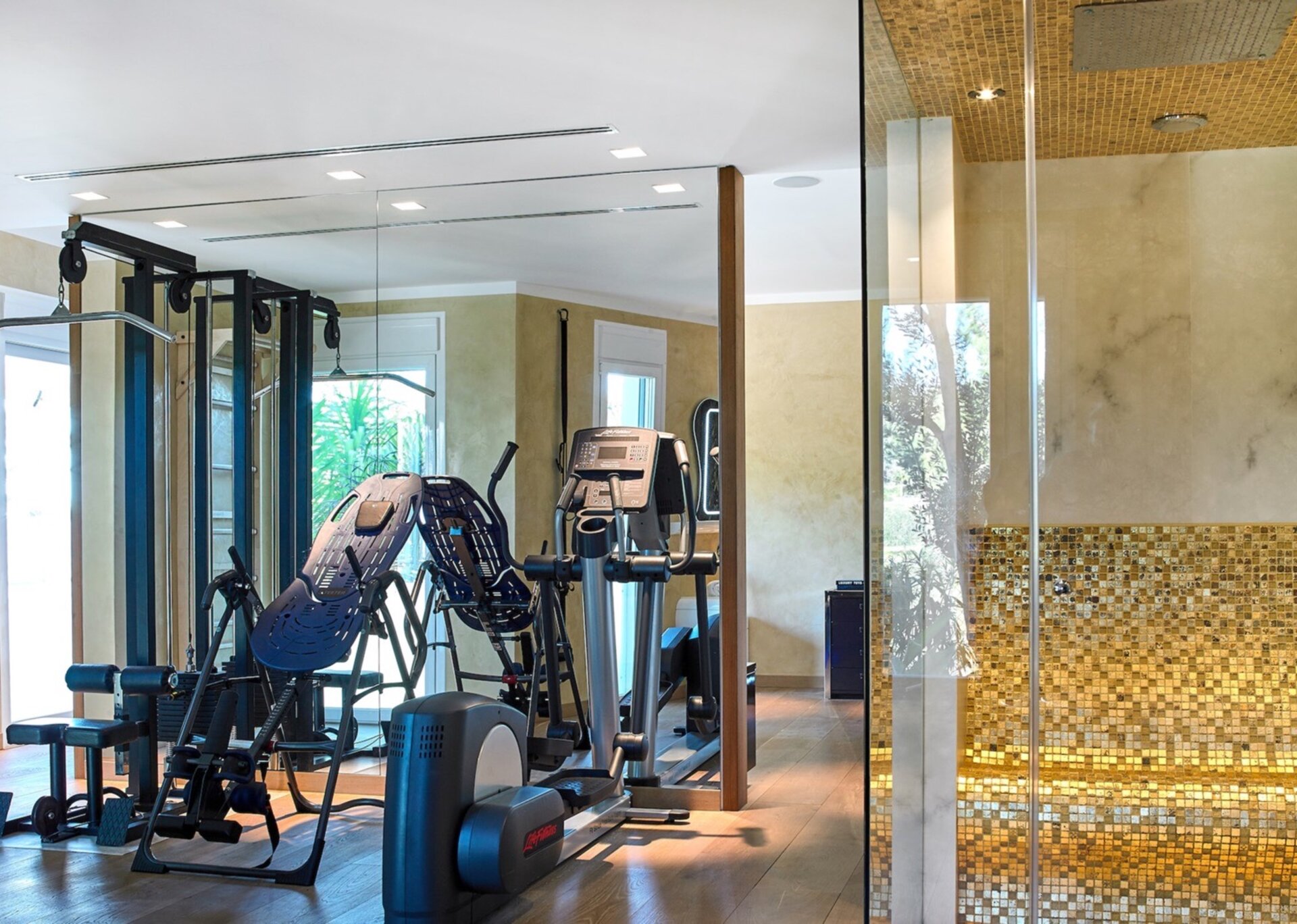 Thoughtfully designed, each bedroom exudes sophistication, creating a seamless fusion of style and grace. The master suite indulges you with a double room, an en-suite bathroom, a Ham-mam cabin, two dressing rooms, and a private gym. Additionally, two bedrooms have private access to the pool area, separate from the main house, both featuring en-suite facilities.