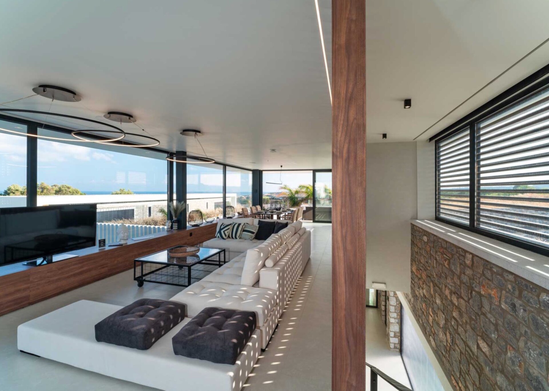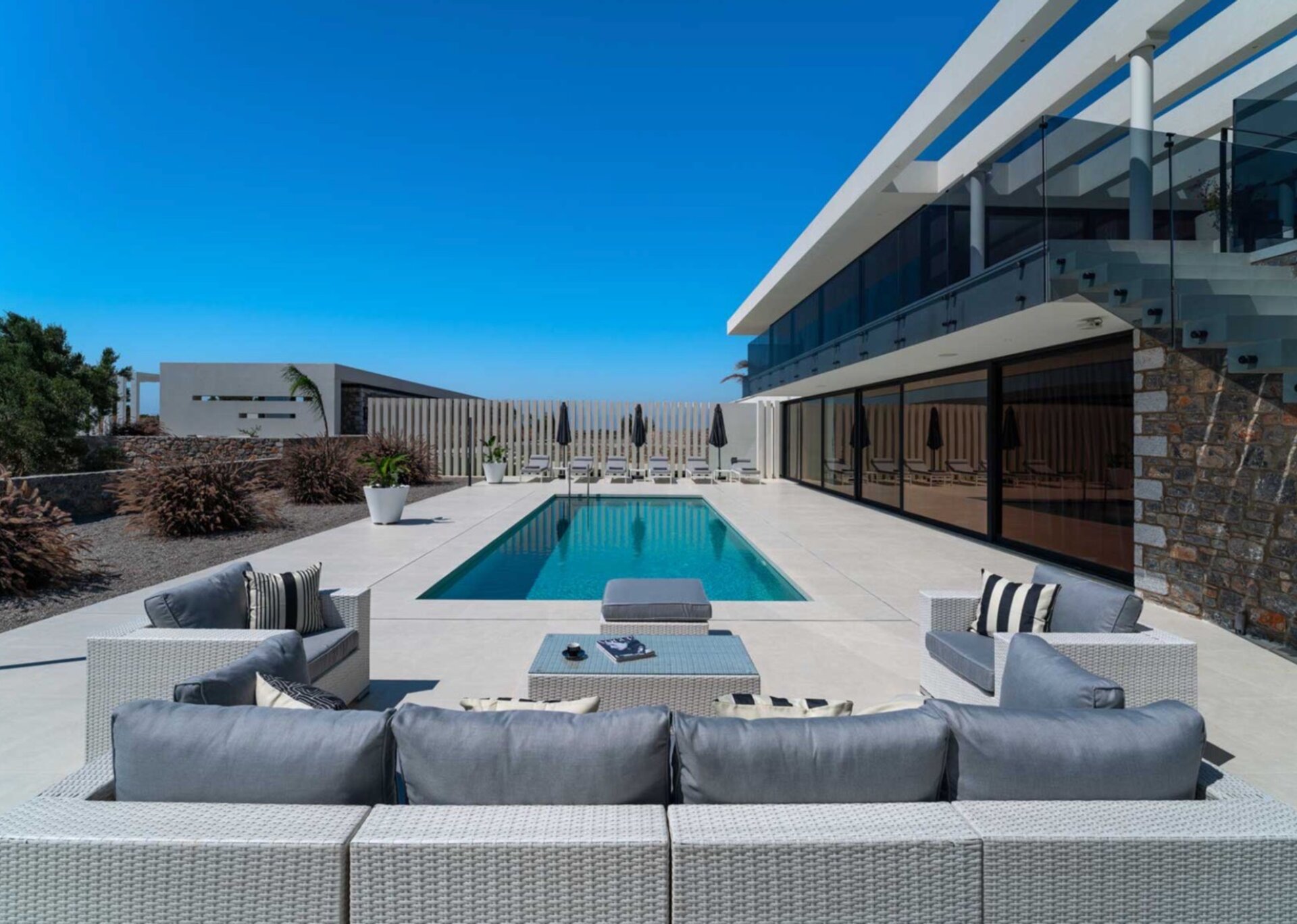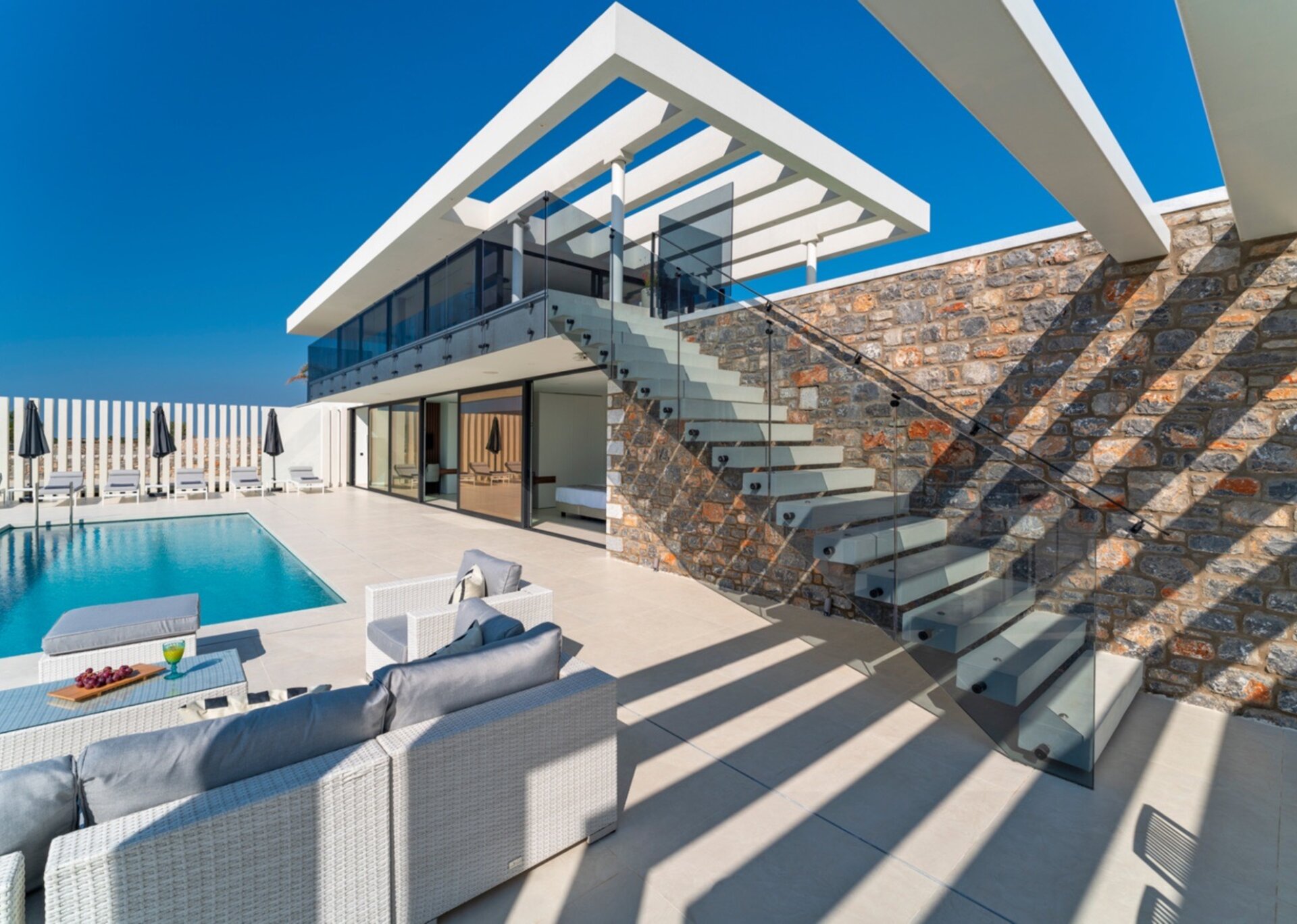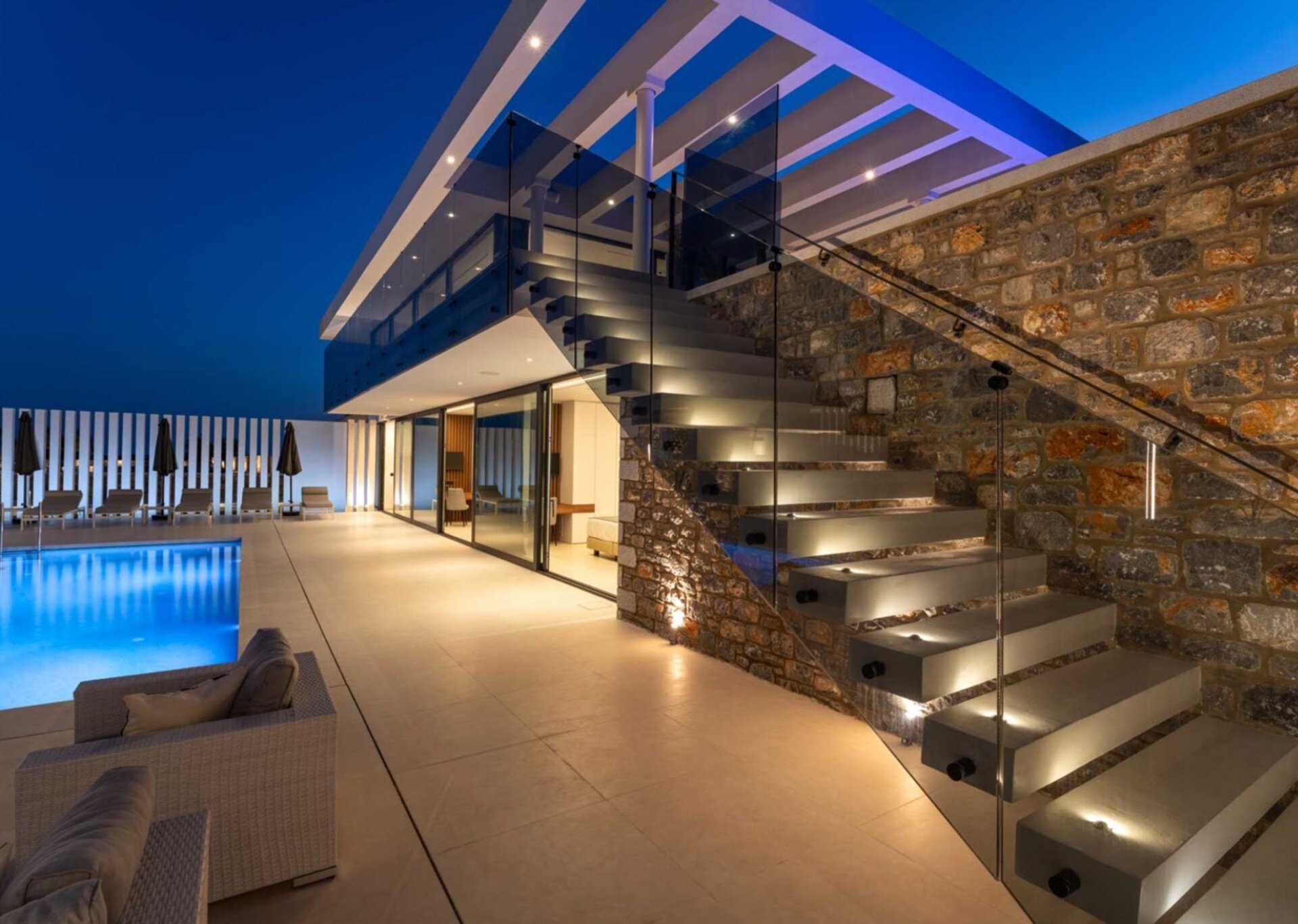 On the ground floor, you'll discover three spacious bedrooms, each adorned with a king-size bed and floor-to-ceiling windows that offer stunning vistas of the sparkling pool and Aegean Sea. The master bedroom boasts a private bathroom with a luxurious walk-in shower, while the two additional bedrooms share a bathroom on the same level.