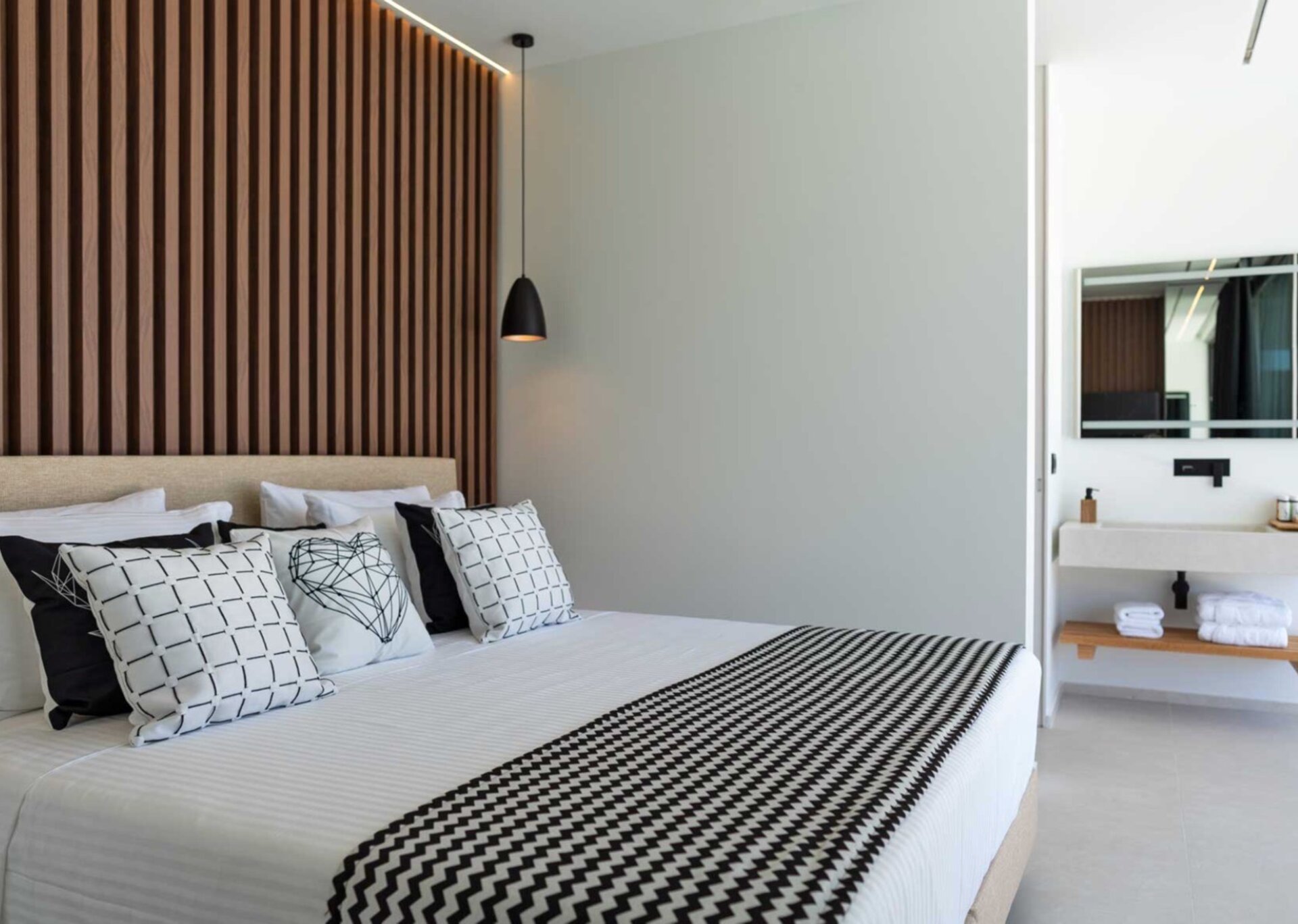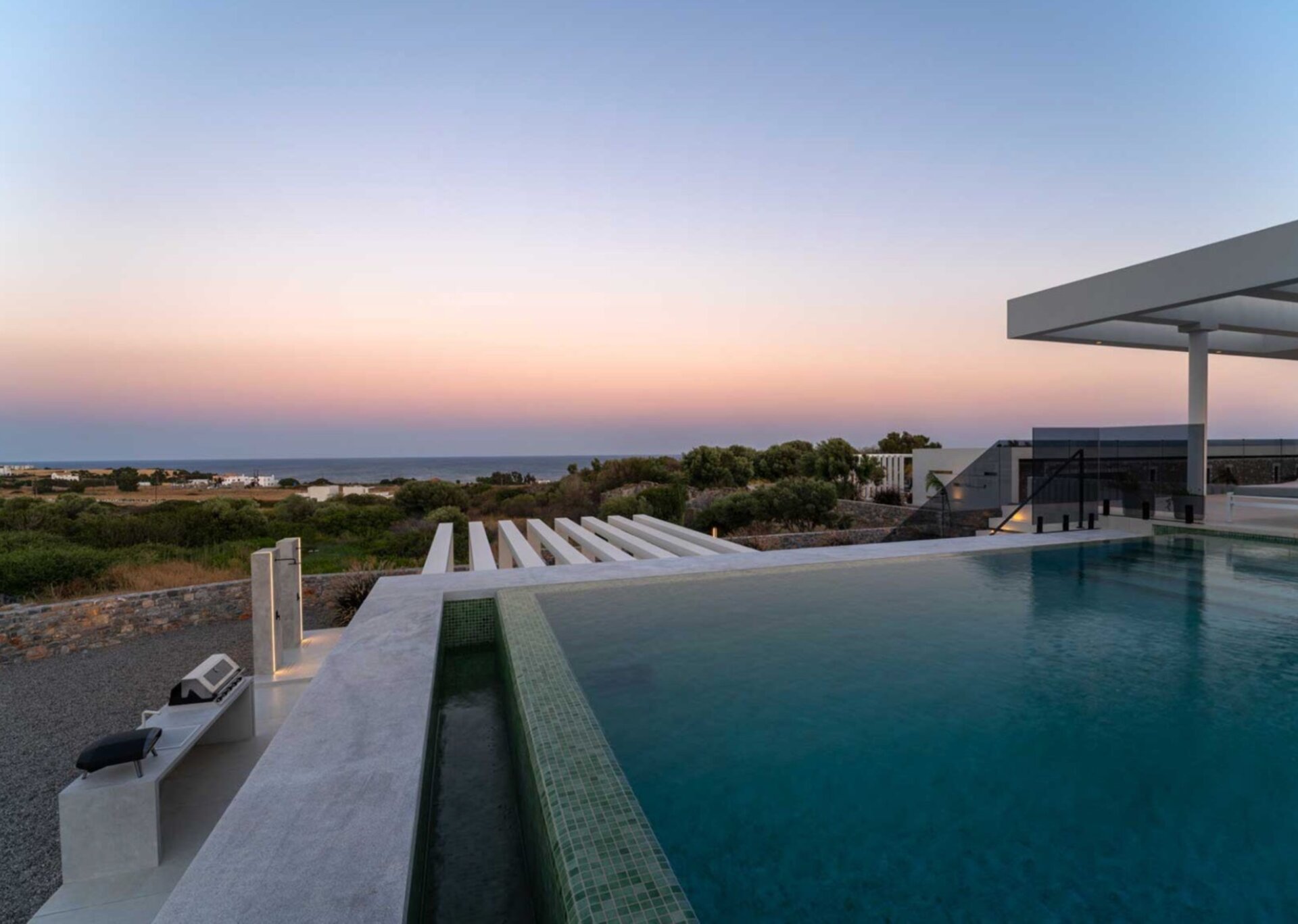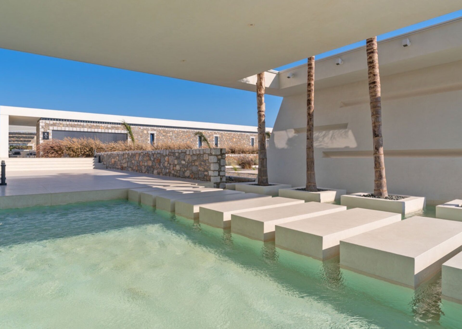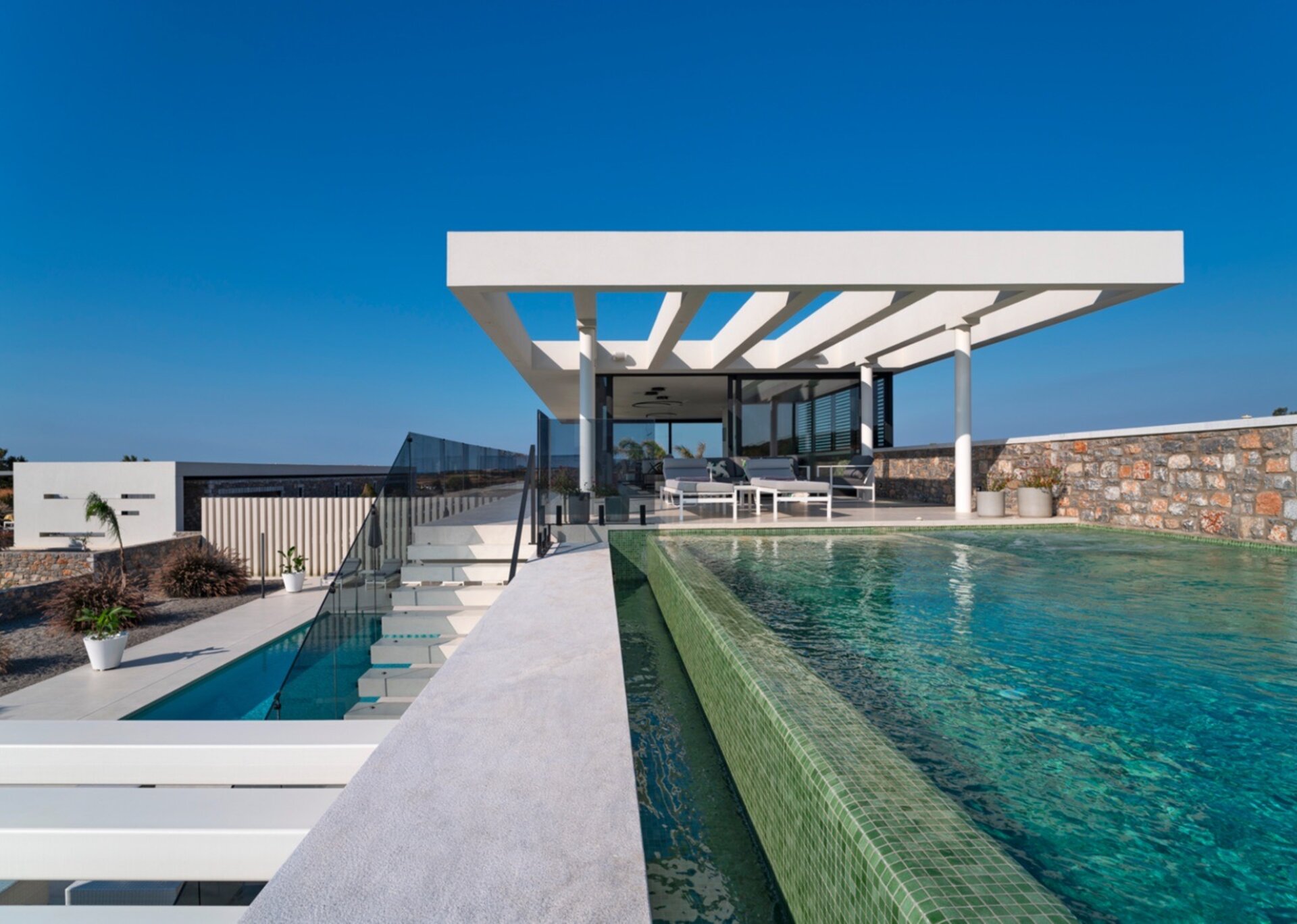 On the ground floor, you'll discover three spacious bedrooms, each adorned with a king-size bed and floor-to-ceiling windows that offer stunning vistas of the sparkling pool and Aegean Sea. The master bedroom boasts a private bathroom with a luxurious walk-in shower, while the two additional bedrooms share a bathroom on the same level.