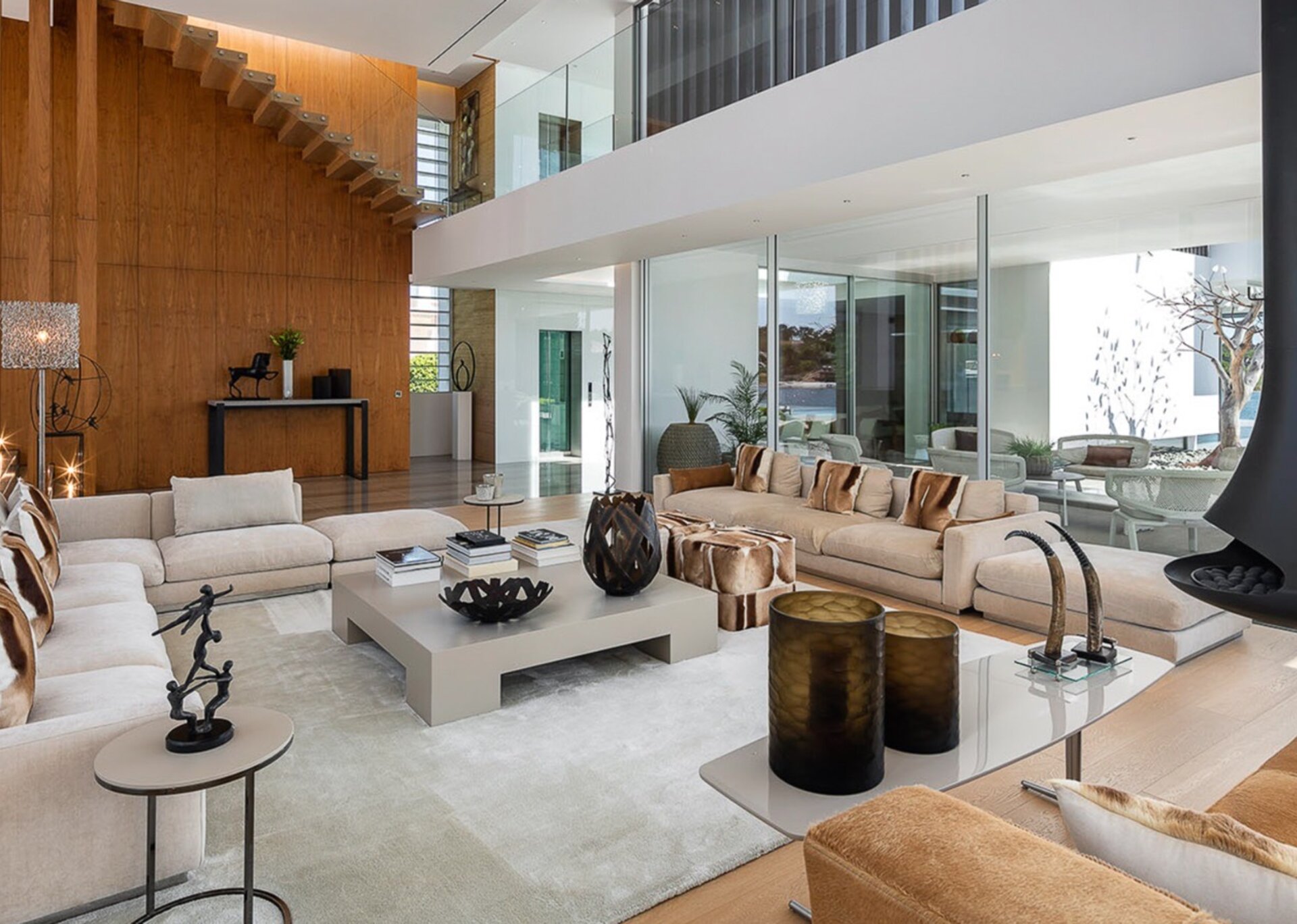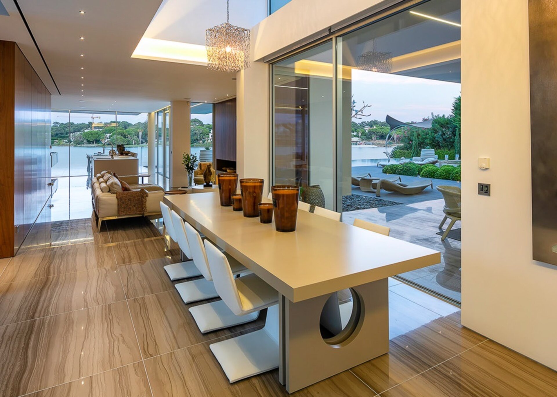 The L-shaped structure of the villa envelops the sunlit terraces and main outdoor pool, making it an architectural marvel. All eyes are immediately drawn to the glistening garden and lake views. From the inside, the towering double-height ceilings and impressive square footage will leave even the tallest person in awe. The abundance of natural light also contributes to the uplifting feel of the interior.