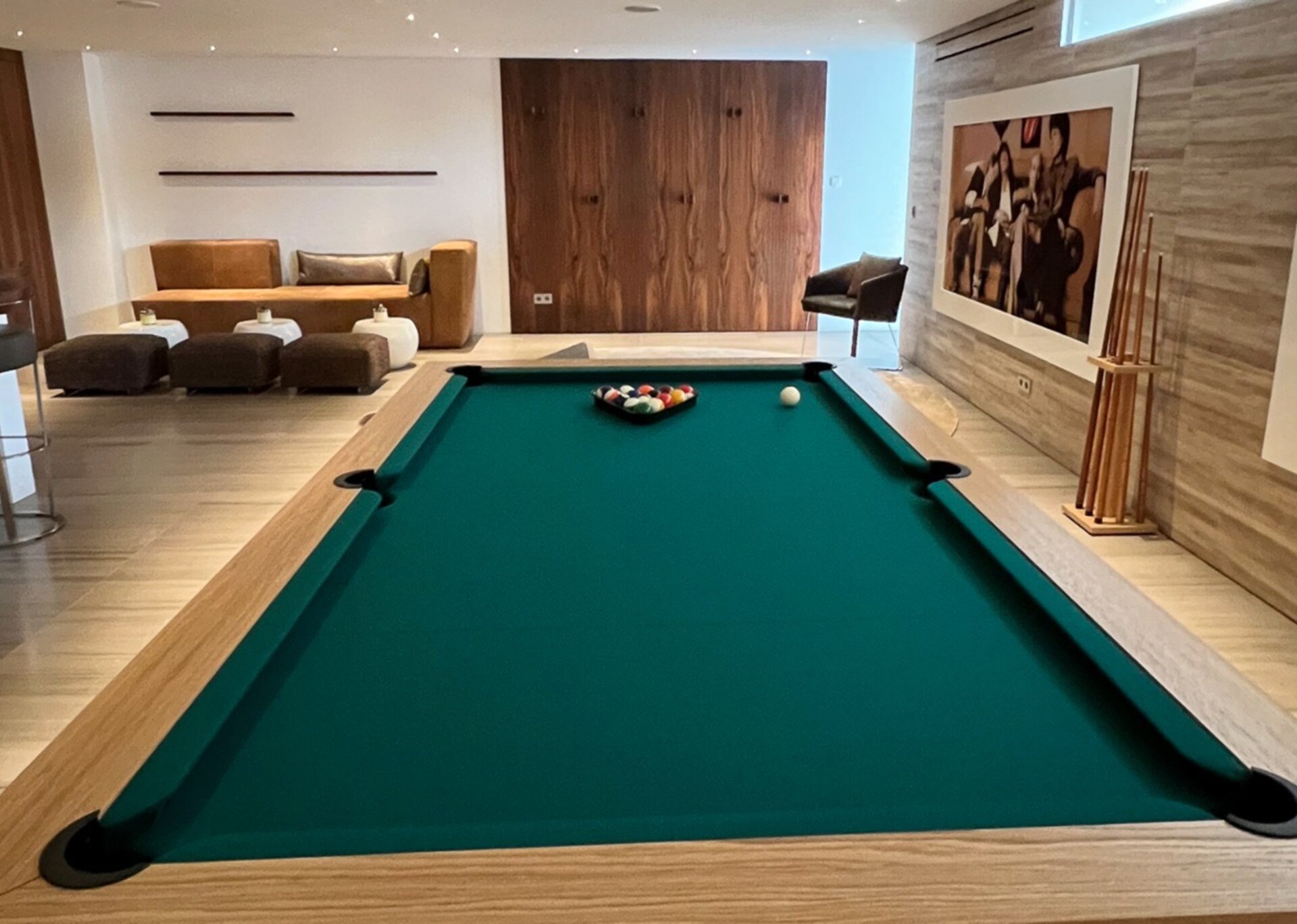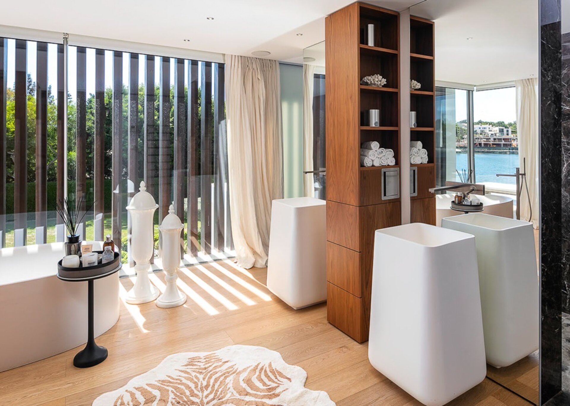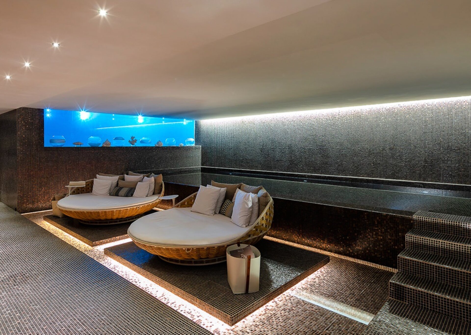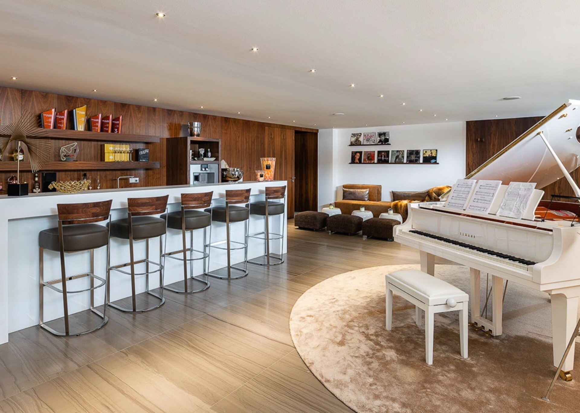 Apart from the main outdoor pool, the rooftop terrace boasts a trendy plunge pool where you can relax in the lounge or hang at the bar, while admiring the breathtaking lake views. But what makes this home an all-season luxury rental option is its indoor pool on the lower level, which features a glass window looking out onto the ground-level pool. Here, you can easily hop between pools, and take a Turkish bath and sauna break. The added bonus is the gym on the upper level with stunning lake views, which makes working out while on holiday an enjoyable treat.