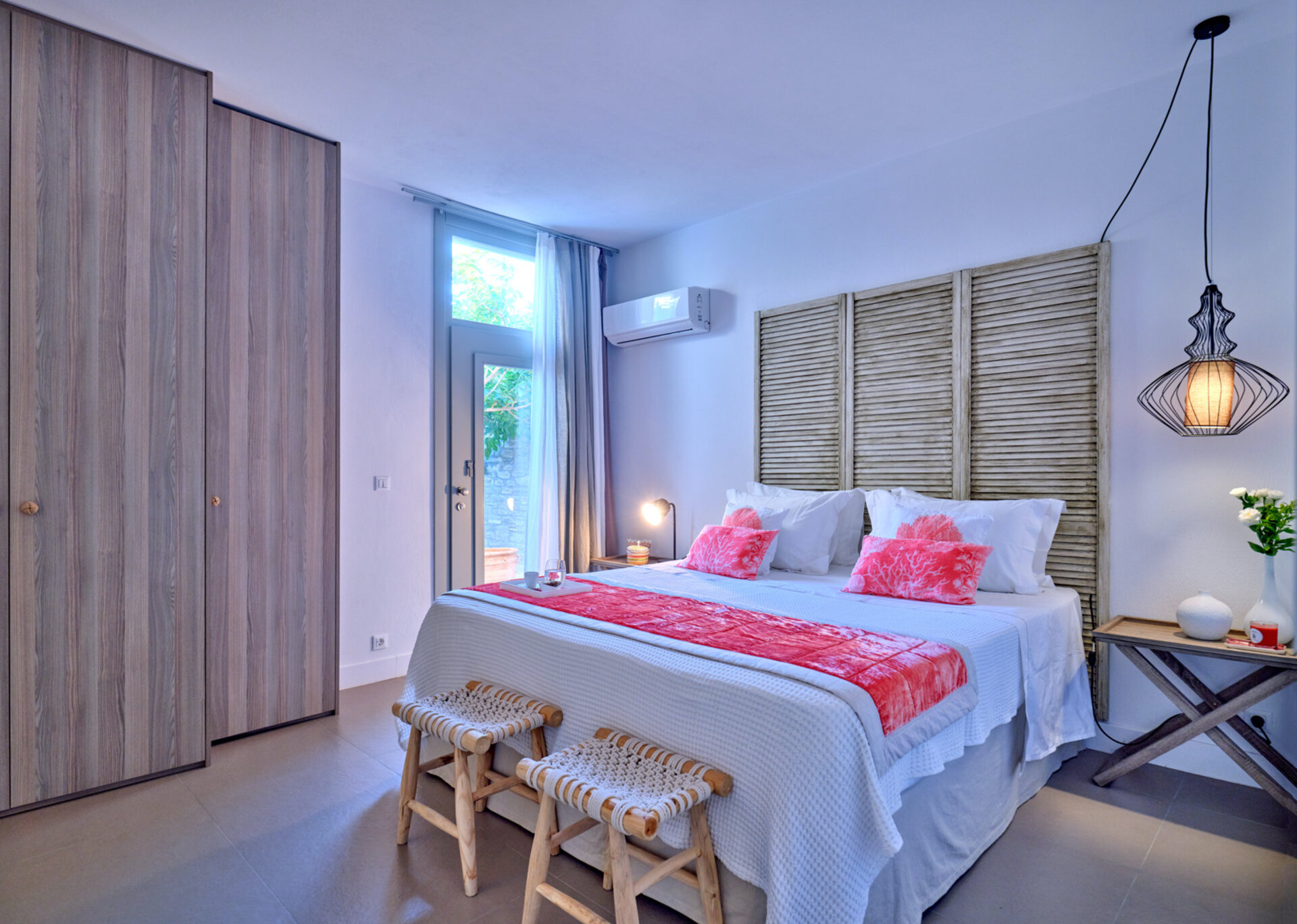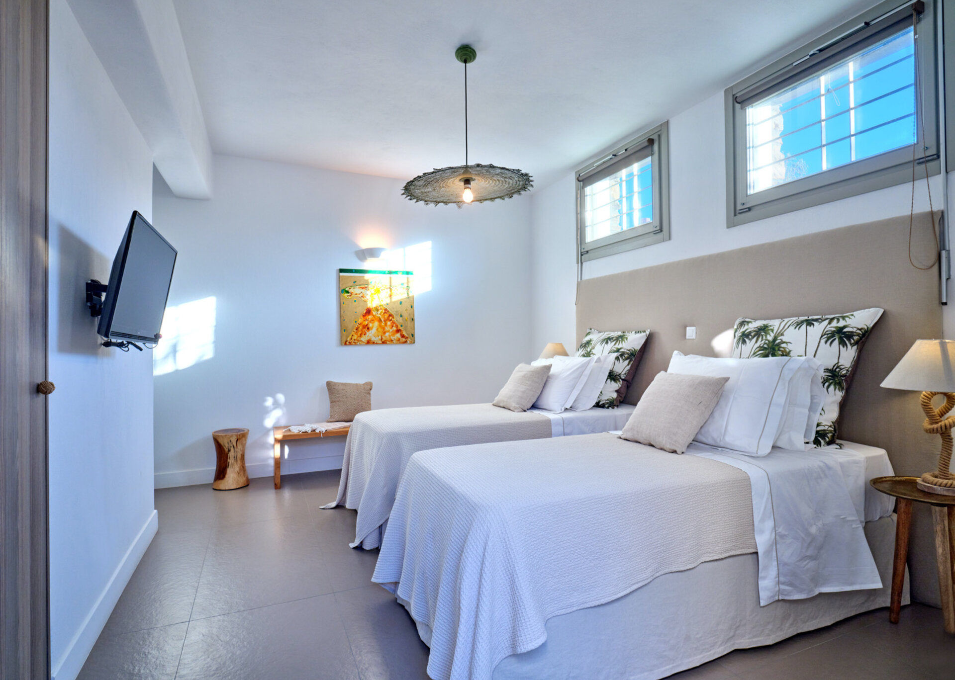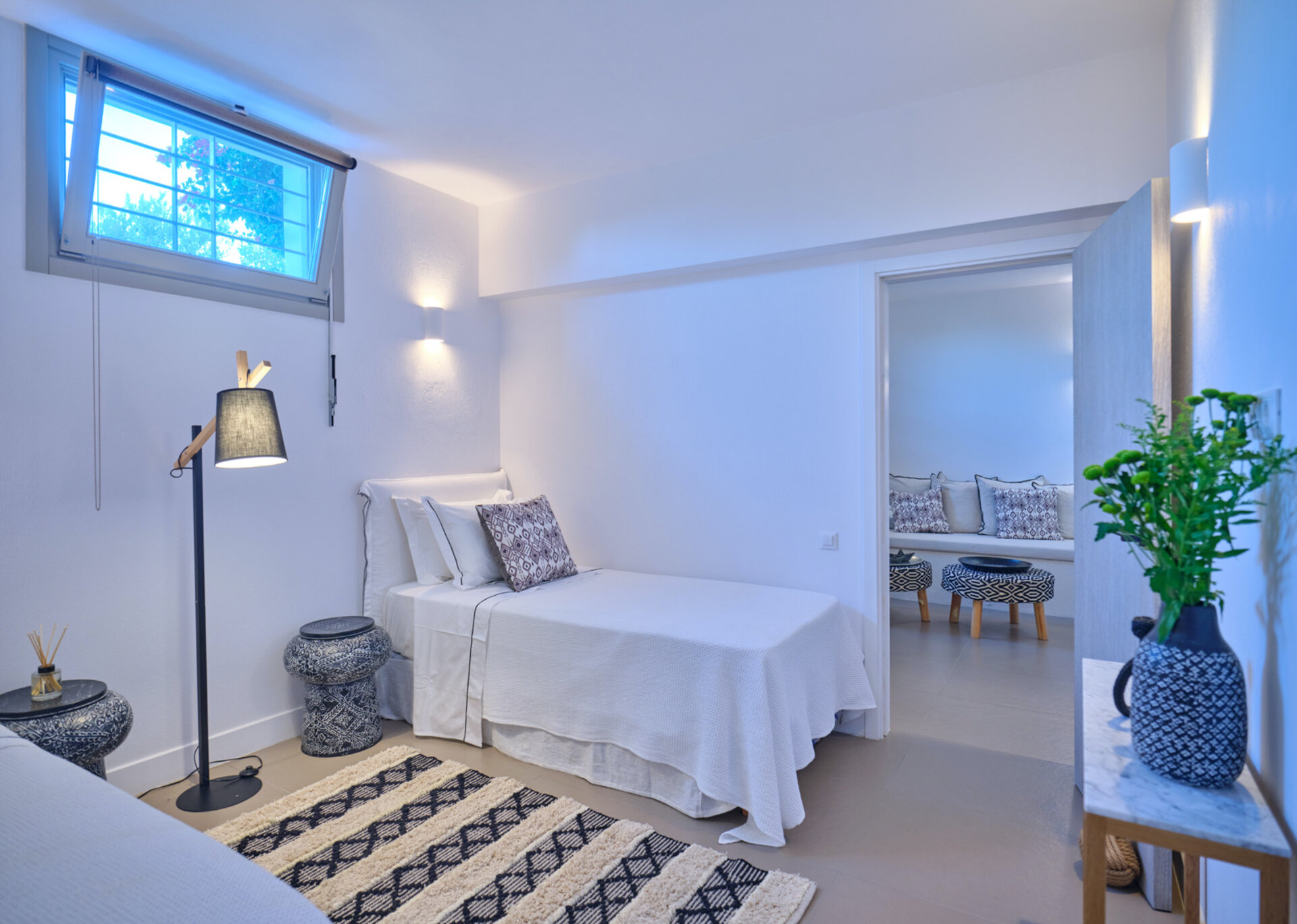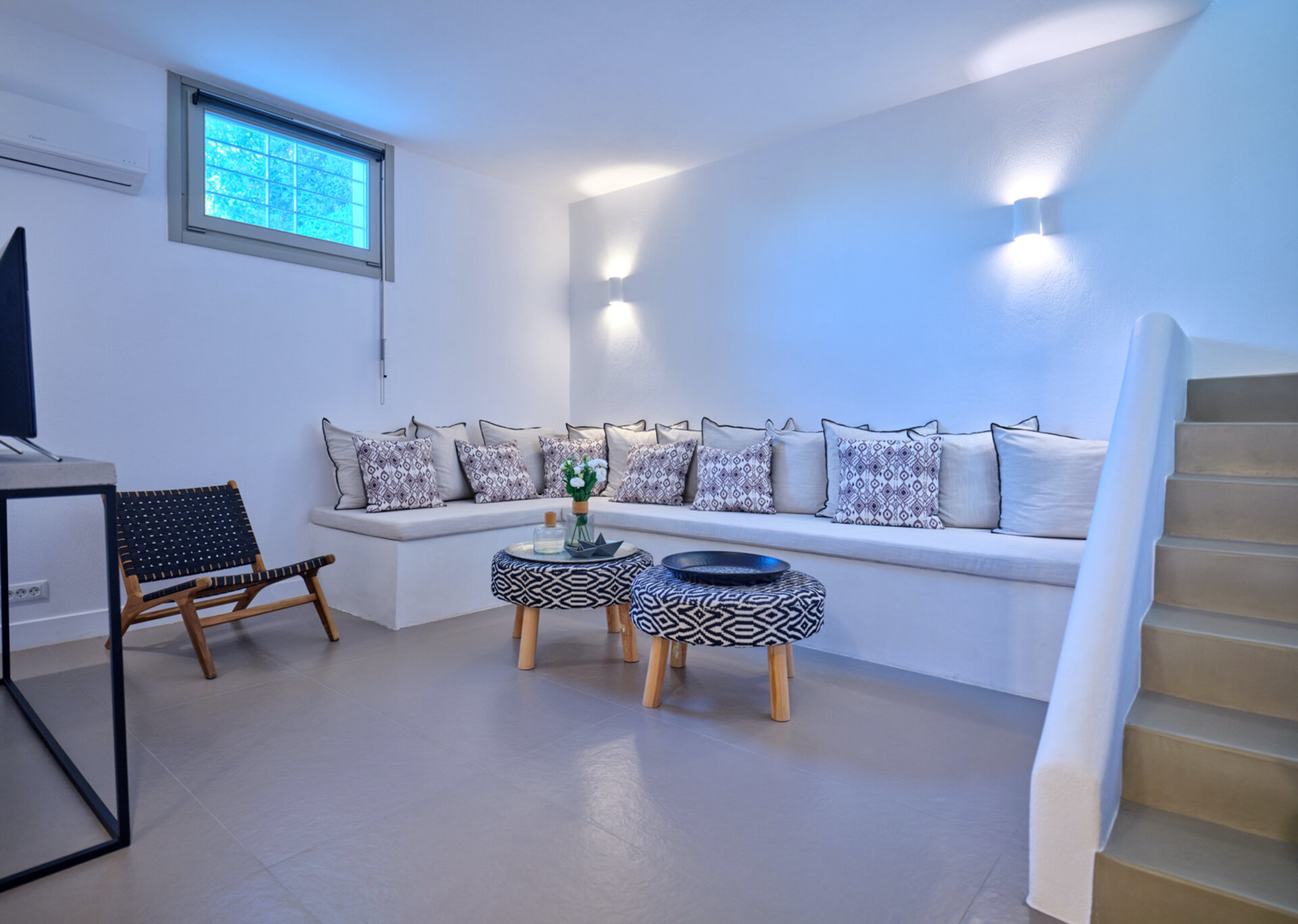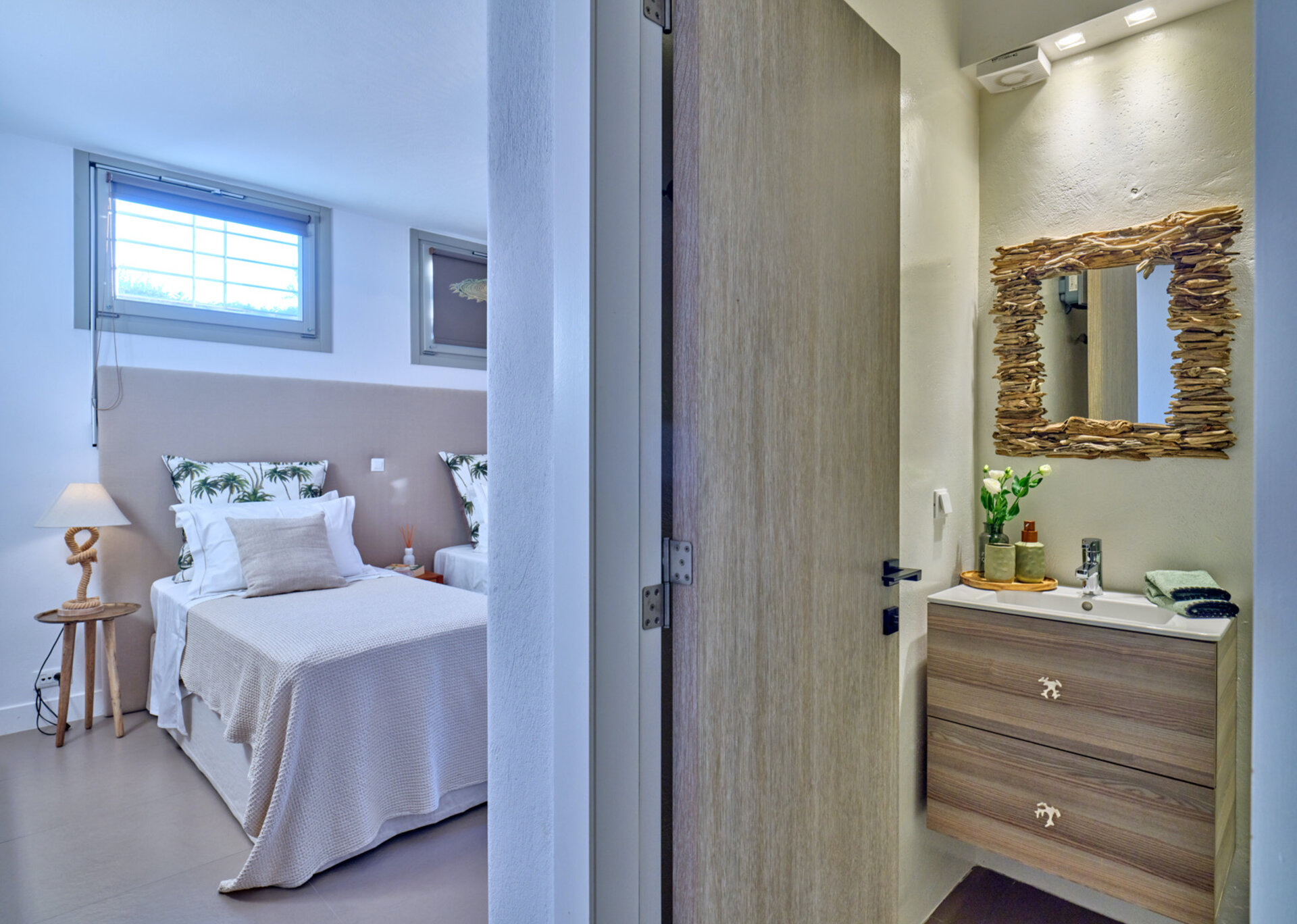 The main villa building is dominated by a modern living room which is complemented by a dining area that can comfortably accommodate up to ten people. The adjacent open plan kitchen is fully equipped with the latest appliances. Two double bedrooms (not ensuite) can be also on this level.