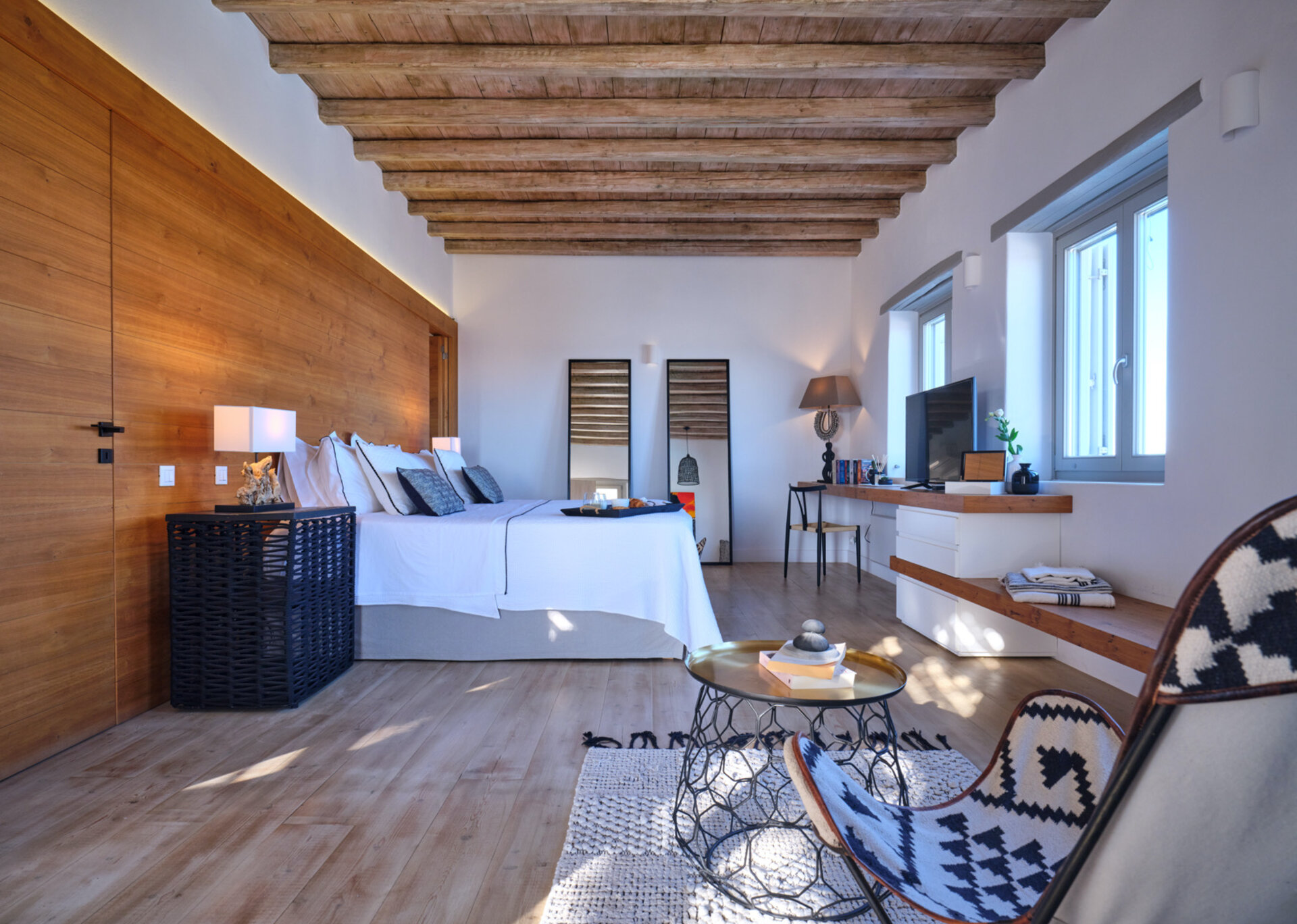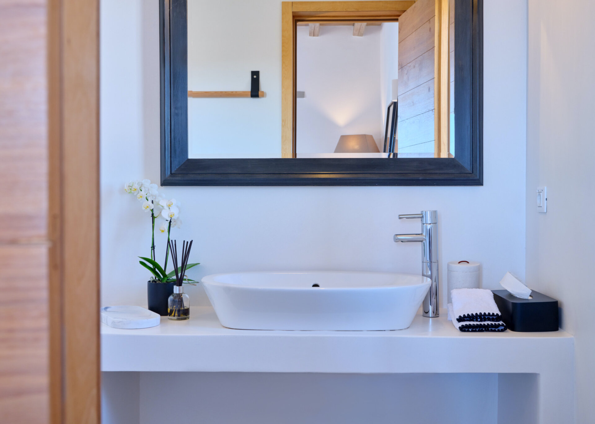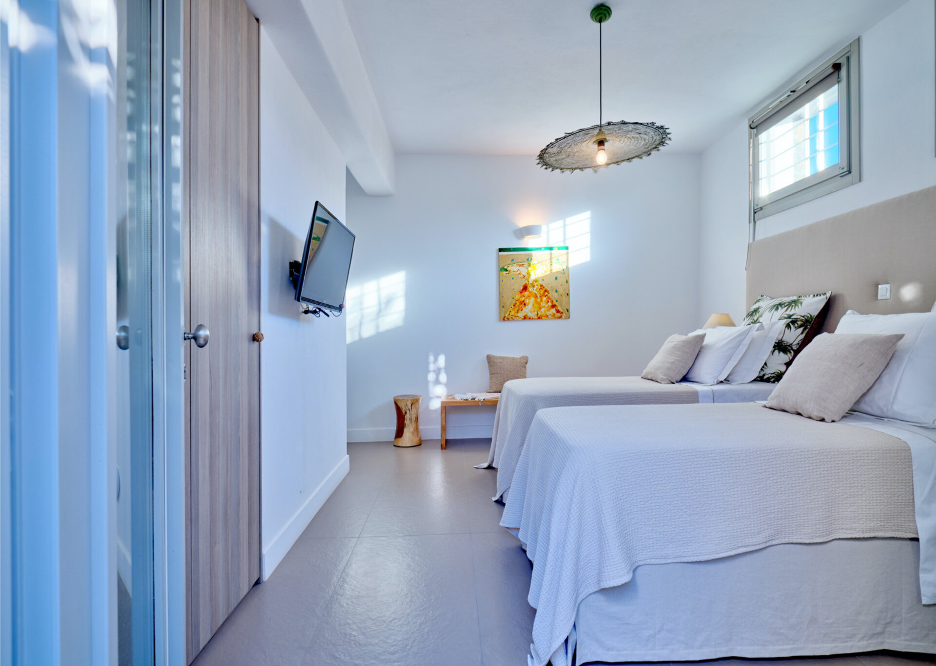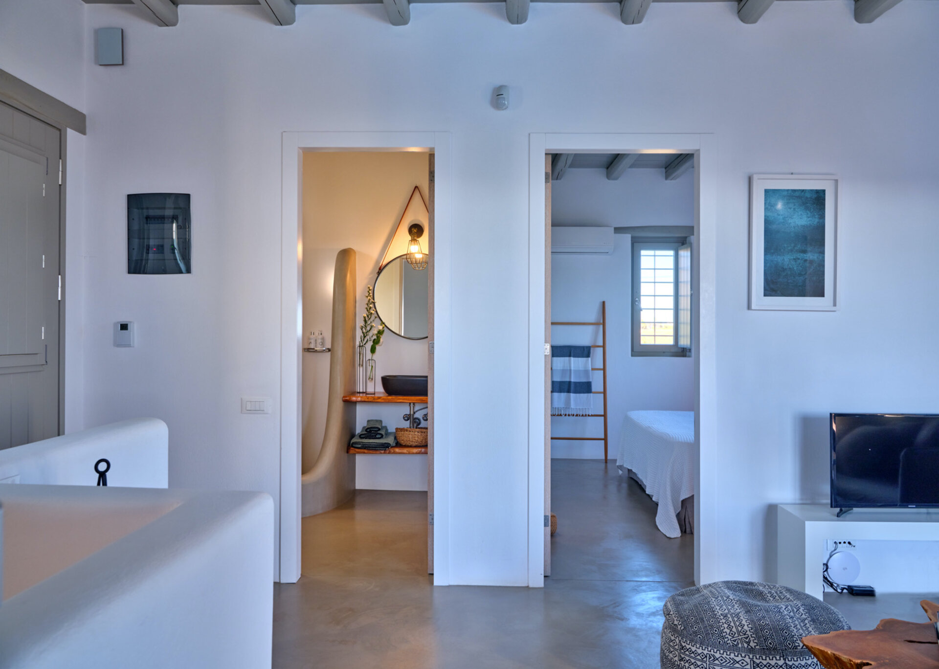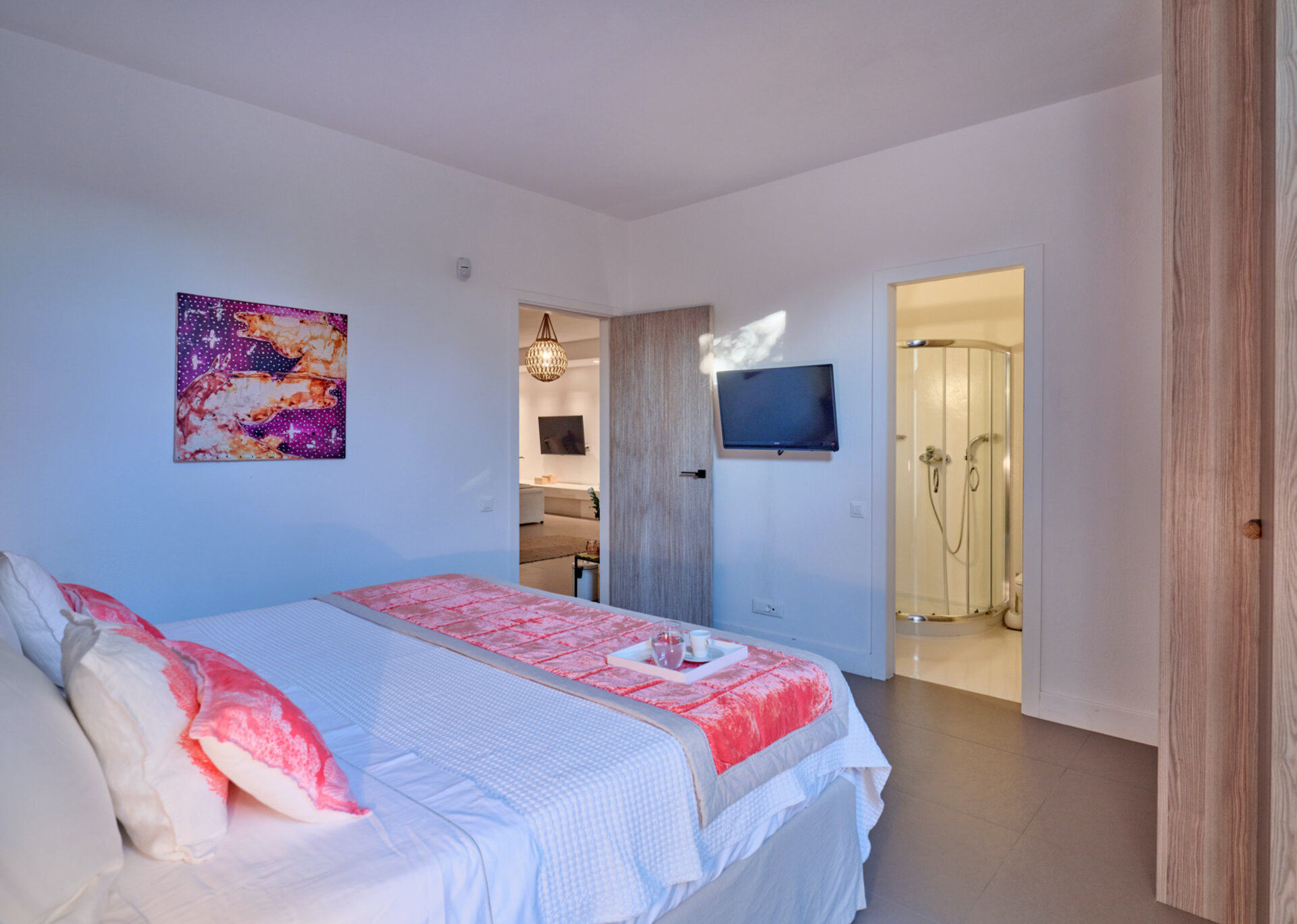 The main villa building is dominated by a modern living room which is complemented by a dining area that can comfortably accommodate up to ten people. The adjacent open plan kitchen is fully equipped with the latest appliances. Two double bedrooms (not ensuite) can be also on this level.